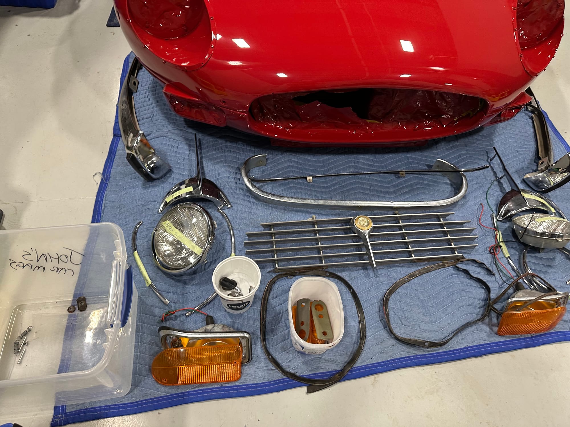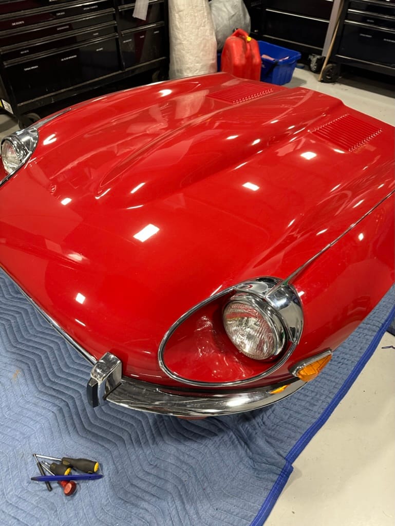 Work continues on the E-Type V12. The car had some minor front end damage early it its life, and the centre section of the bonnet was repainted - but the paint was not matched well. We sent the bonnet out to Cosmos Collision to be repainted. We now have reassembled the brightwork and the bonnet is ready to be re-installed.