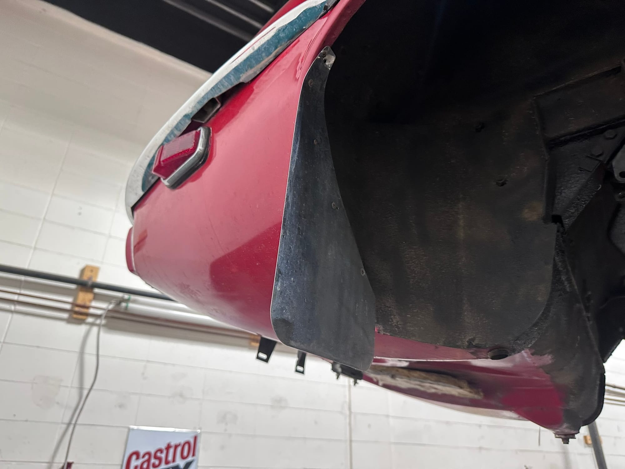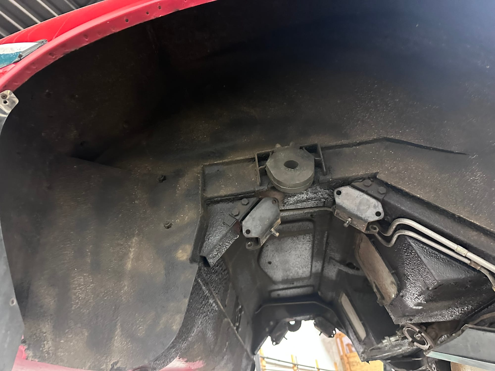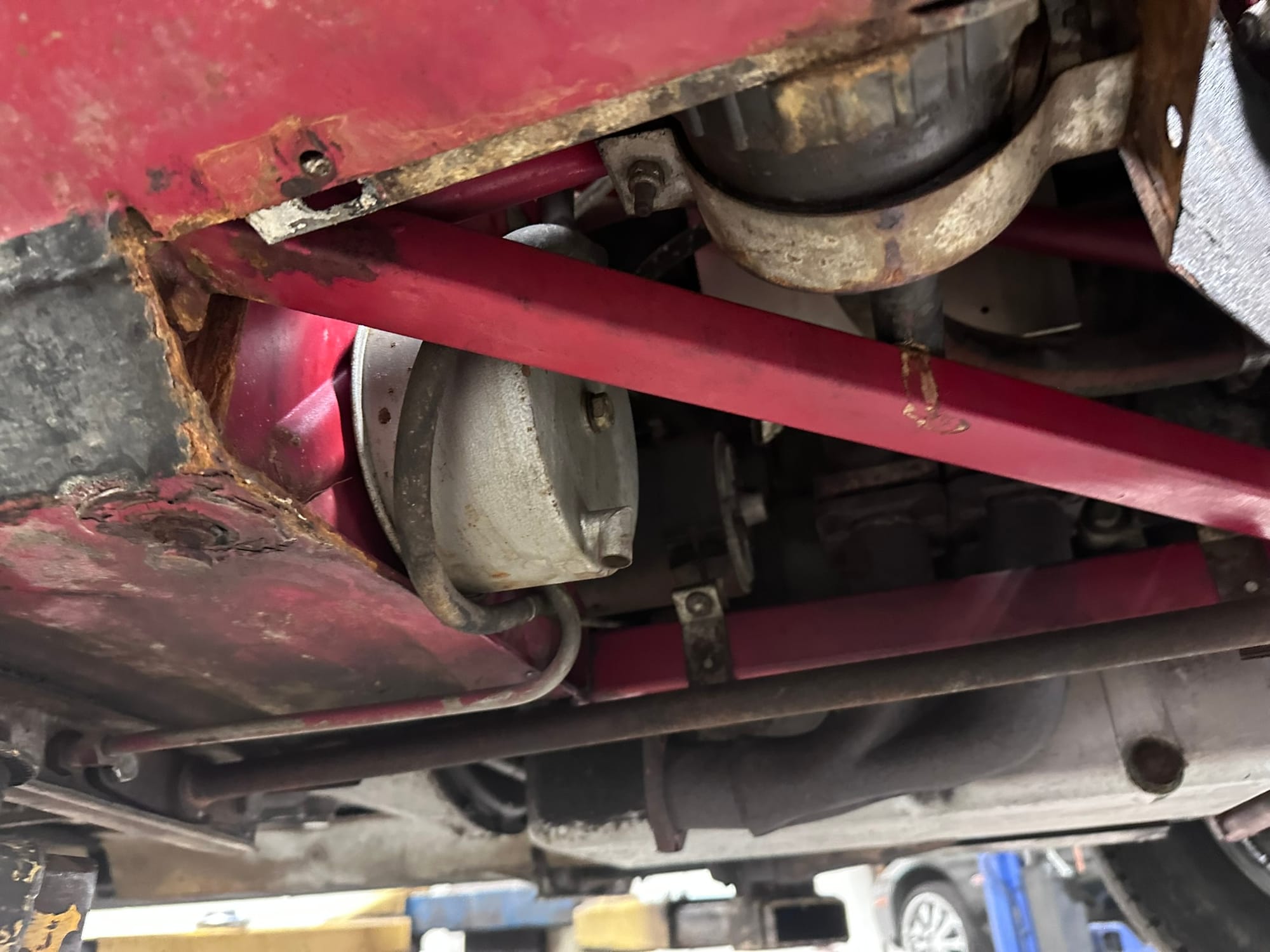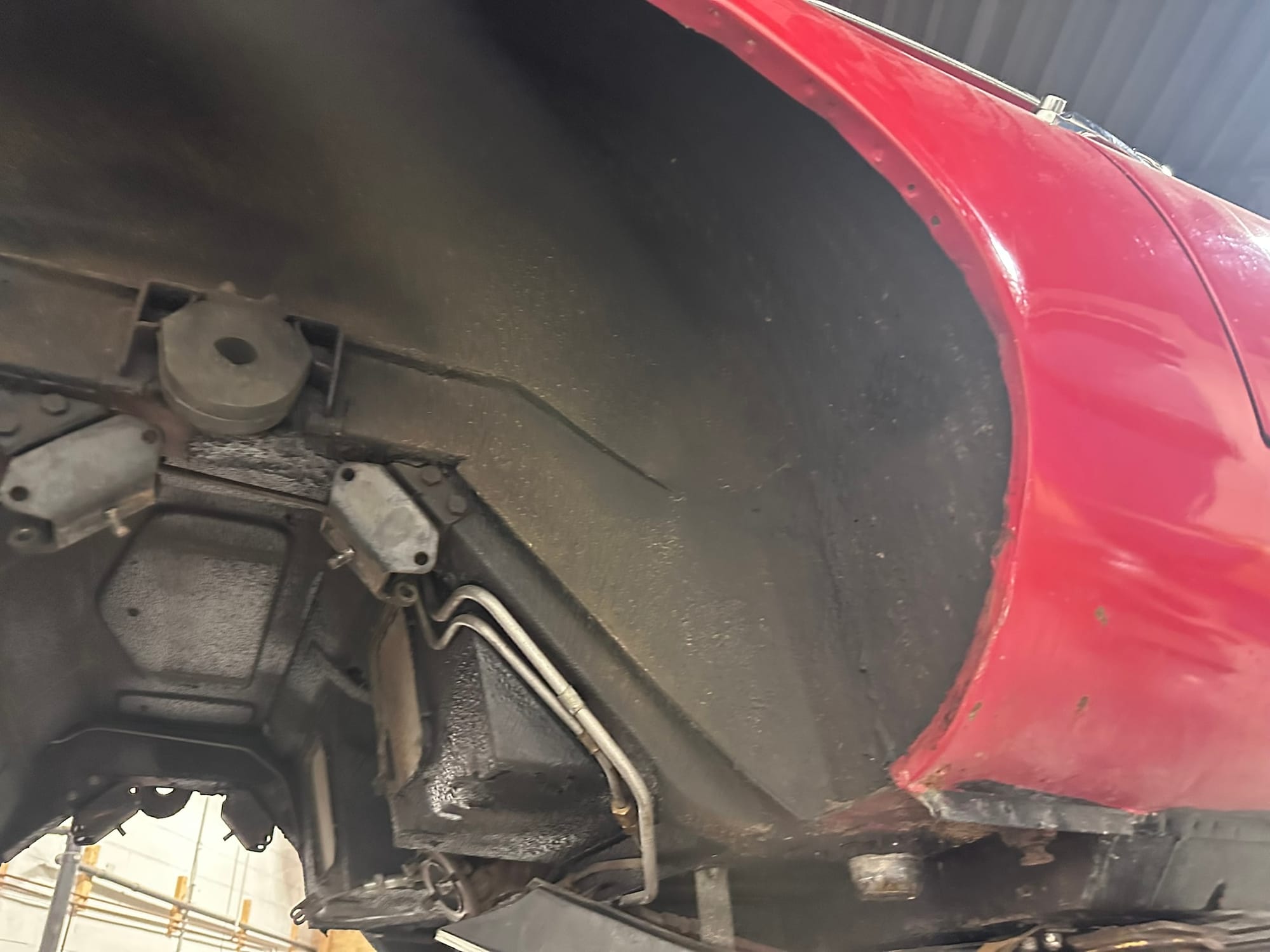 The car is unmodified and retains most of its original Signal Red paint. There is evidence of repair to the front LHS corner of the bonnet and the application of some rust paint along the lower sills. Silver paint has been applied to the exhaust and suspension.
