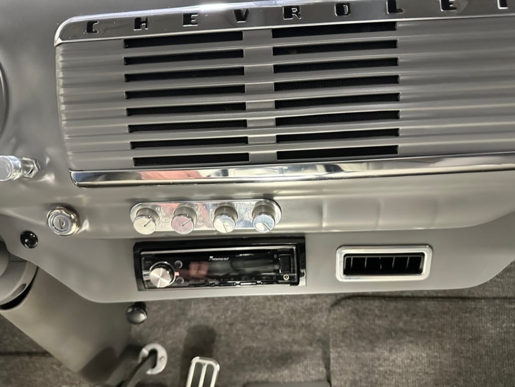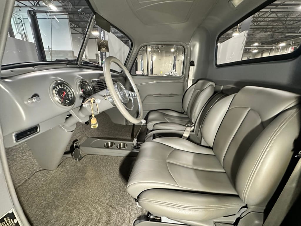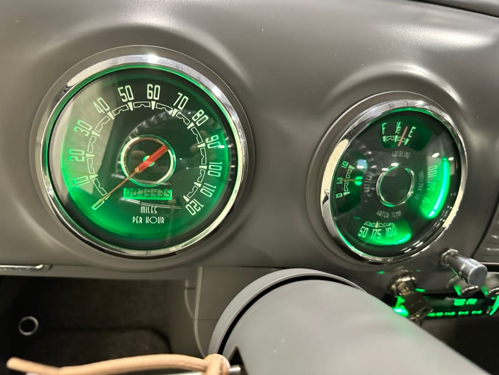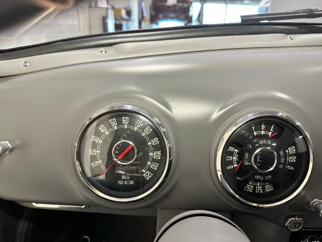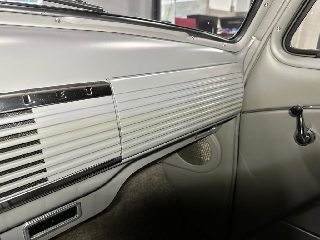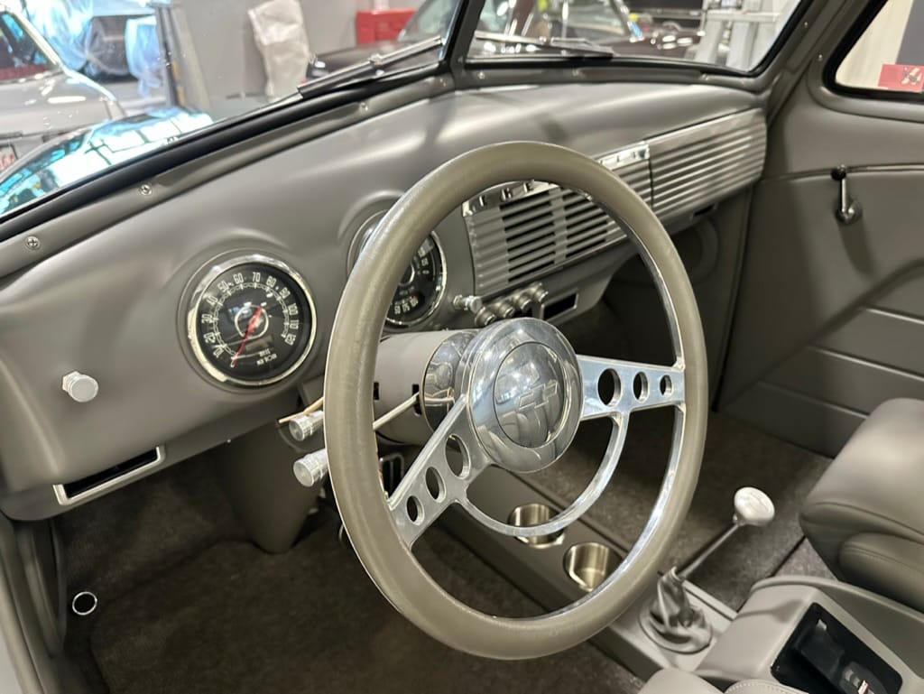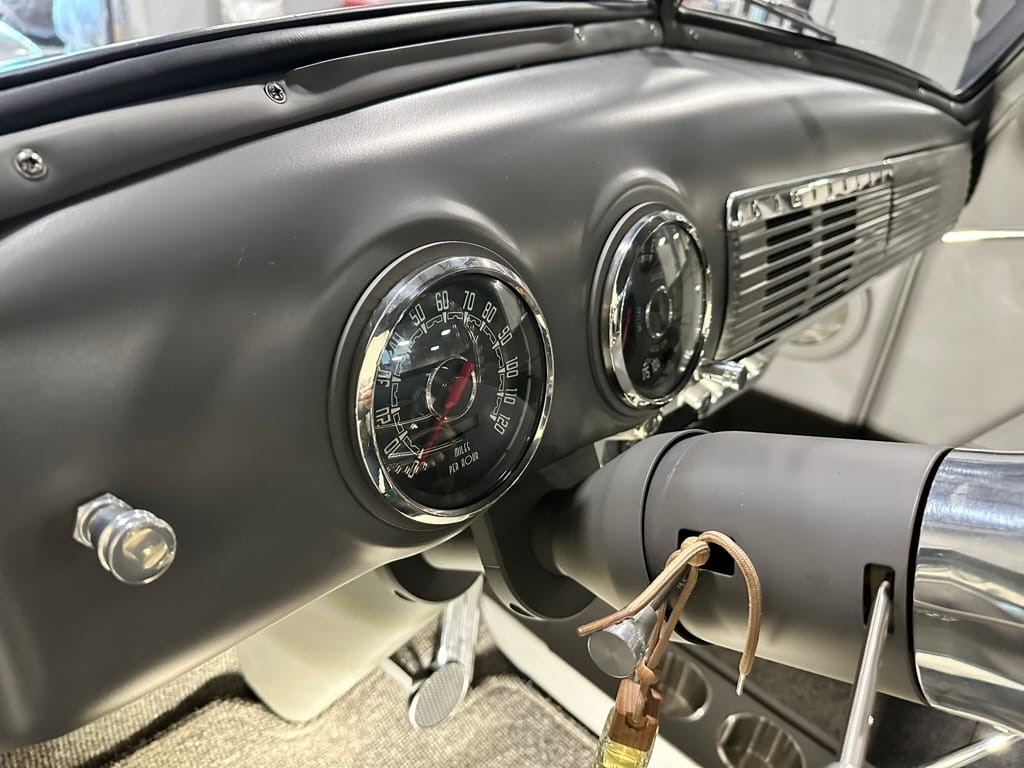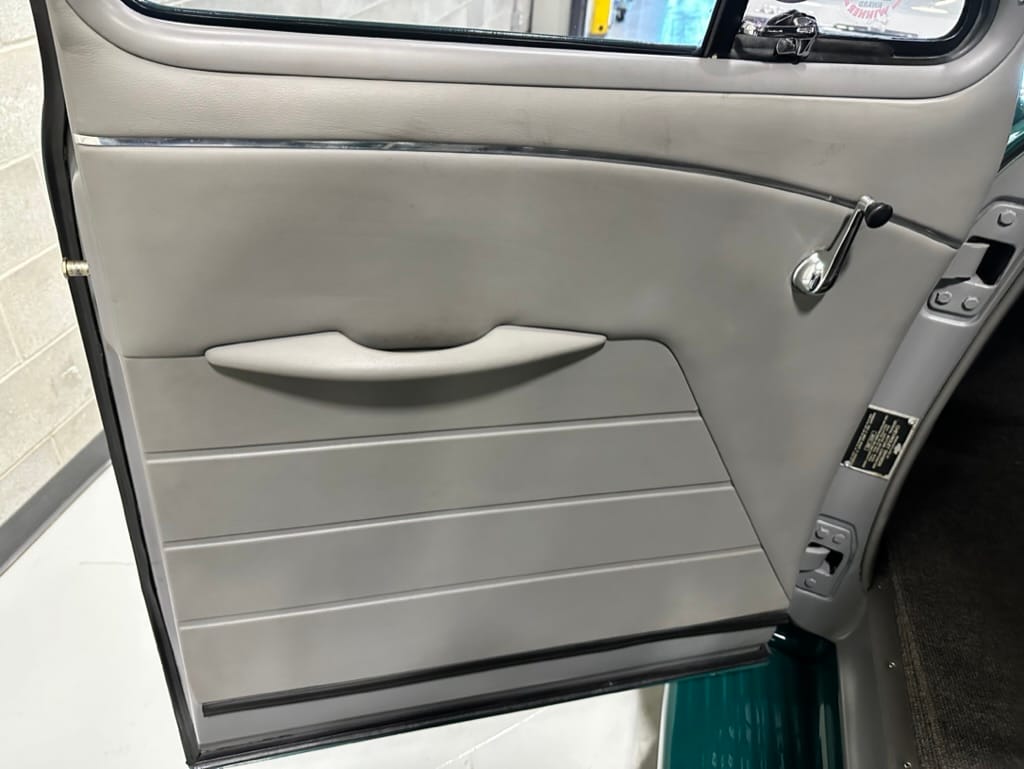 Vintage Air climate control, New Vintage gauges, Billet Specialties steering wheel with Ididit tilt column. Custom interior by Cutter’s Custom Stitching of Dillsboro IN with supple grey leather, grey ’square weave’ carpet, modified Mazda RX7 sport seats, Pioneer stereo.