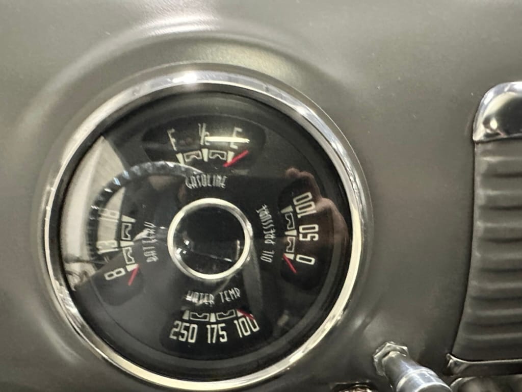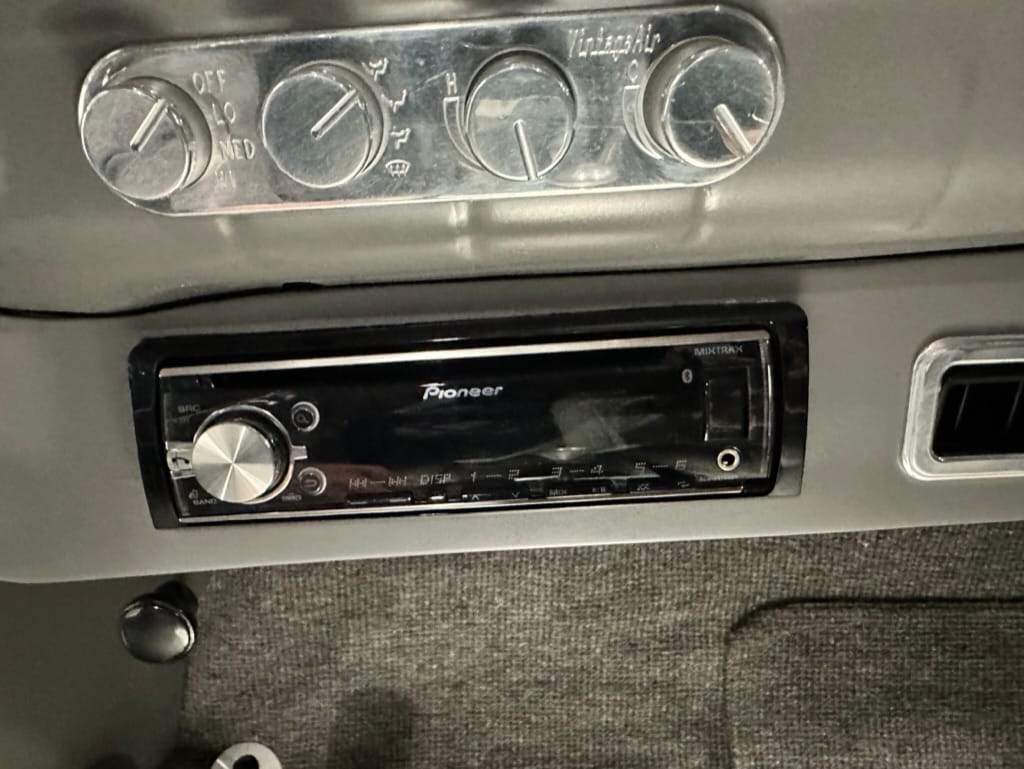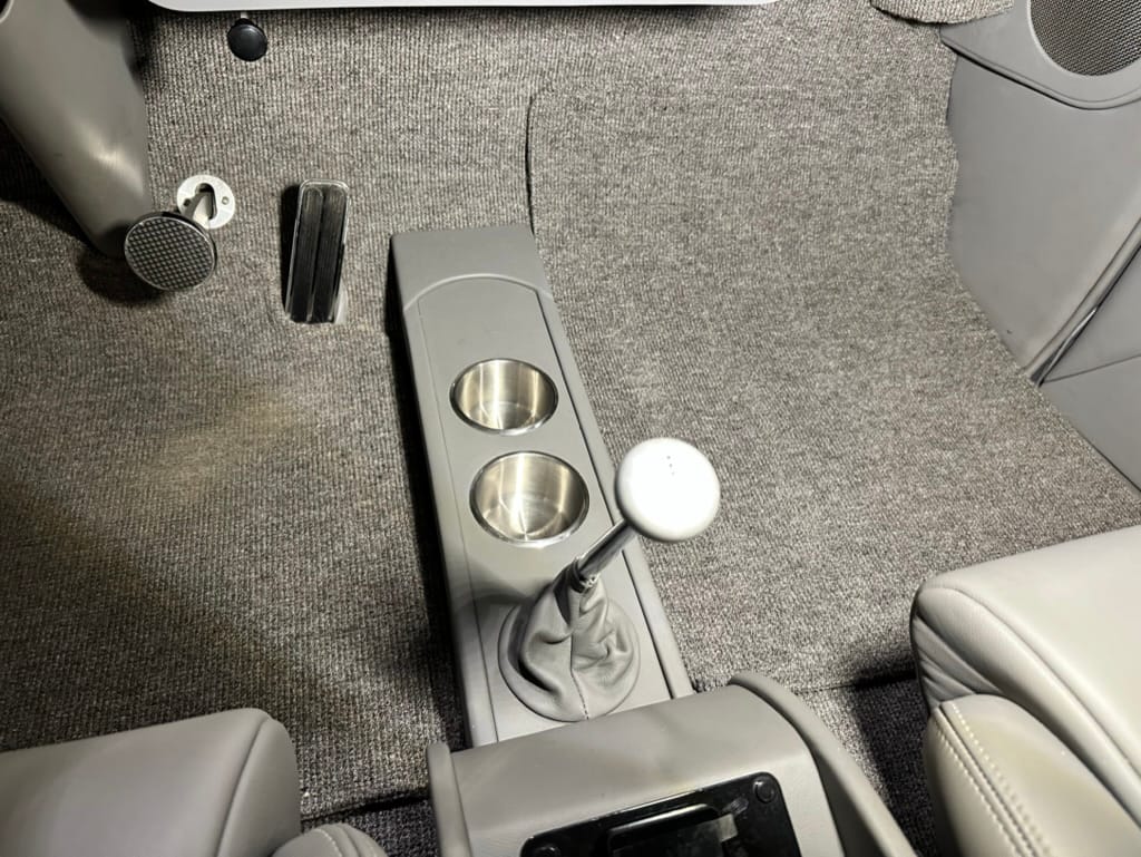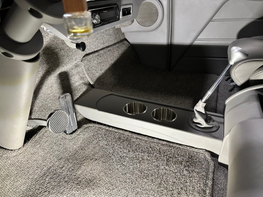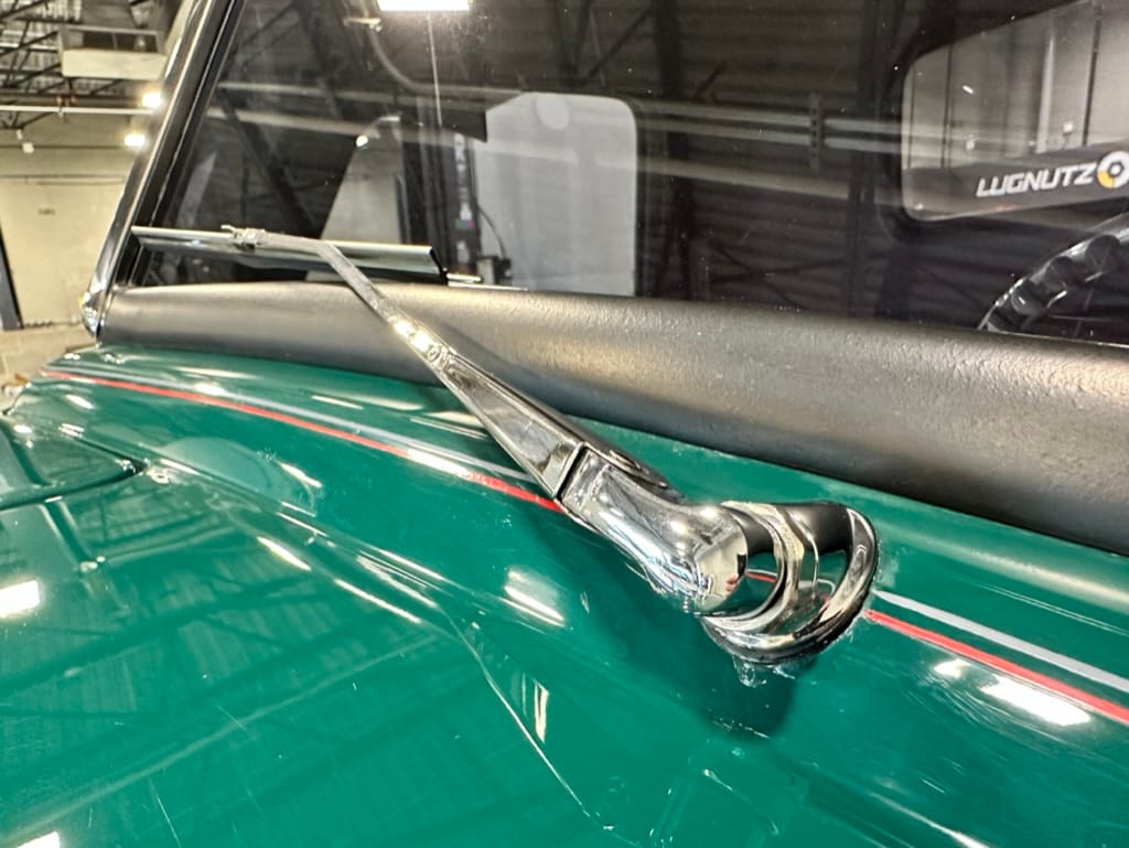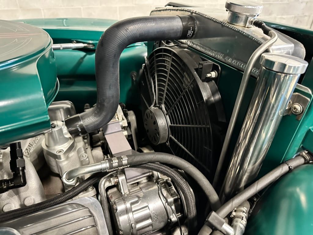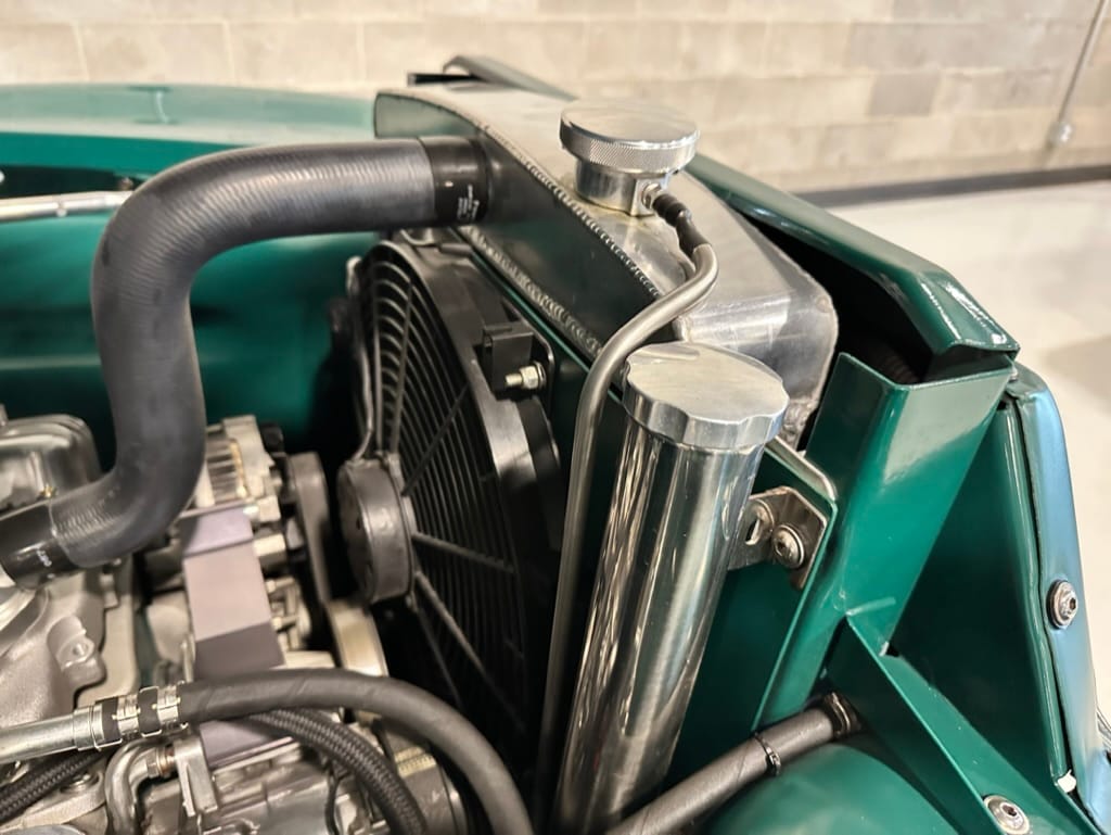 Vintage Air climate control, New Vintage gauges, Billet Specialties steering wheel with Ididit tilt column. Custom interior by Cutter’s Custom Stitching of Dillsboro IN with supple grey leather, grey ’square weave’ carpet, modified Mazda RX7 sport seats, Pioneer stereo.