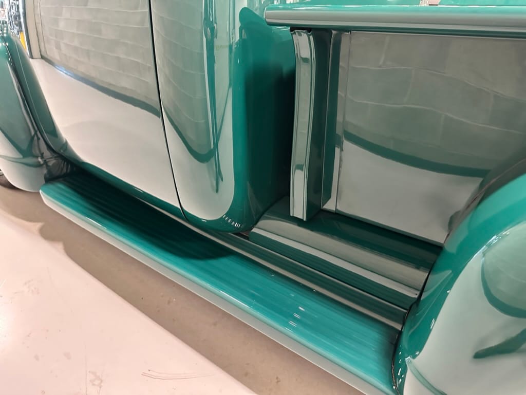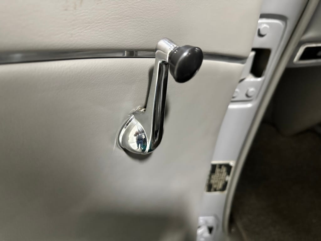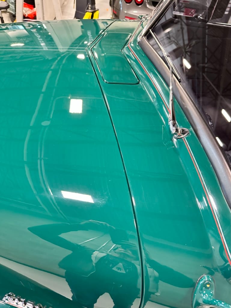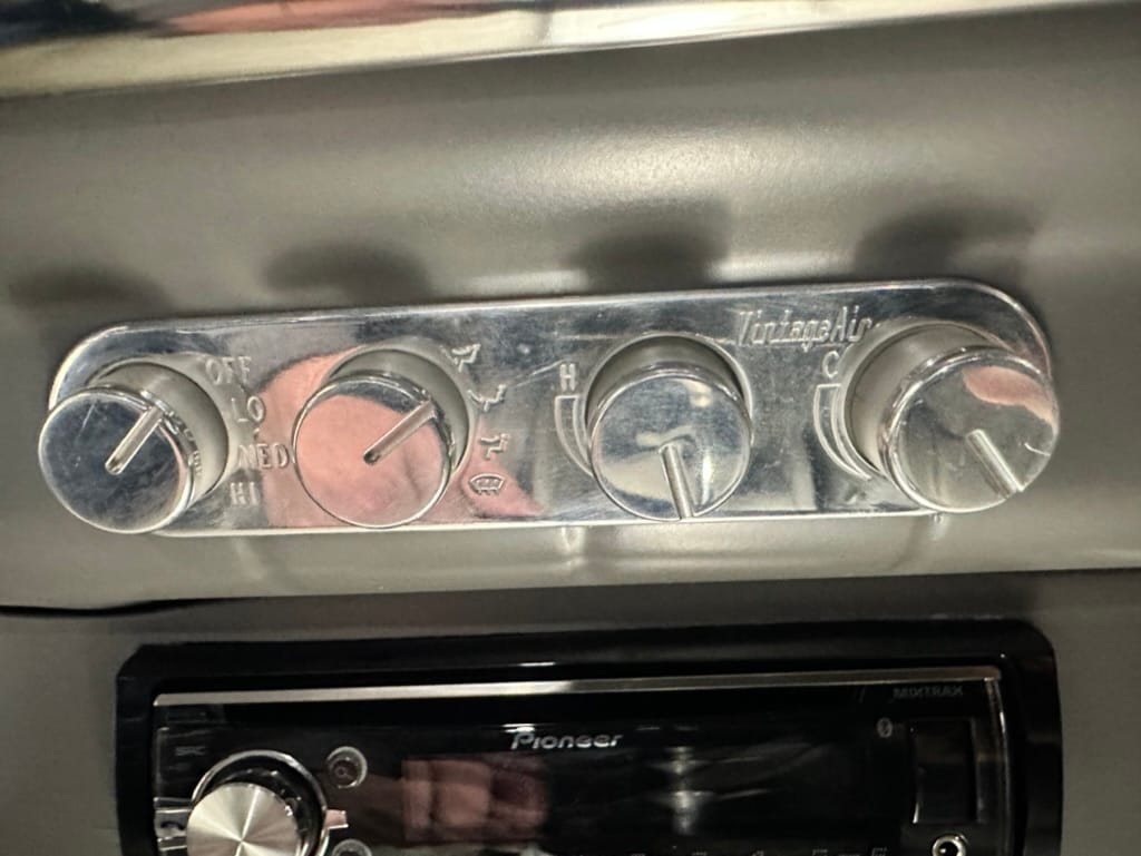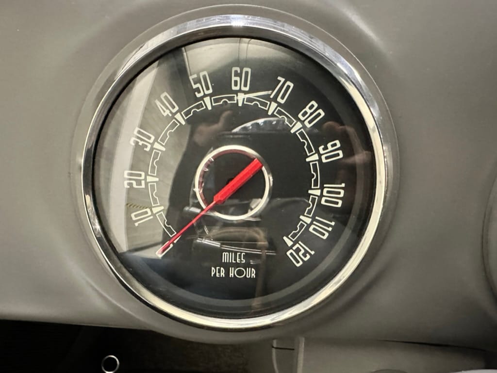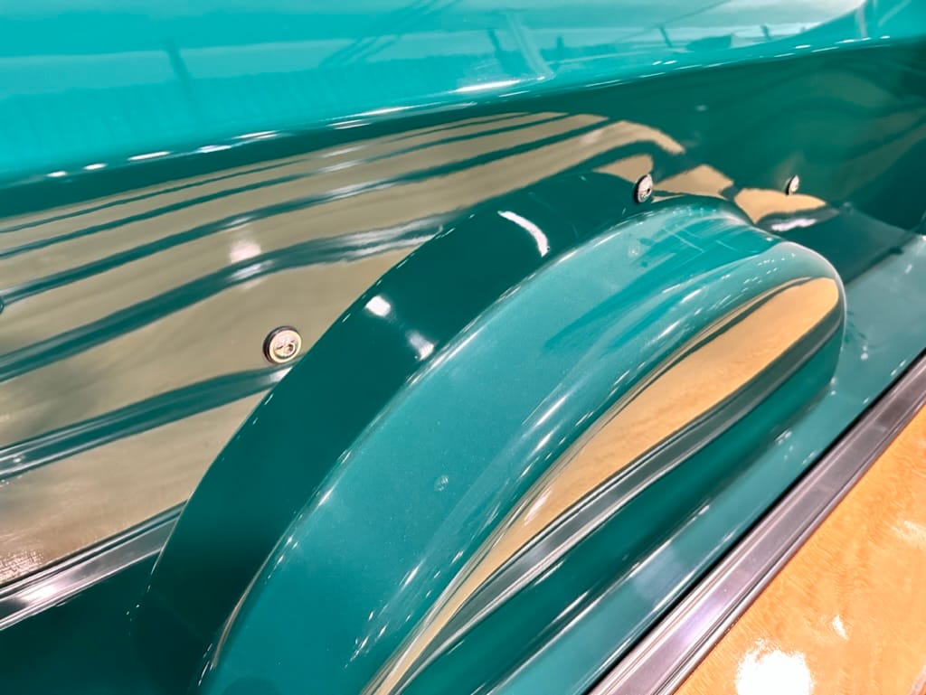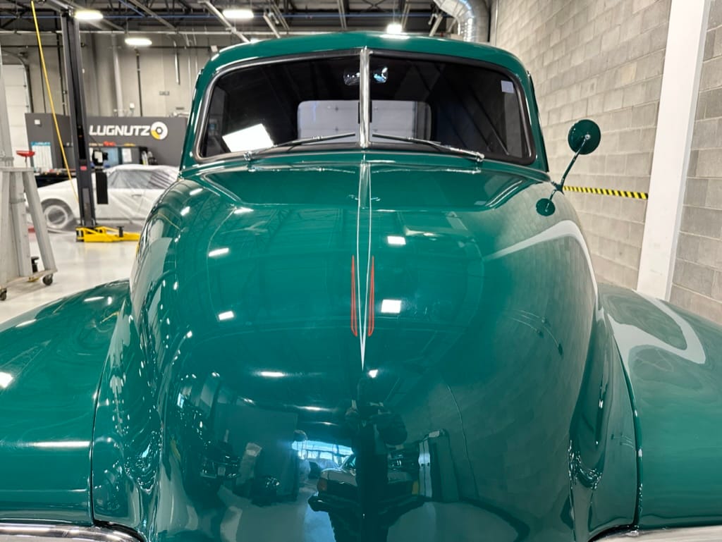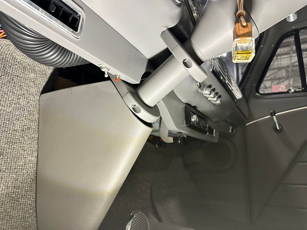 Vintage Air climate control, New Vintage gauges, Billet Specialties steering wheel with Ididit tilt column. Custom interior by Cutter’s Custom Stitching of Dillsboro IN with supple grey leather, grey ’square weave’ carpet, modified Mazda RX7 sport seats, Pioneer stereo.