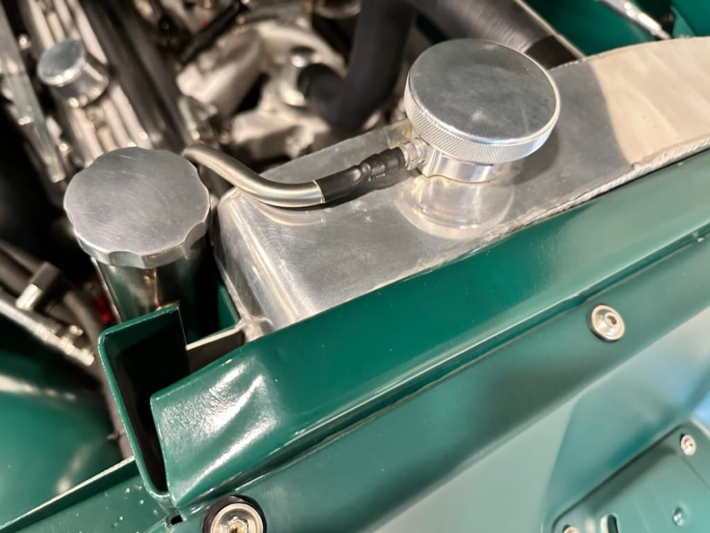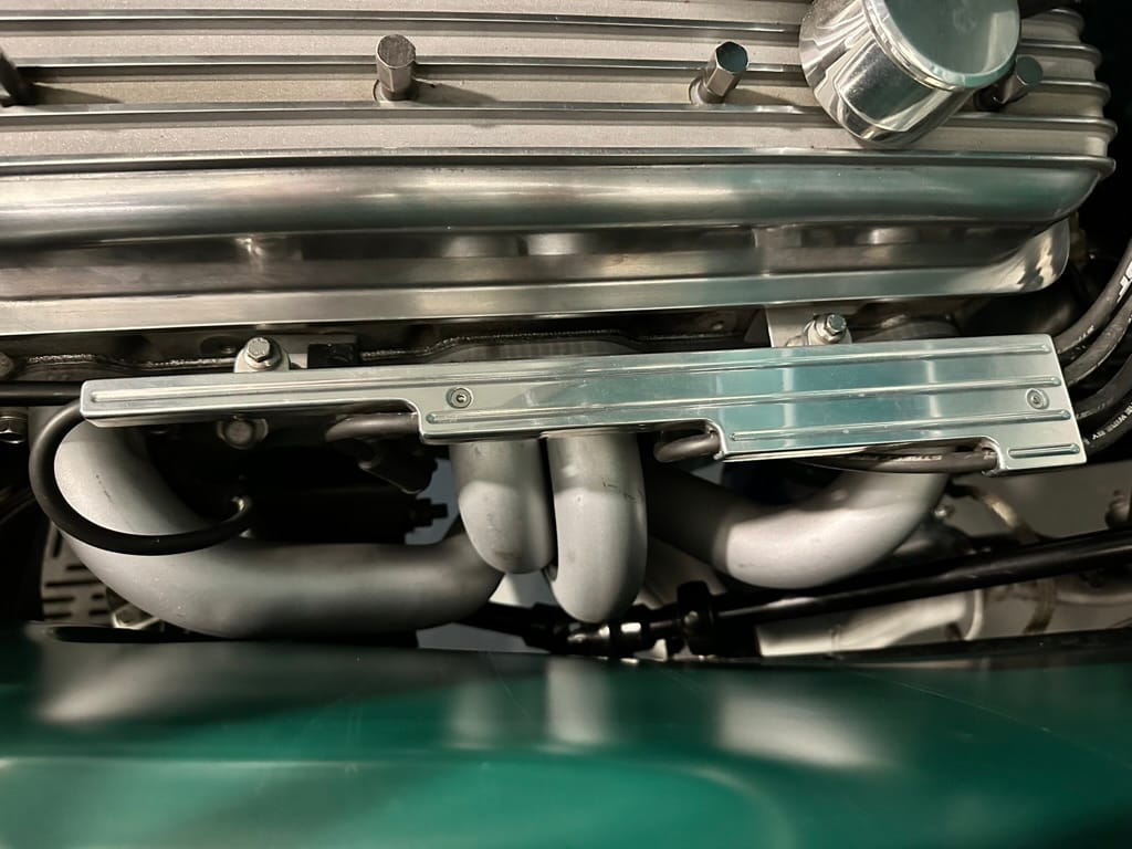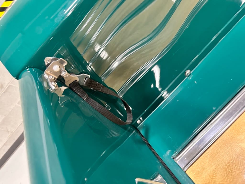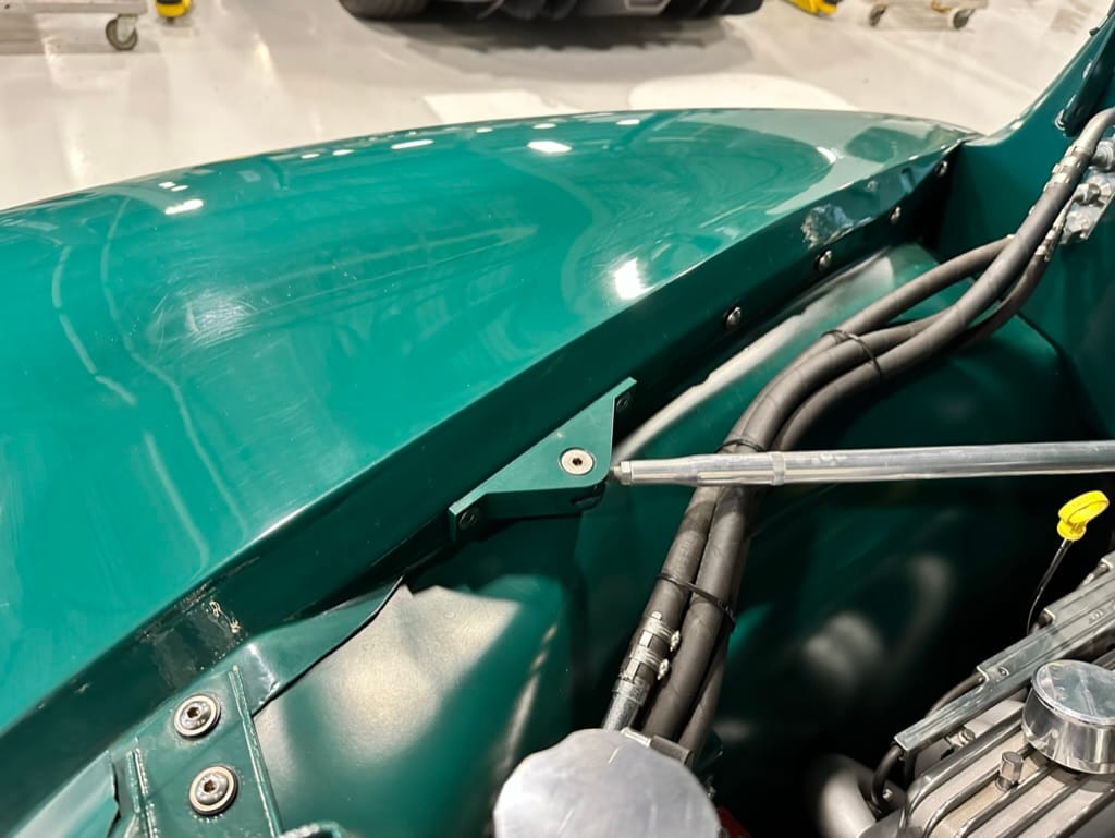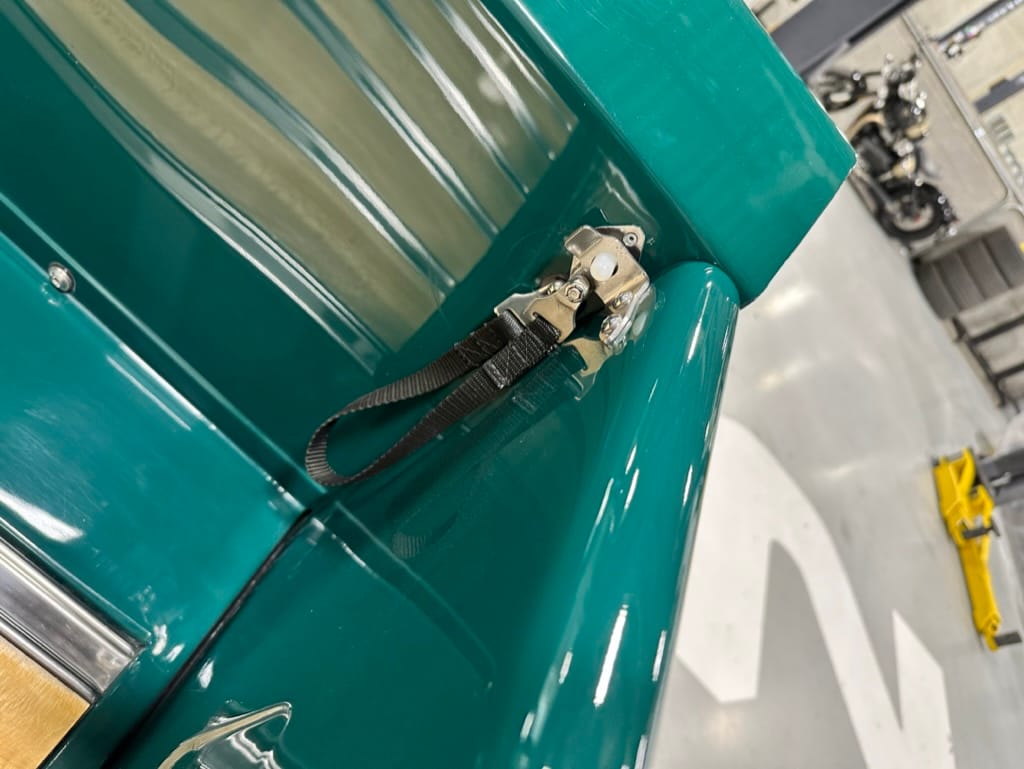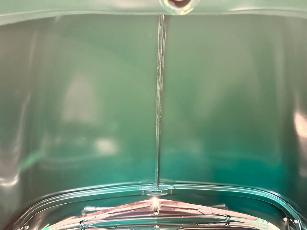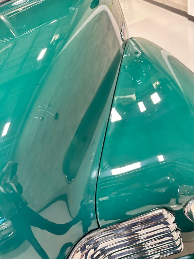 Vintage Air climate control, New Vintage gauges, Billet Specialties steering wheel with Ididit tilt column. Custom interior by Cutter’s Custom Stitching of Dillsboro IN with supple grey leather, grey ’square weave’ carpet, modified Mazda RX7 sport seats, Pioneer stereo.