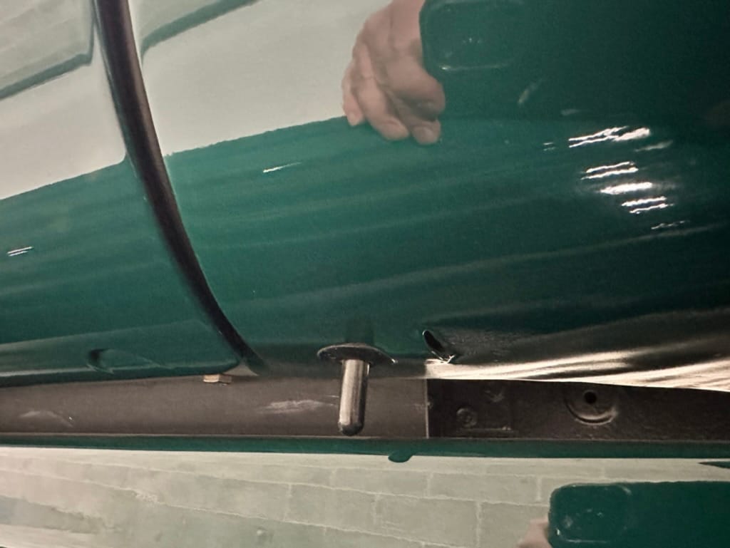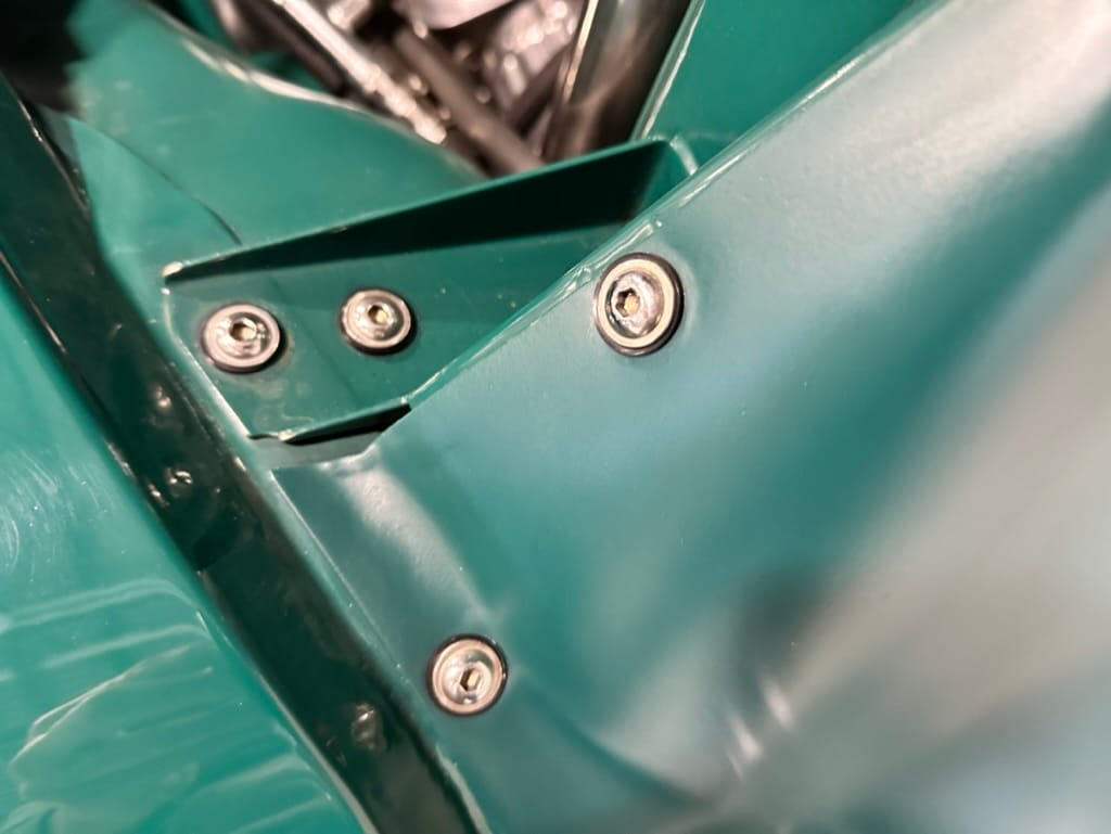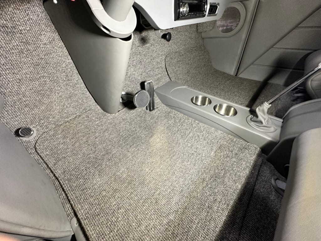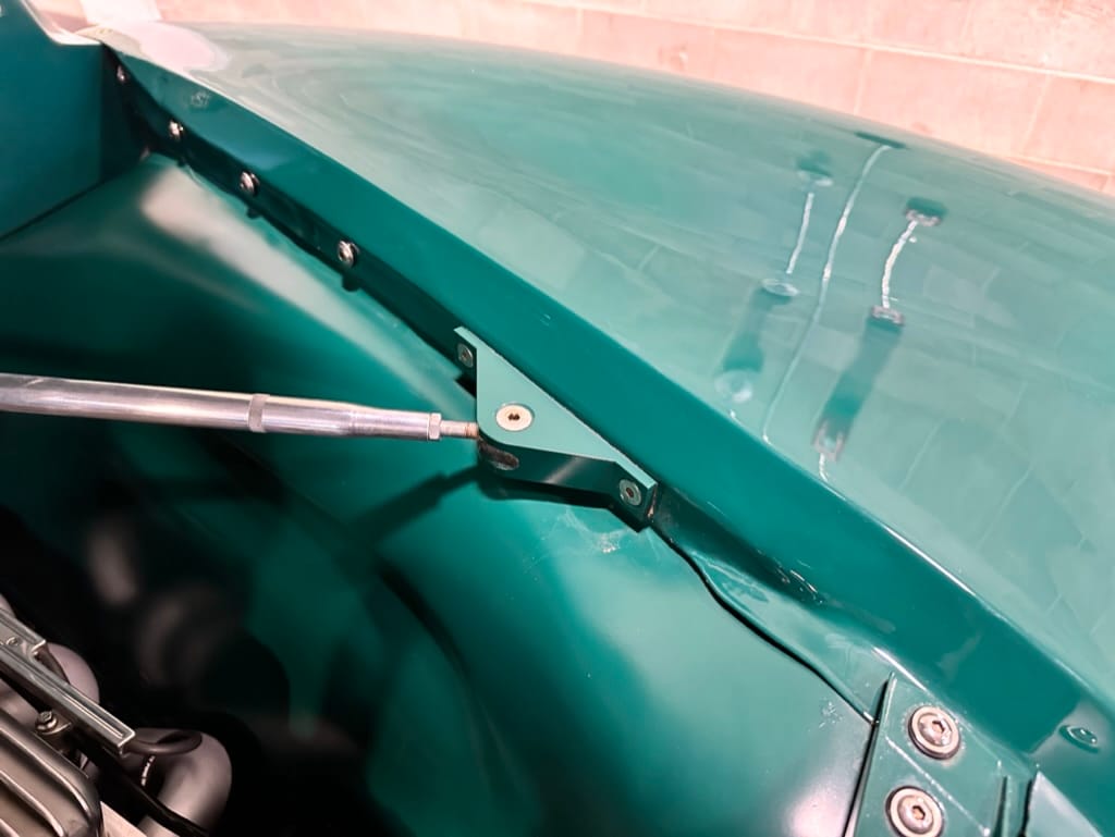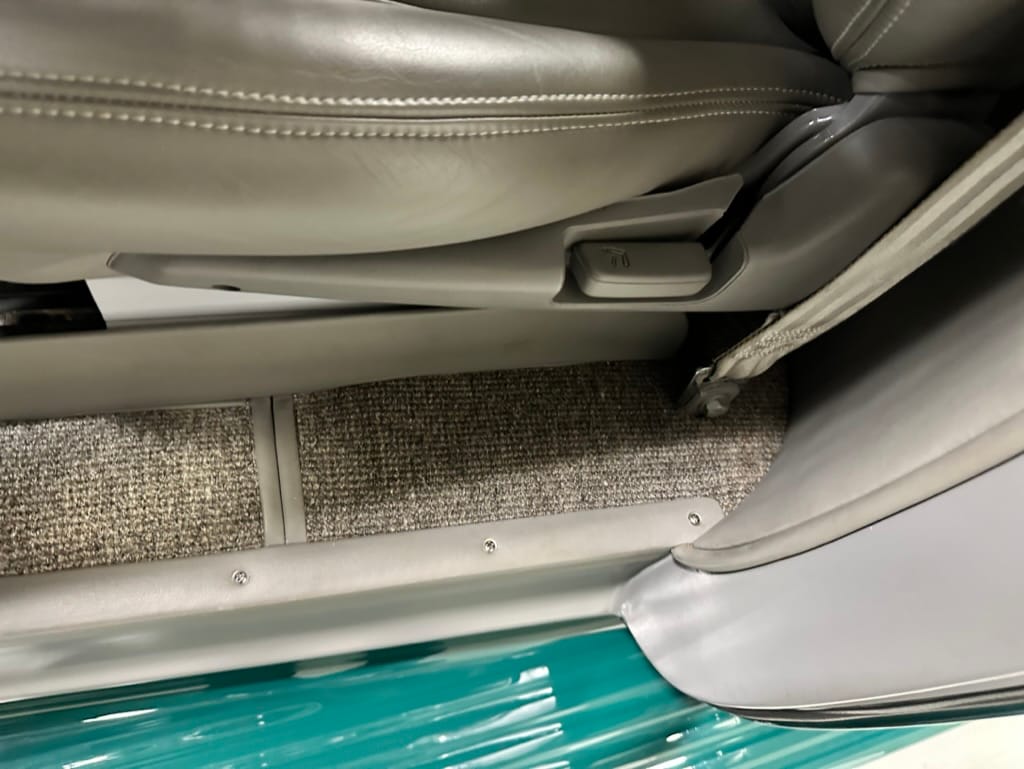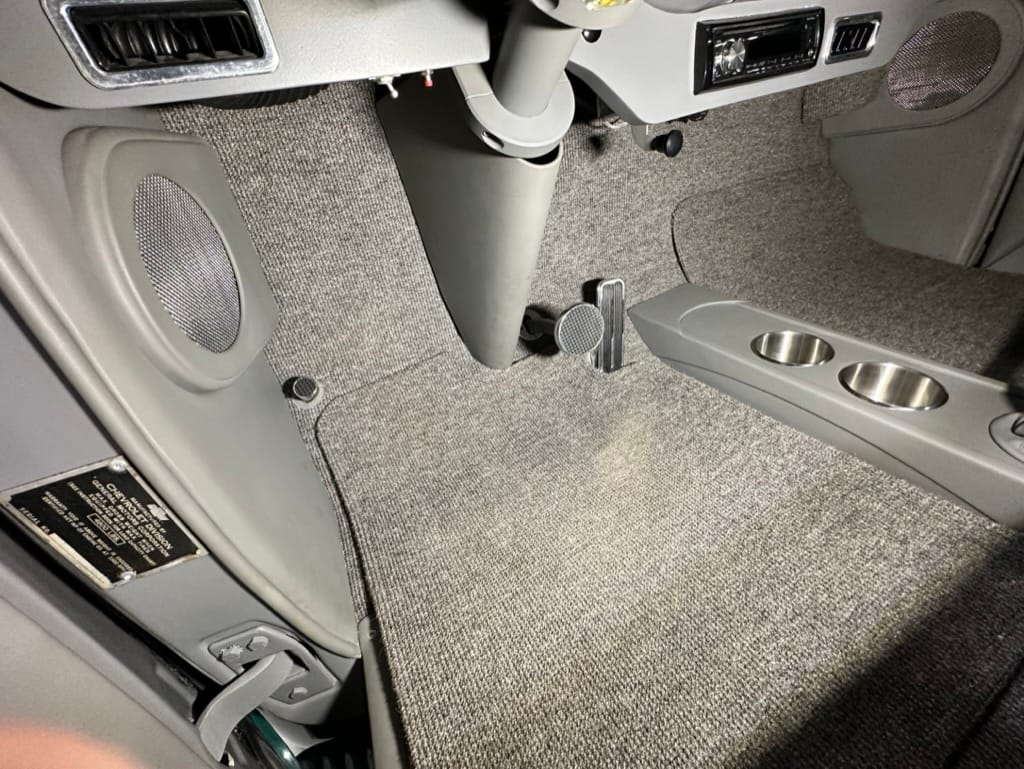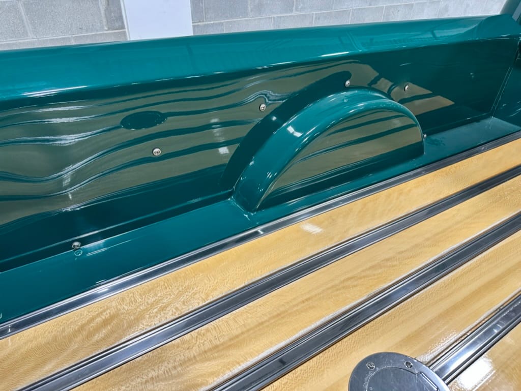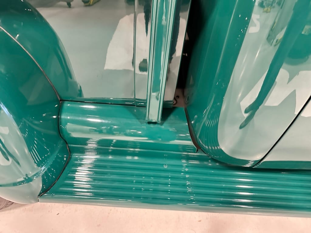 Vintage Air climate control, New Vintage gauges, Billet Specialties steering wheel with Ididit tilt column. Custom interior by Cutter’s Custom Stitching of Dillsboro IN with supple grey leather, grey ’square weave’ carpet, modified Mazda RX7 sport seats, Pioneer stereo.