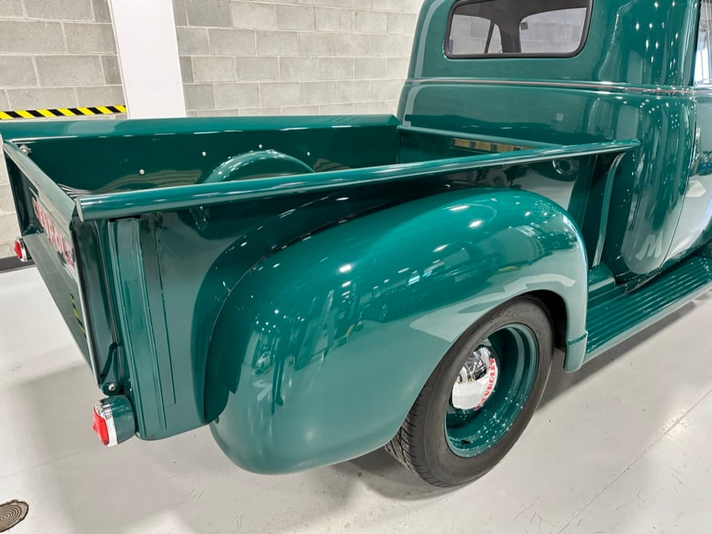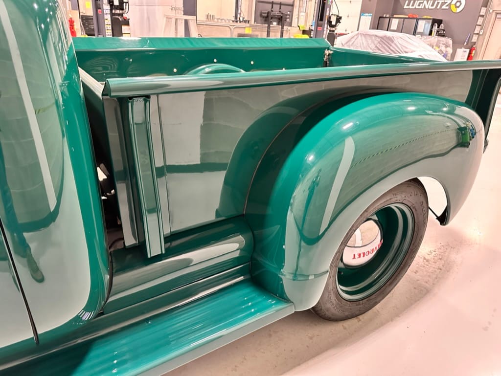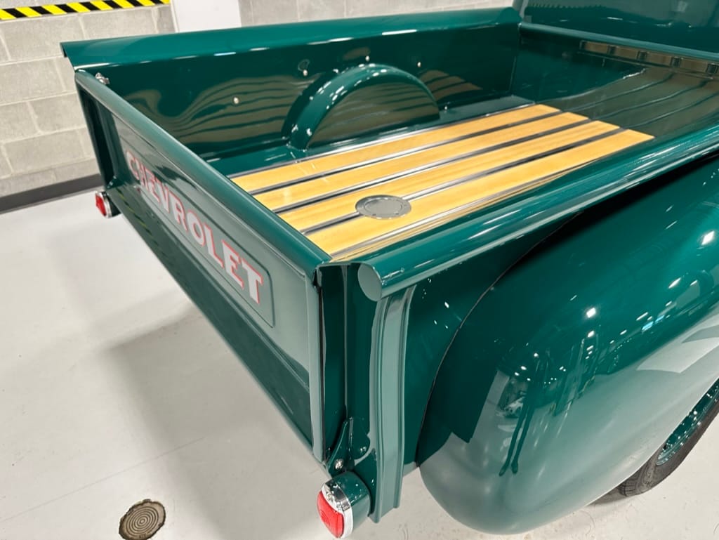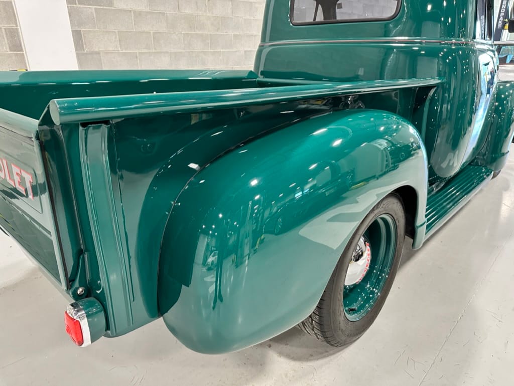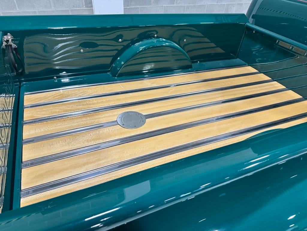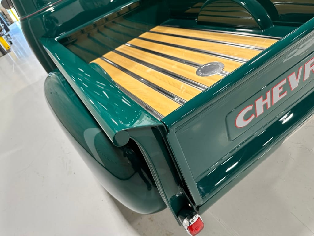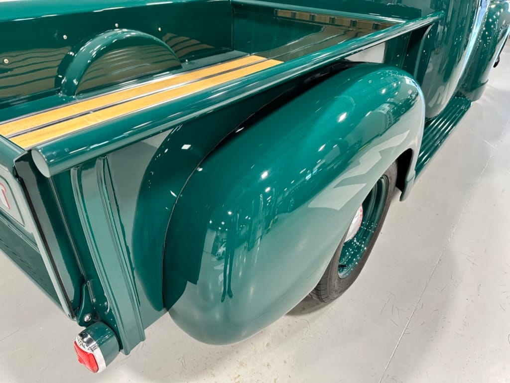 Custom rear roll pan, shaved doors with electro-mechanical opening, one-piece welded bonnet, smoothed tailgate, rear bed tubbed, ‘Bitchin’ Products’ firewall, Axalta Woodland Green paint with hand painted pin striping.