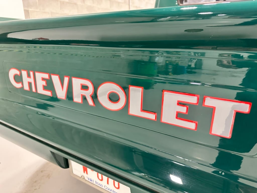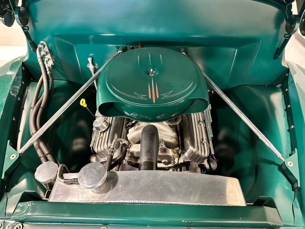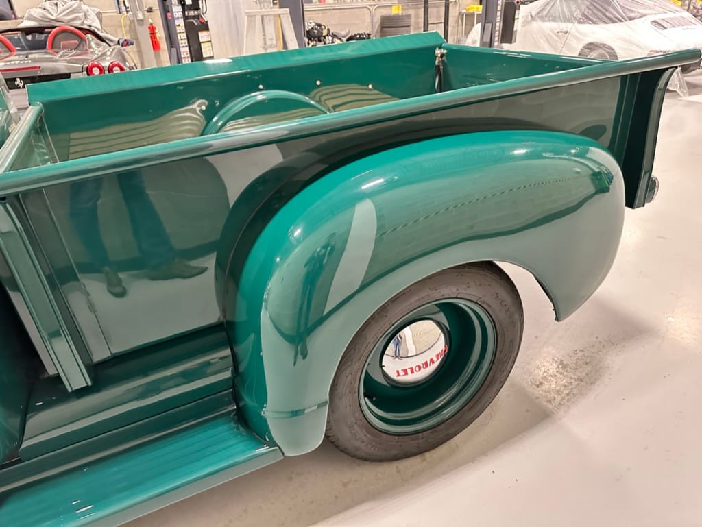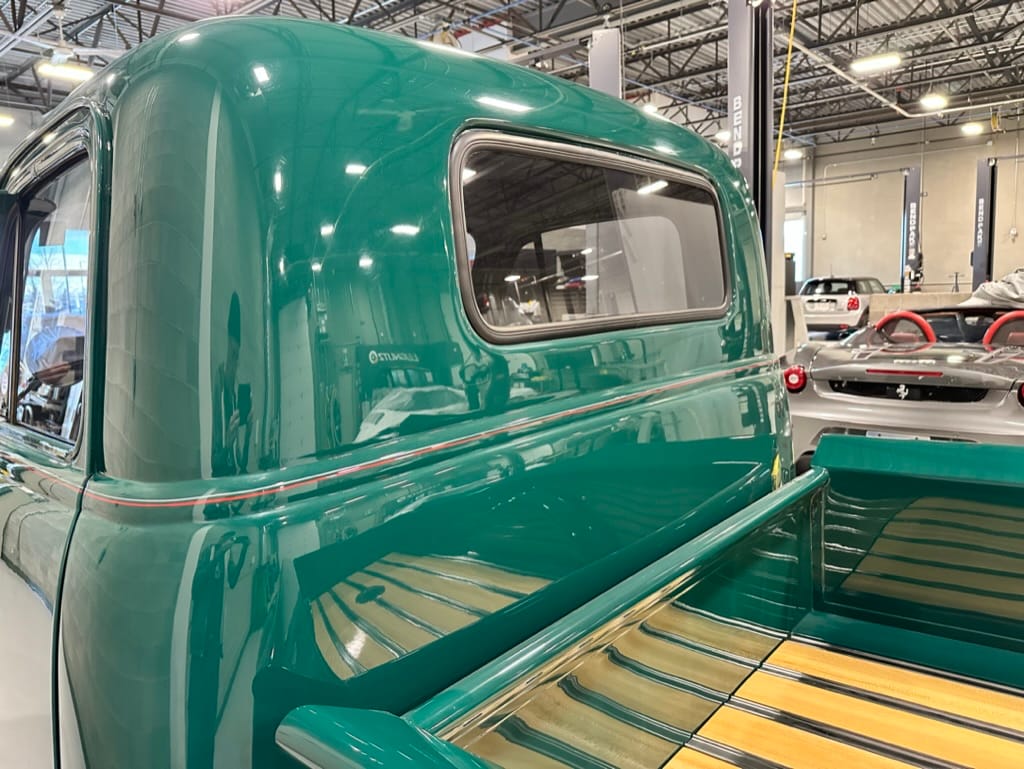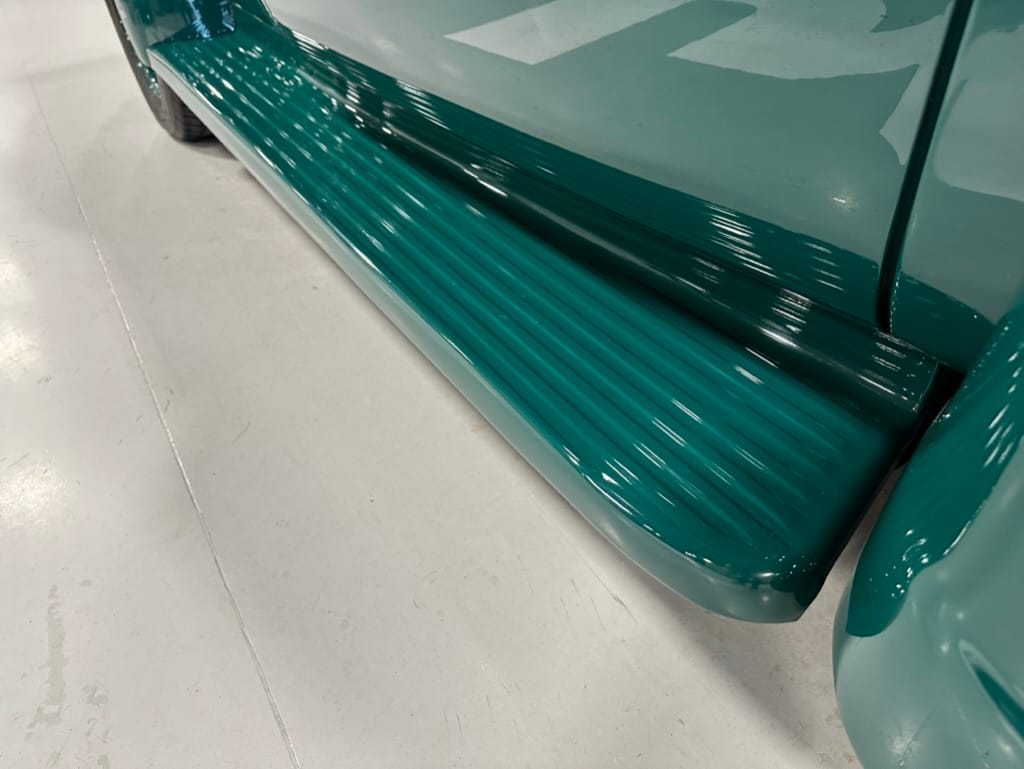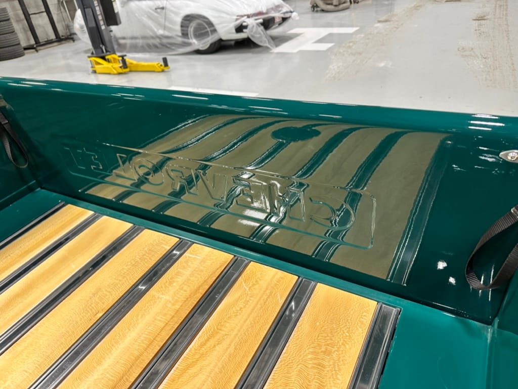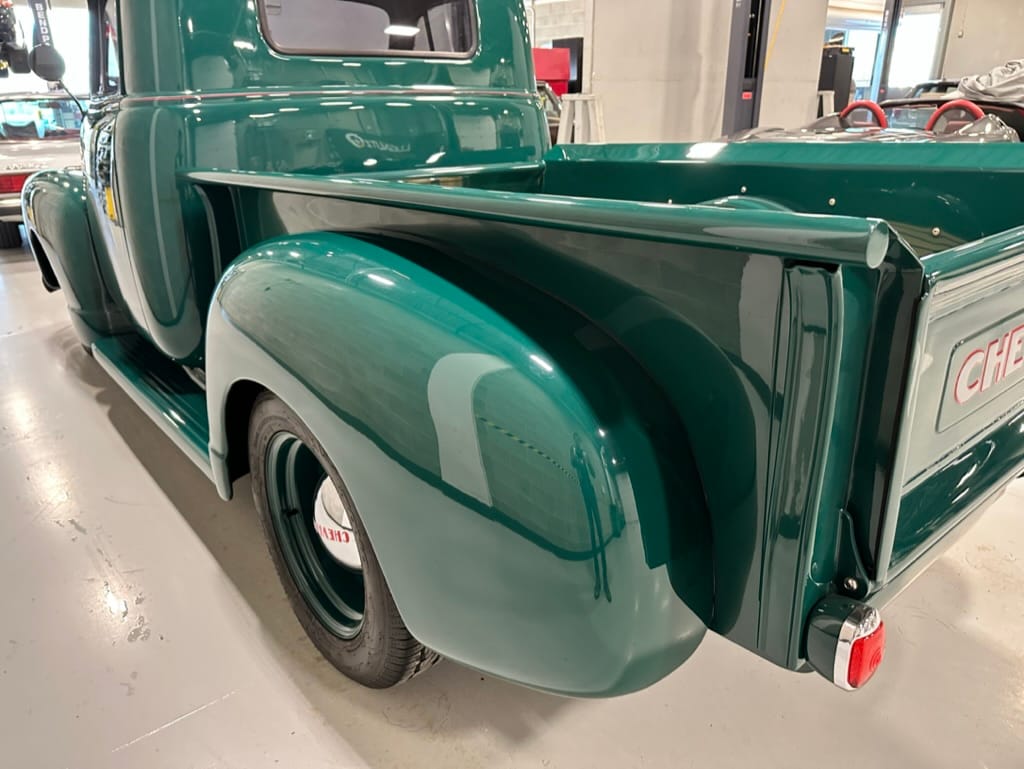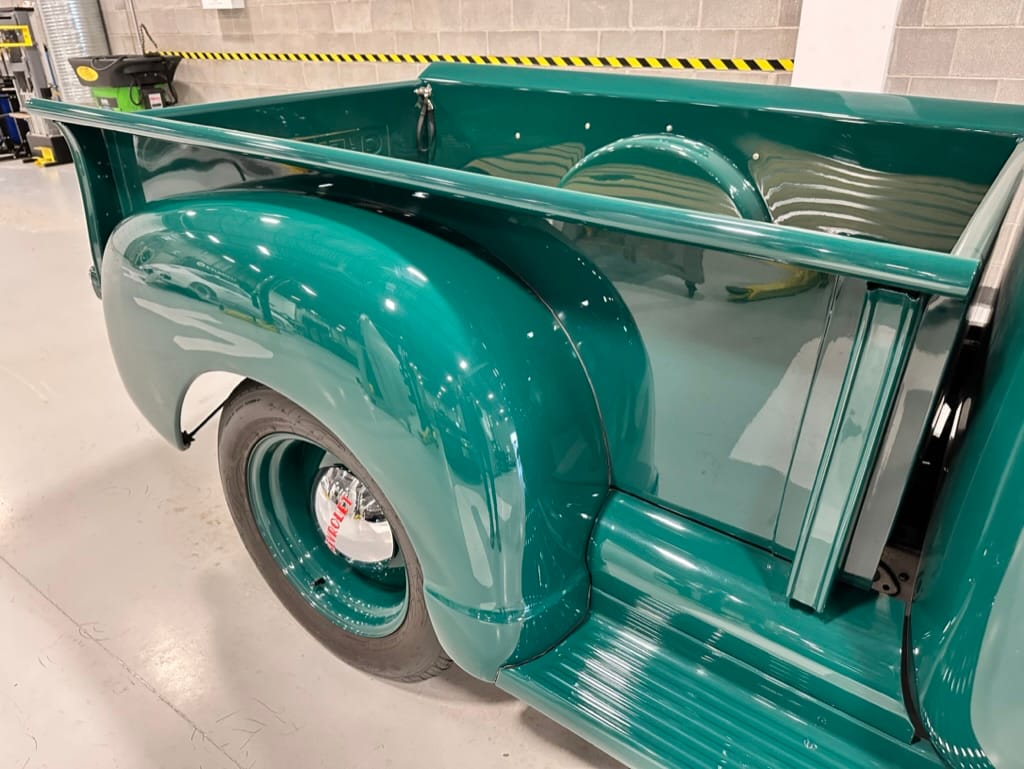 Custom rear roll pan, shaved doors with electro-mechanical opening, one-piece welded bonnet, smoothed tailgate, rear bed tubbed, ‘Bitchin’ Products’ firewall, Axalta Woodland Green paint with hand painted pin striping.