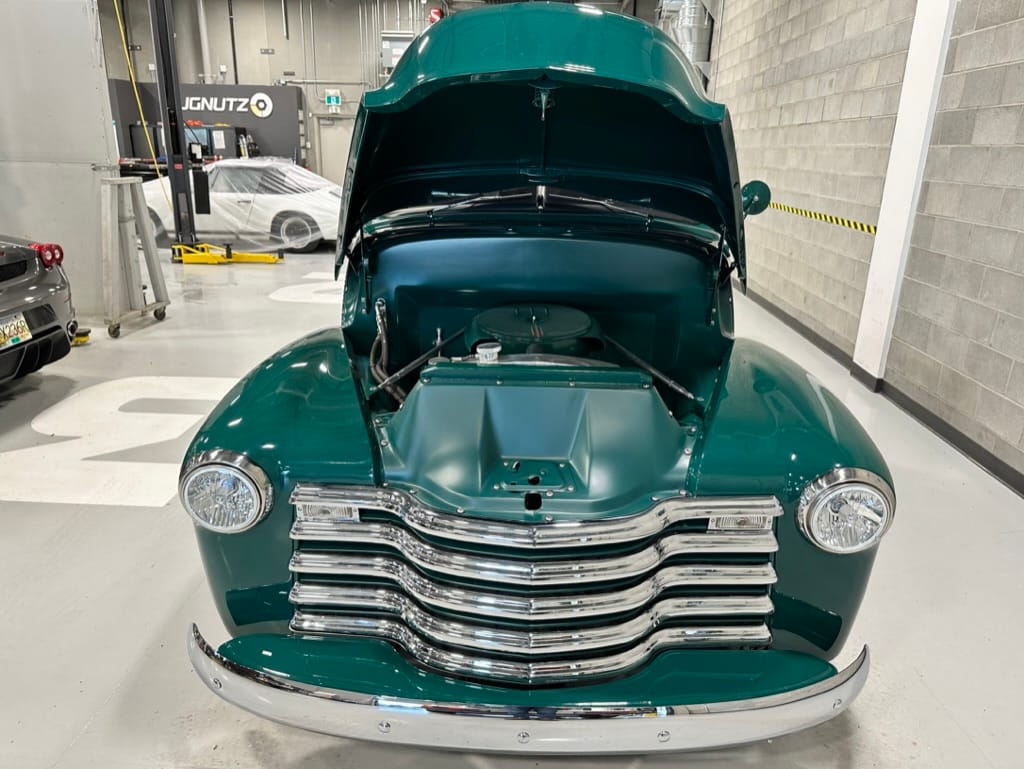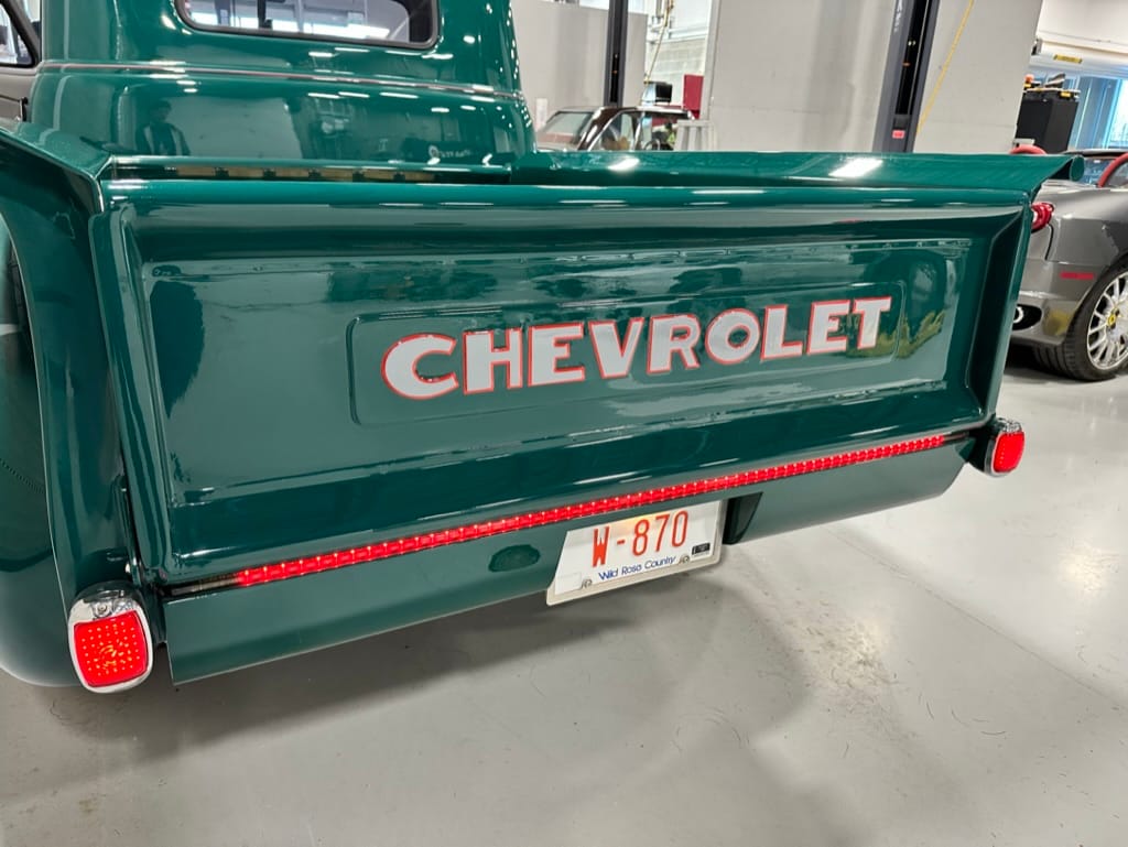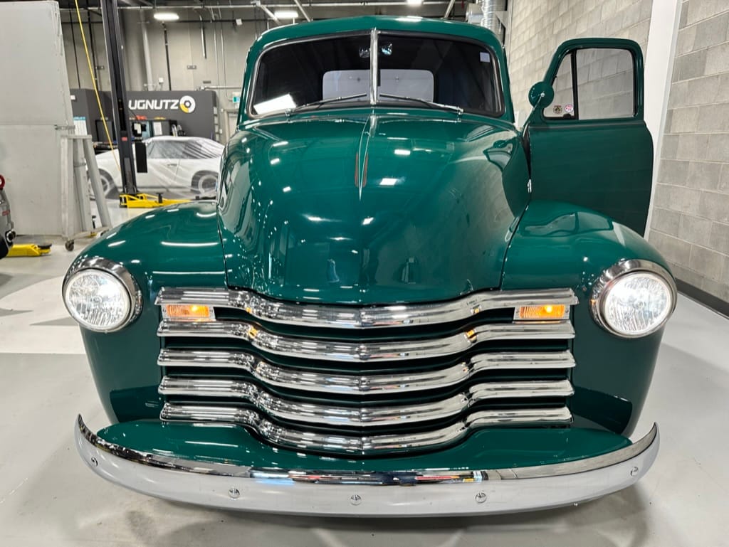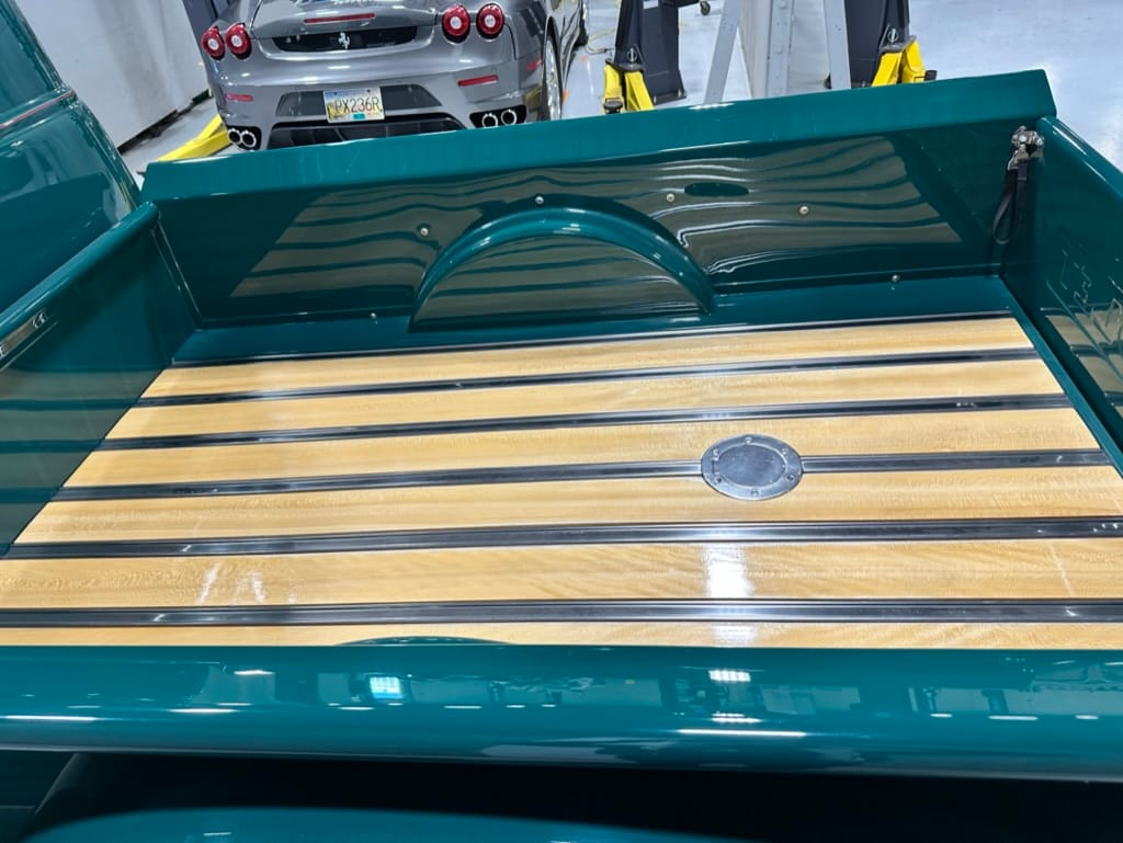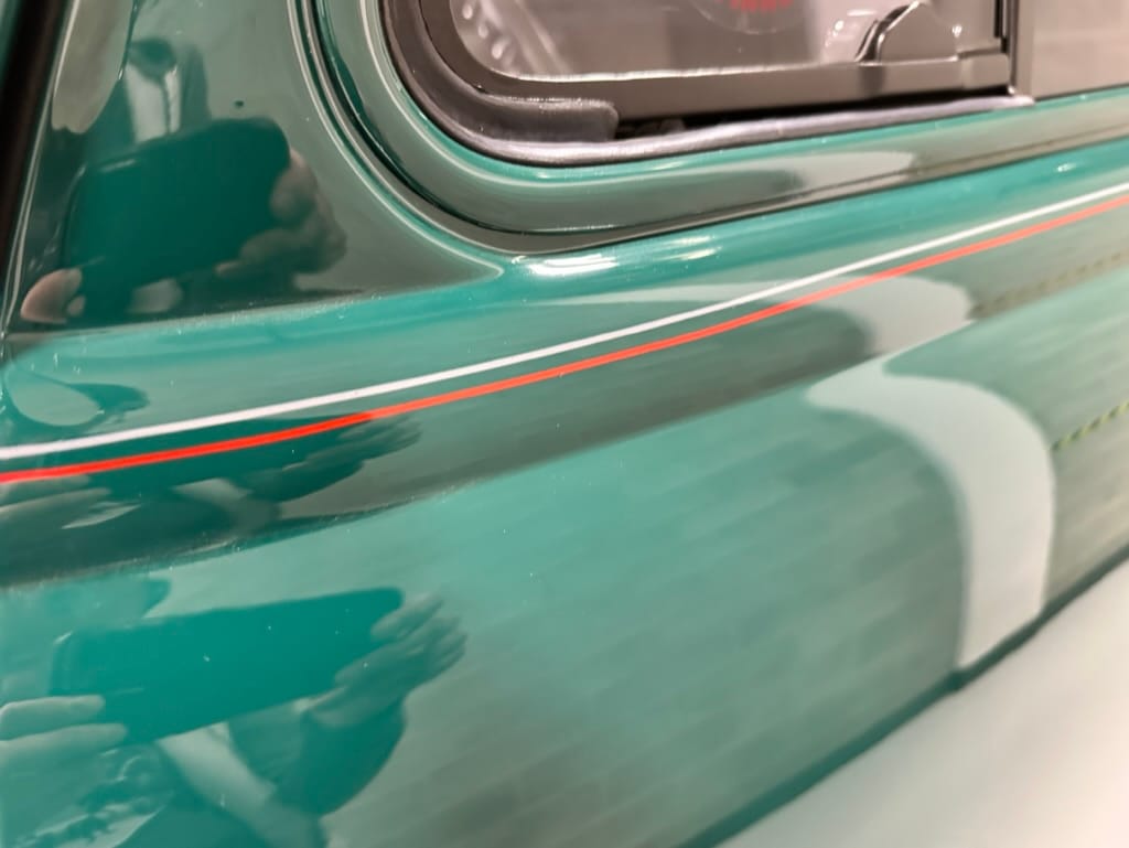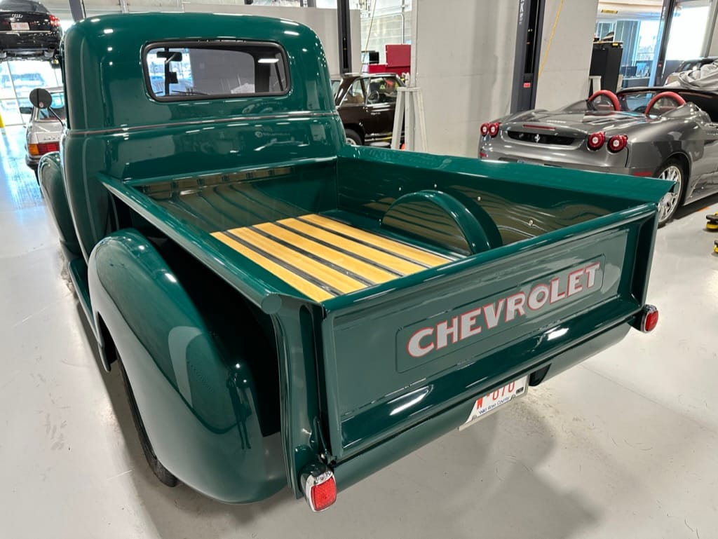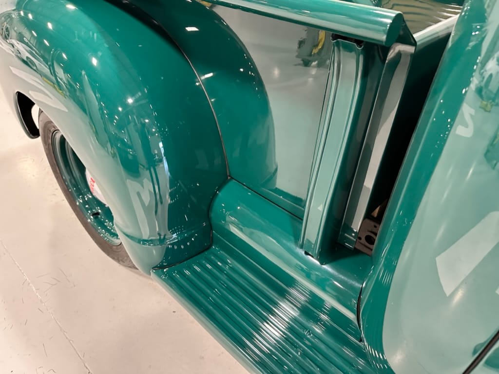Custom rear roll pan, shaved doors with electro-mechanical opening, one-piece welded bonnet, smoothed tailgate, rear bed tubbed, ‘Bitchin’ Products’ firewall, Axalta Woodland Green paint with hand painted pin striping.