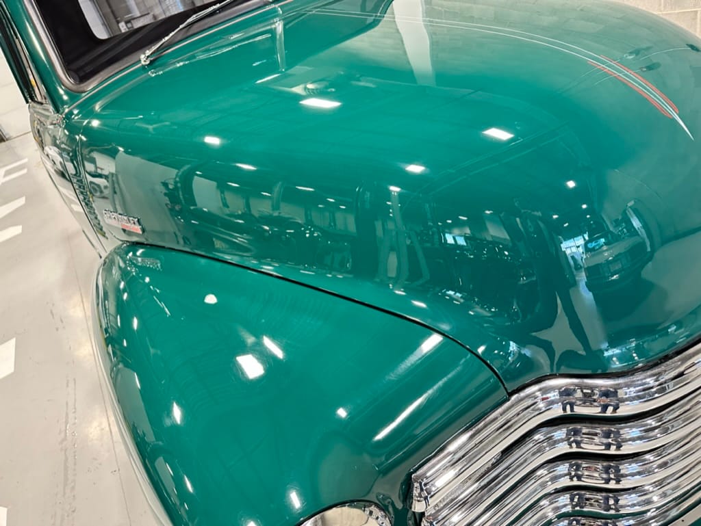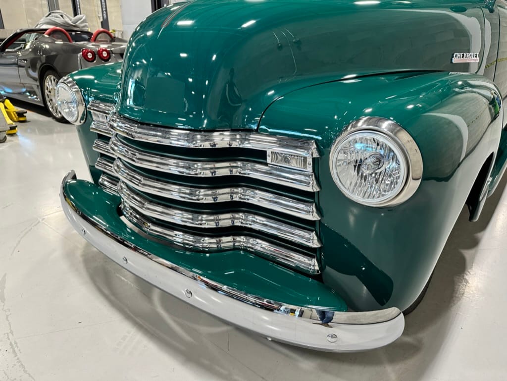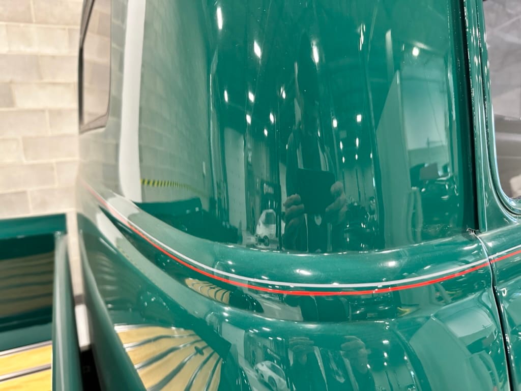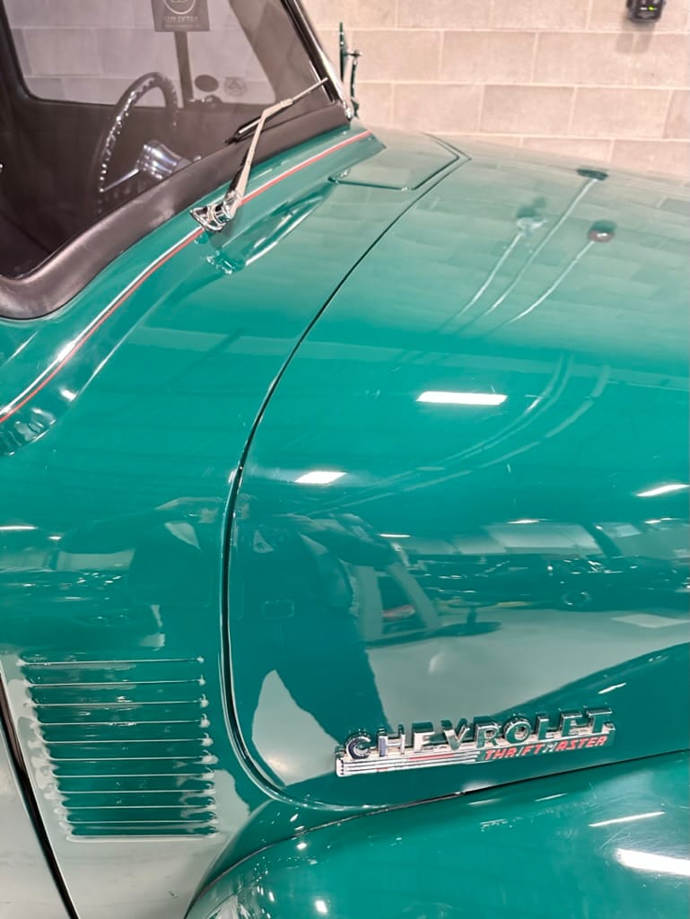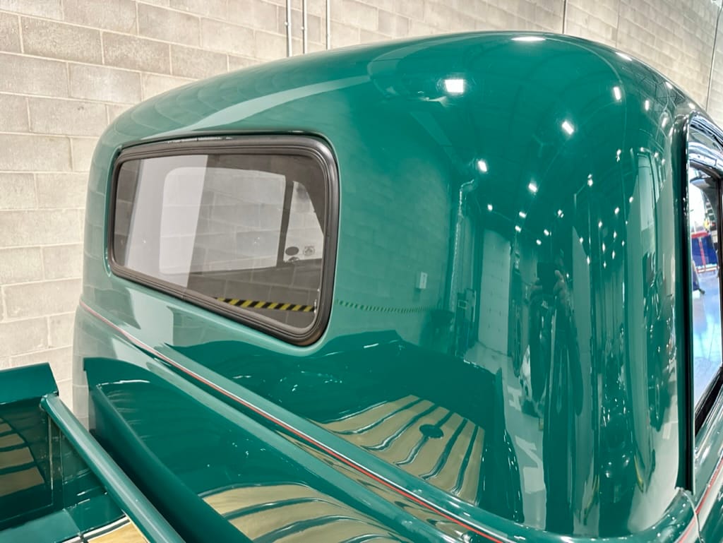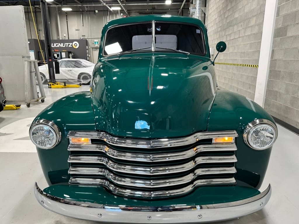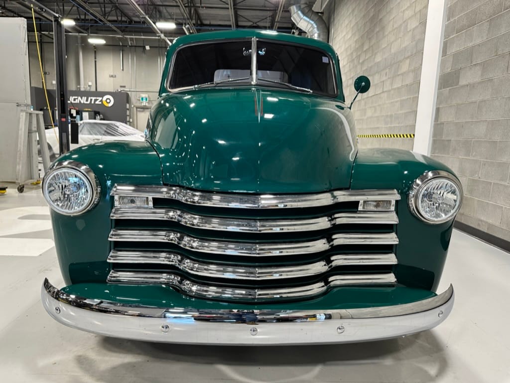Custom rear roll pan, shaved doors with electro-mechanical opening, one-piece welded bonnet, smoothed tailgate, rear bed tubbed, ‘Bitchin’ Products’ firewall, Axalta Woodland Green paint with hand painted pin striping.