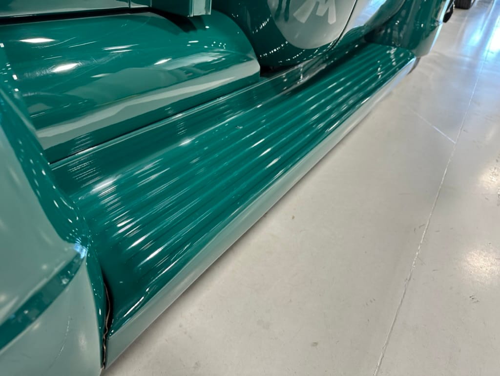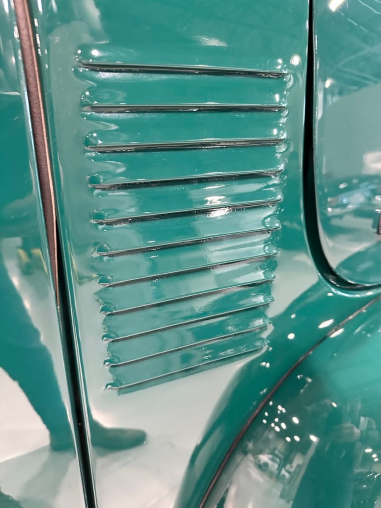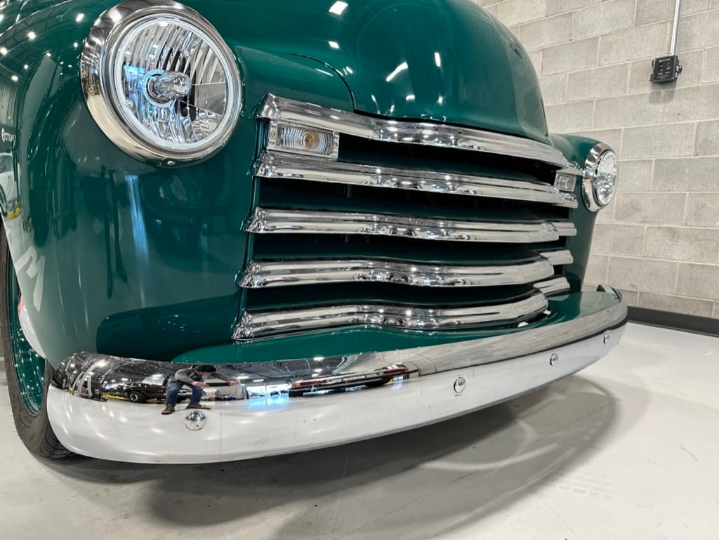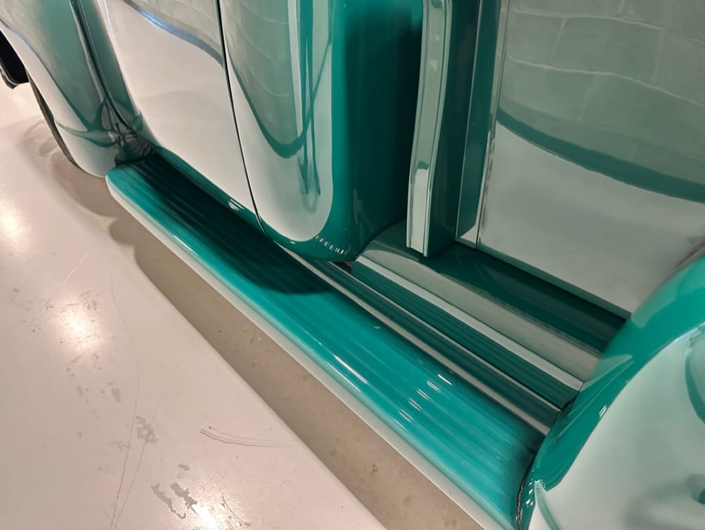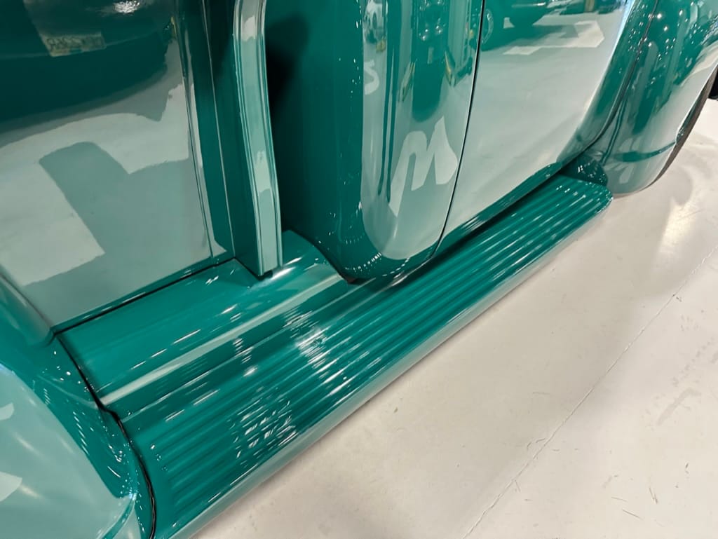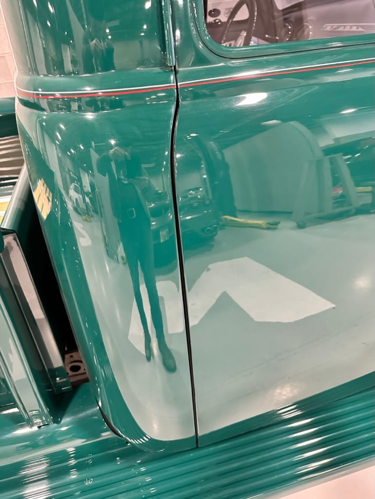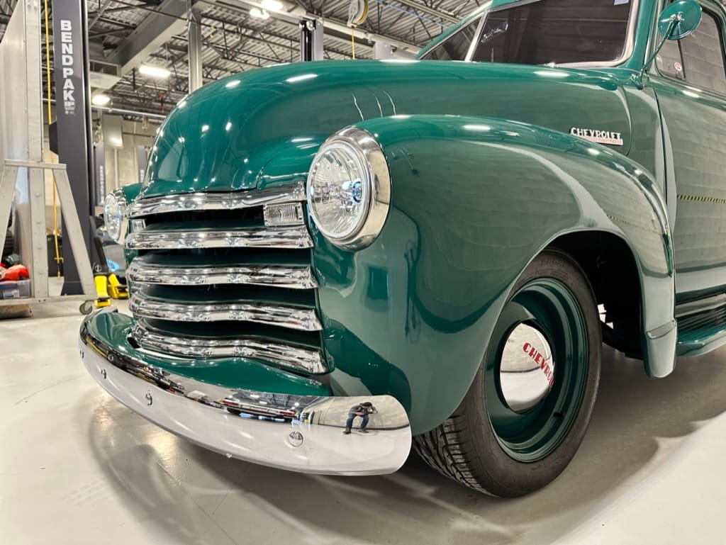 Custom rear roll pan, shaved doors with electro-mechanical opening, one-piece welded bonnet, smoothed tailgate, rear bed tubbed, ‘Bitchin’ Products’ firewall, Axalta Woodland Green paint with hand painted pin striping.
