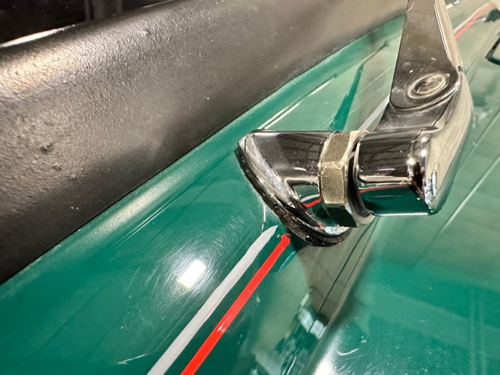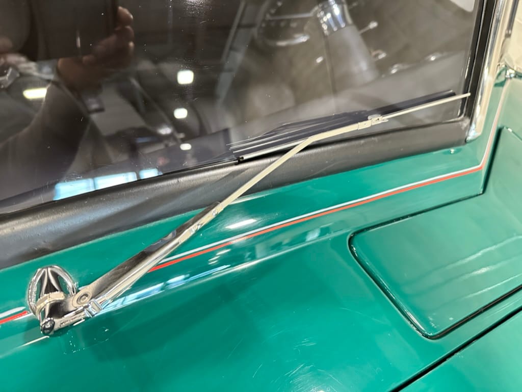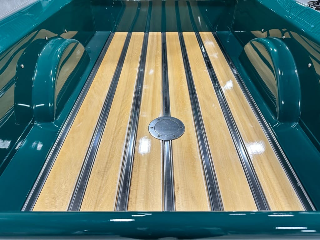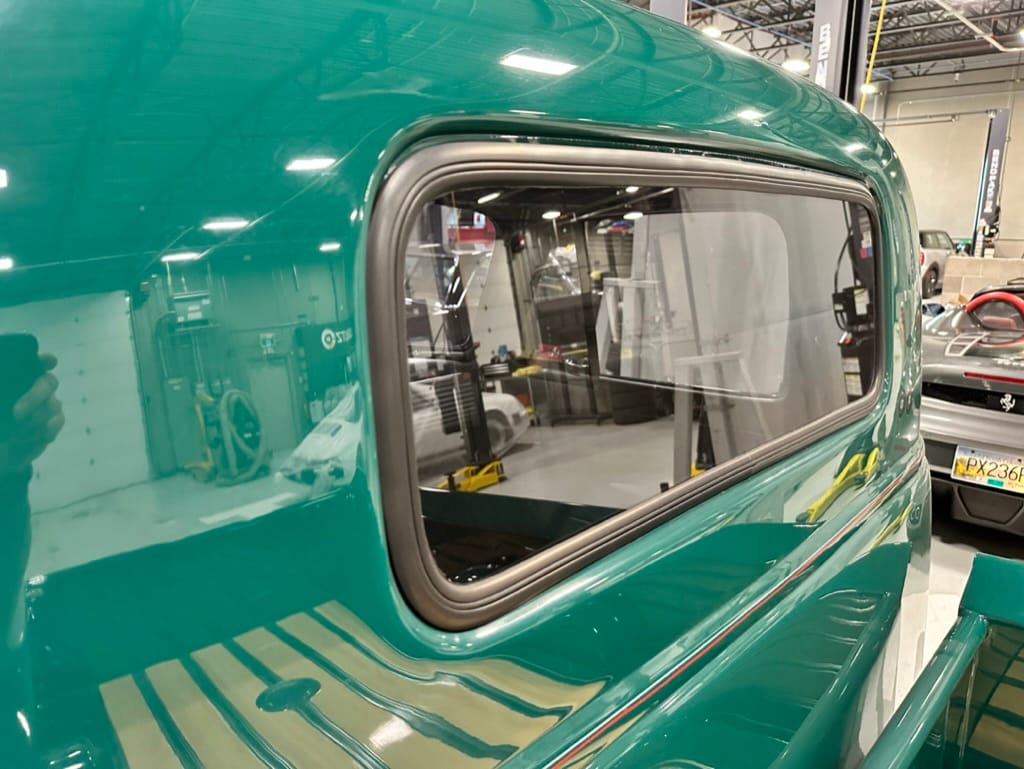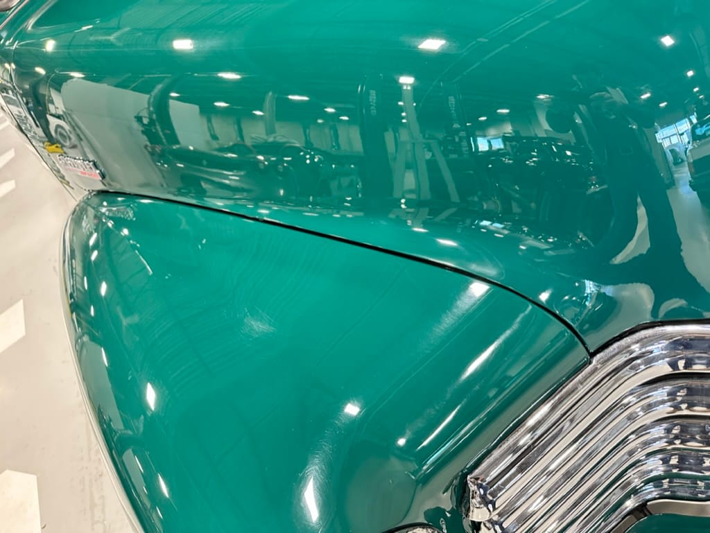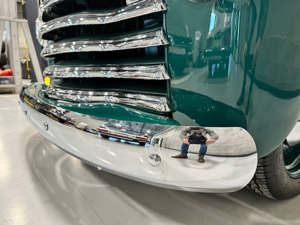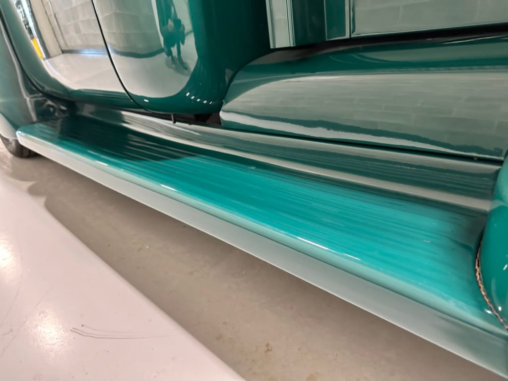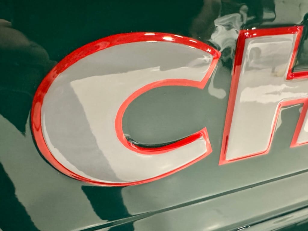 Custom rear roll pan, shaved doors with electro-mechanical opening, one-piece welded bonnet, smoothed tailgate, rear bed tubbed, ‘Bitchin’ Products’ firewall, Axalta Woodland Green paint with hand painted pin striping.