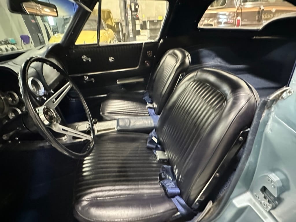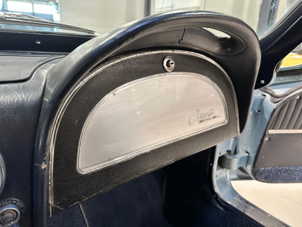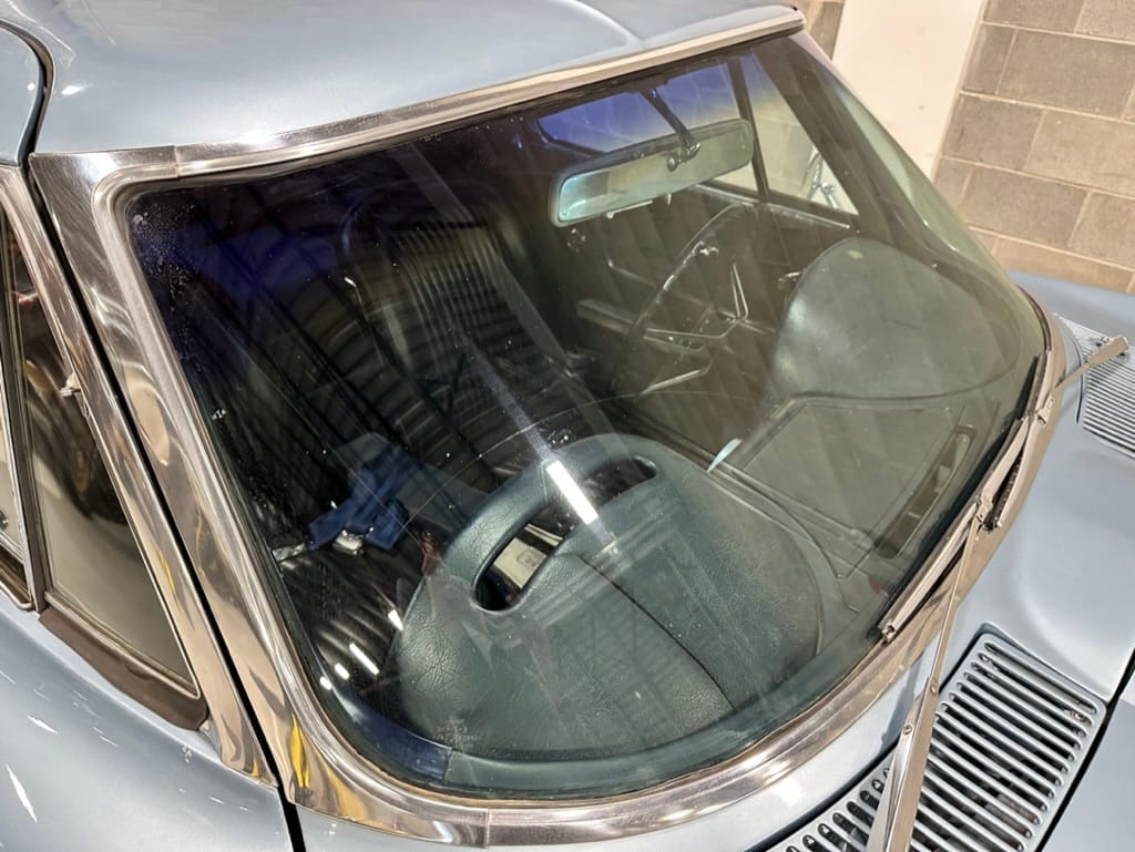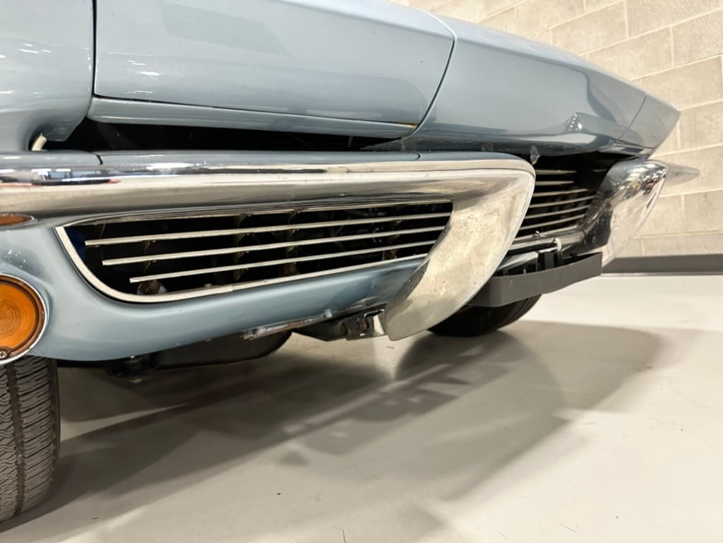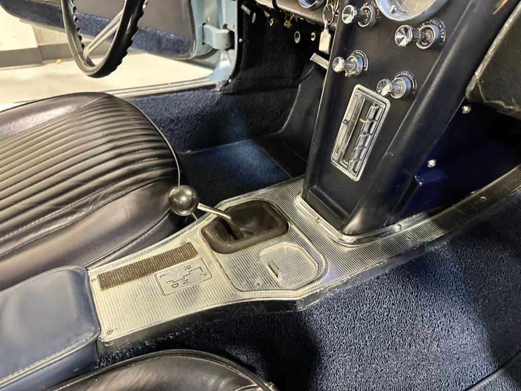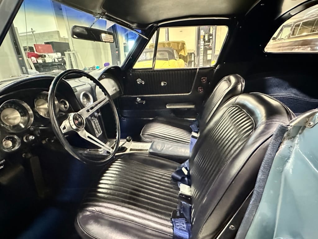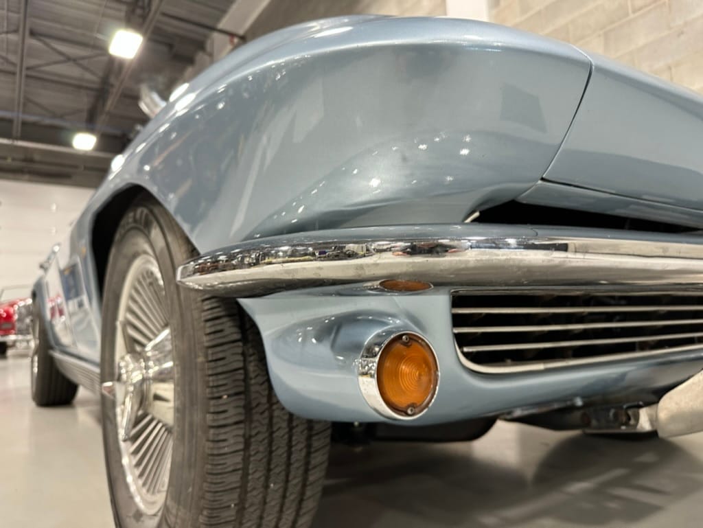 The fiberglass body was refinished in silver blue in 2000, and seller tells us that evidence of past repair was discovered on the rear quarter panel during the process, which is believed to have resulted from some body damage that occurred prior to the owner’s purchase in 1971. The bodywork was then redone as part of the refurbishment. The chrome and rubber components were also replaced at this time. Features include flip-up headlamps, fender vents, quad tail lamps, chrome bumperettes, and dual exhaust tips that exit through the rear valance. The seller notes some paint chips, bubbles, and stress cracks.