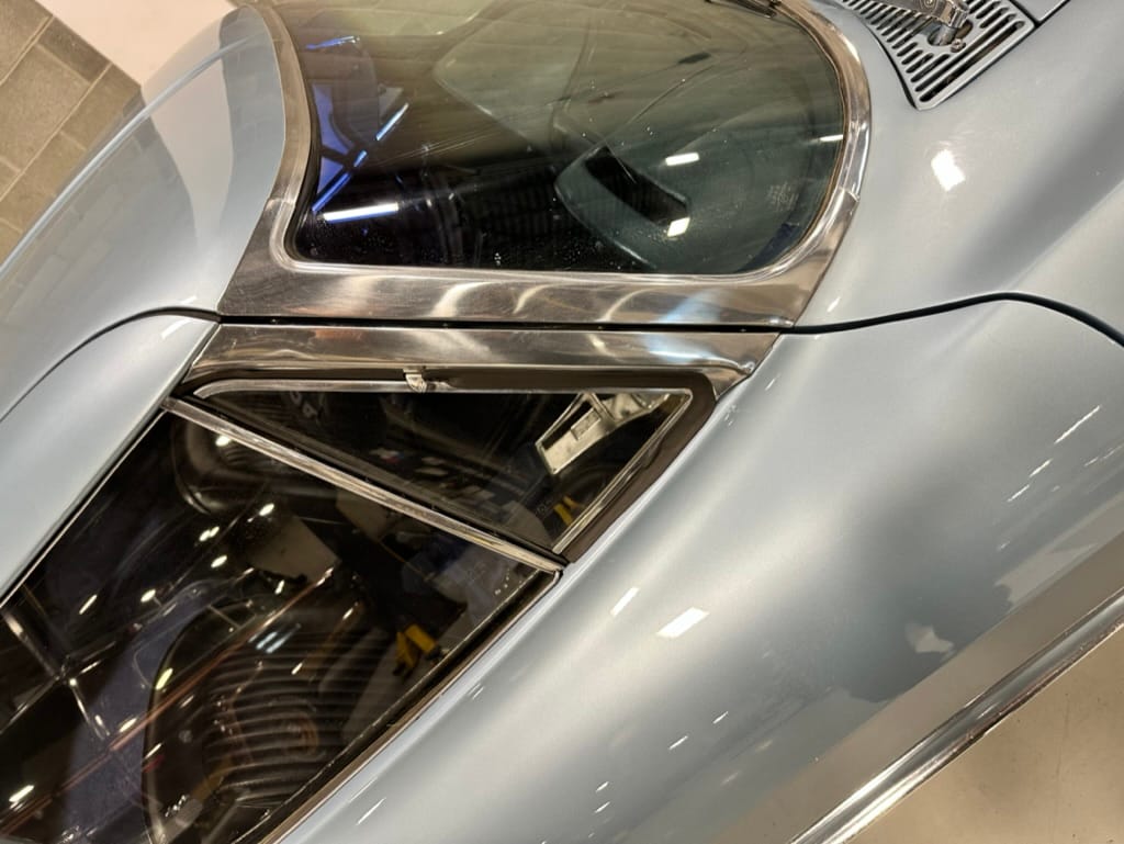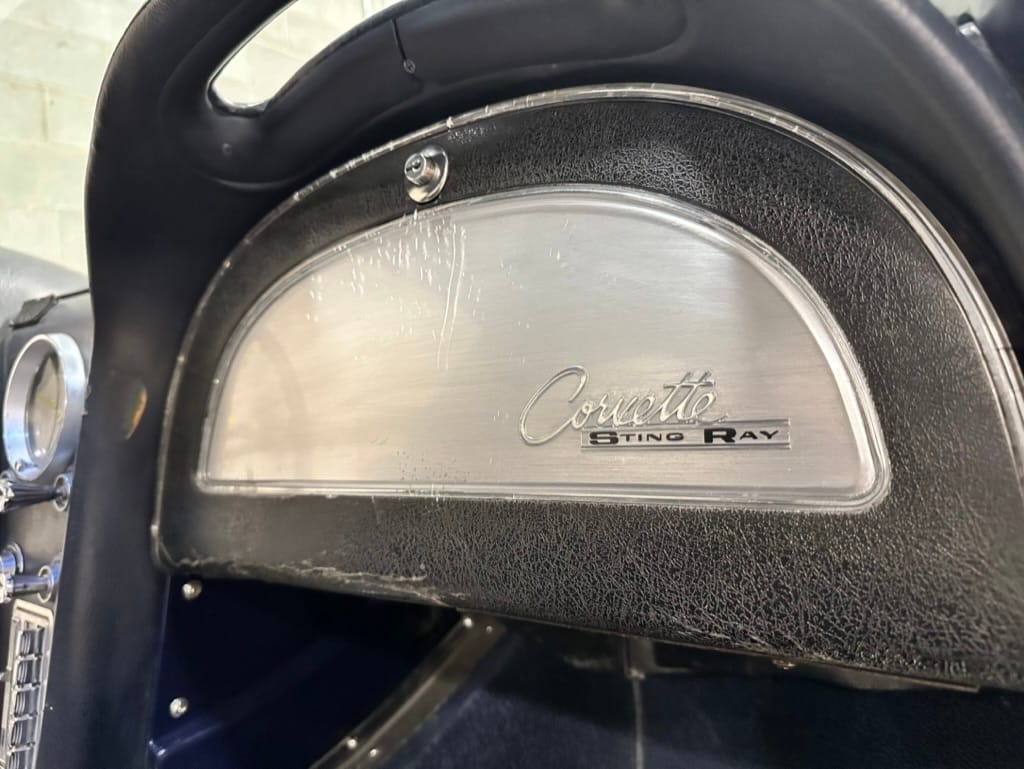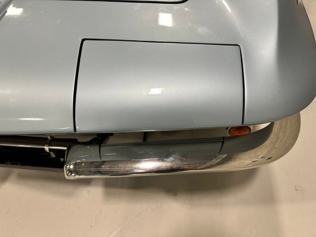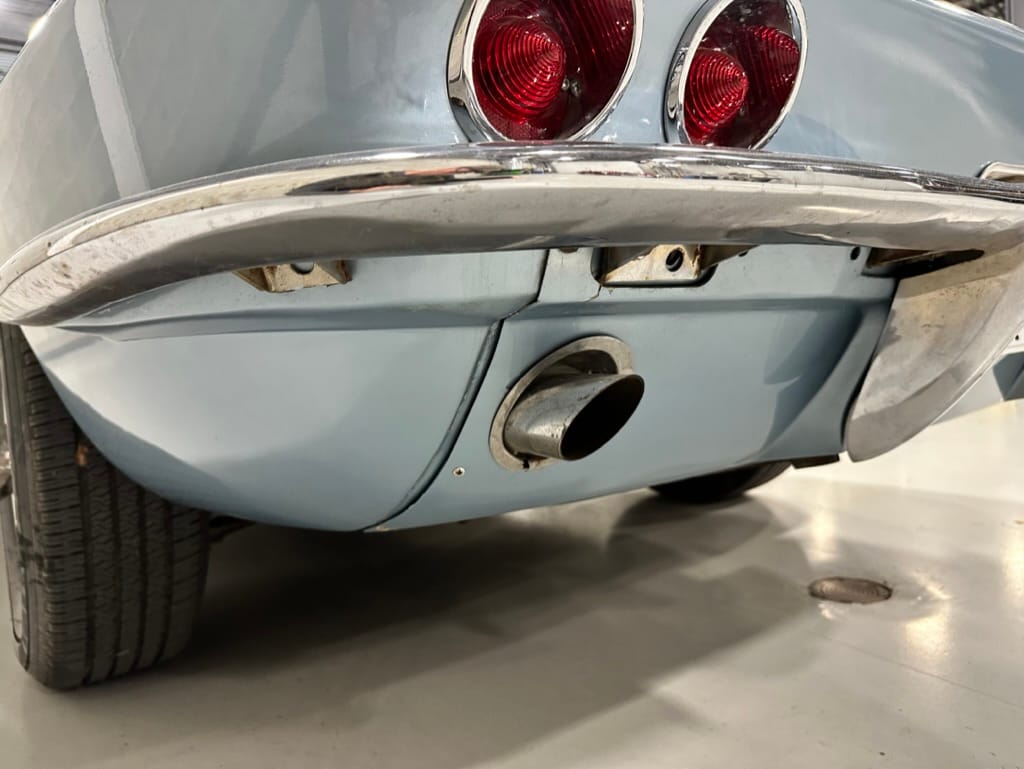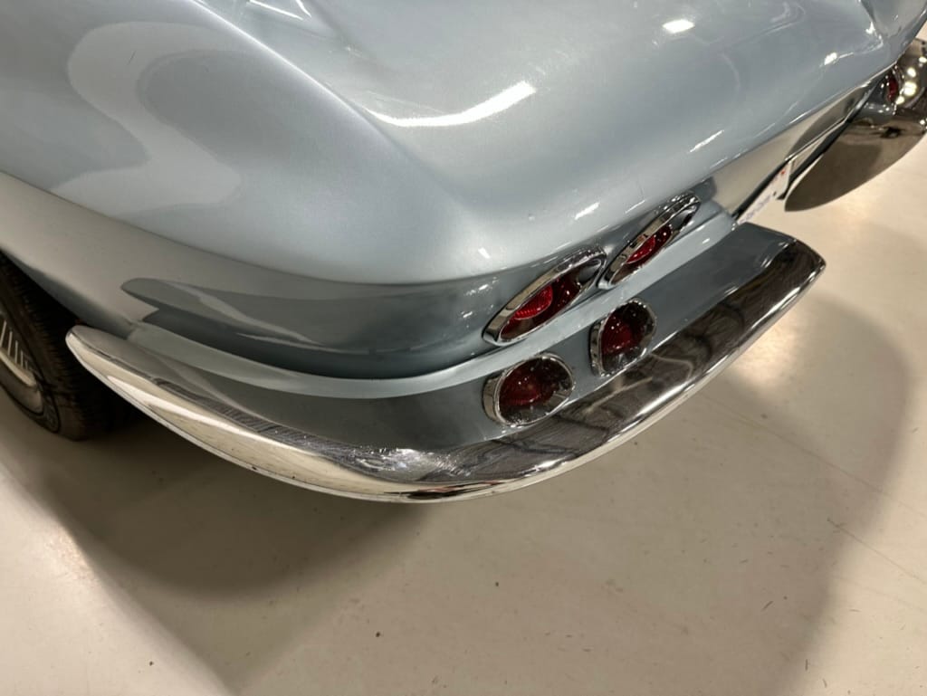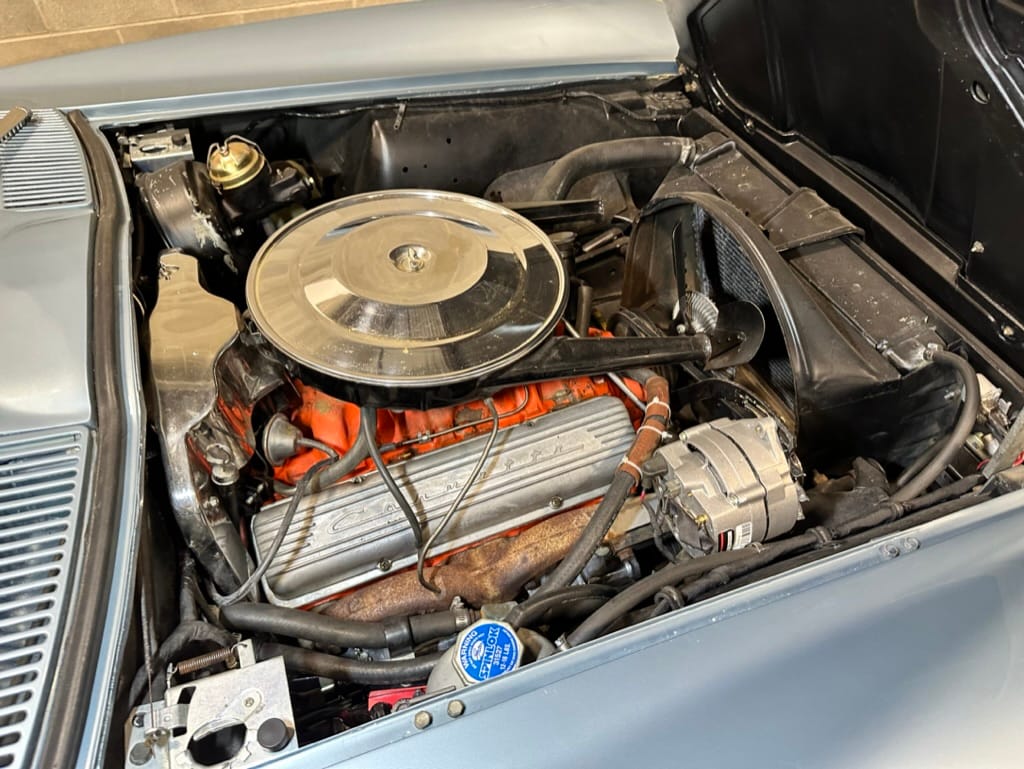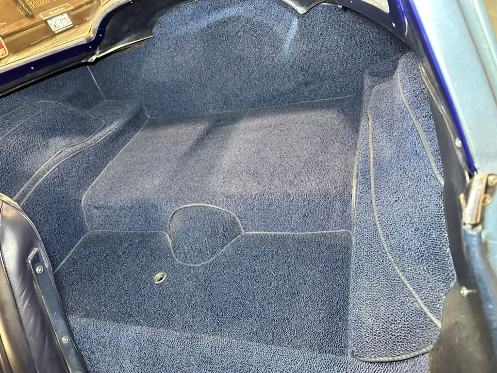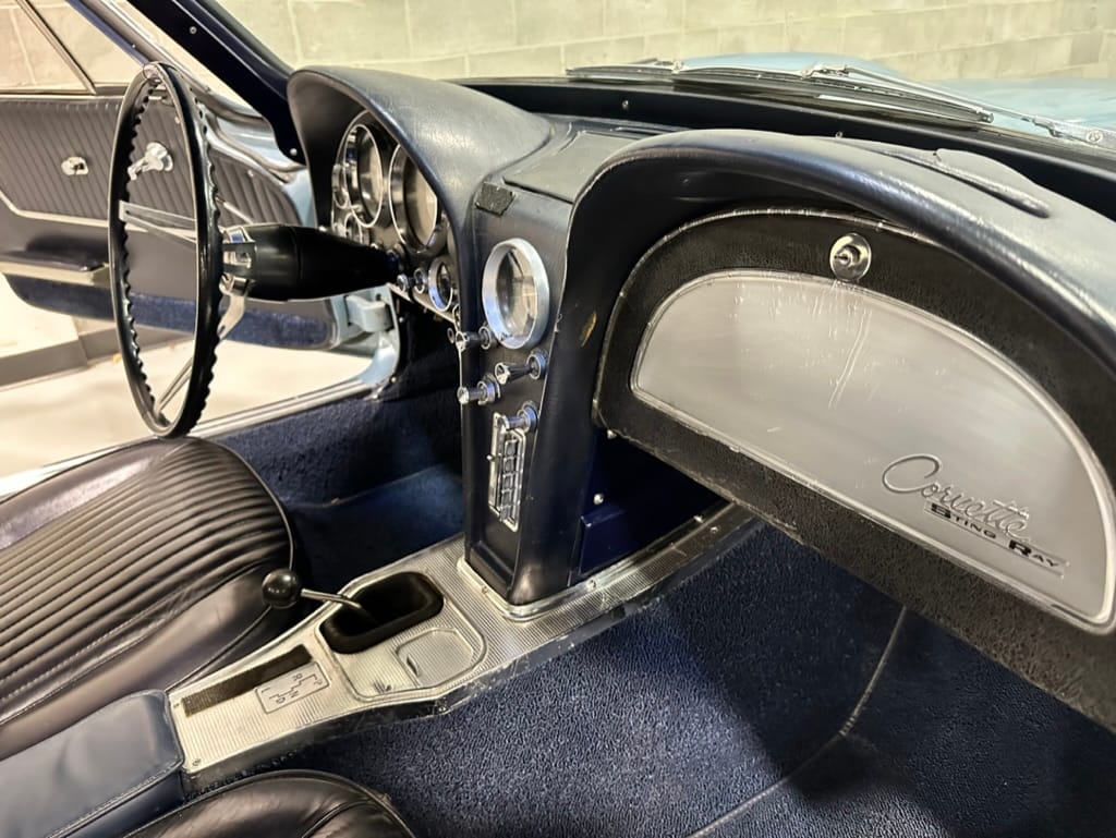 The fiberglass body was refinished in silver blue in 2000, and seller tells us that evidence of past repair was discovered on the rear quarter panel during the process, which is believed to have resulted from some body damage that occurred prior to the owner’s purchase in 1971. The bodywork was then redone as part of the refurbishment. The chrome and rubber components were also replaced at this time. Features include flip-up headlamps, fender vents, quad tail lamps, chrome bumperettes, and dual exhaust tips that exit through the rear valance. The seller notes some paint chips, bubbles, and stress cracks.