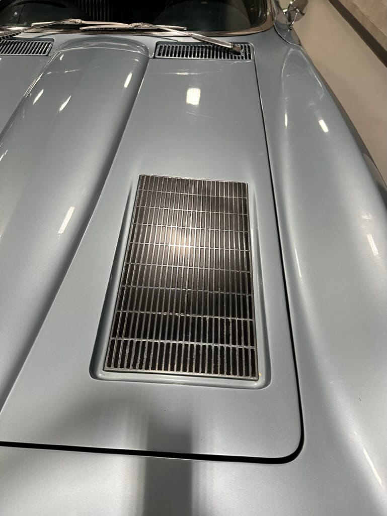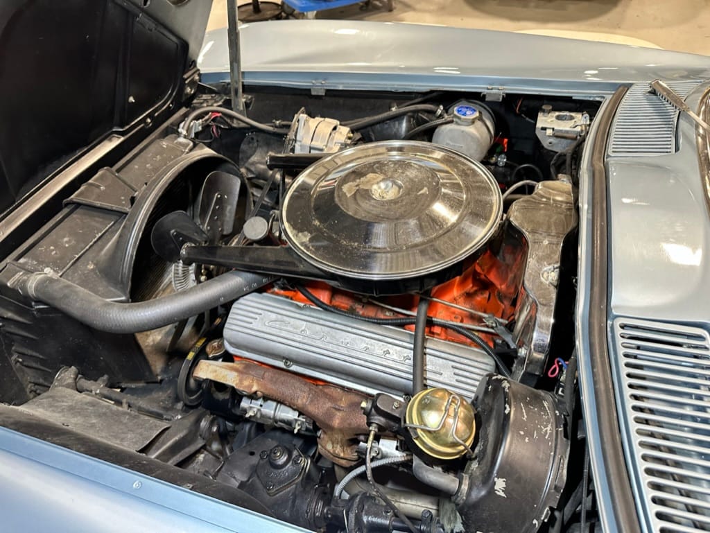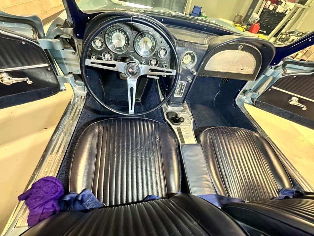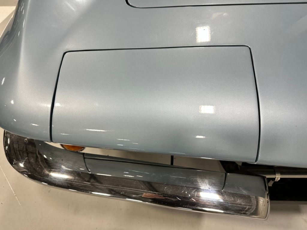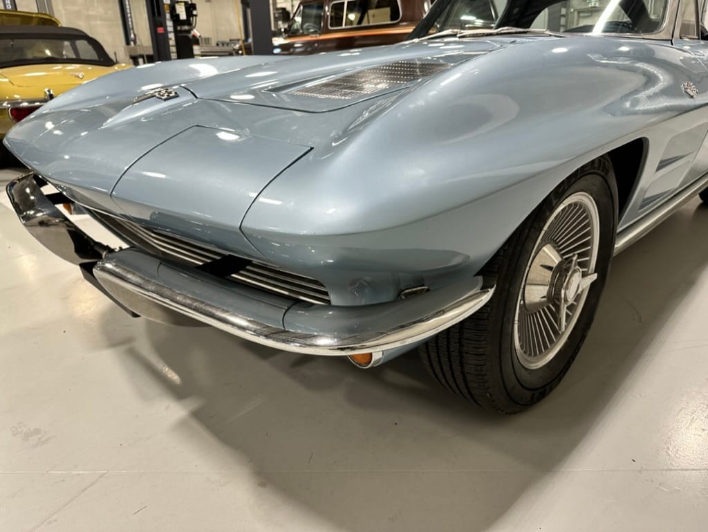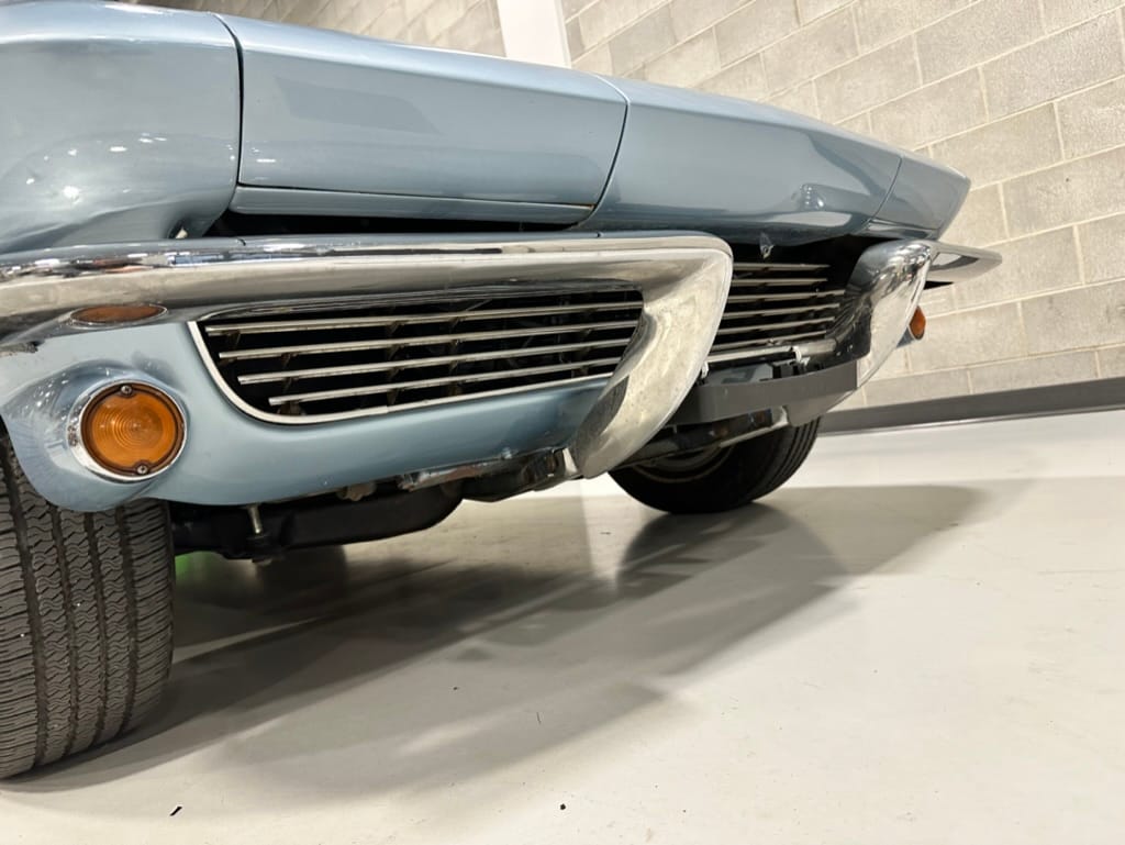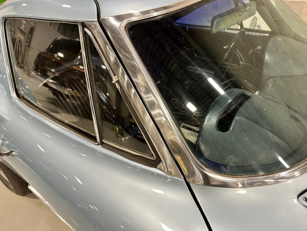 The fiberglass body was refinished in silver blue in 2000, and seller tells us that evidence of past repair was discovered on the rear quarter panel during the process, which is believed to have resulted from some body damage that occurred prior to the owner’s purchase in 1971. The bodywork was then redone as part of the refurbishment. The chrome and rubber components were also replaced at this time. Features include flip-up headlamps, fender vents, quad tail lamps, chrome bumperettes, and dual exhaust tips that exit through the rear valance. The seller notes some paint chips, bubbles, and stress cracks.