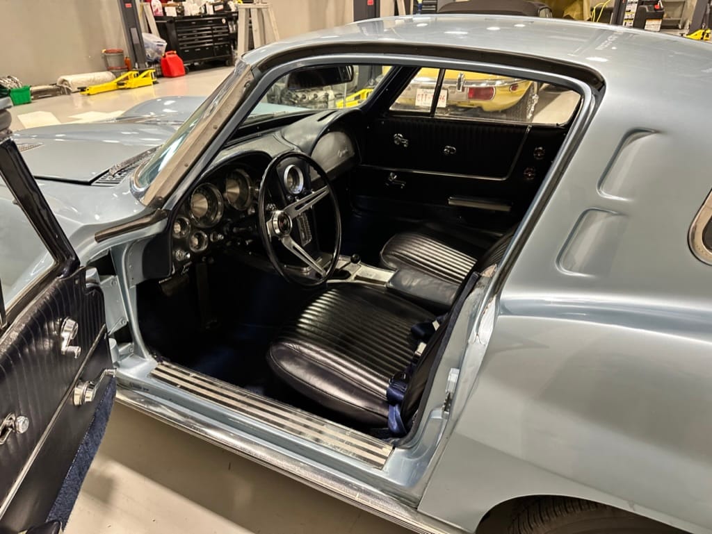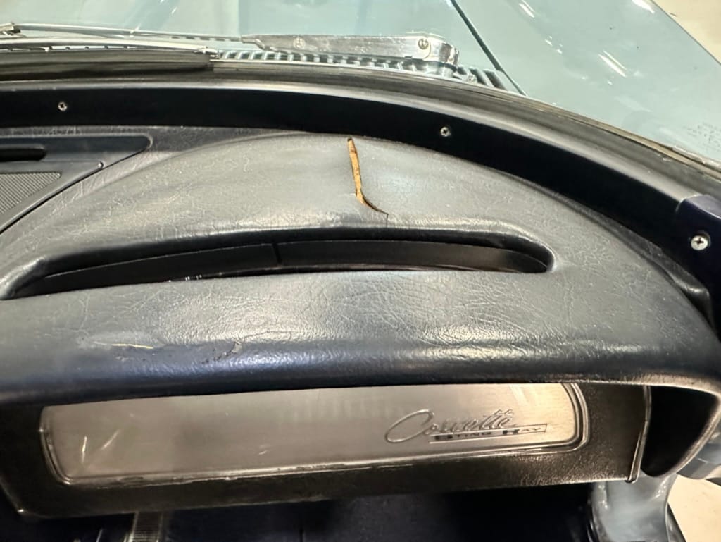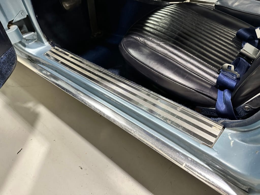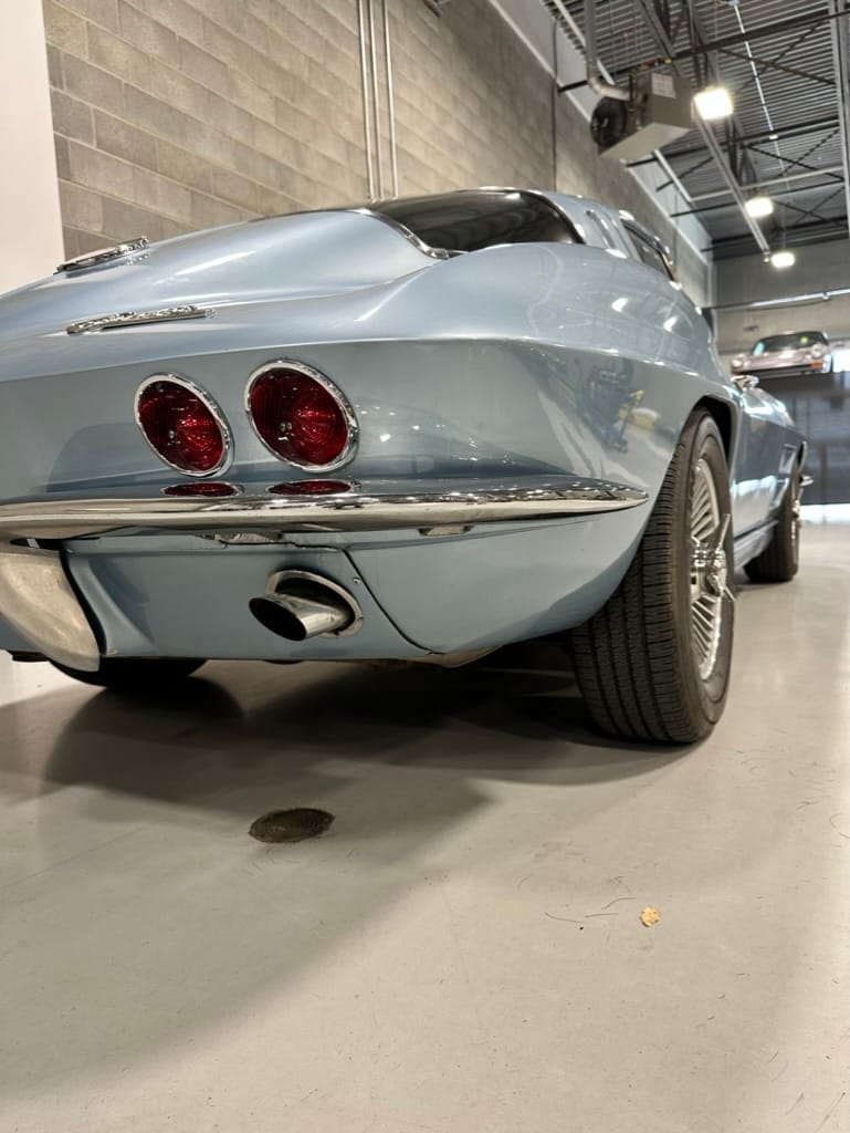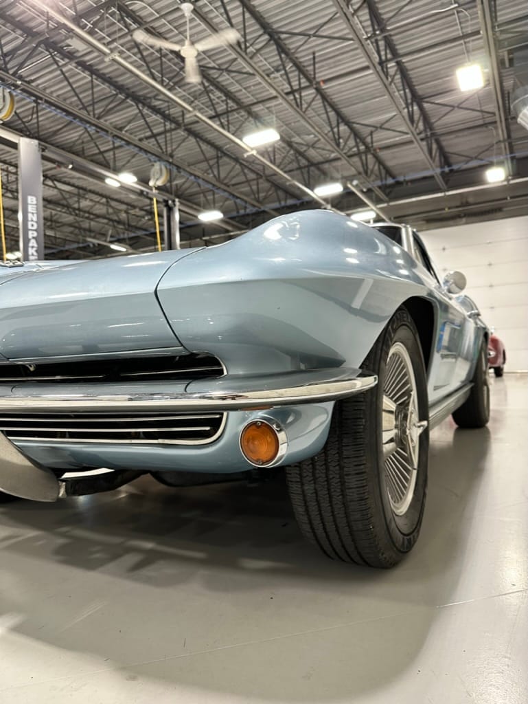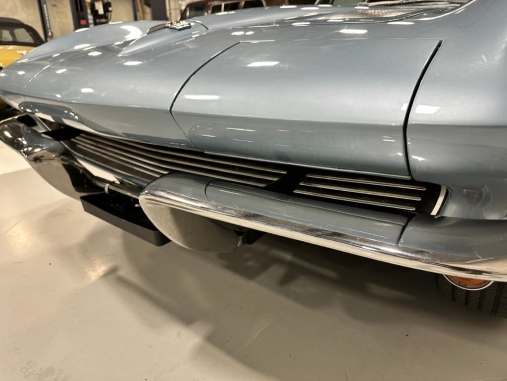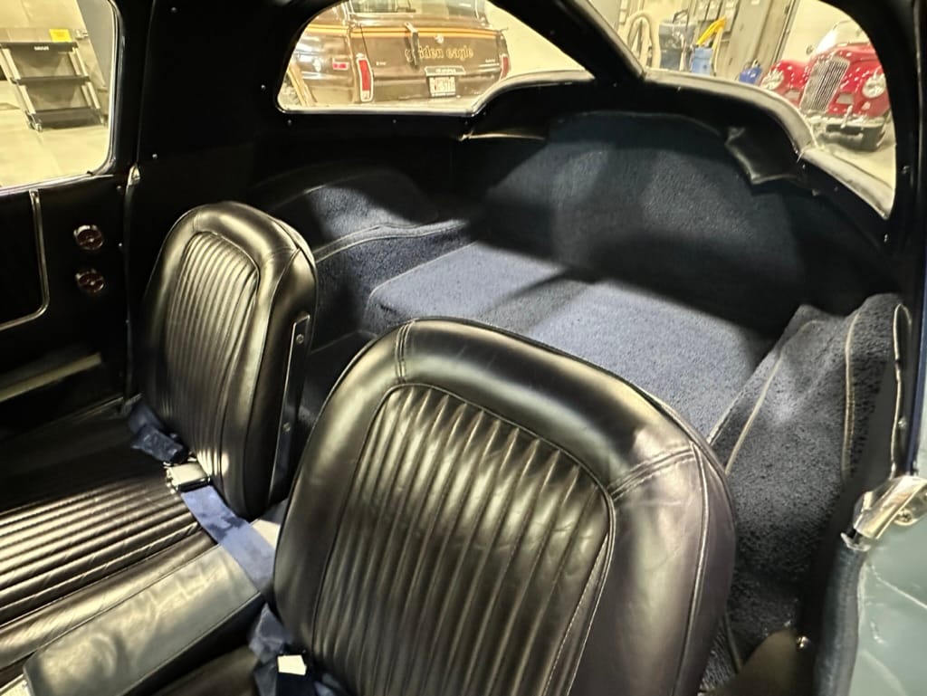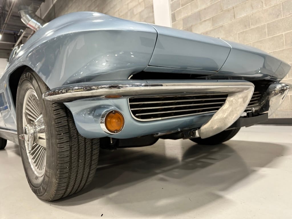 The fiberglass body was refinished in silver blue in 2000, and seller tells us that evidence of past repair was discovered on the rear quarter panel during the process, which is believed to have resulted from some body damage that occurred prior to the owner’s purchase in 1971. The bodywork was then redone as part of the refurbishment. The chrome and rubber components were also replaced at this time. Features include flip-up headlamps, fender vents, quad tail lamps, chrome bumperettes, and dual exhaust tips that exit through the rear valance. The seller notes some paint chips, bubbles, and stress cracks.