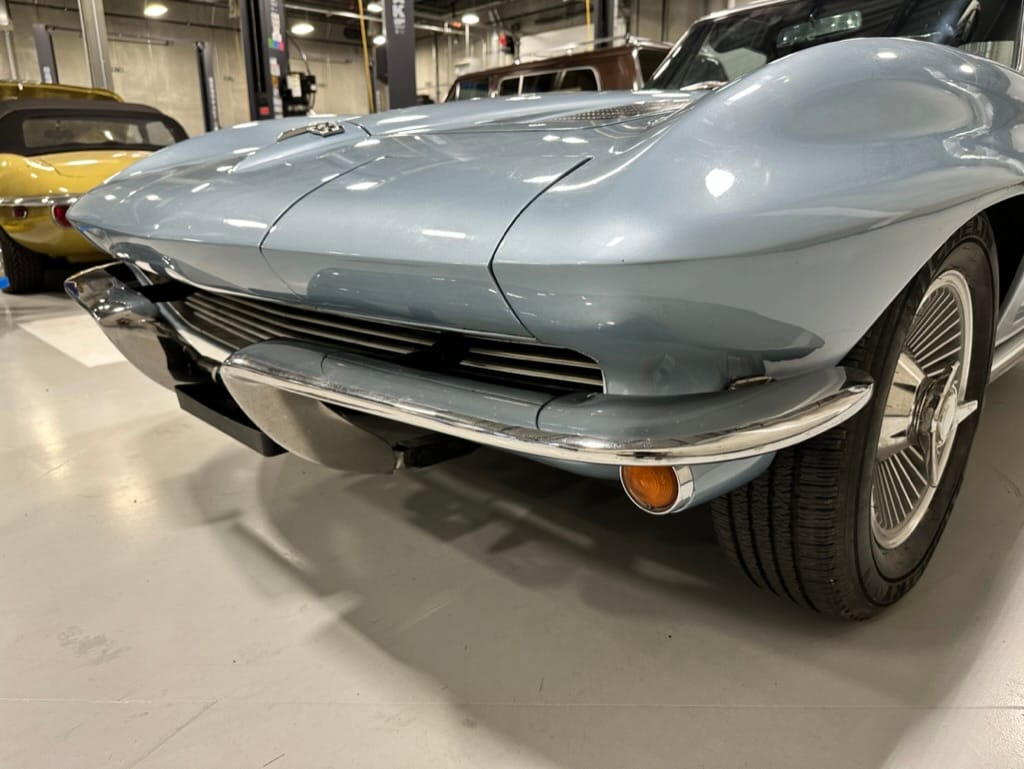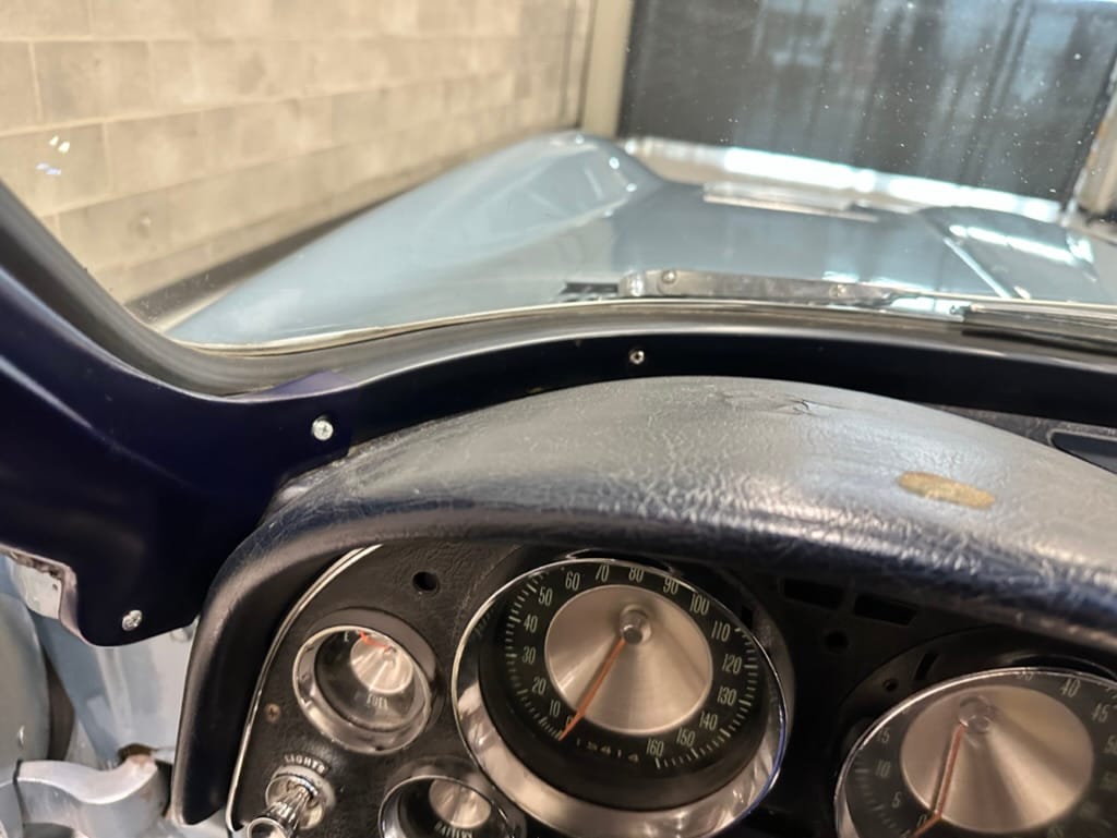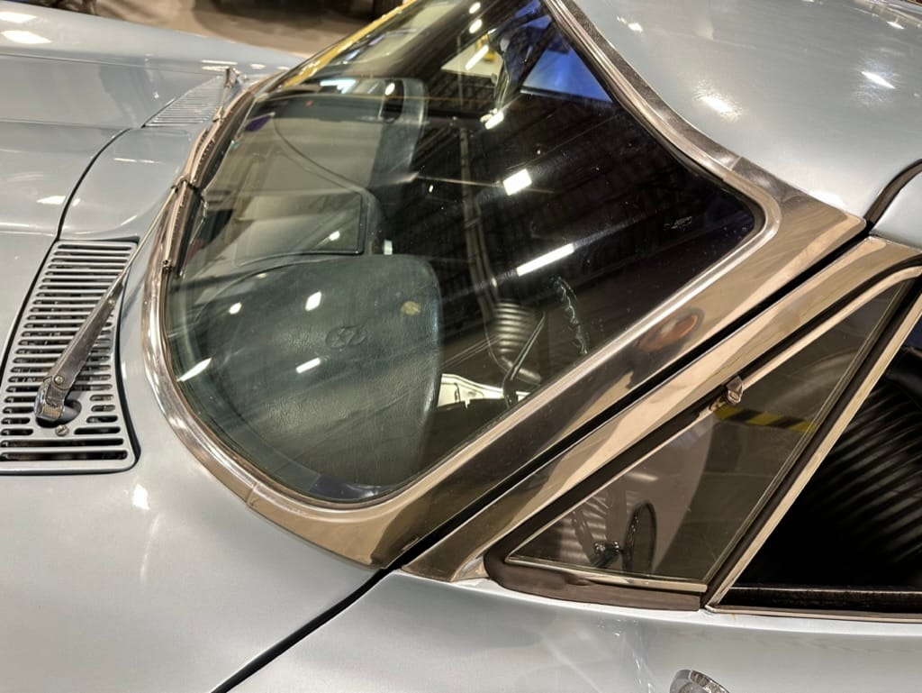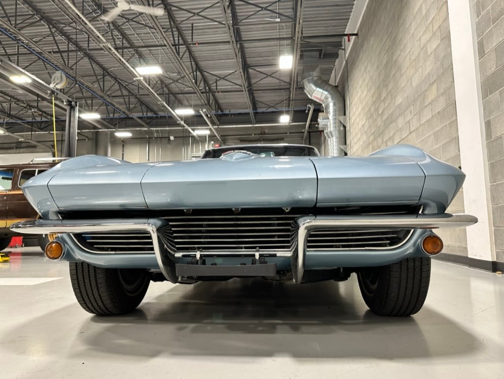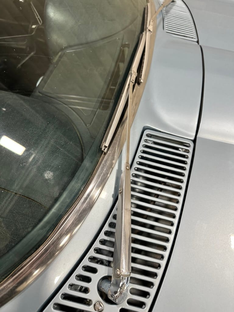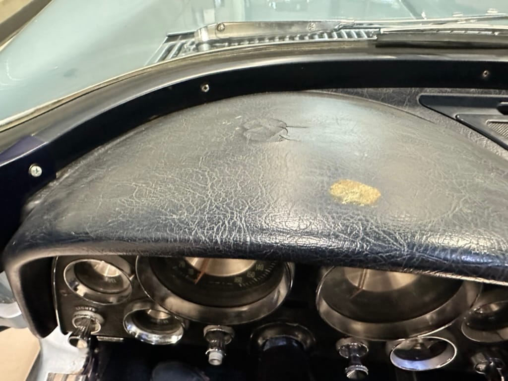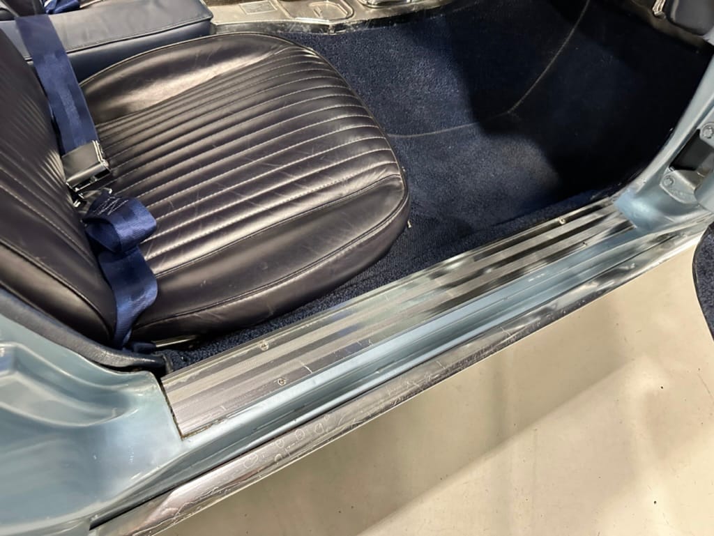 The fiberglass body was refinished in silver blue in 2000, and seller tells us that evidence of past repair was discovered on the rear quarter panel during the process, which is believed to have resulted from some body damage that occurred prior to the owner’s purchase in 1971. The bodywork was then redone as part of the refurbishment. The chrome and rubber components were also replaced at this time. Features include flip-up headlamps, fender vents, quad tail lamps, chrome bumperettes, and dual exhaust tips that exit through the rear valance. The seller notes some paint chips, bubbles, and stress cracks.