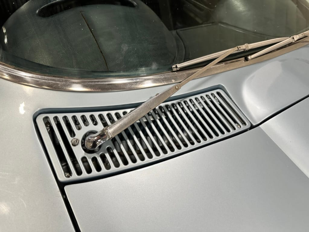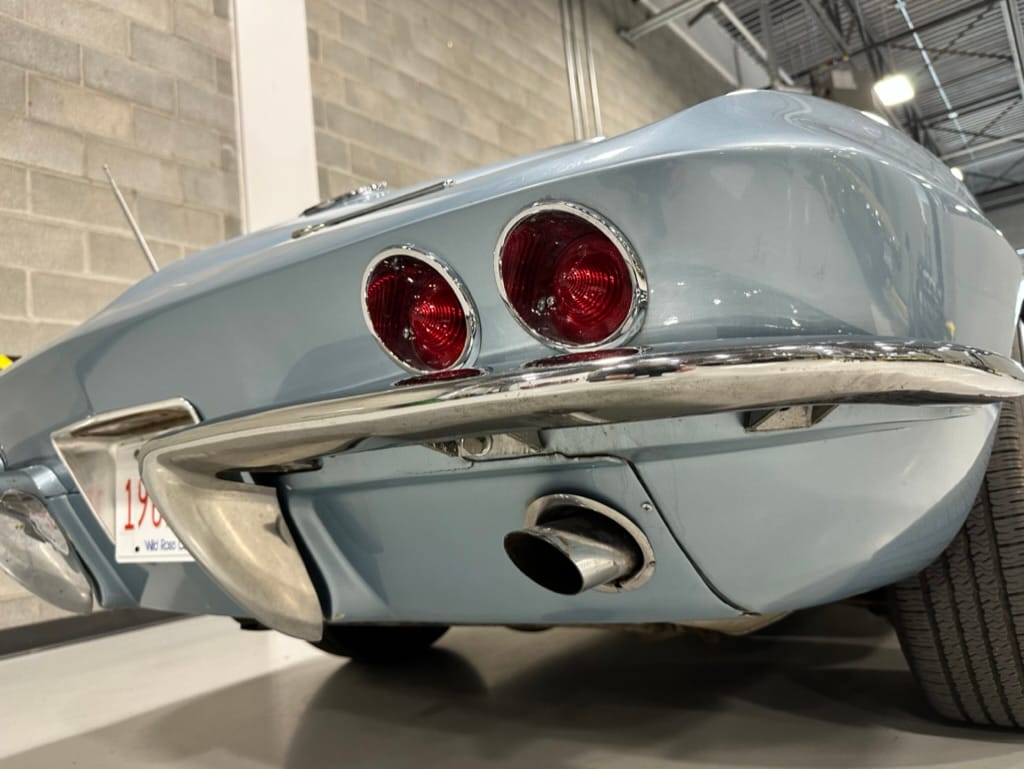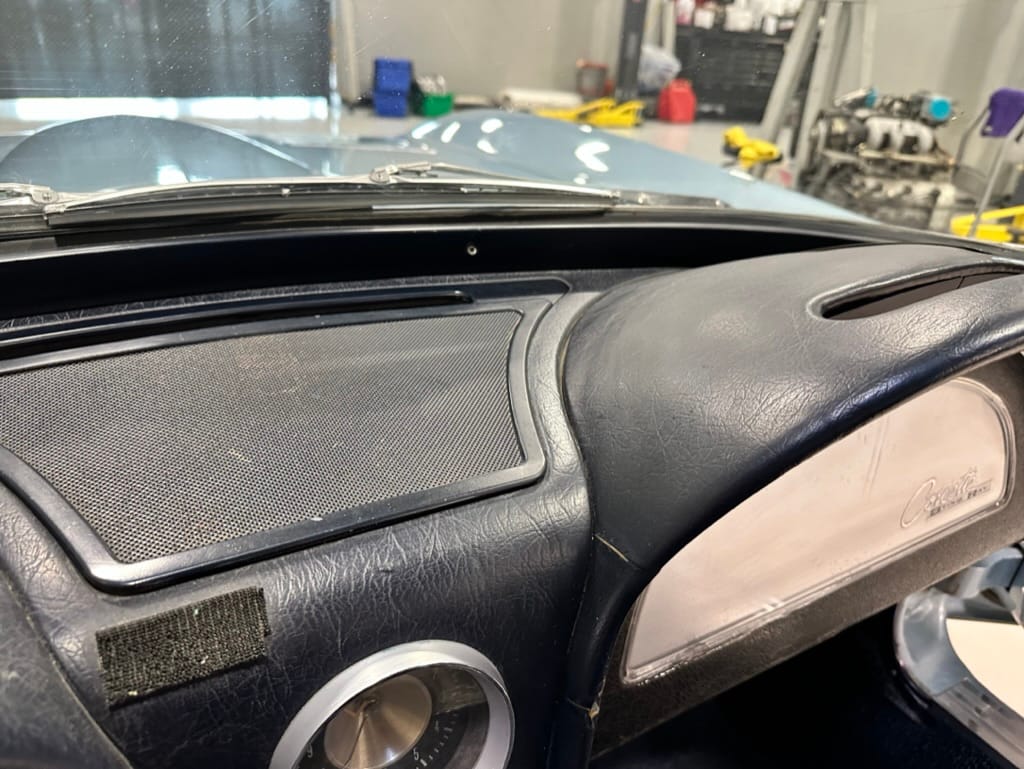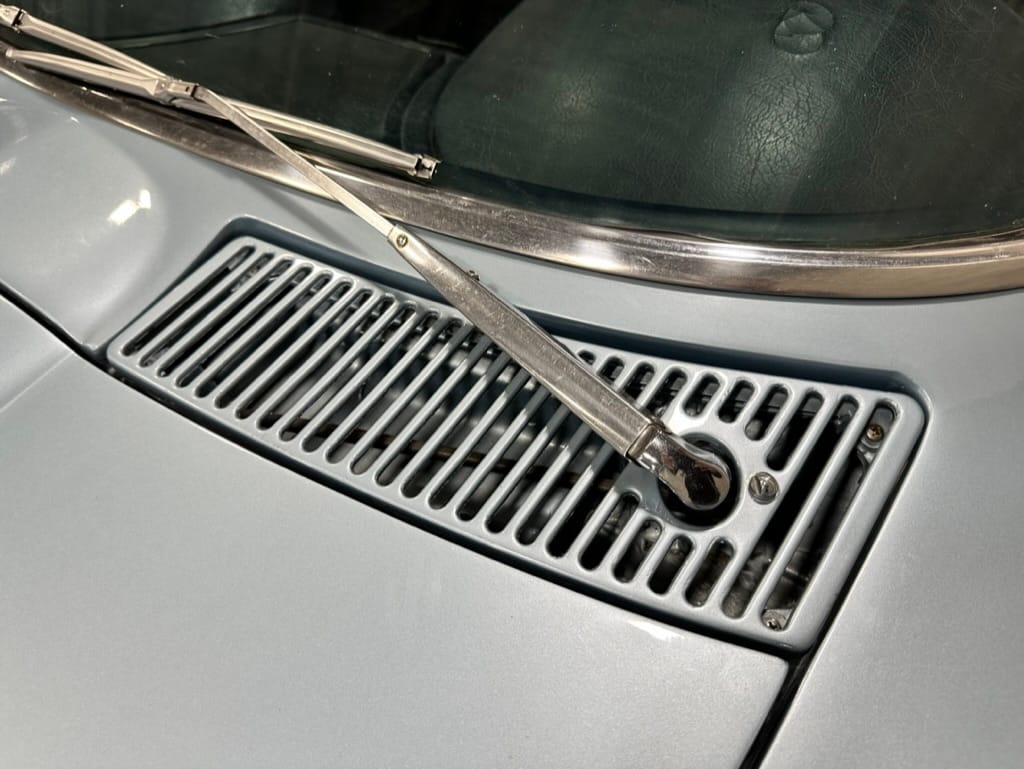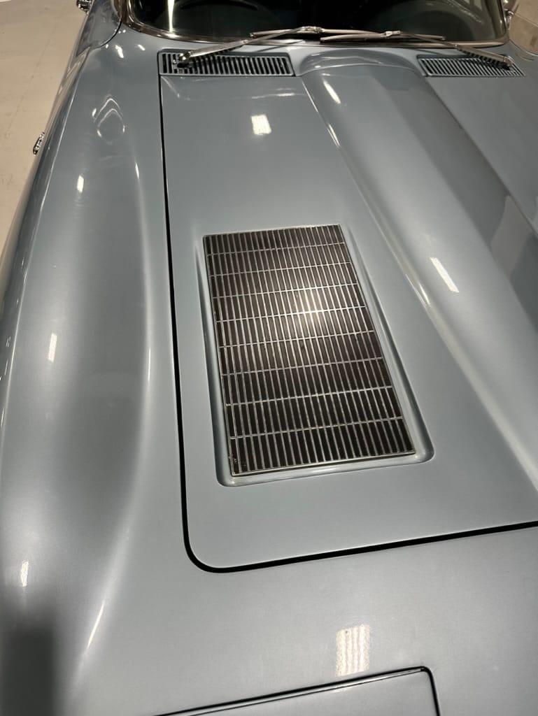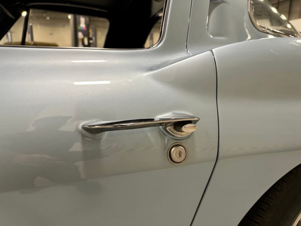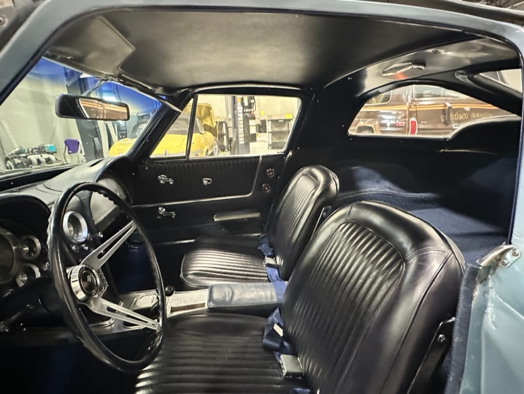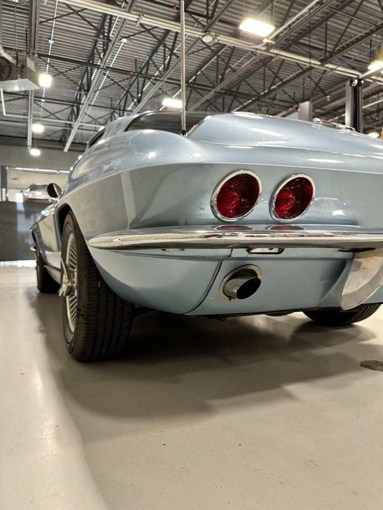 The fiberglass body was refinished in silver blue in 2000, and seller tells us that evidence of past repair was discovered on the rear quarter panel during the process, which is believed to have resulted from some body damage that occurred prior to the owner’s purchase in 1971. The bodywork was then redone as part of the refurbishment. The chrome and rubber components were also replaced at this time. Features include flip-up headlamps, fender vents, quad tail lamps, chrome bumperettes, and dual exhaust tips that exit through the rear valance. The seller notes some paint chips, bubbles, and stress cracks.