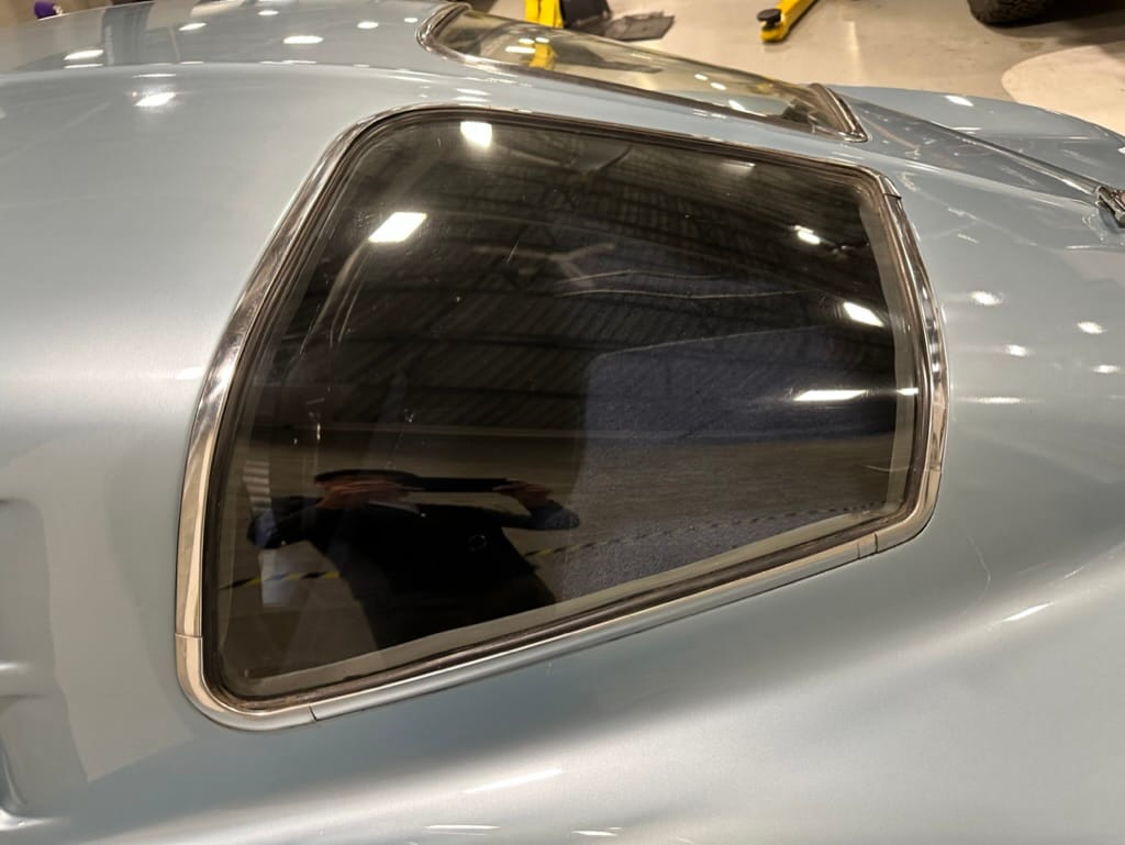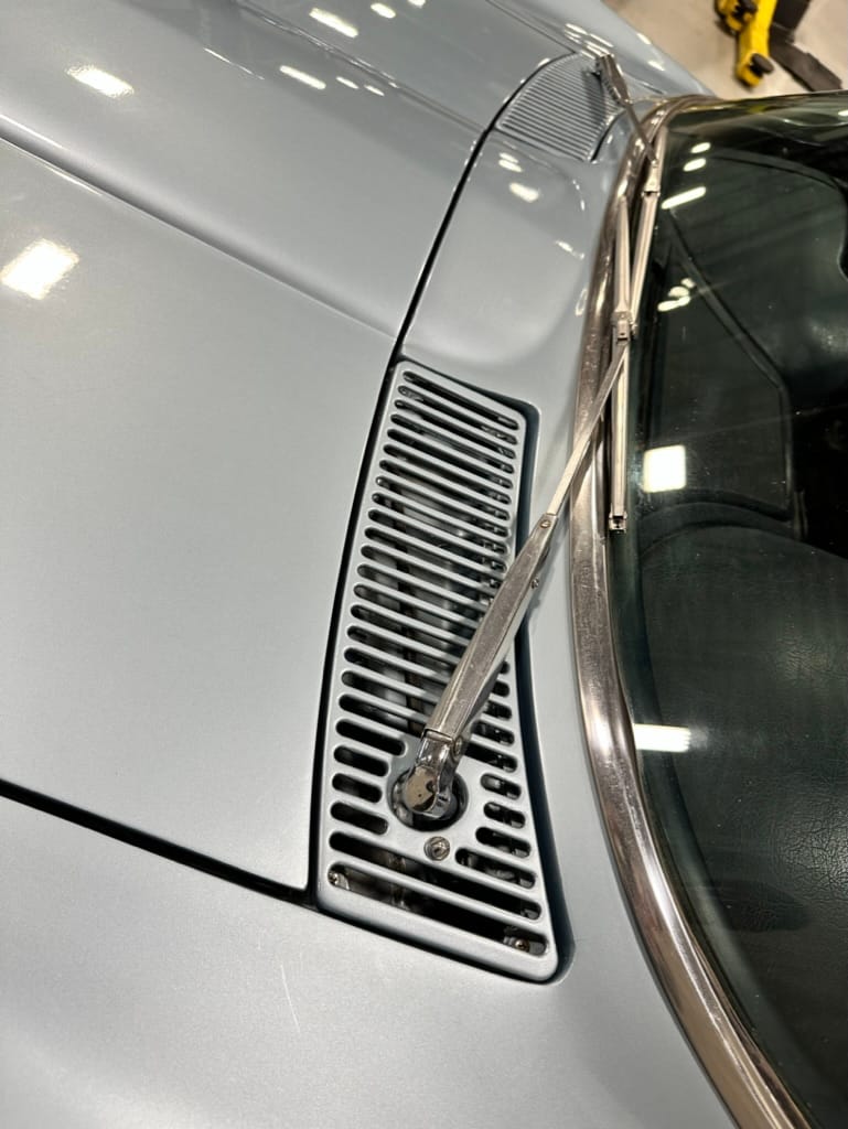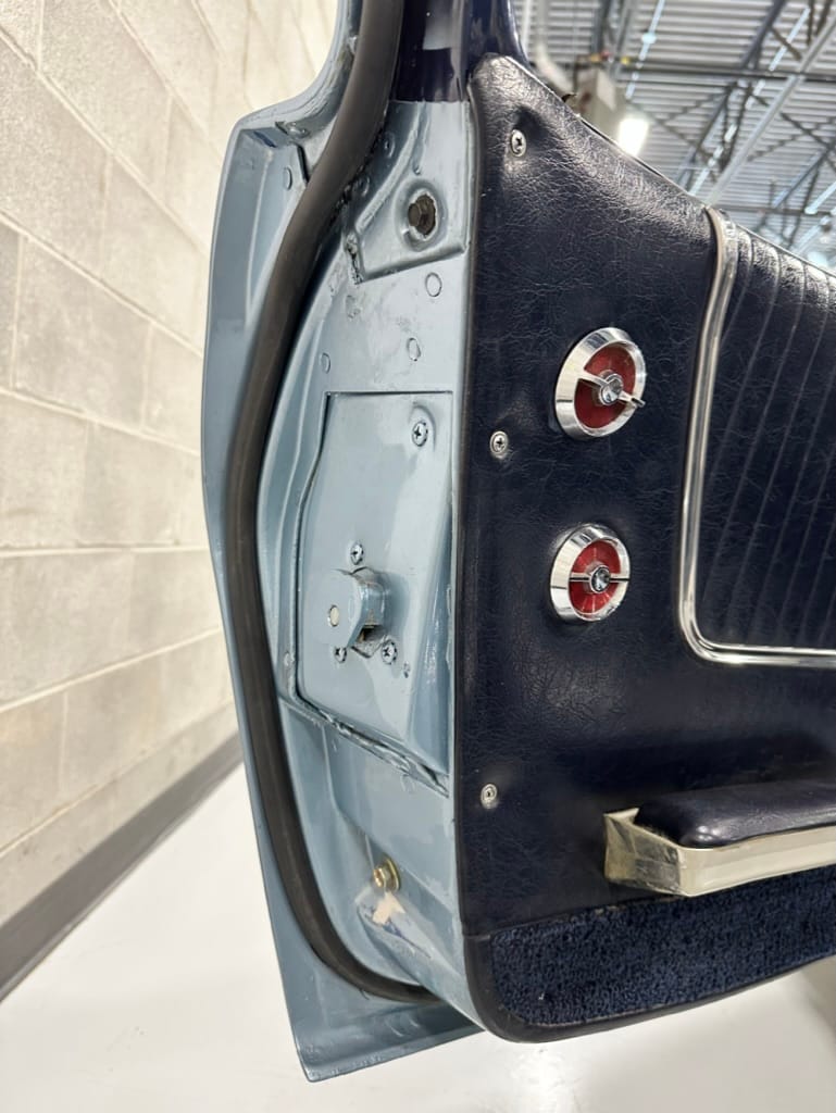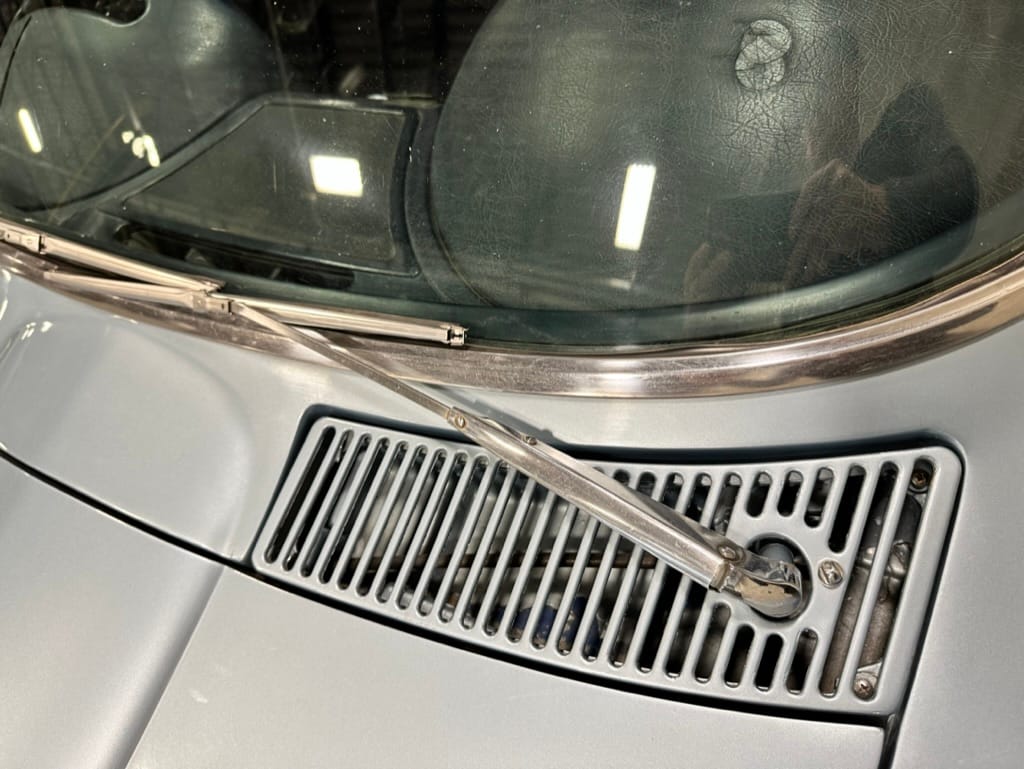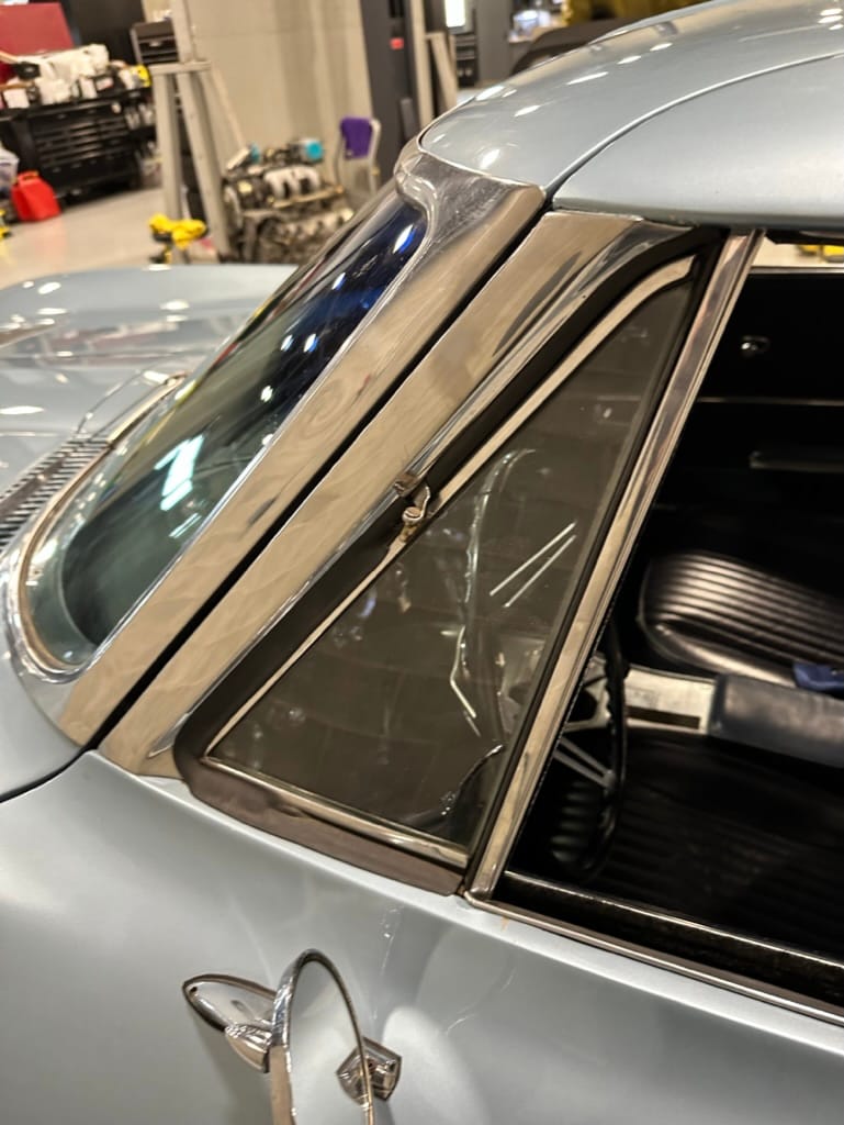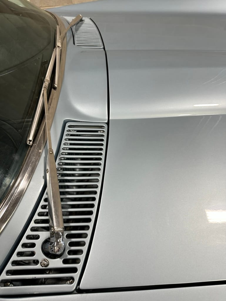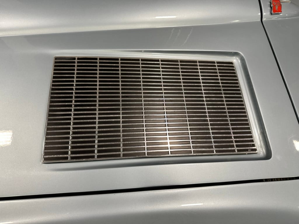 The fiberglass body was refinished in silver blue in 2000, and seller tells us that evidence of past repair was discovered on the rear quarter panel during the process, which is believed to have resulted from some body damage that occurred prior to the owner’s purchase in 1971. The bodywork was then redone as part of the refurbishment. The chrome and rubber components were also replaced at this time. Features include flip-up headlamps, fender vents, quad tail lamps, chrome bumperettes, and dual exhaust tips that exit through the rear valance. The seller notes some paint chips, bubbles, and stress cracks.