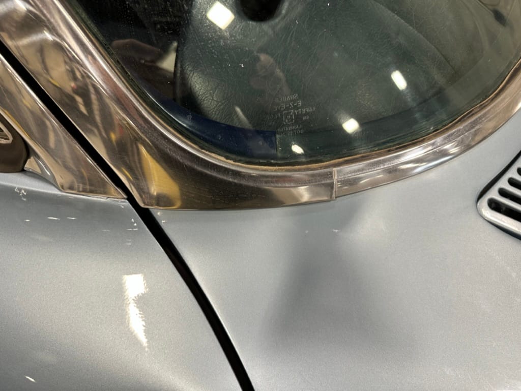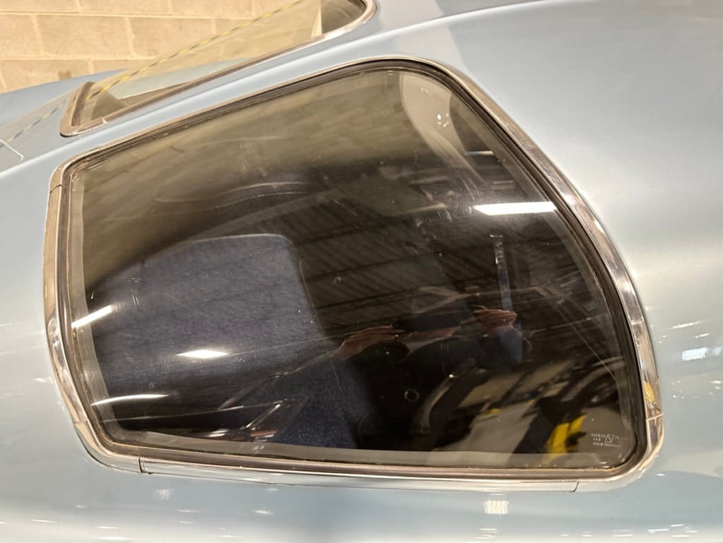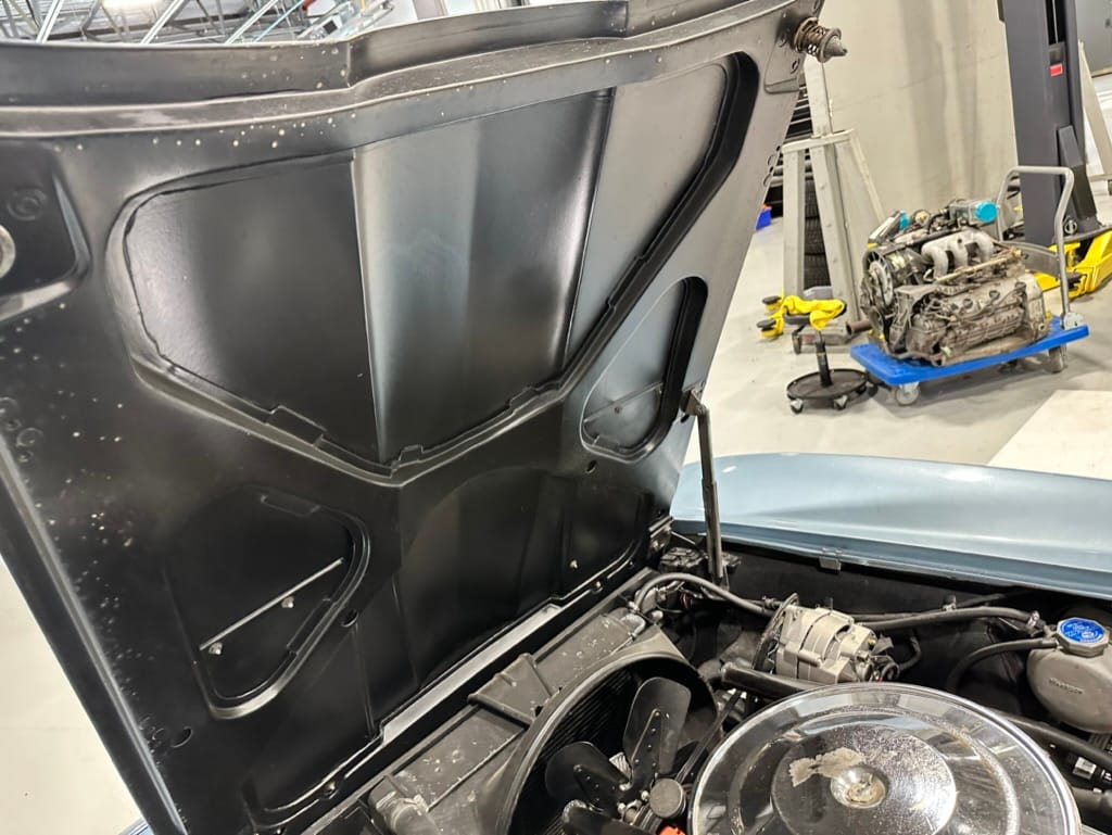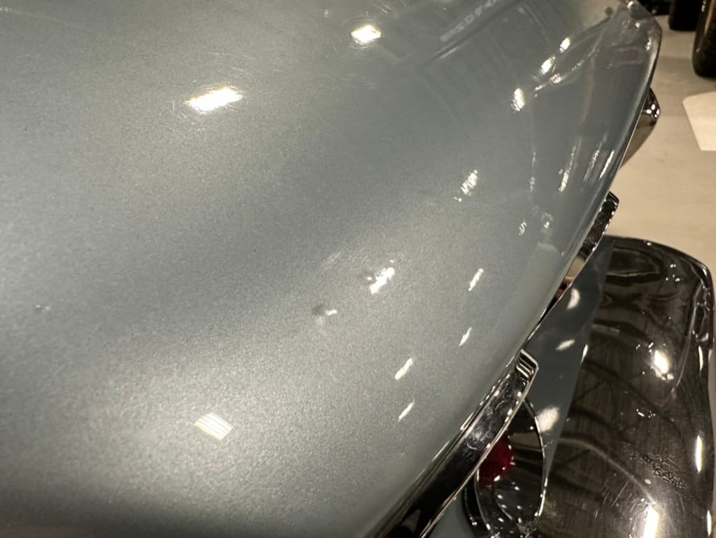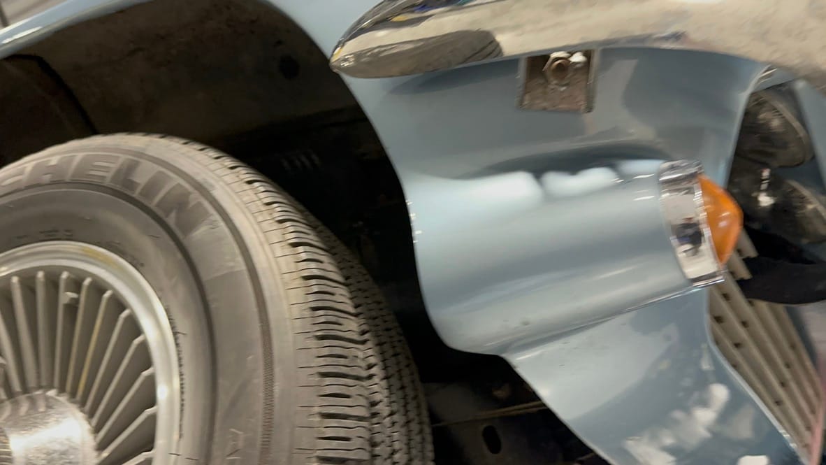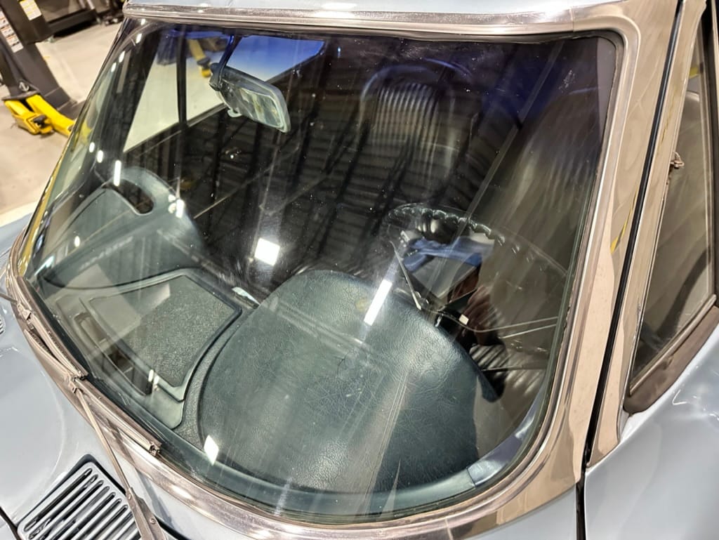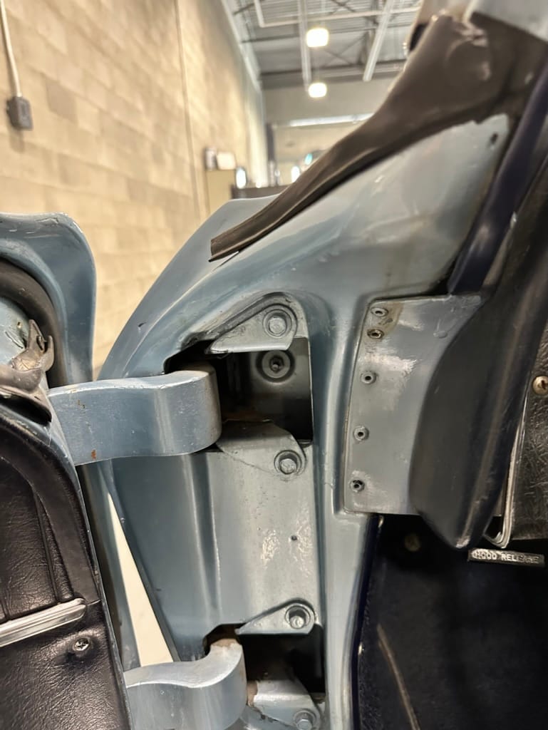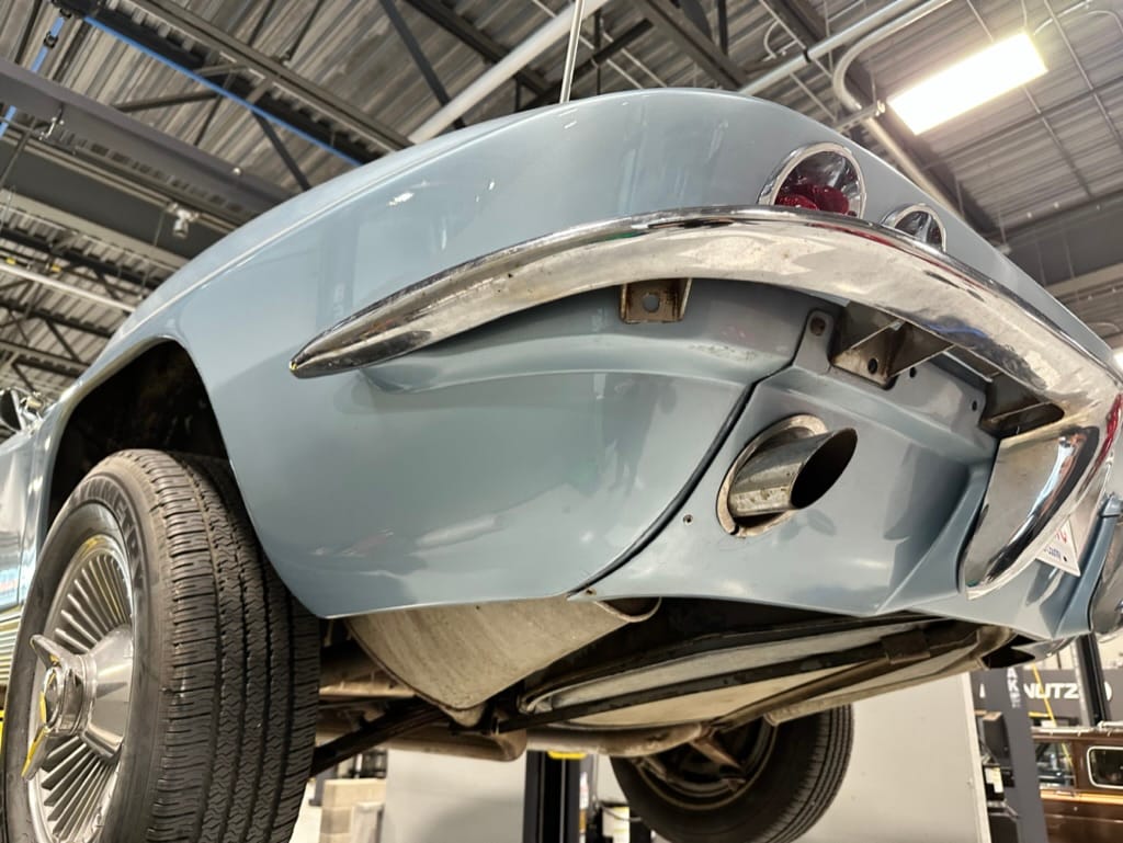 The fiberglass body was refinished in silver blue in 2000, and seller tells us that evidence of past repair was discovered on the rear quarter panel during the process, which is believed to have resulted from some body damage that occurred prior to the owner’s purchase in 1971. The bodywork was then redone as part of the refurbishment. The chrome and rubber components were also replaced at this time. Features include flip-up headlamps, fender vents, quad tail lamps, chrome bumperettes, and dual exhaust tips that exit through the rear valance. The seller notes some paint chips, bubbles, and stress cracks.