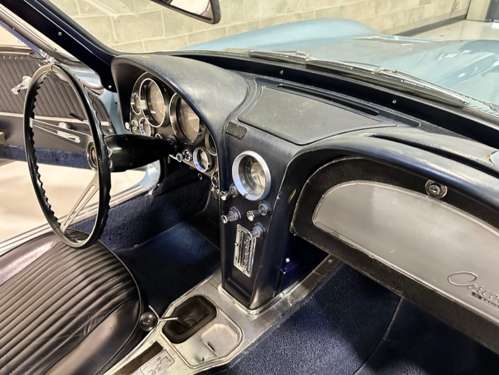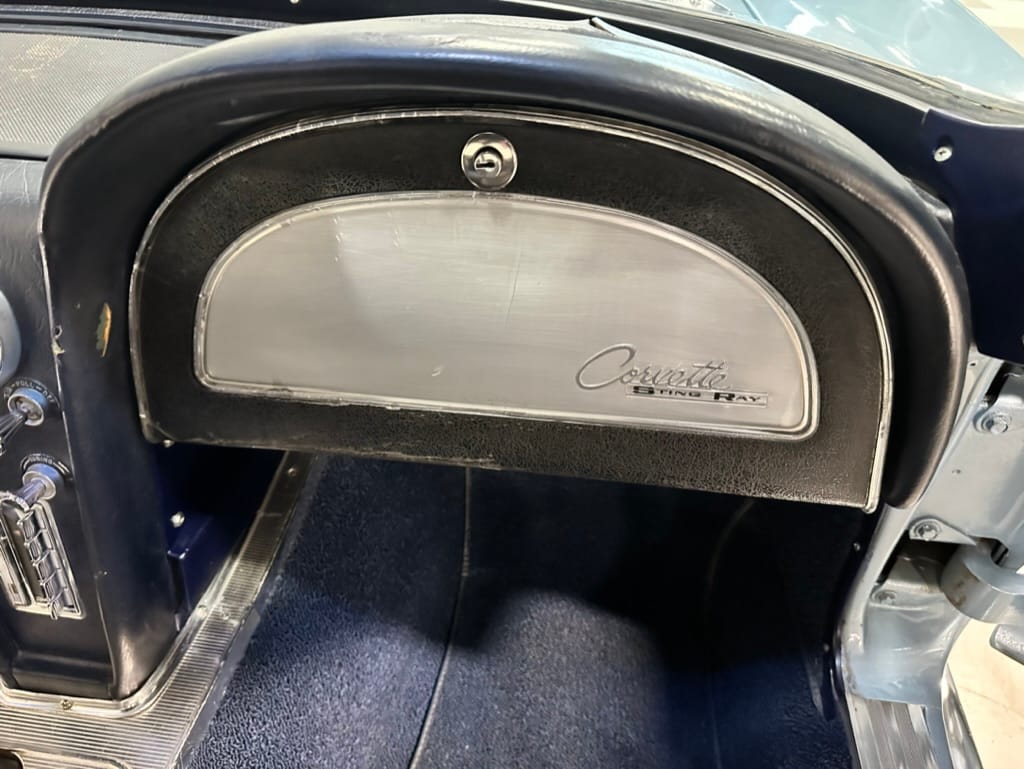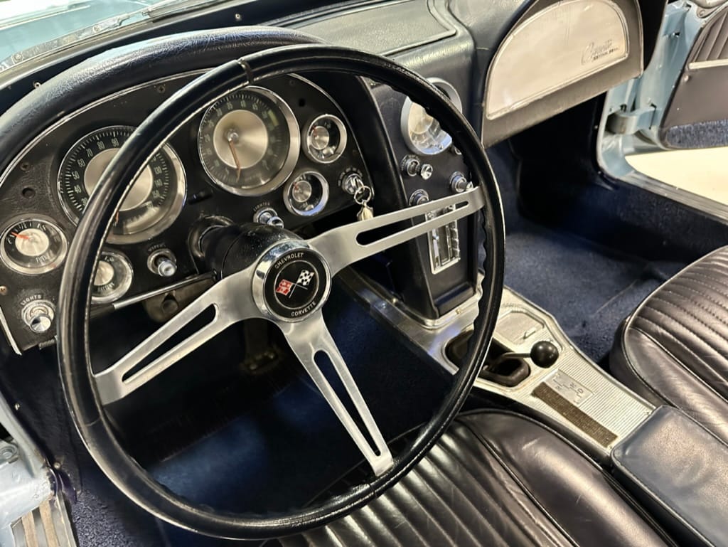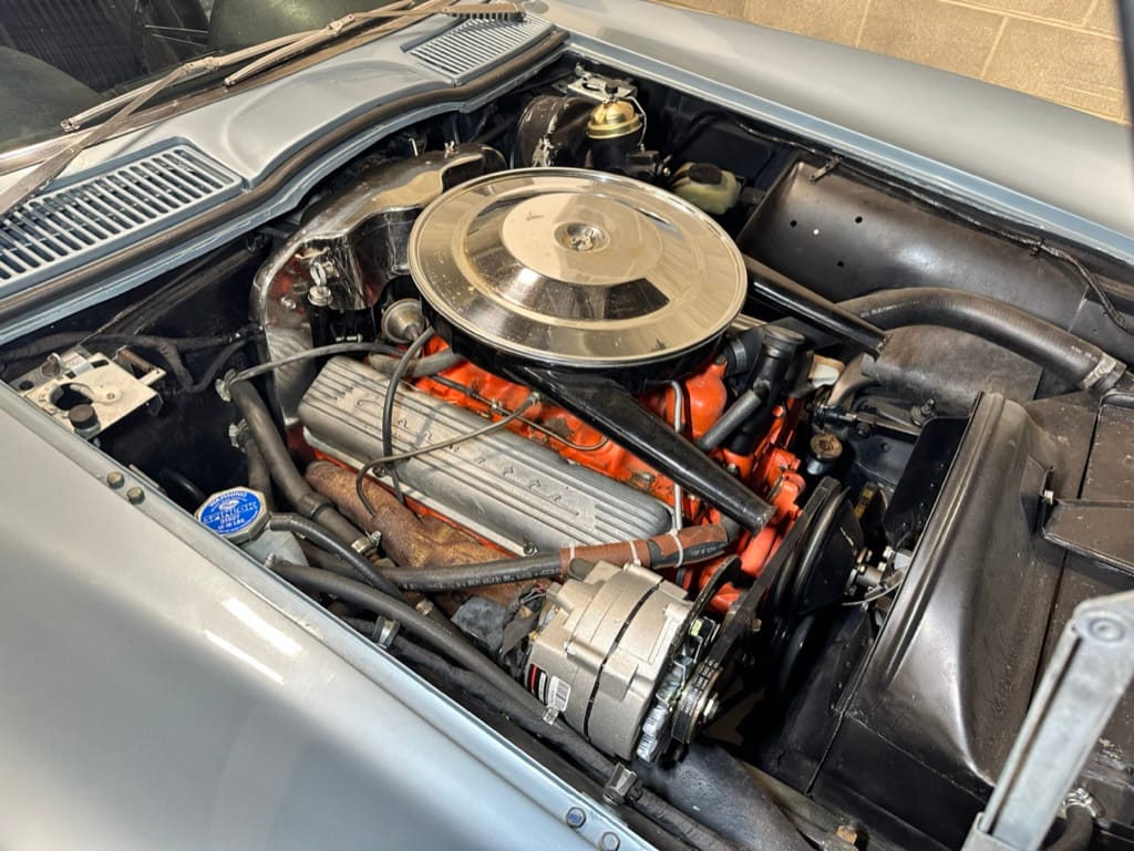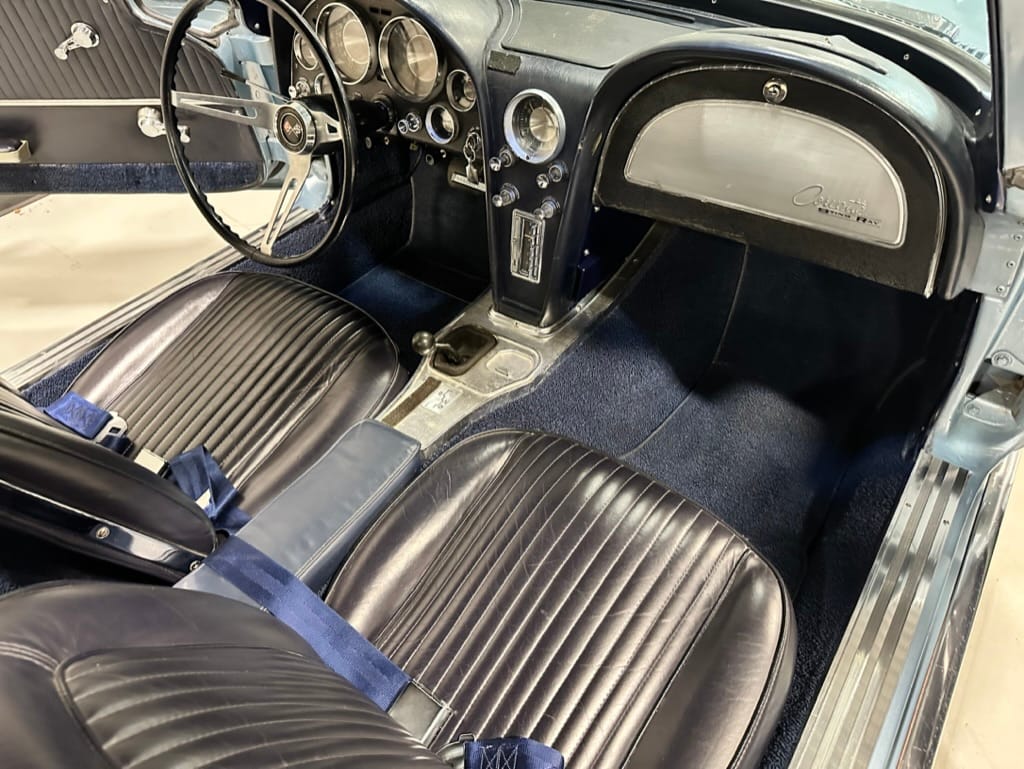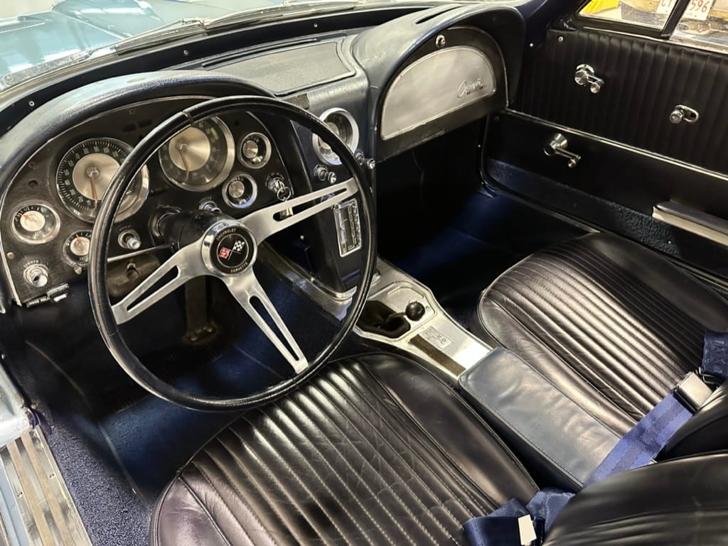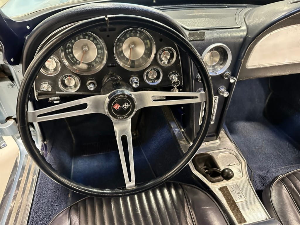 The 15″ turbine-style wheels wear three-eared knock-off spinners and are mounted with 215/70 Michelin Symmetry tires that are said to be 20 years old. The C2 was the first Corvette to offer fully independent suspension, with upper and lower control arms at the front and a three-link setup with a transverse leaf spring at the rear. The car is equipped with power steering, and braking is handled by four-wheel power-assisted drums.
