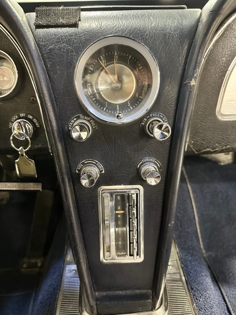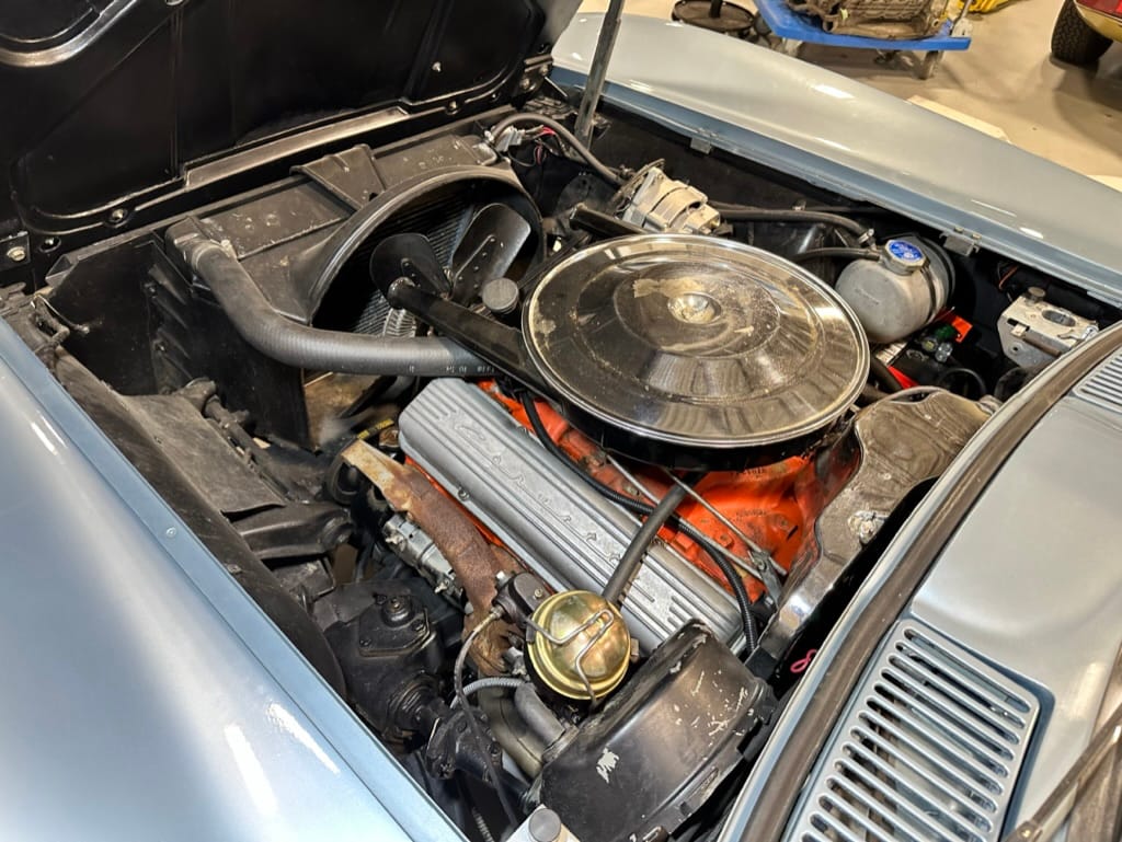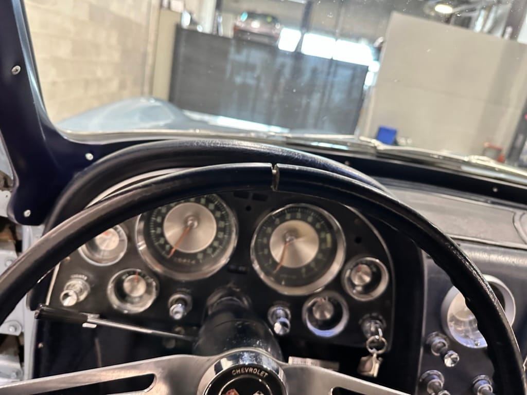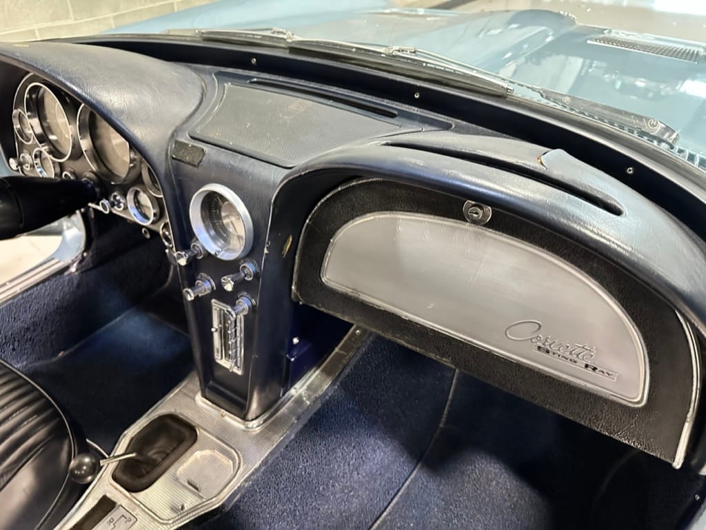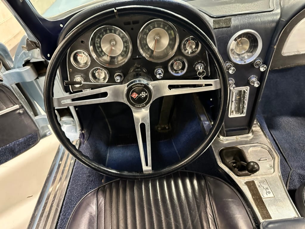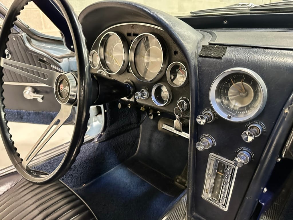 The 15″ turbine-style wheels wear three-eared knock-off spinners and are mounted with 215/70 Michelin Symmetry tires that are said to be 20 years old. The C2 was the first Corvette to offer fully independent suspension, with upper and lower control arms at the front and a three-link setup with a transverse leaf spring at the rear. The car is equipped with power steering, and braking is handled by four-wheel power-assisted drums.