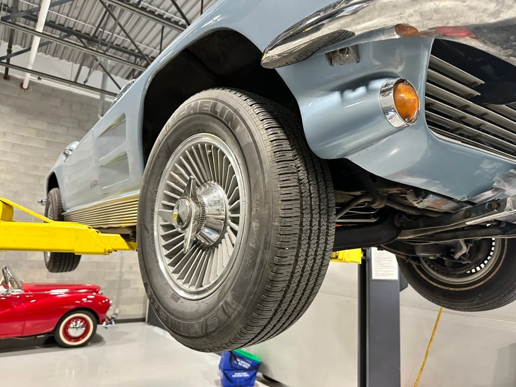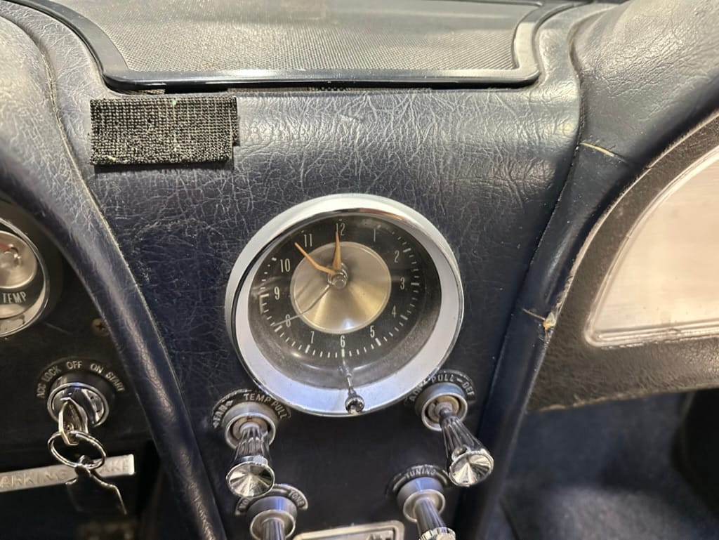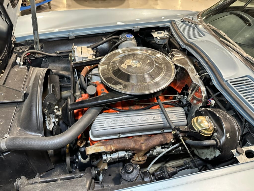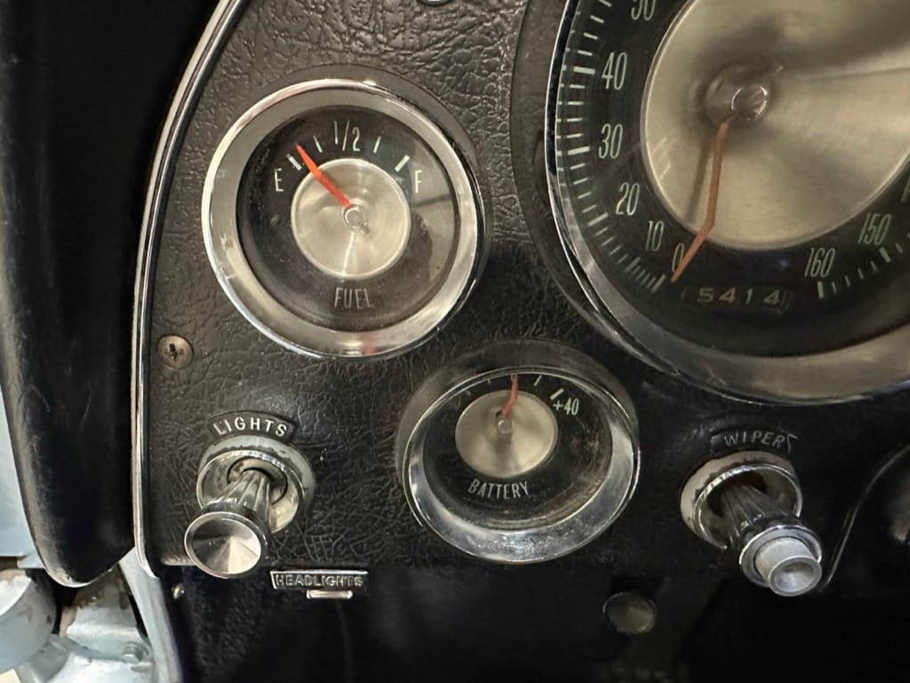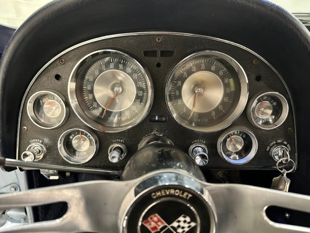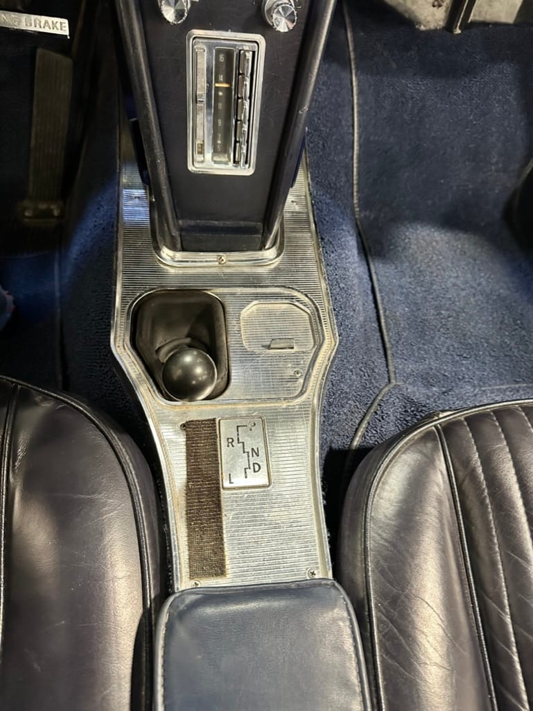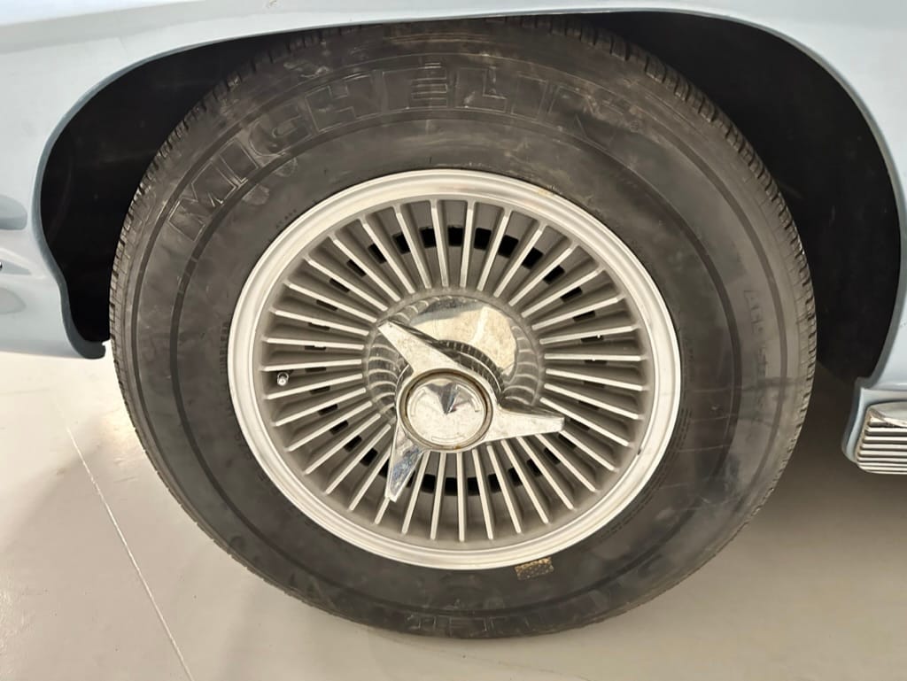 The 15″ turbine-style wheels wear three-eared knock-off spinners and are mounted with 215/70 Michelin Symmetry tires that are said to be 20 years old. The C2 was the first Corvette to offer fully independent suspension, with upper and lower control arms at the front and a three-link setup with a transverse leaf spring at the rear. The car is equipped with power steering, and braking is handled by four-wheel power-assisted drums.