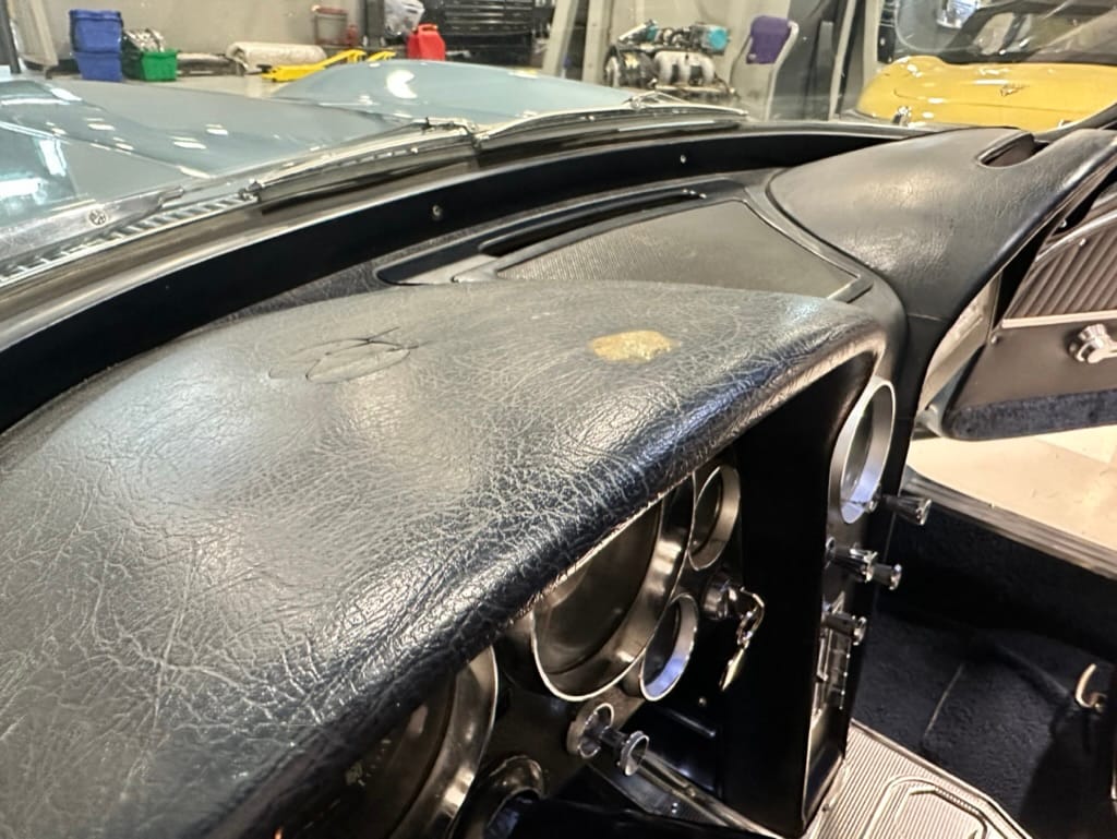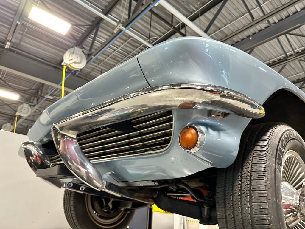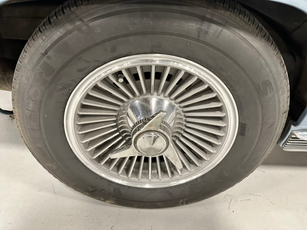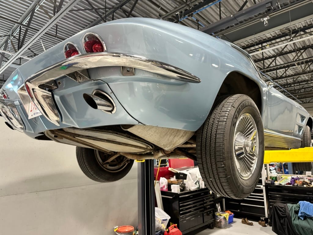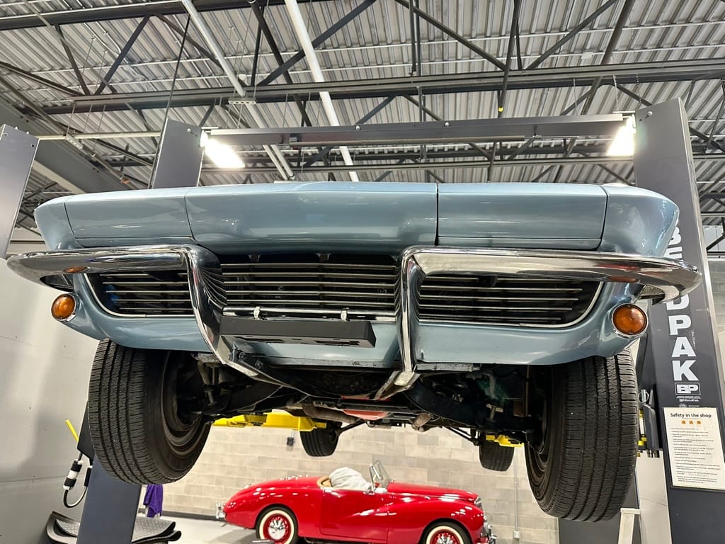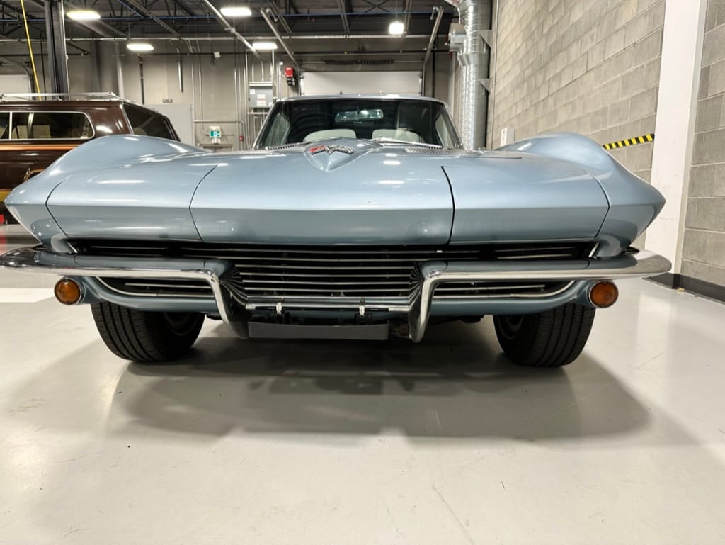 The 15″ turbine-style wheels wear three-eared knock-off spinners and are mounted with 215/70 Michelin Symmetry tires that are said to be 20 years old. The C2 was the first Corvette to offer fully independent suspension, with upper and lower control arms at the front and a three-link setup with a transverse leaf spring at the rear. The car is equipped with power steering, and braking is handled by four-wheel power-assisted drums.