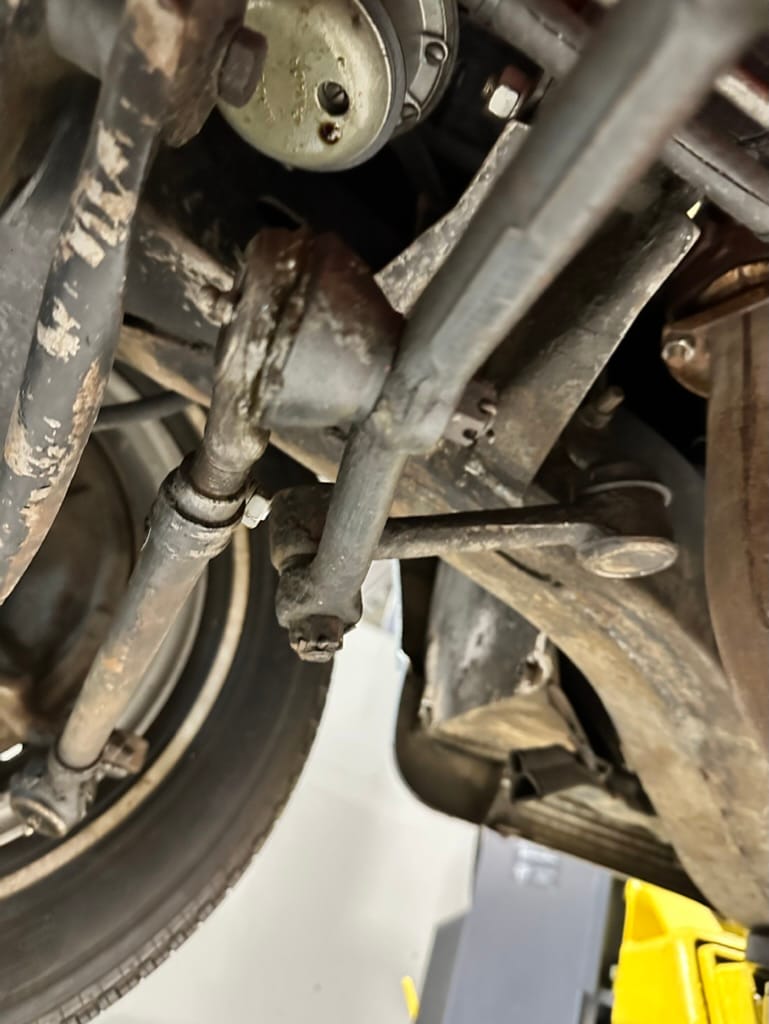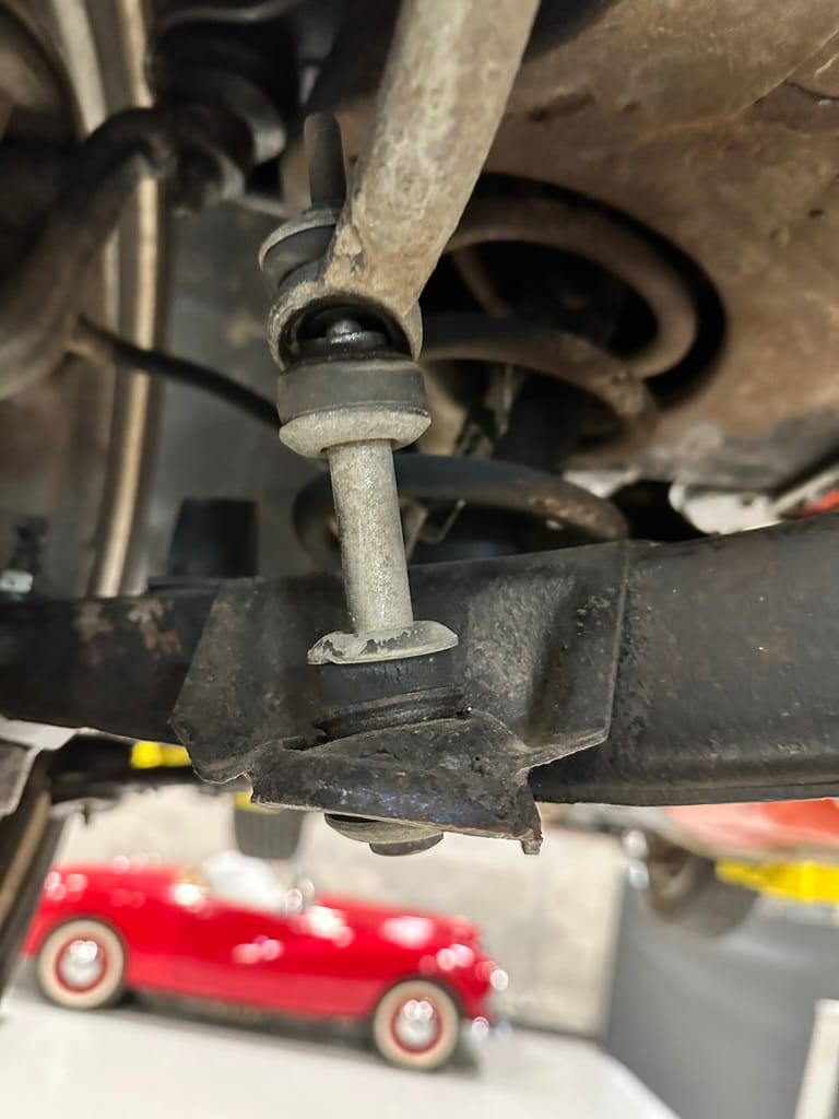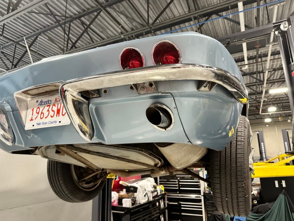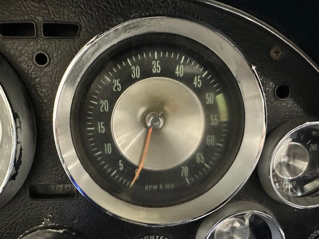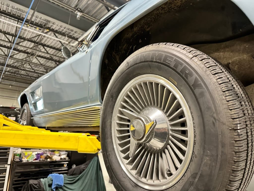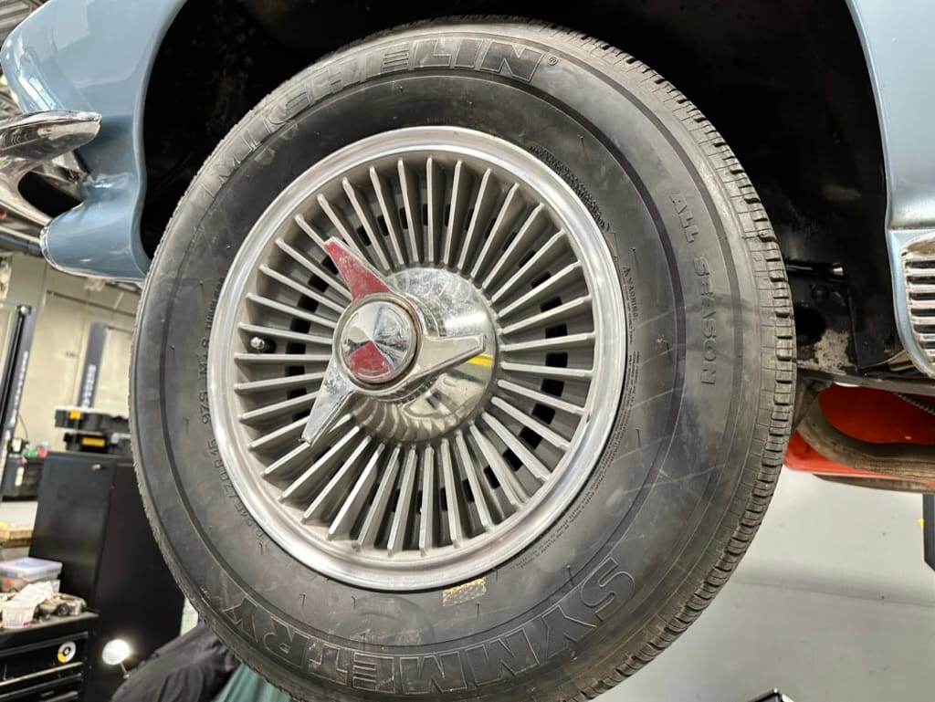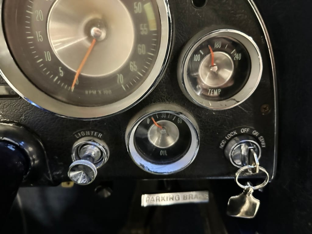 The 15″ turbine-style wheels wear three-eared knock-off spinners and are mounted with 215/70 Michelin Symmetry tires that are said to be 20 years old. The C2 was the first Corvette to offer fully independent suspension, with upper and lower control arms at the front and a three-link setup with a transverse leaf spring at the rear. The car is equipped with power steering, and braking is handled by four-wheel power-assisted drums.