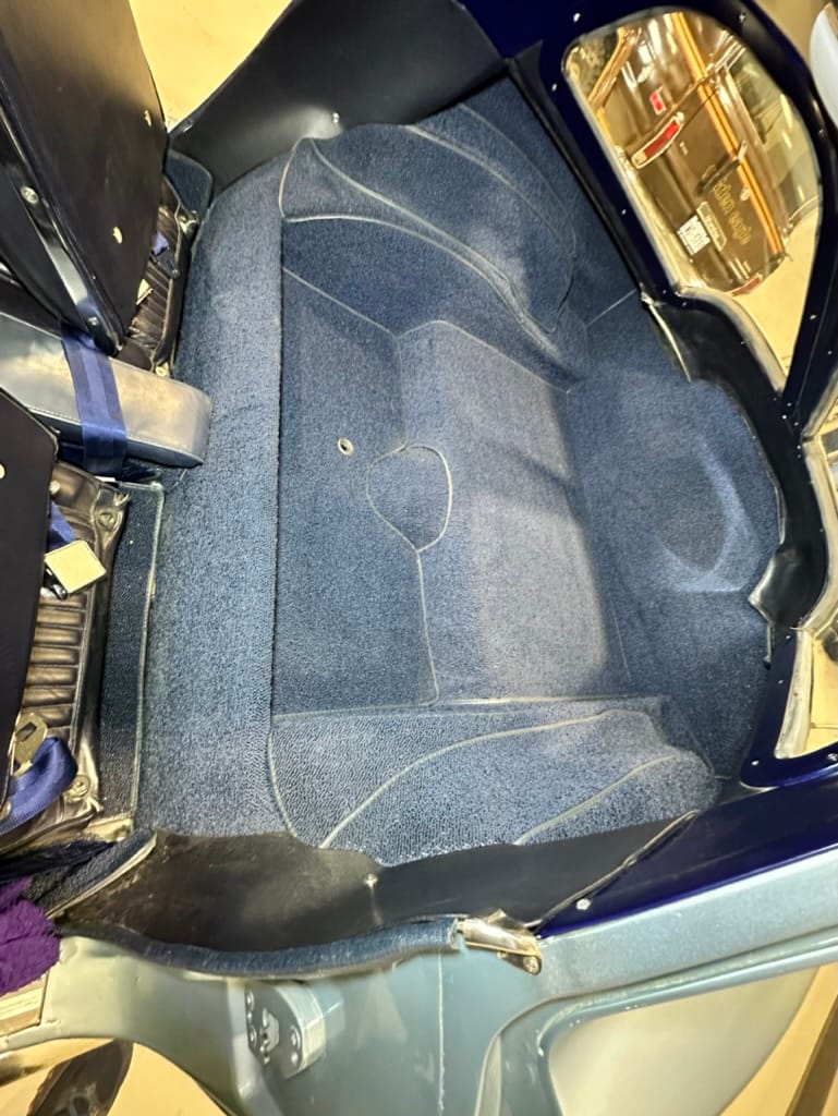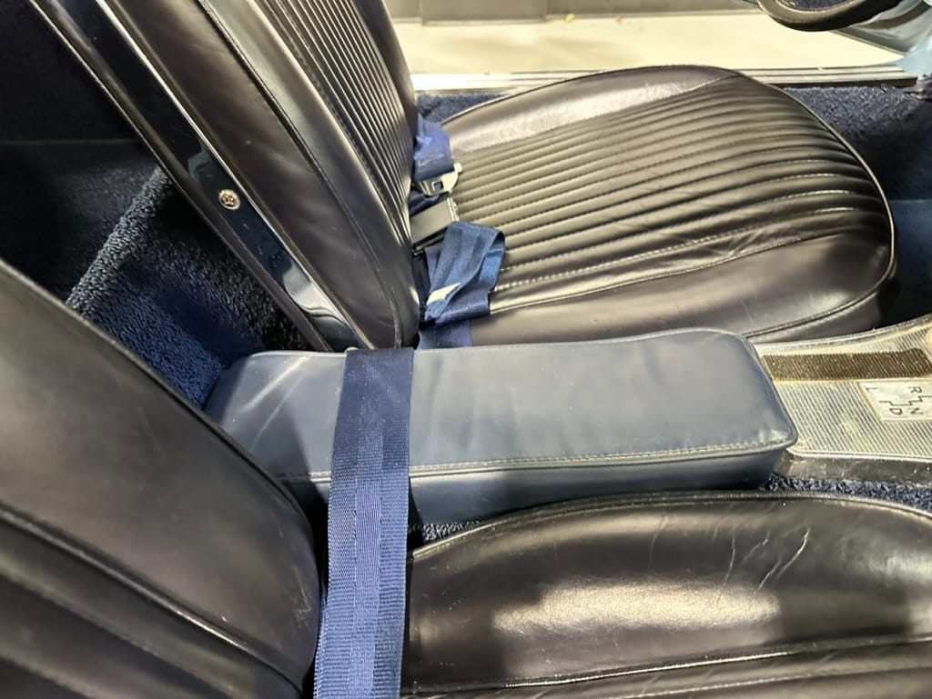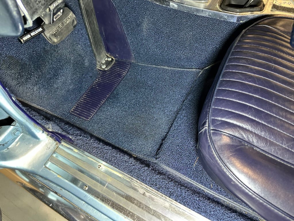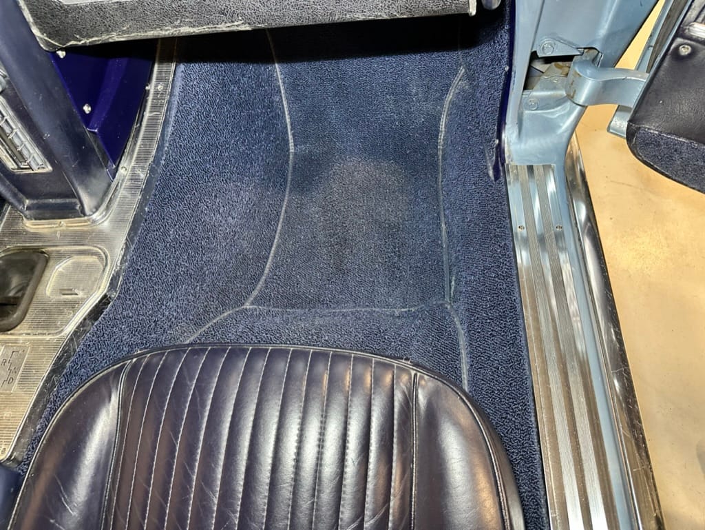 The two bucket seats upholstered in dark blue vinyl in 2000, and the carpets were replaced at that time. Amenities include a heater, an analog clock, and lap belts. The AM/FM radio does not work.