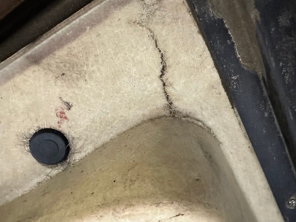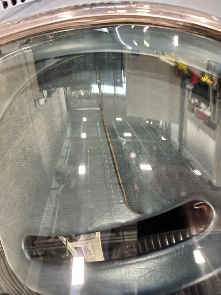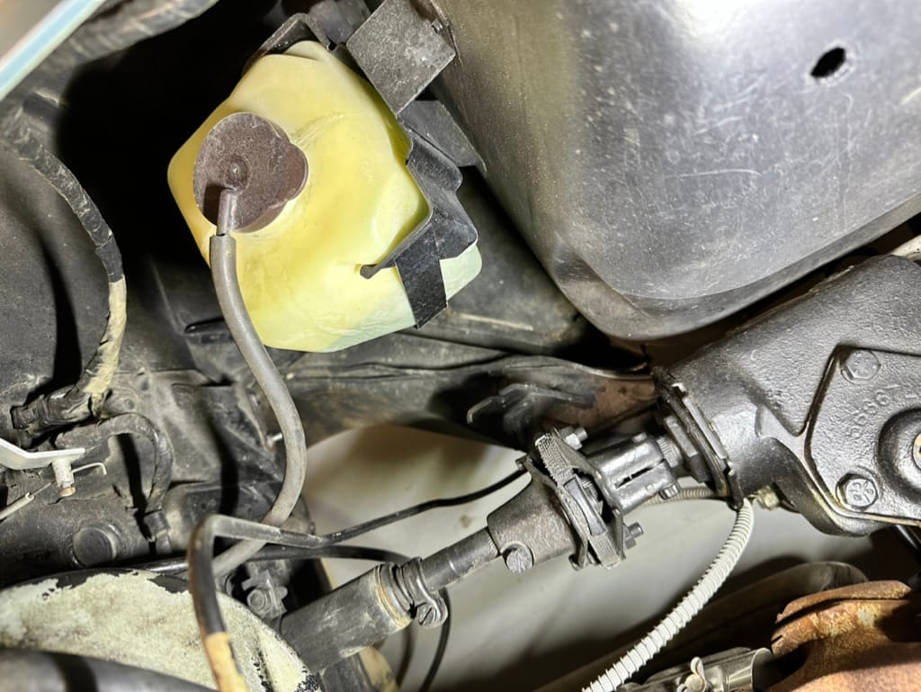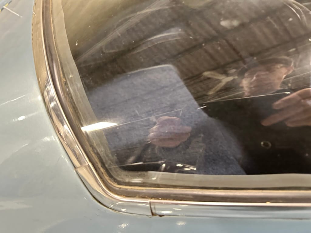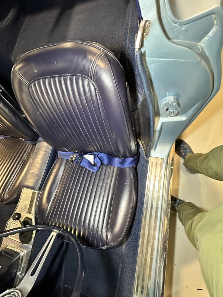 The two bucket seats upholstered in dark blue vinyl in 2000, and the carpets were replaced at that time. Amenities include a heater, an analog clock, and lap belts. The AM/FM radio does not work.