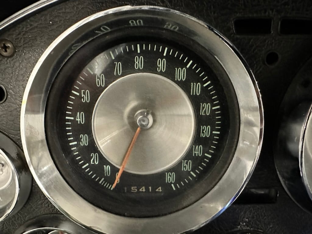 The three-spoke steering wheel frames a 160-mph speedometer and a tachometer with a 5,500-rpm redline as well as gauges for amperage, oil pressure, coolant temperature, and fuel level. The five-digit odometer shows 15,414 miles, approximately 15,000 miles of which were added under current ownership. Total mileage is unknown. The turn signal actuator was repaired in 2024.