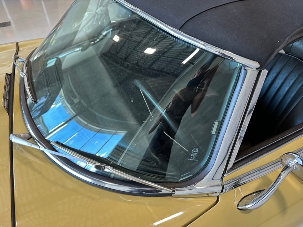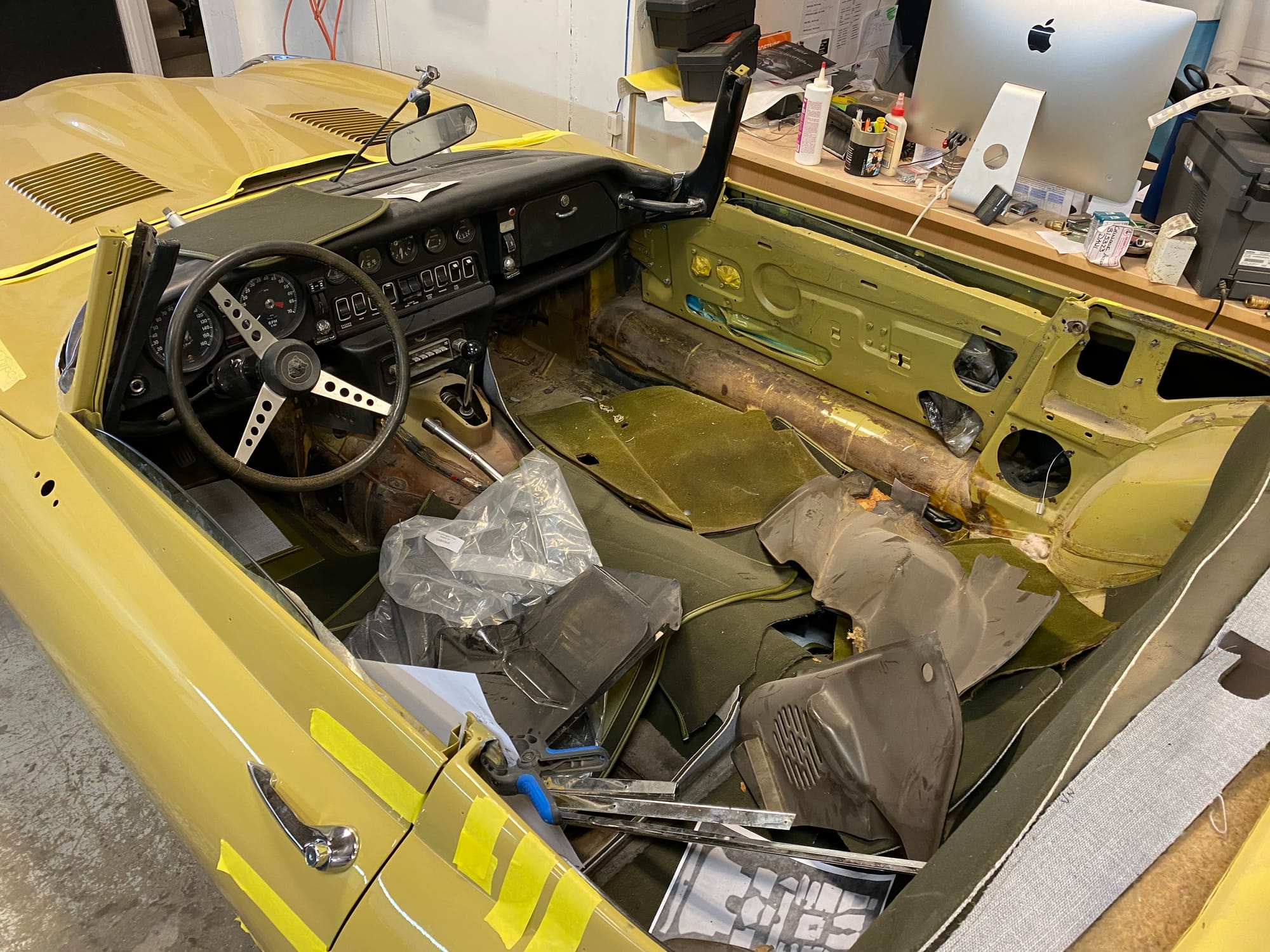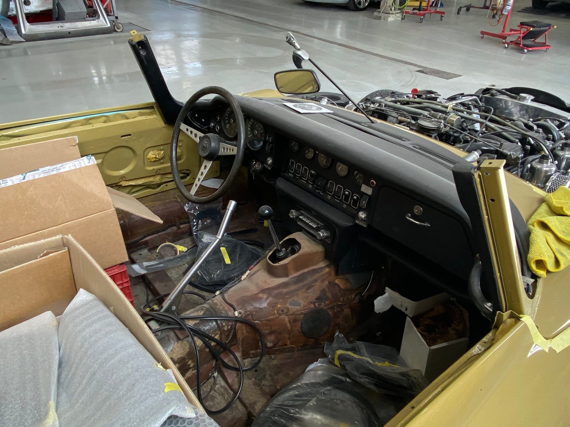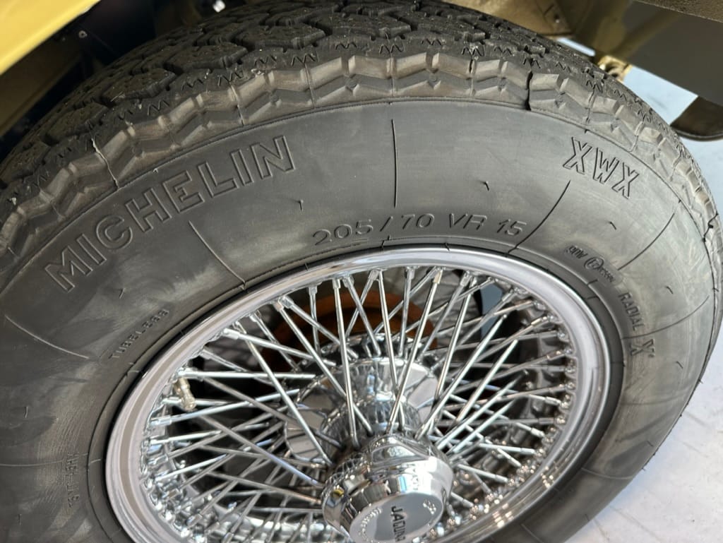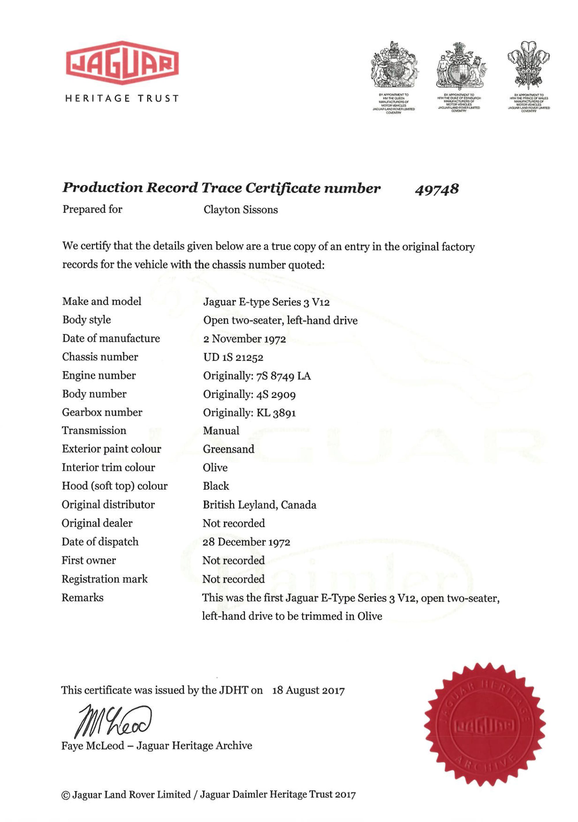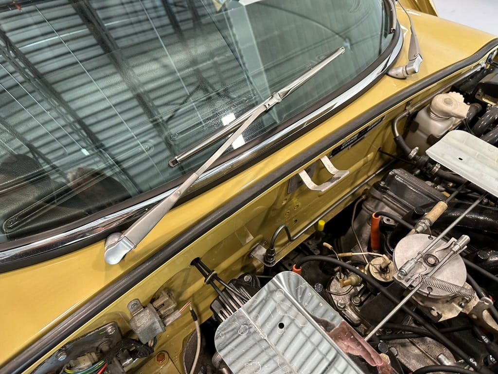 The original olive hides were colour matched by Worldwide Upholstery in California, along with the carpet, and sent to Chinook Upholstery in Calgary who fitted the interior. Dynamat insulation was installed under the carpet. According to the Jaguar Heritage Trust, this was the first LHD E Type S3 to have an Olive interior.