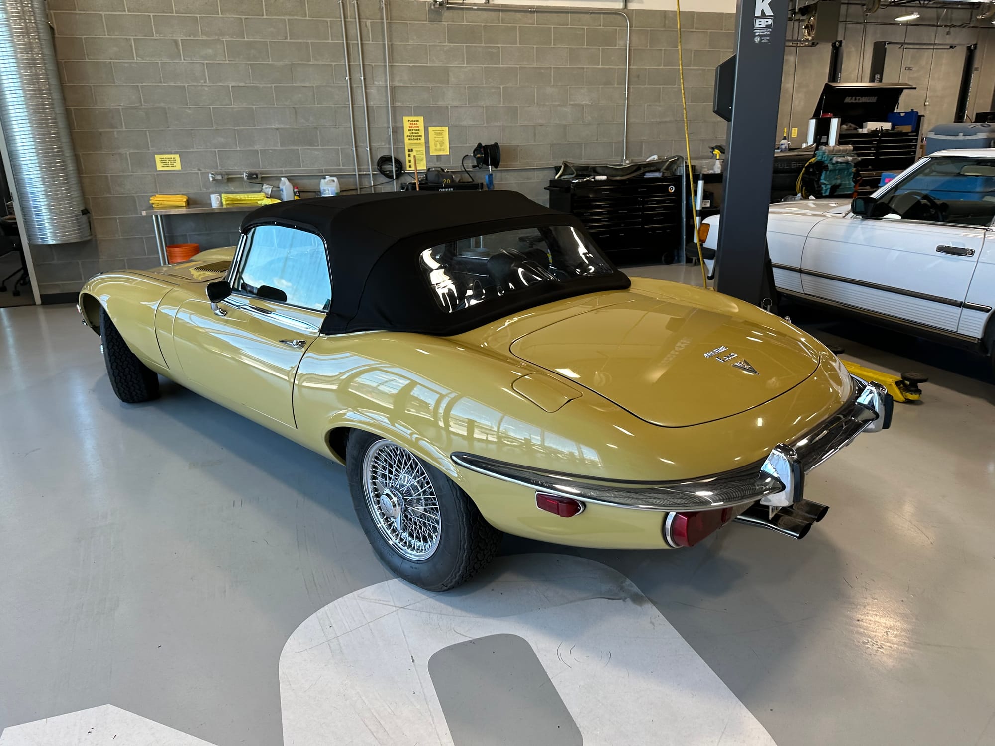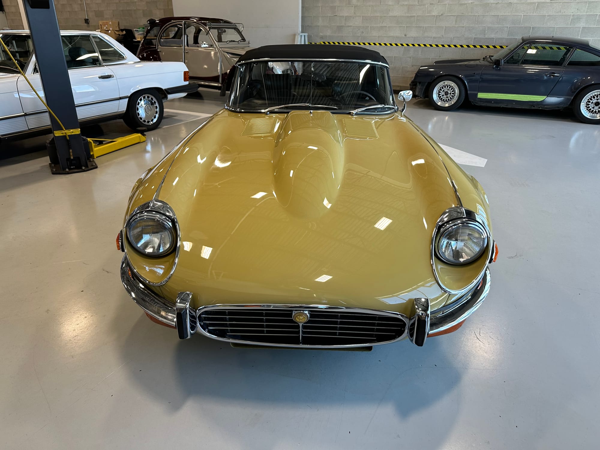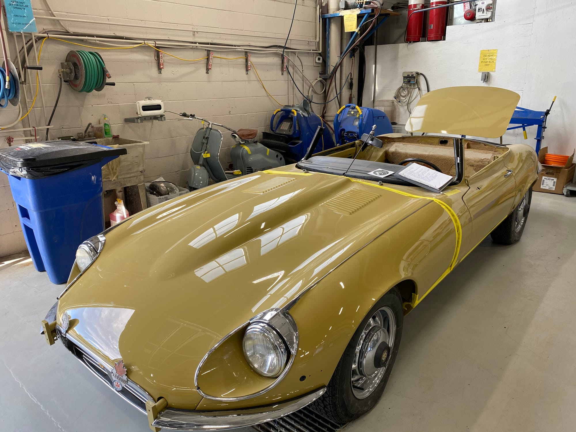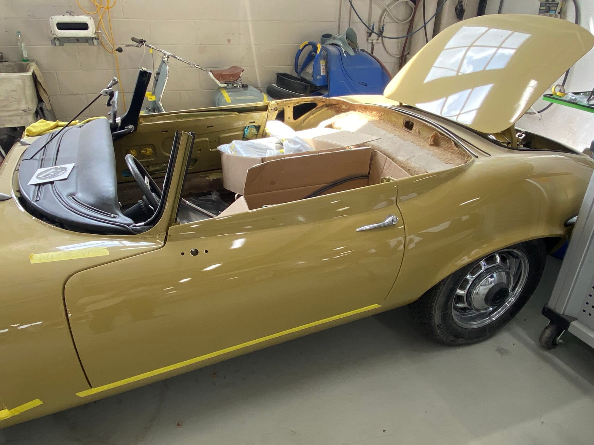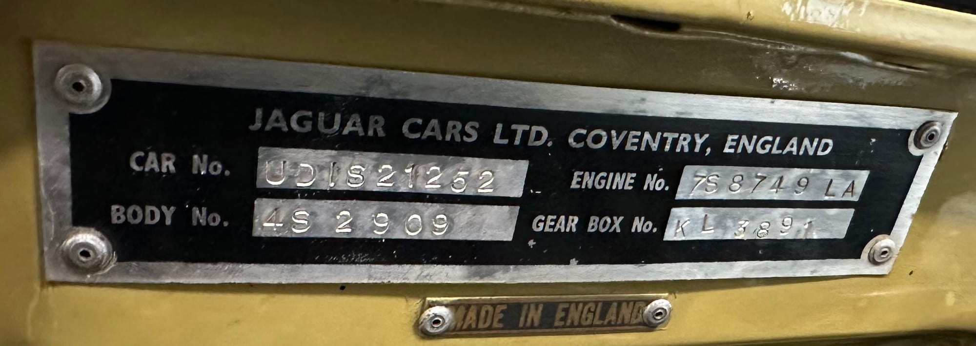 The original olive hides were colour matched by Worldwide Upholstery in California, along with the carpet, and sent to Chinook Upholstery in Calgary who fitted the interior. Dynamat insulation was installed under the carpet. According to the Jaguar Heritage Trust, this was the first LHD E Type S3 to have an Olive interior.