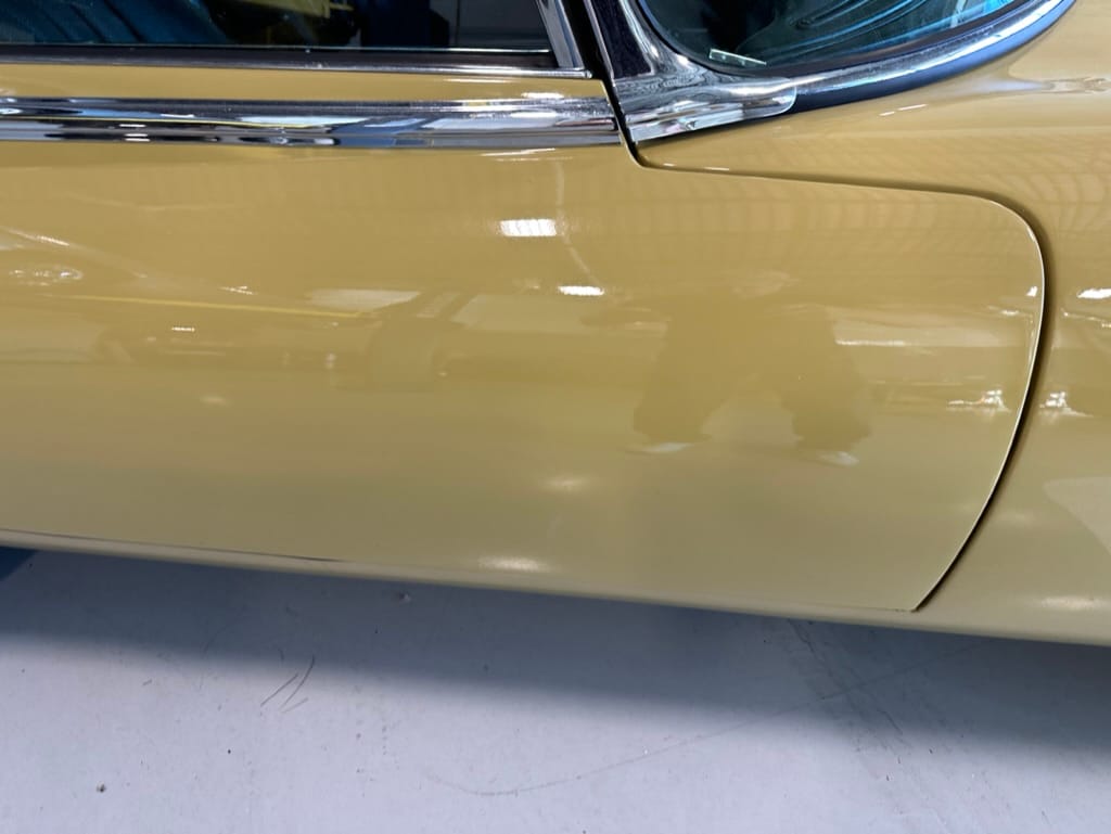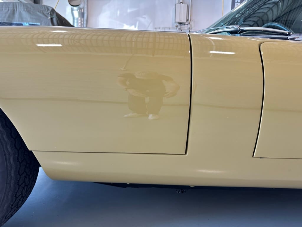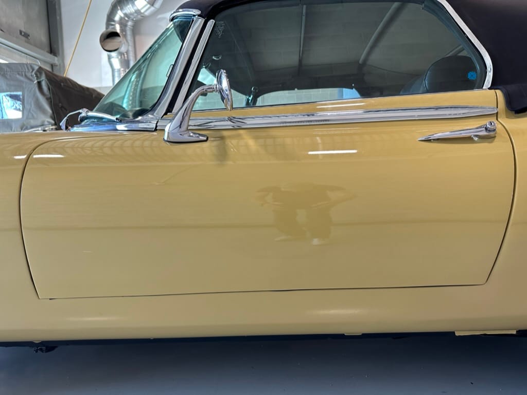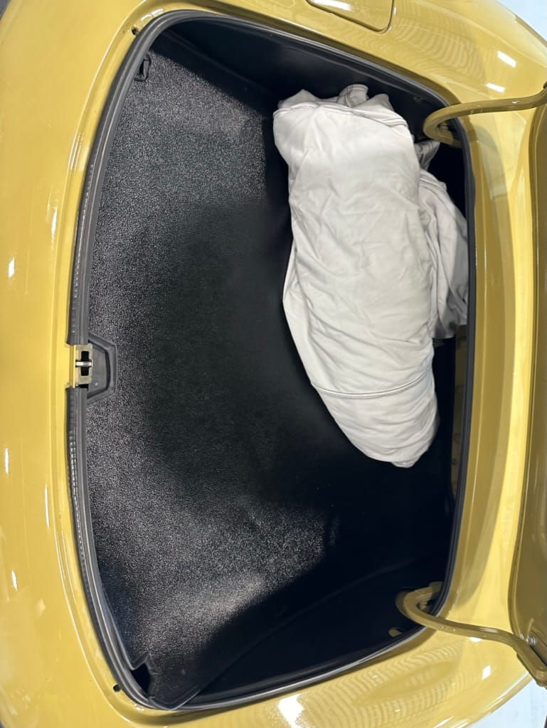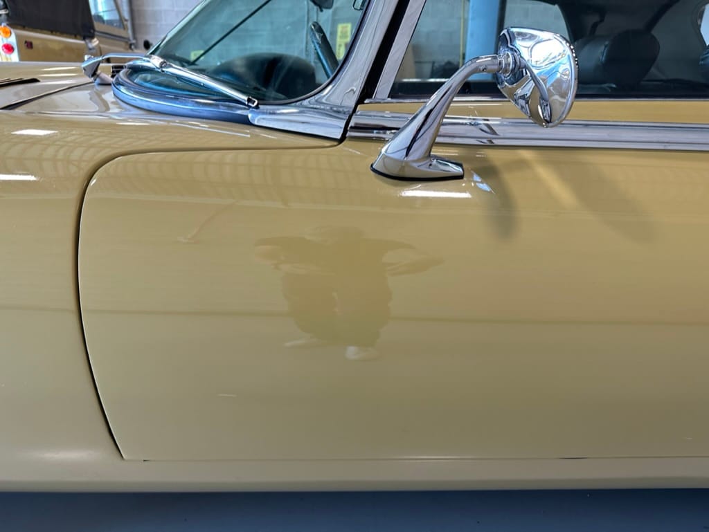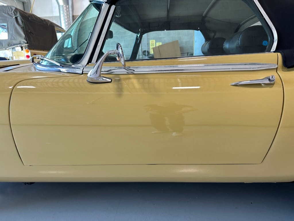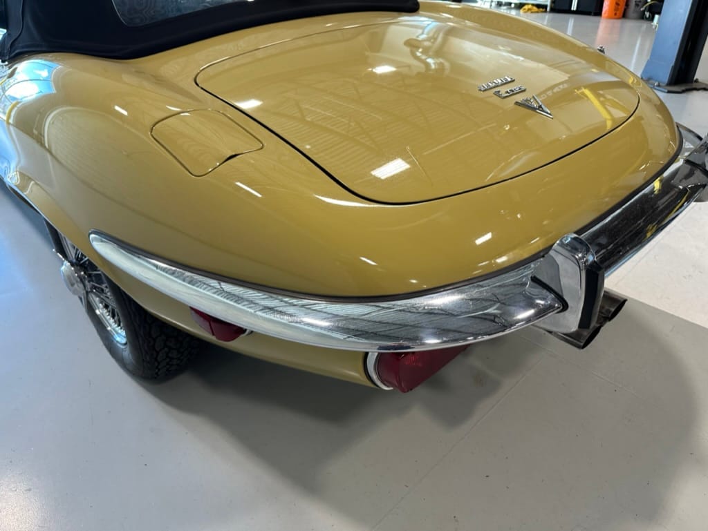 The car had a few isolated patches of rust caused by plugged drain tubes. It was stipped to bare metal and sent to Lyle at Rods n'Restos for repair to the trunk and rear fenders. Cosmos Collision, under the careful attention of Loc Ngo, repainted the car in the original Greensand hue.