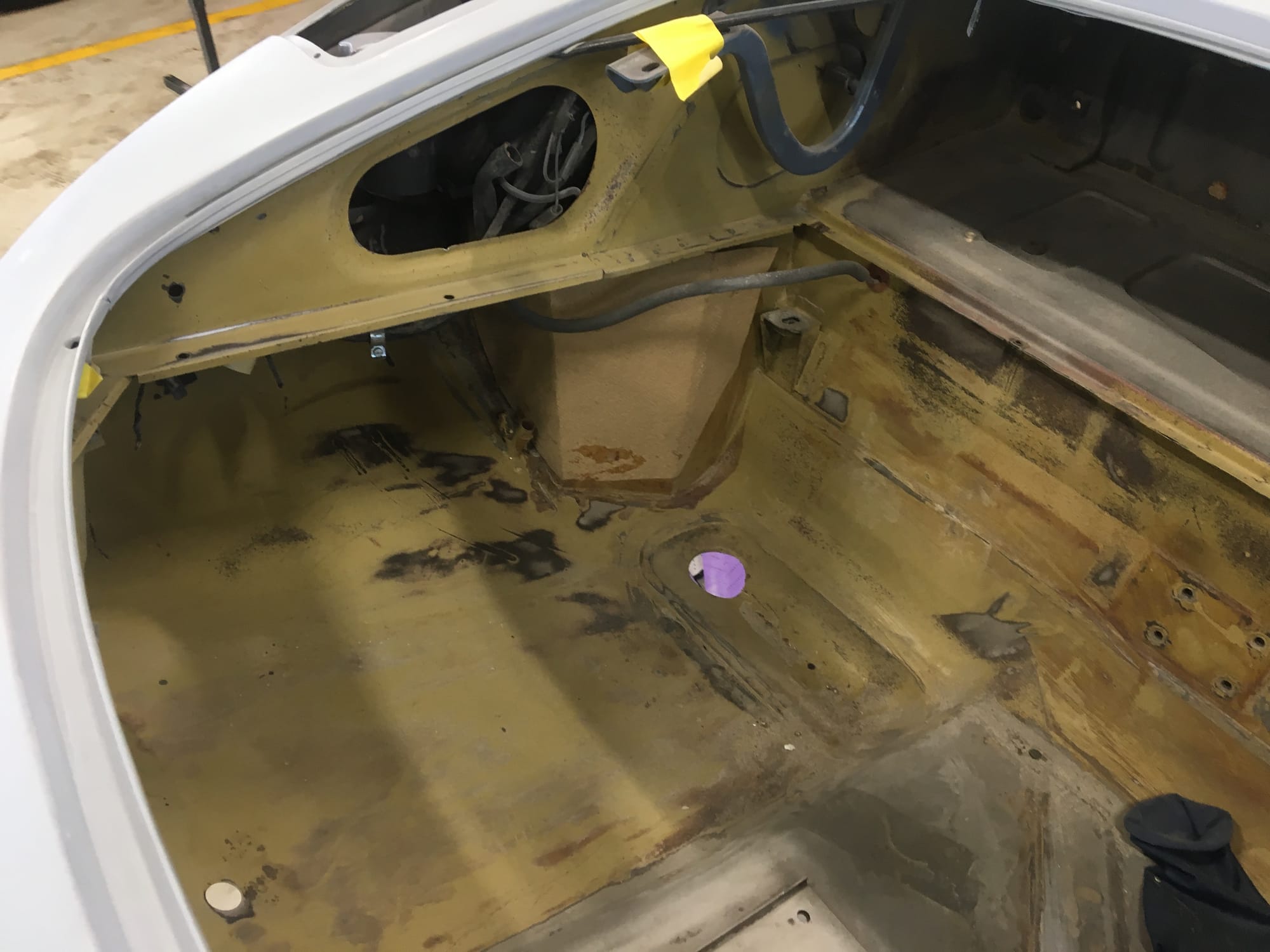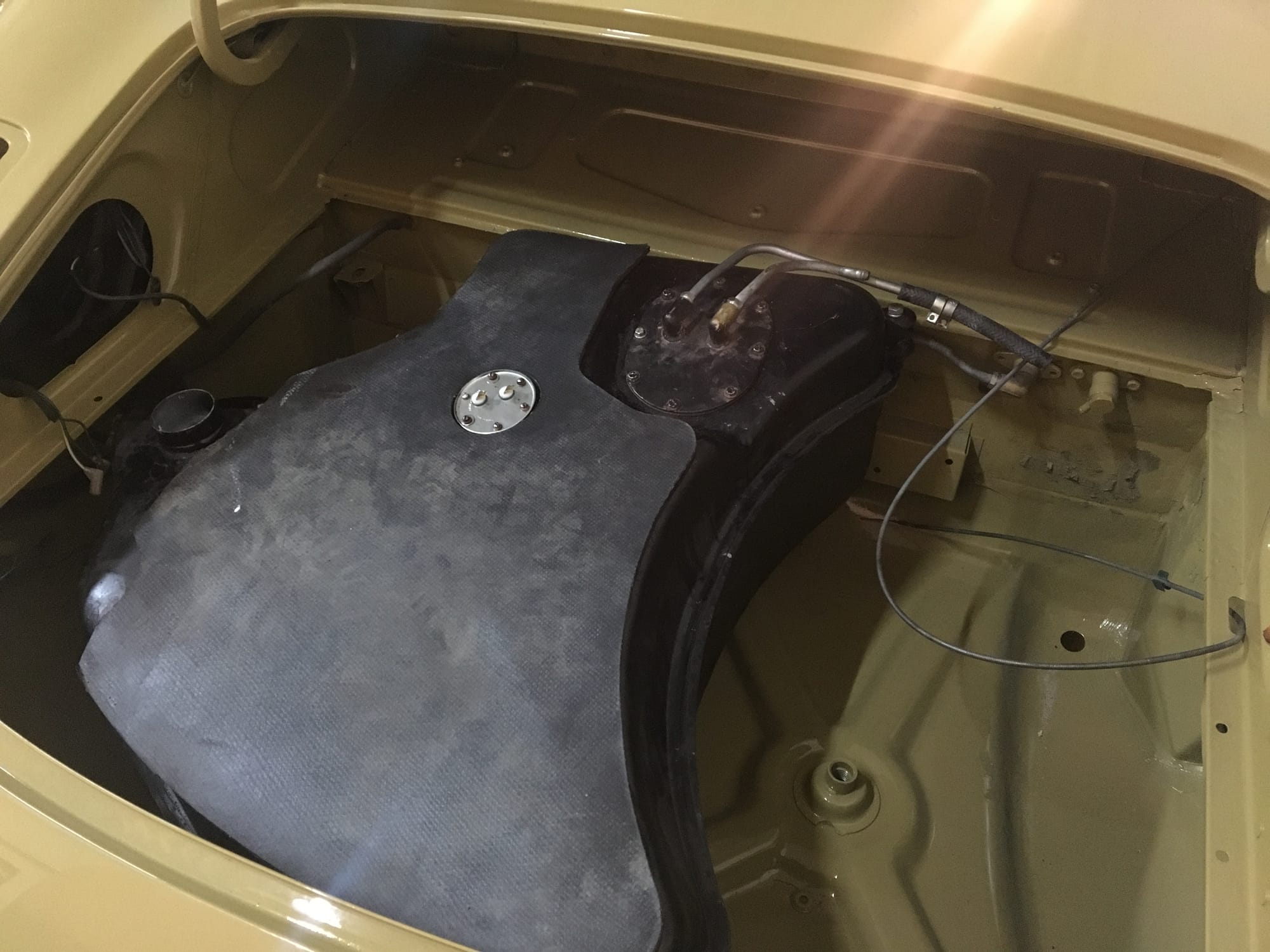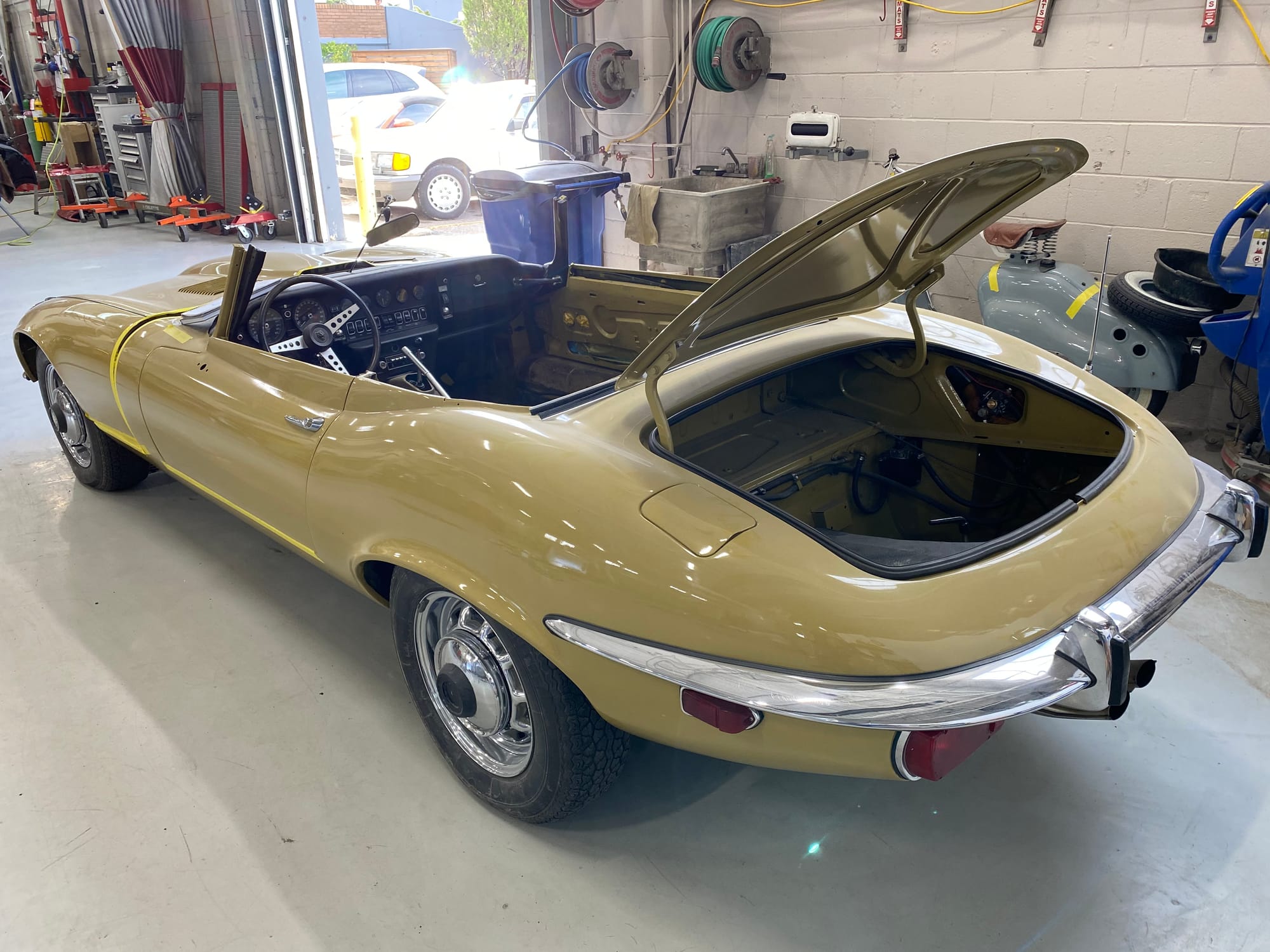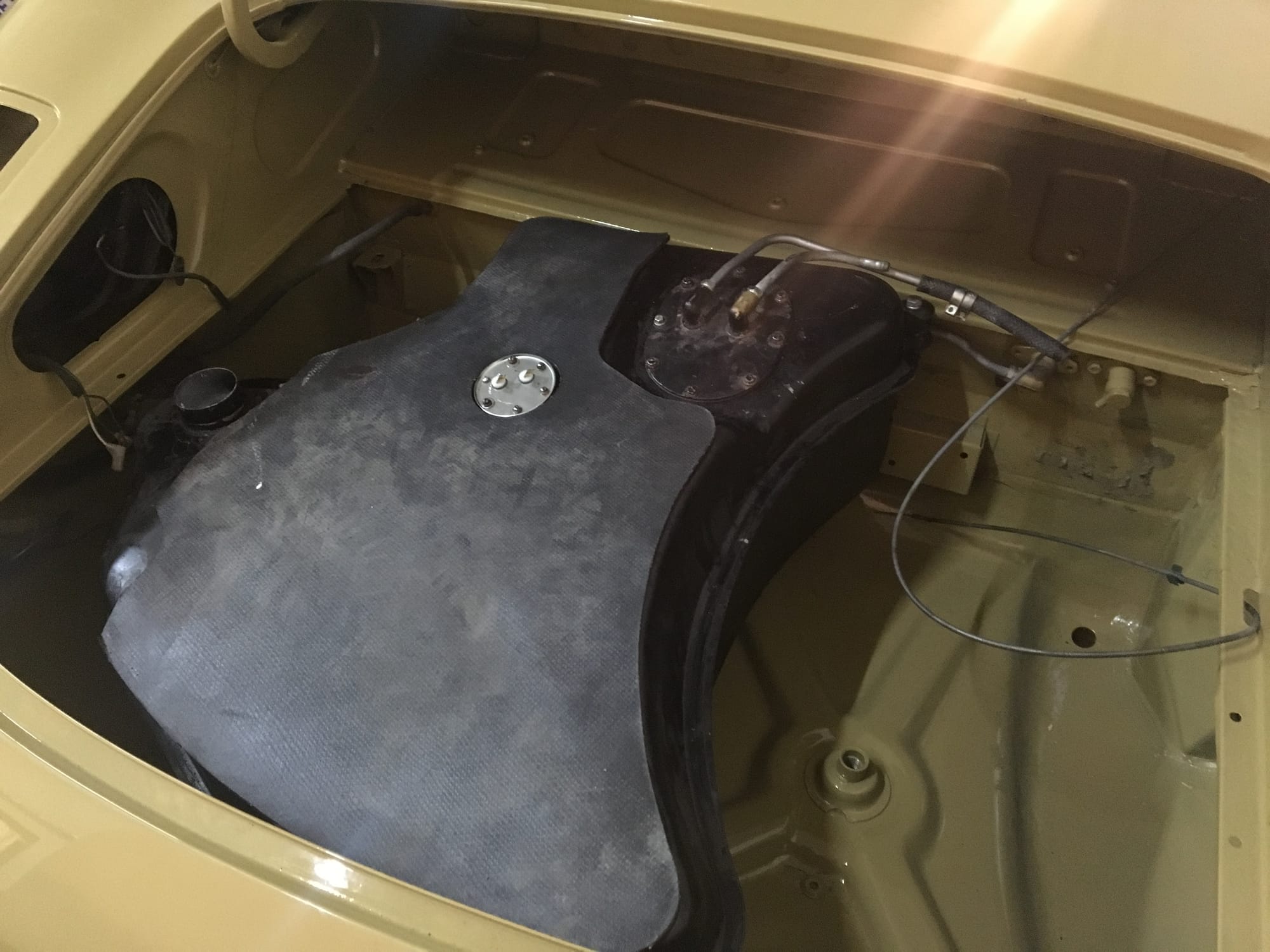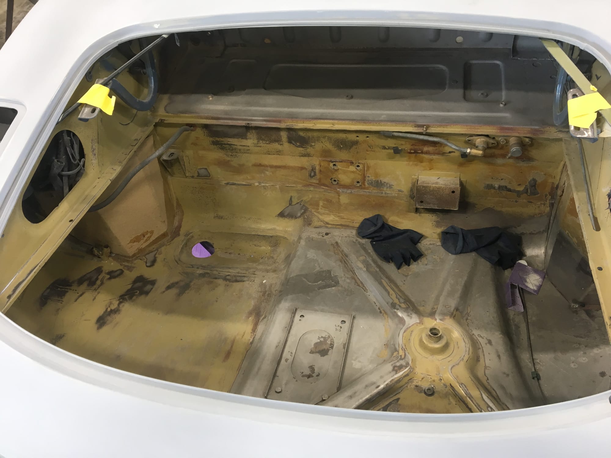 The car had a few isolated patches of rust caused by plugged drain tubes. It was stipped to bare metal and sent to Lyle at Rods n'Restos for repair to the trunk and rear fenders. Cosmos Collision, under the careful attention of Loc Ngo, repainted the car in the original Greensand hue.
