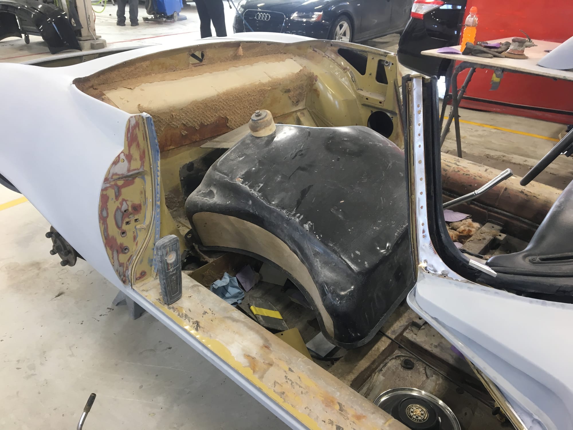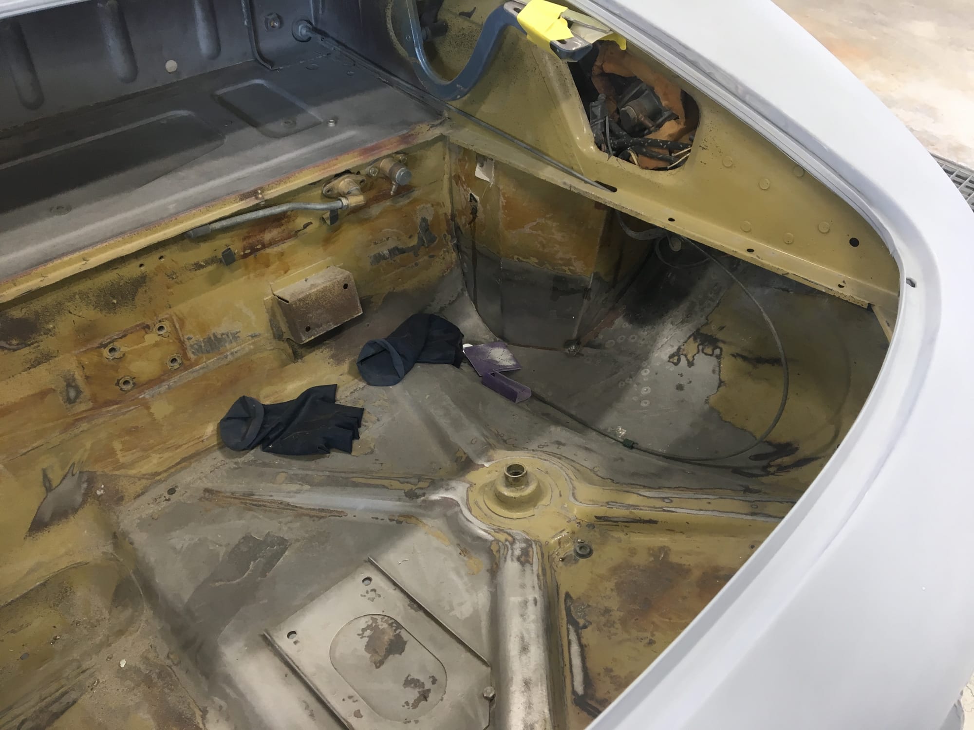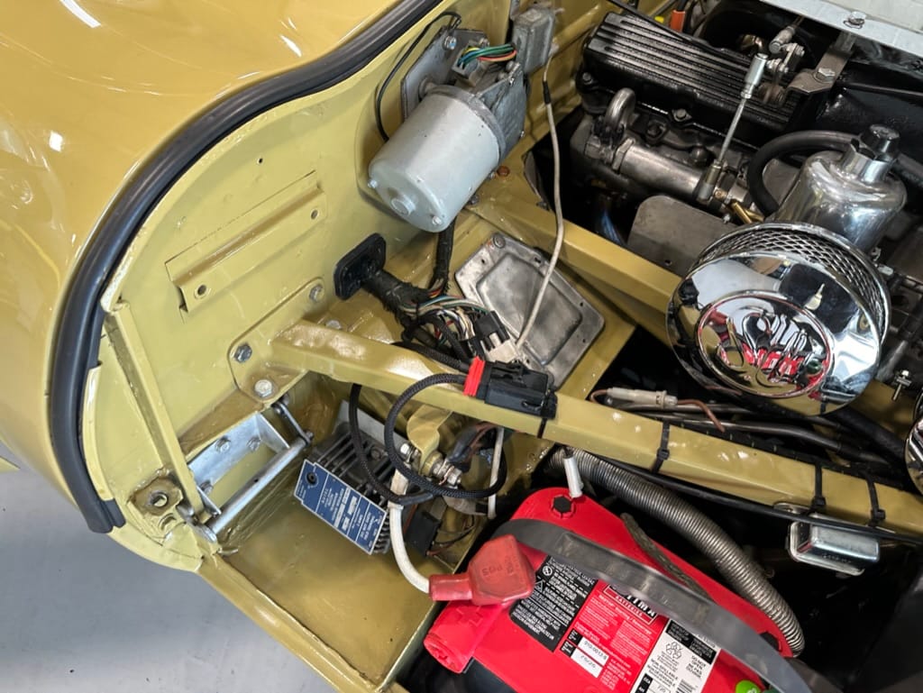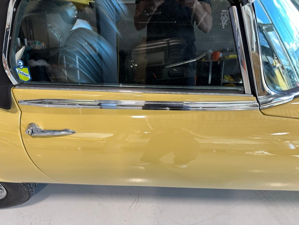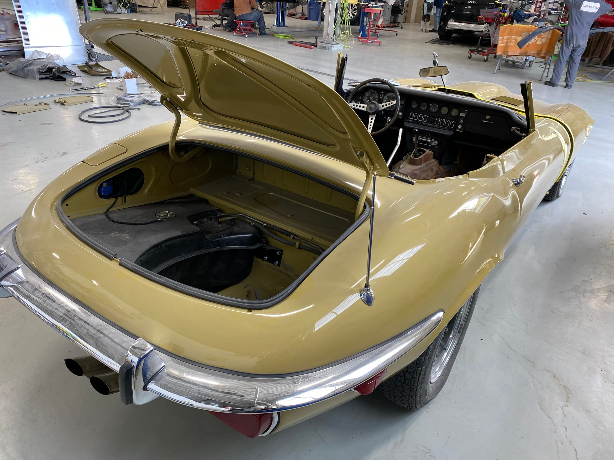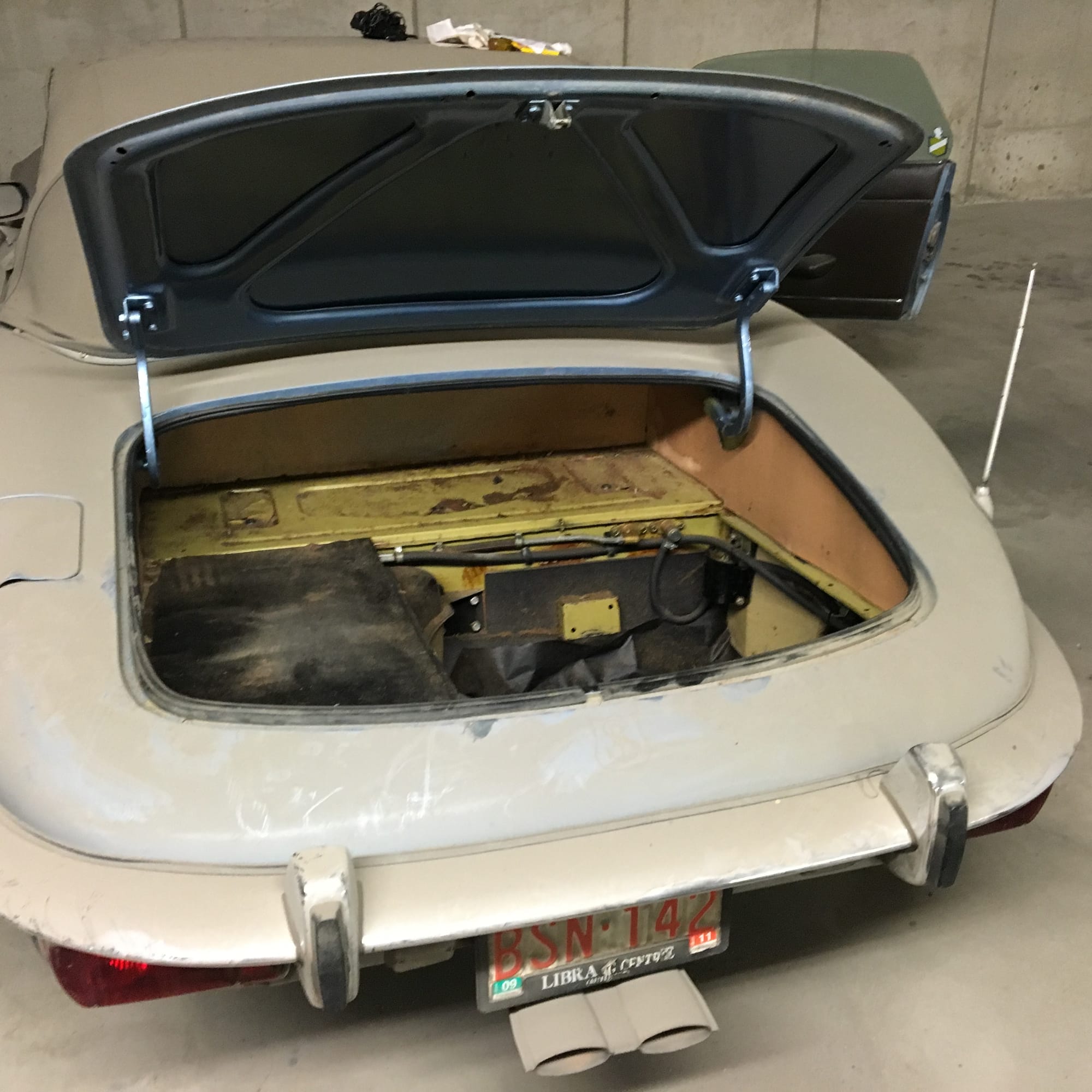 The car had a few isolated patches of rust caused by plugged drain tubes. It was stipped to bare metal and sent to Lyle at Rods n'Restos for repair to the trunk and rear fenders. Cosmos Collision, under the careful attention of Loc Ngo, repainted the car in the original Greensand hue.