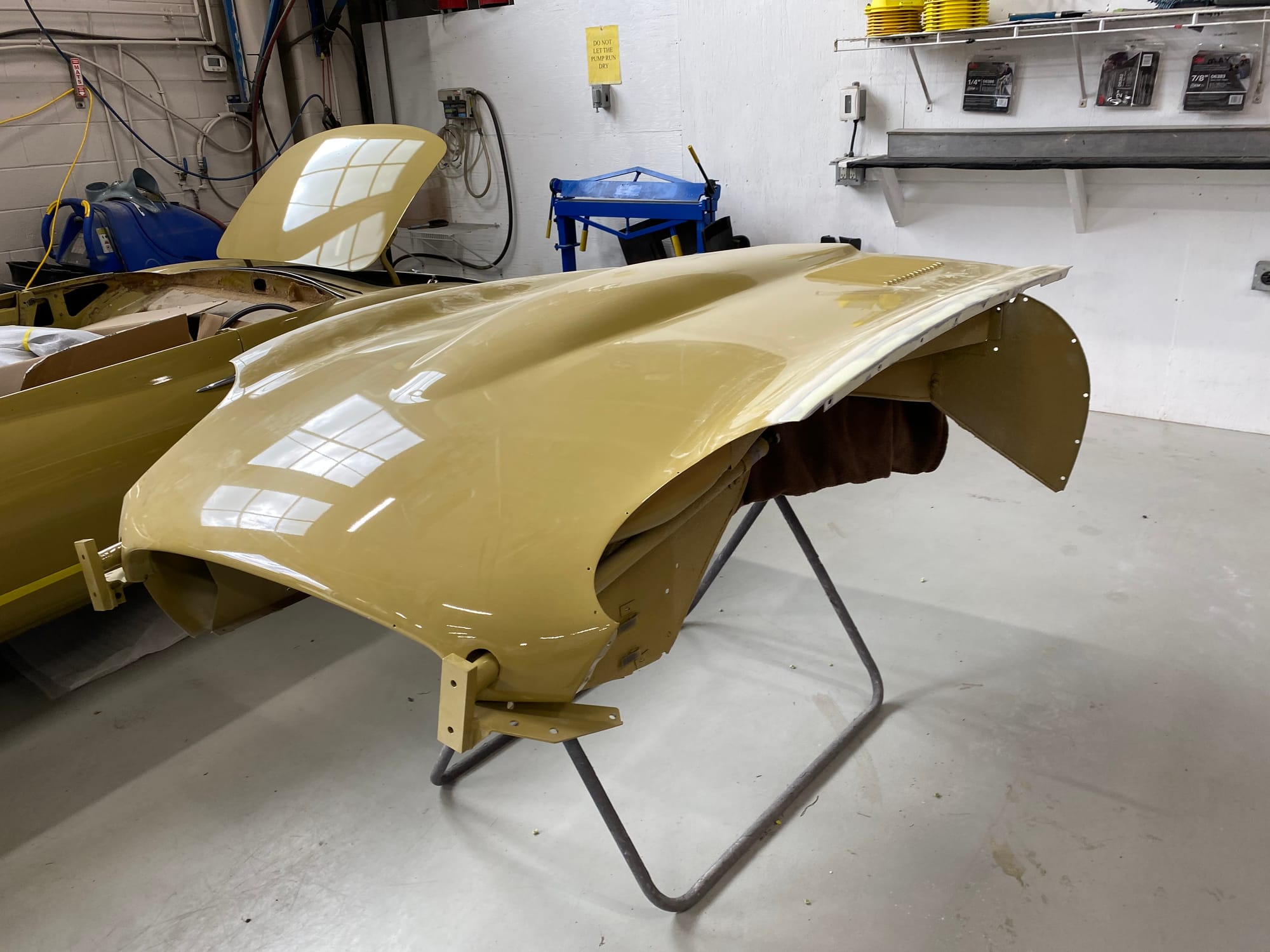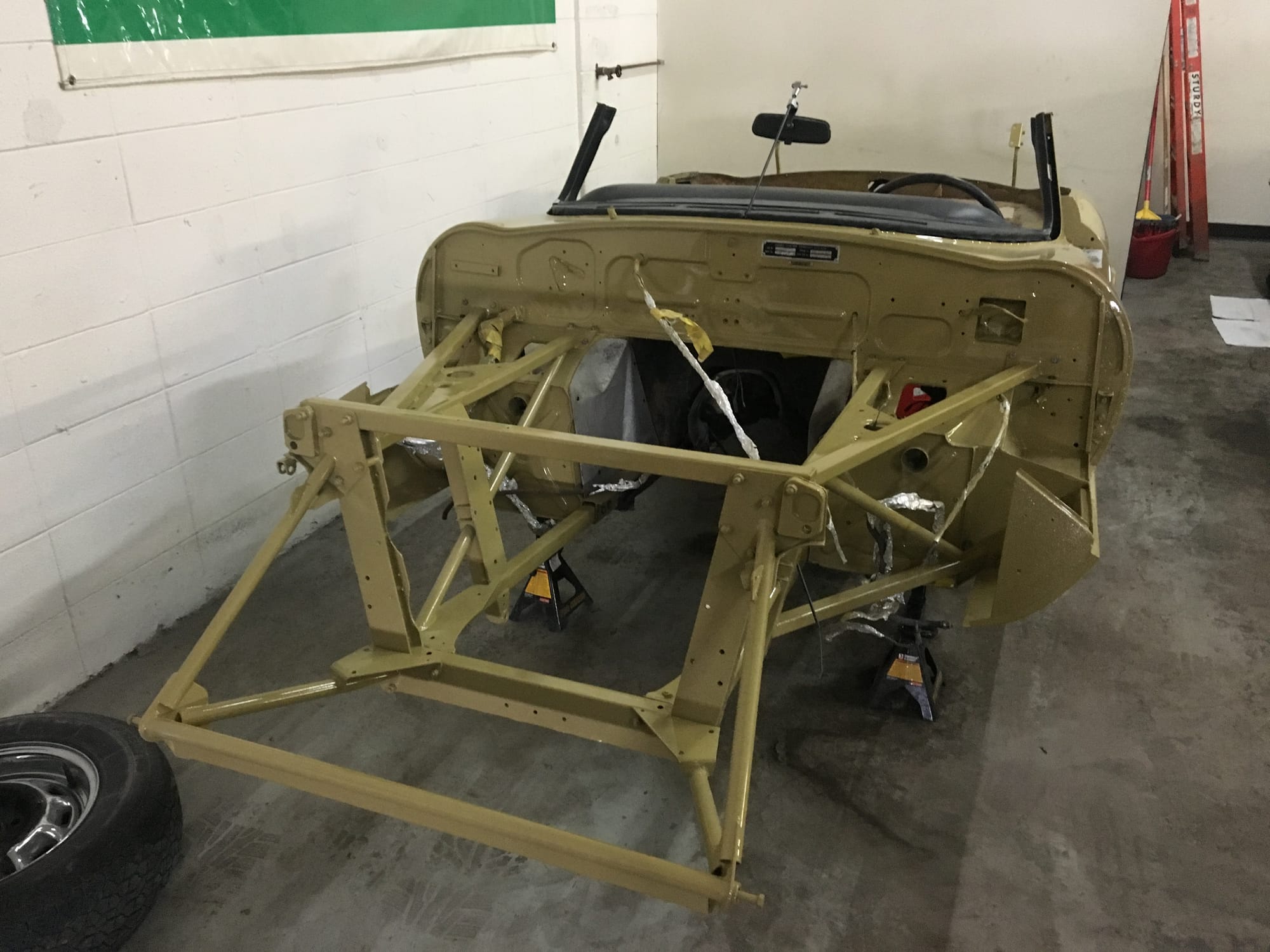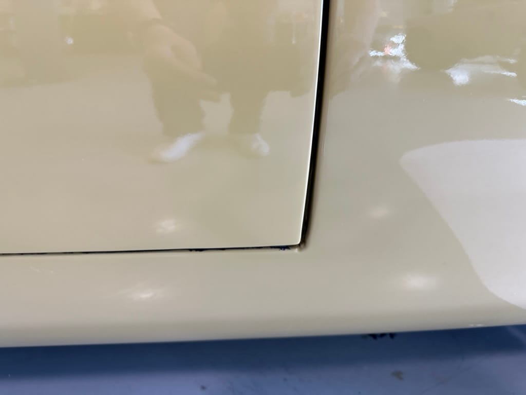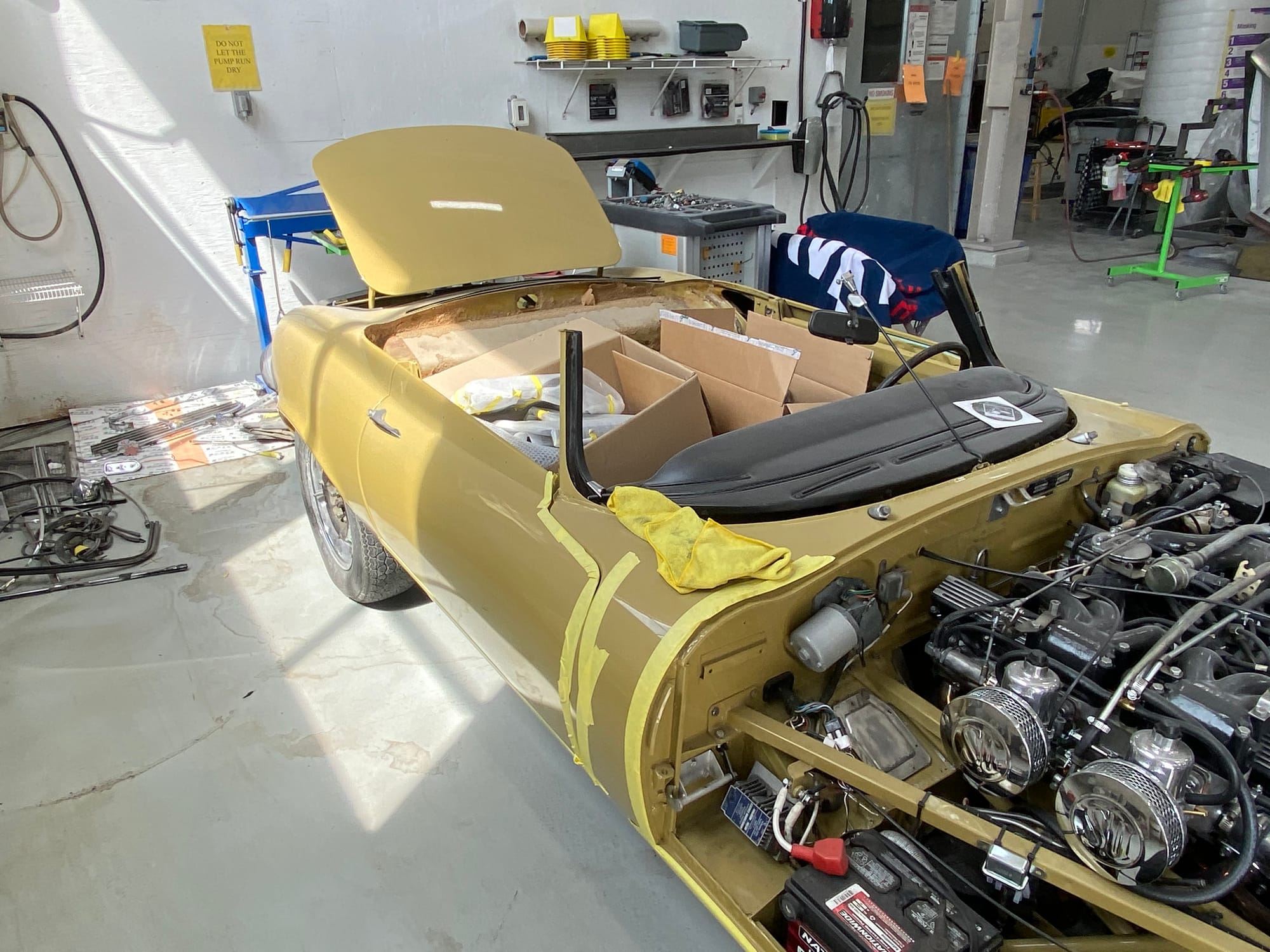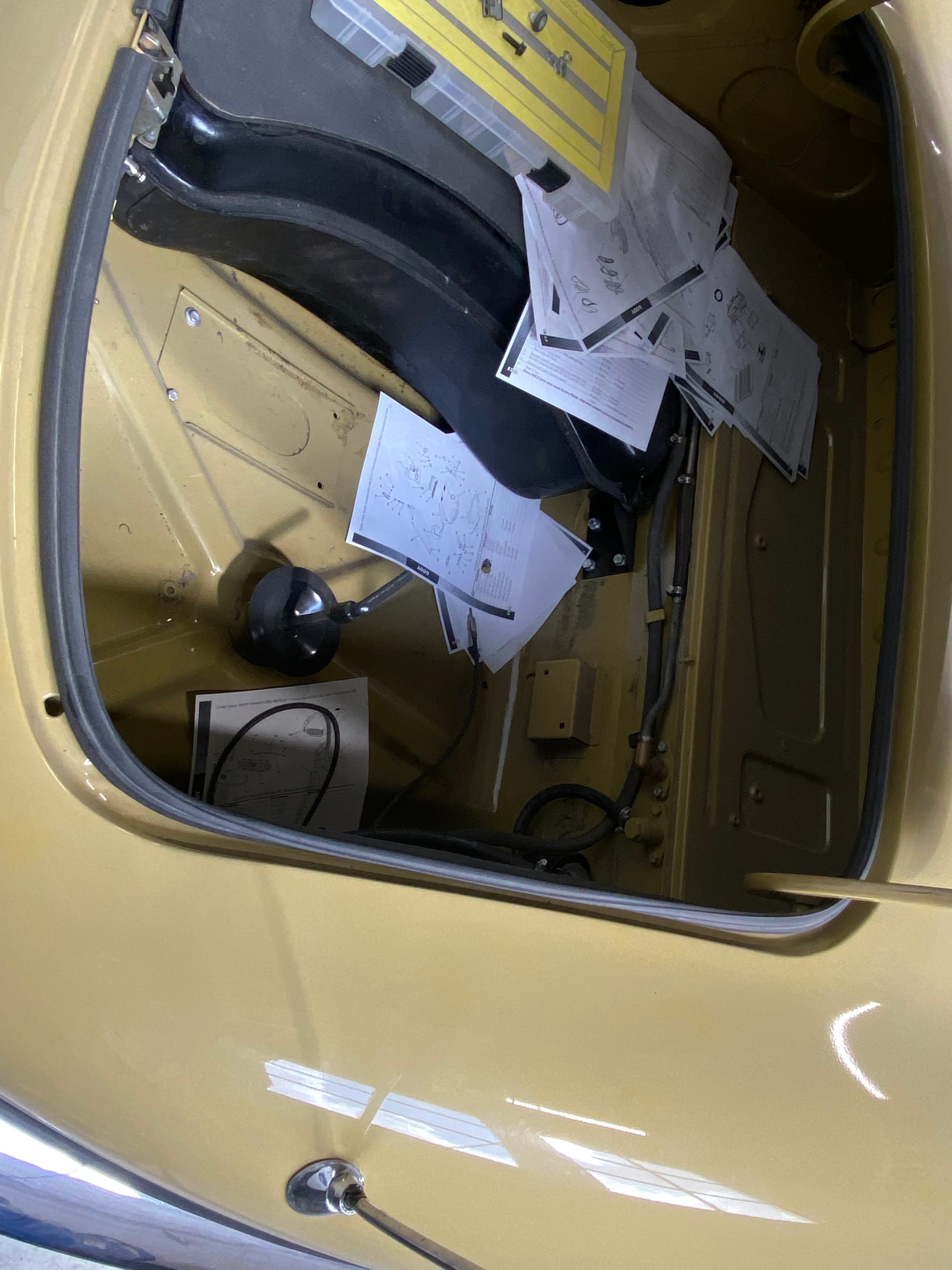The car had a few isolated patches of rust caused by plugged drain tubes. It was stipped to bare metal and sent to Lyle at Rods n'Restos for repair to the trunk and rear fenders. Cosmos Collision, under the careful attention of Loc Ngo, repainted the car in the original Greensand hue.
