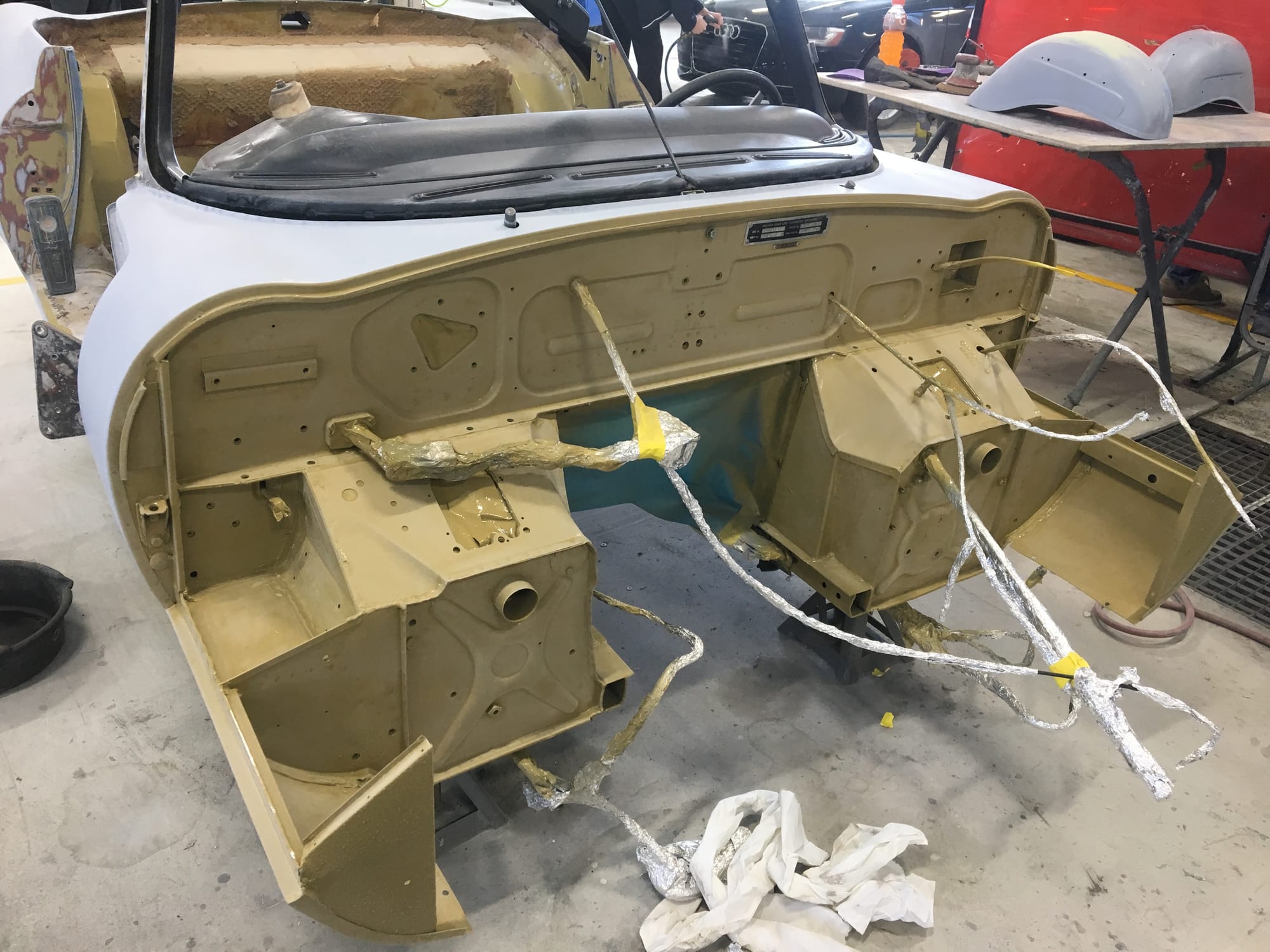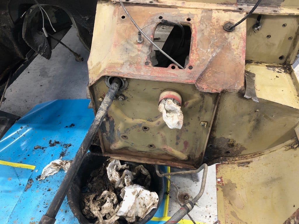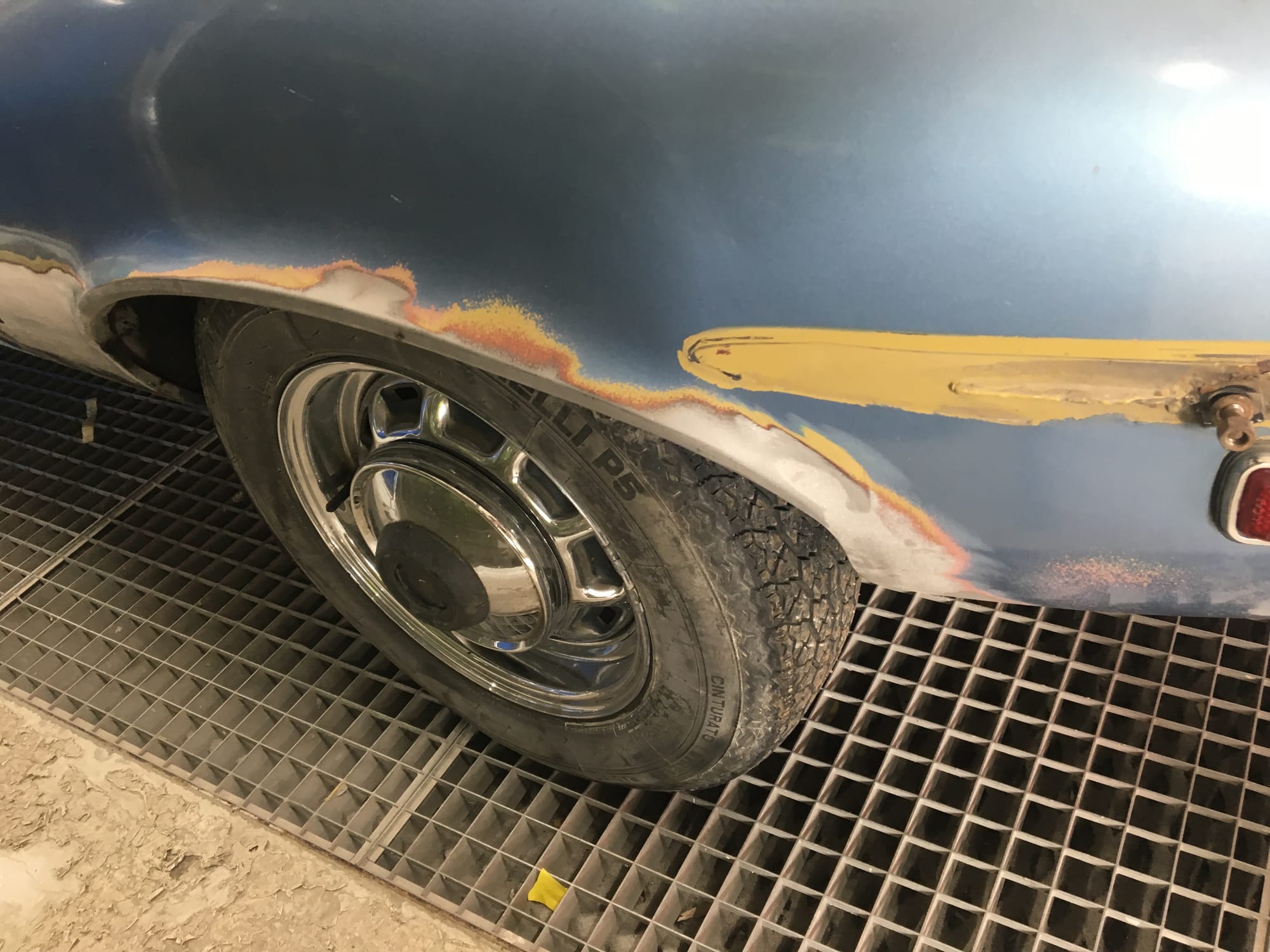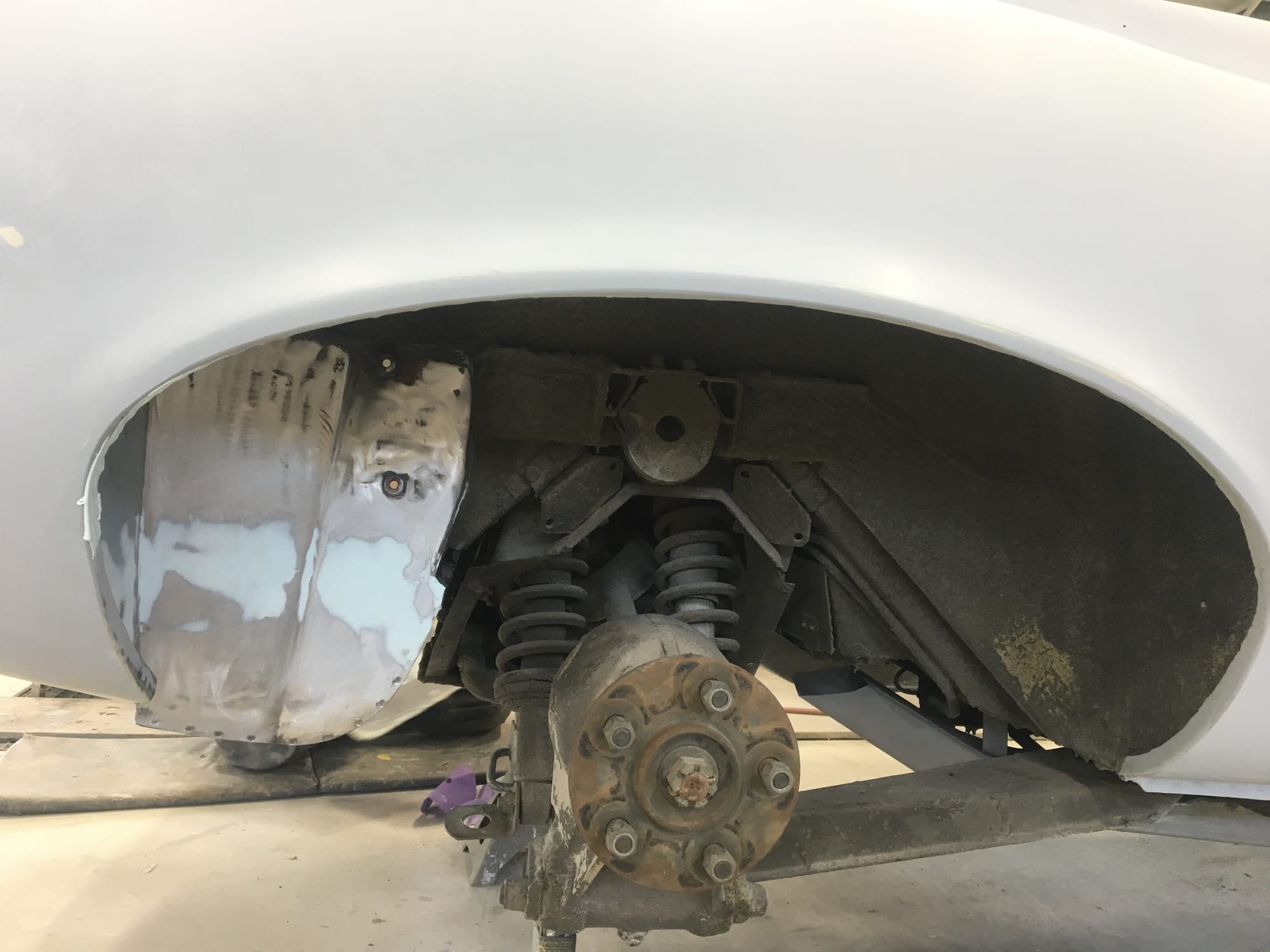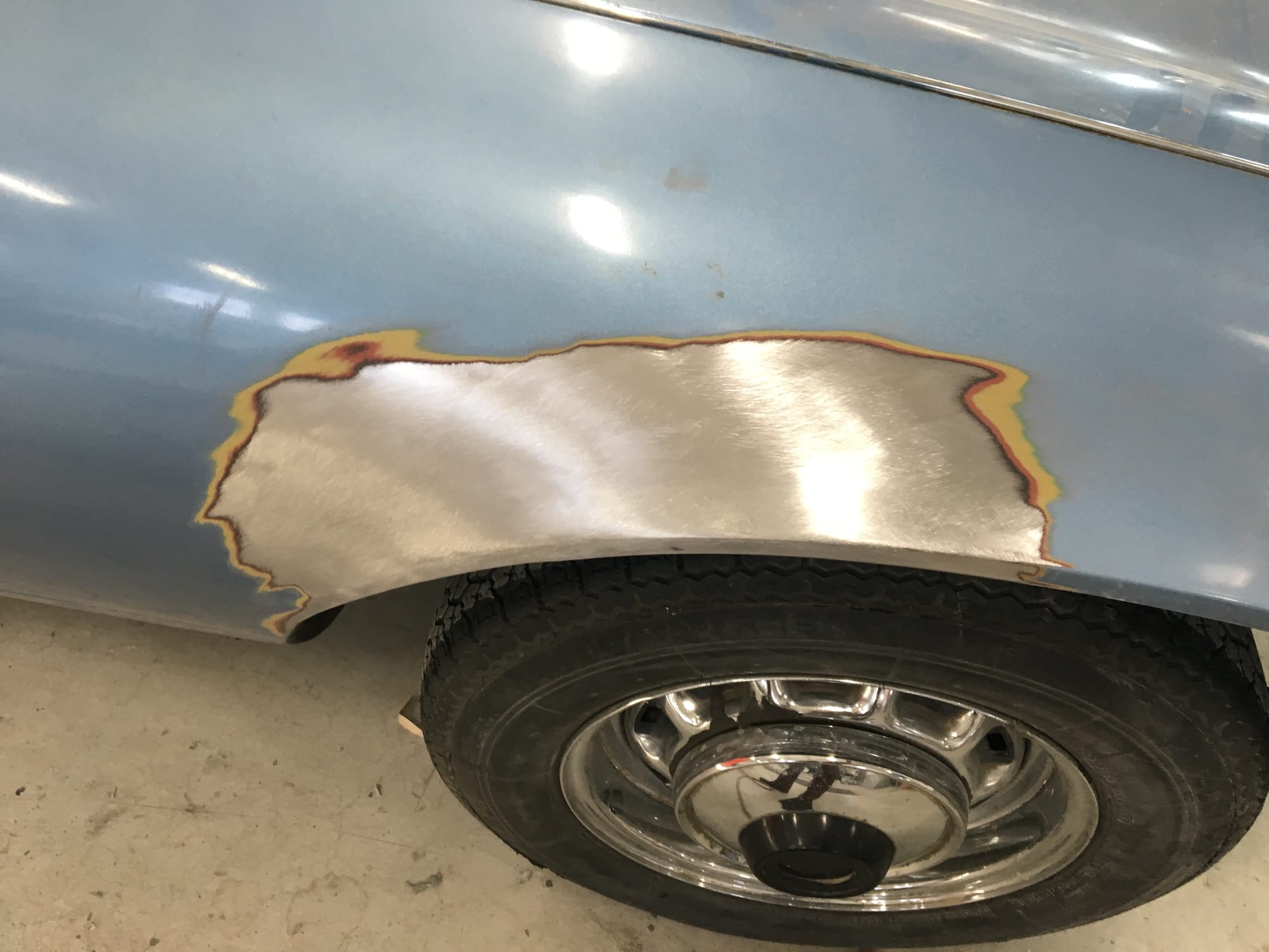 The car had a few isolated patches of rust caused by plugged drain tubes. It was stipped to bare metal and sent to Lyle at Rods n'Restos for repair to the trunk and rear fenders. Cosmos Collision, under the careful attention of Loc Ngo, repainted the car in the original Greensand hue.