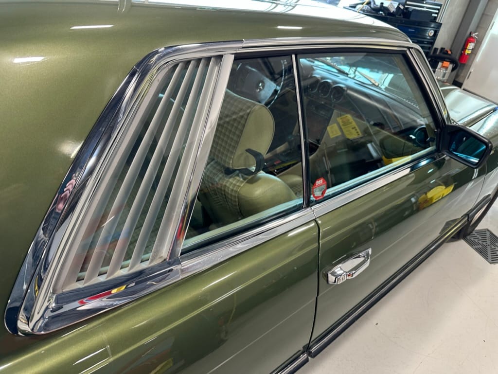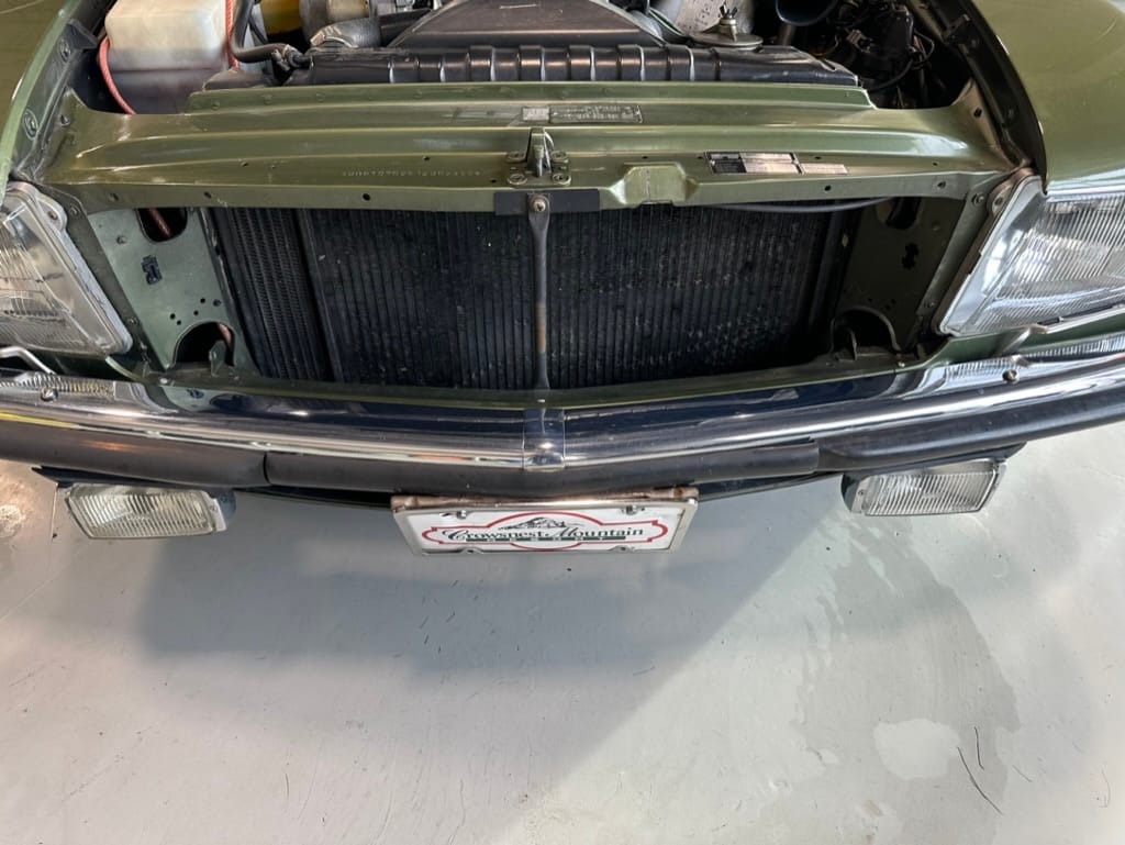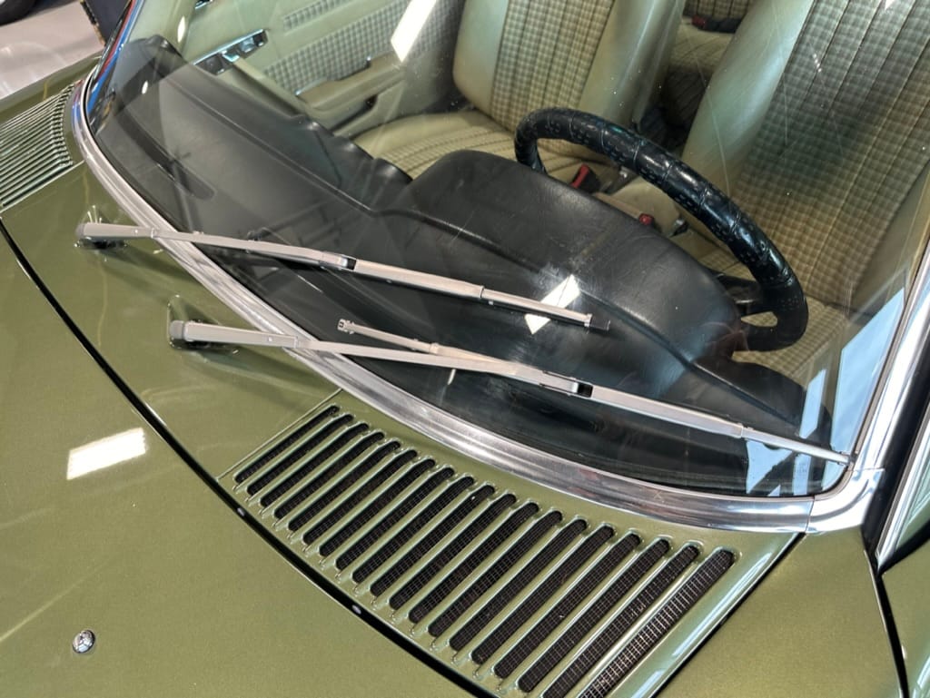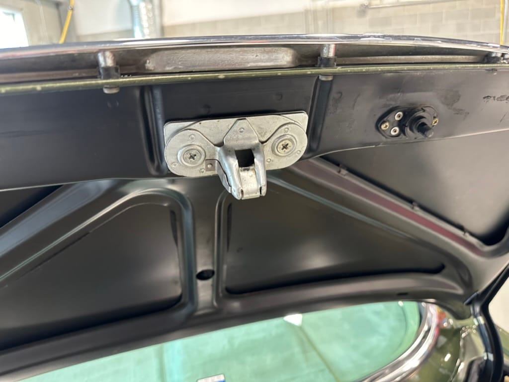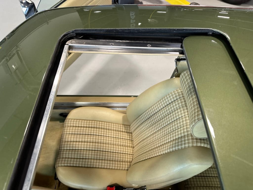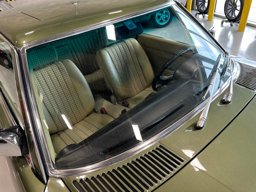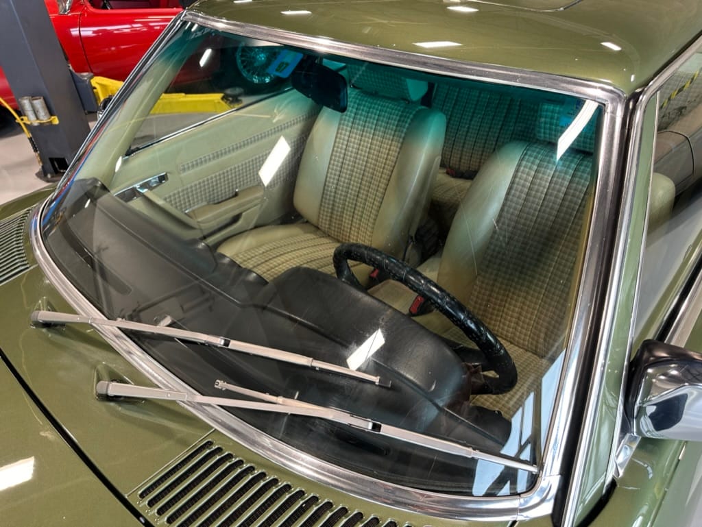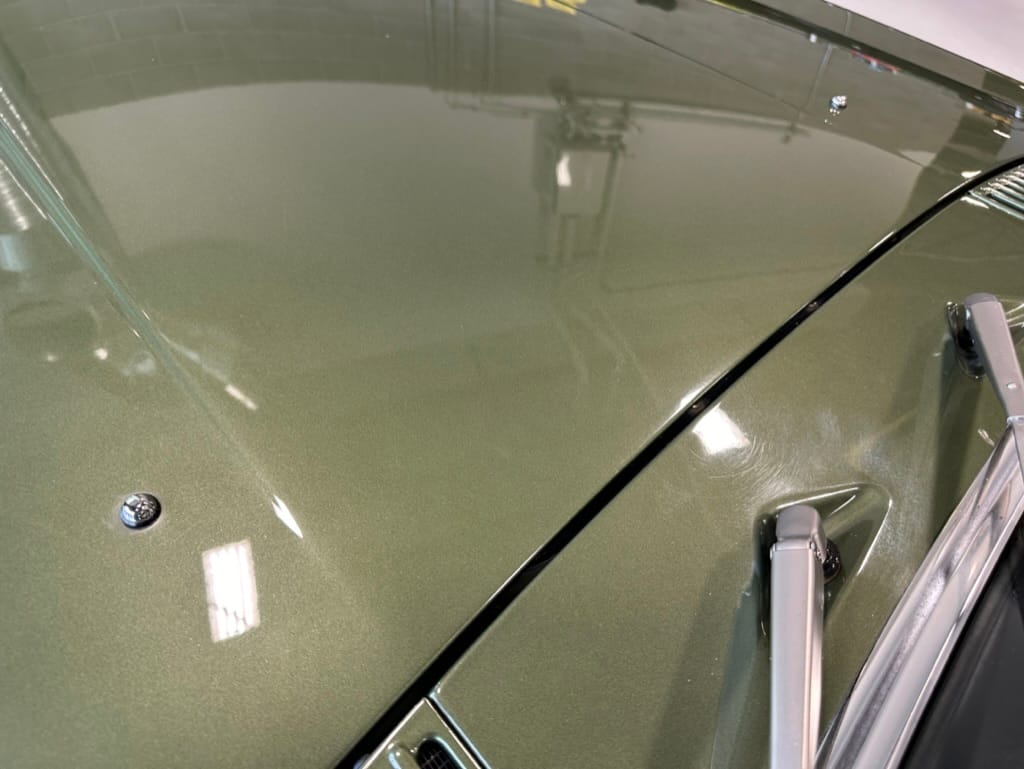 The car retains most of its original Cypress Green Metallic paint, though the drivers side front and rear fenders have been refinished; the front fender in Europe and the rear fender in Alberta during the current ownership (a scratch was fixed from a garage incident). A paint meter report is shown in the YouTube video. The car is not rusted and has a very clean undercarriage.