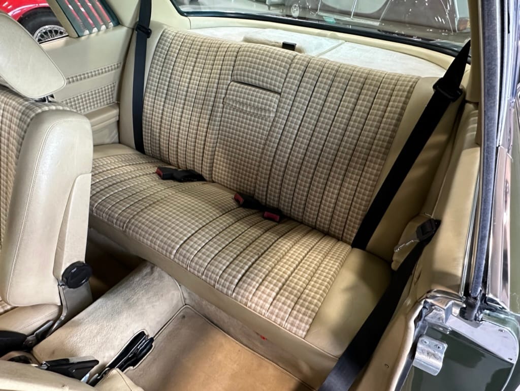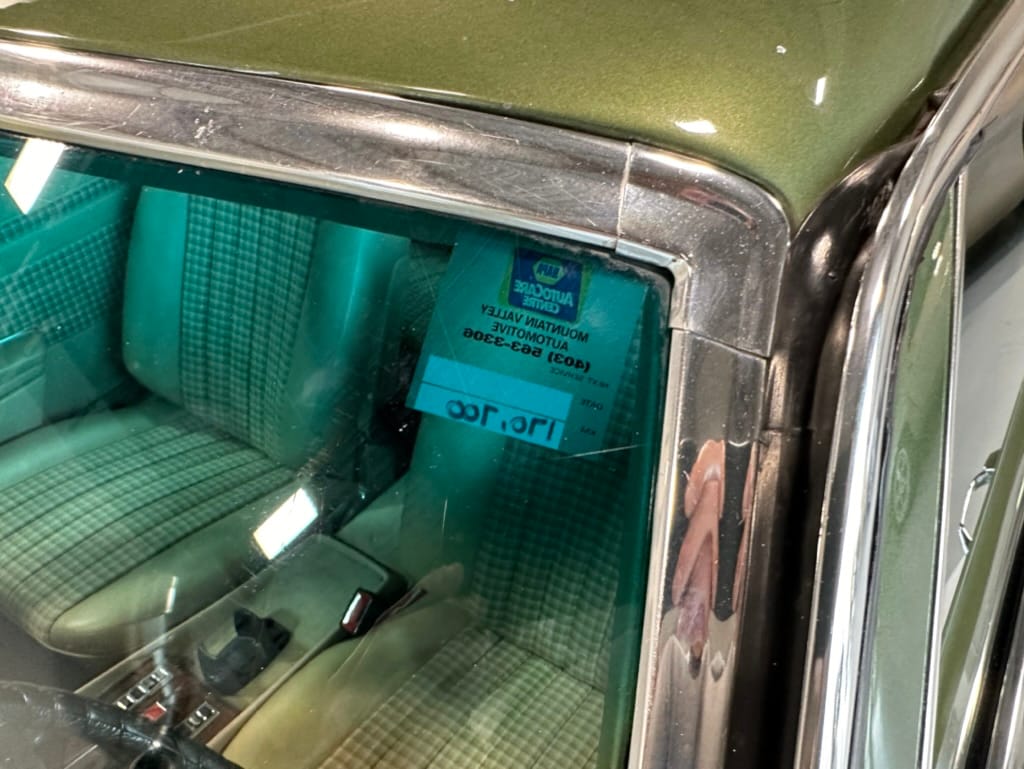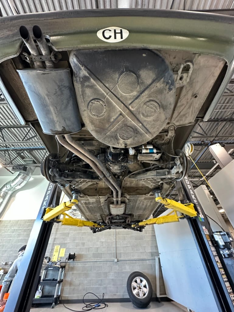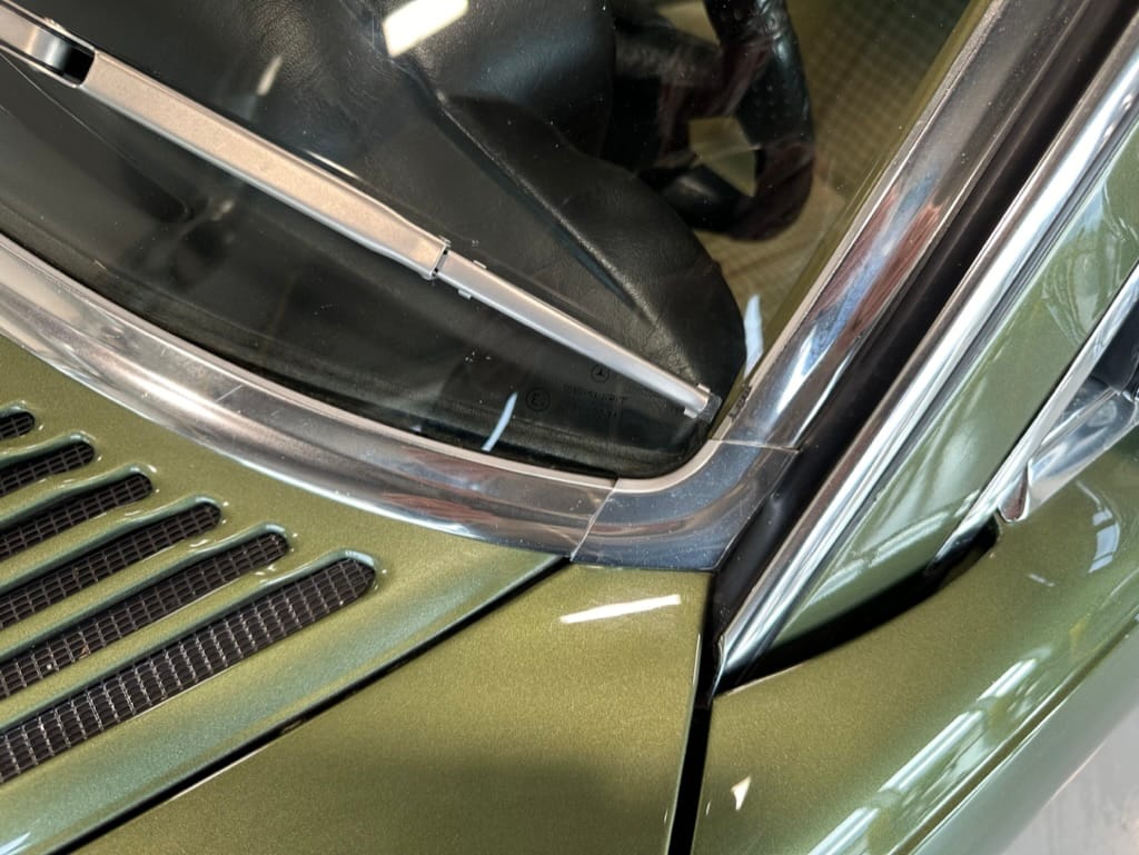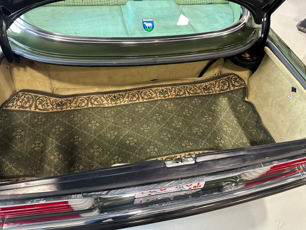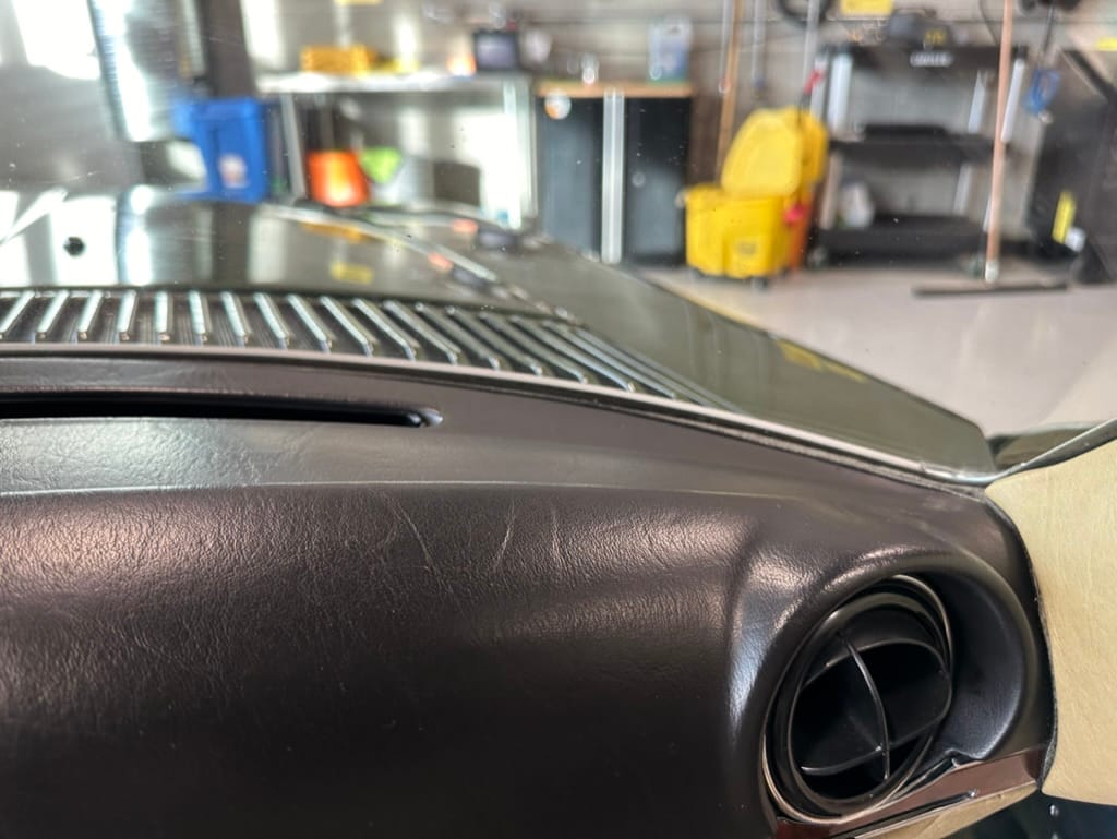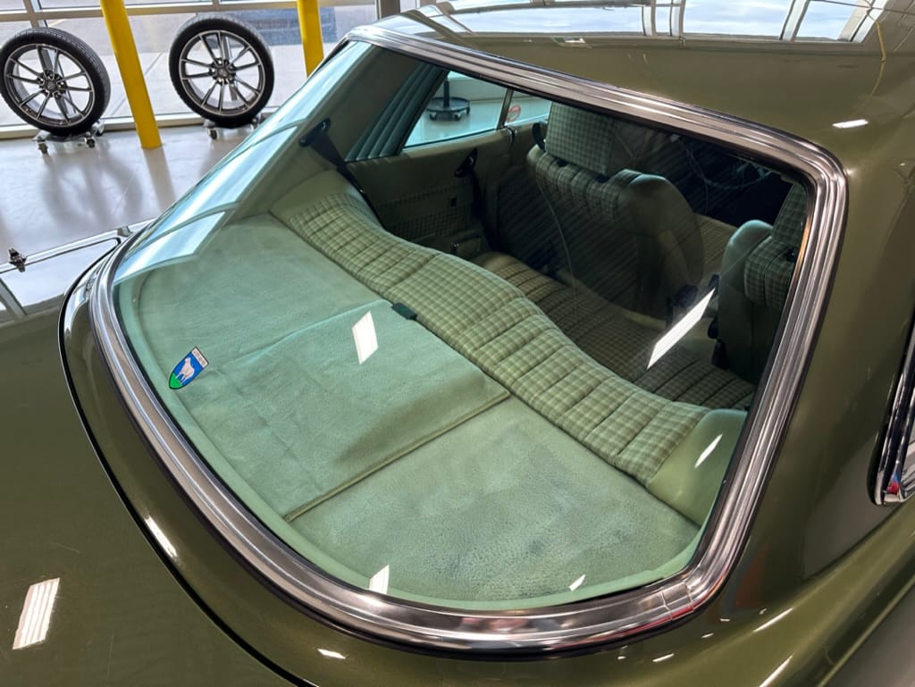 The car retains most of its original Cypress Green Metallic paint, though the drivers side front and rear fenders have been refinished; the front fender in Europe and the rear fender in Alberta during the current ownership (a scratch was fixed from a garage incident). A paint meter report is shown in the YouTube video. The car is not rusted and has a very clean undercarriage.
