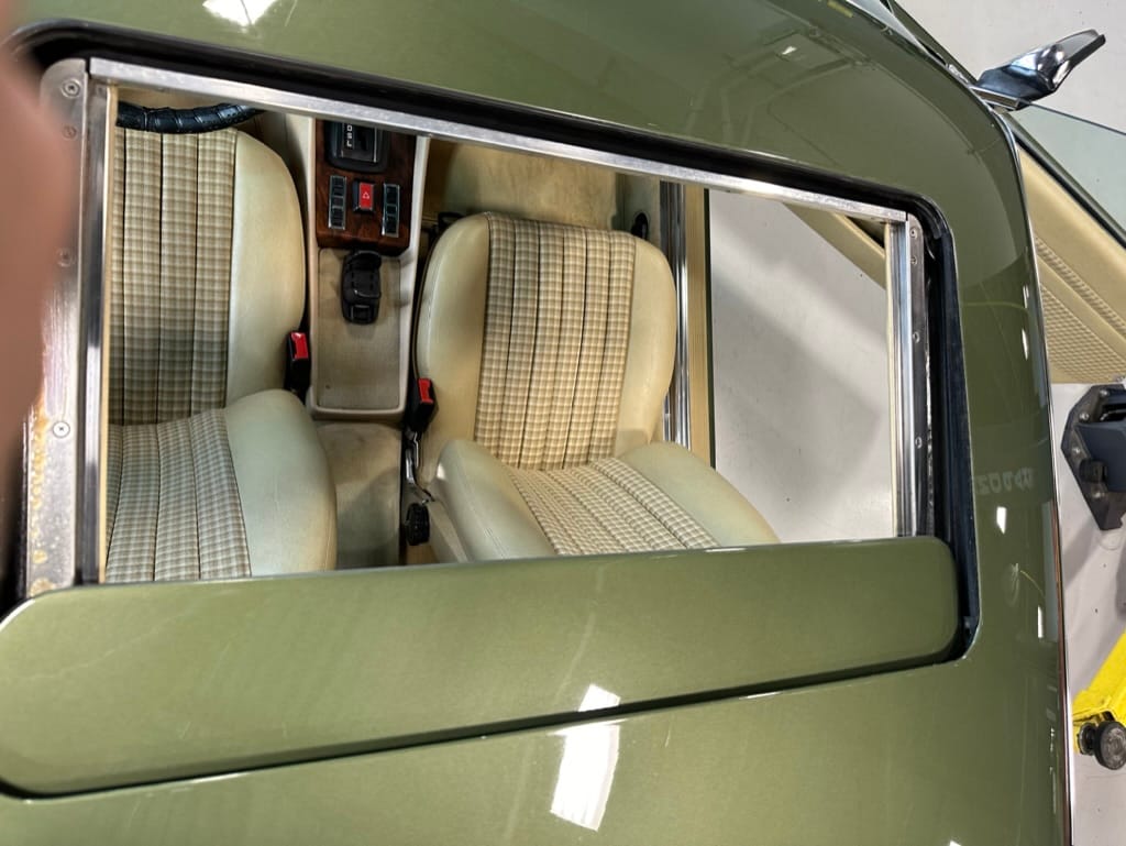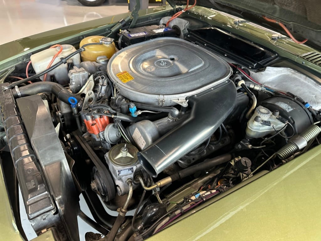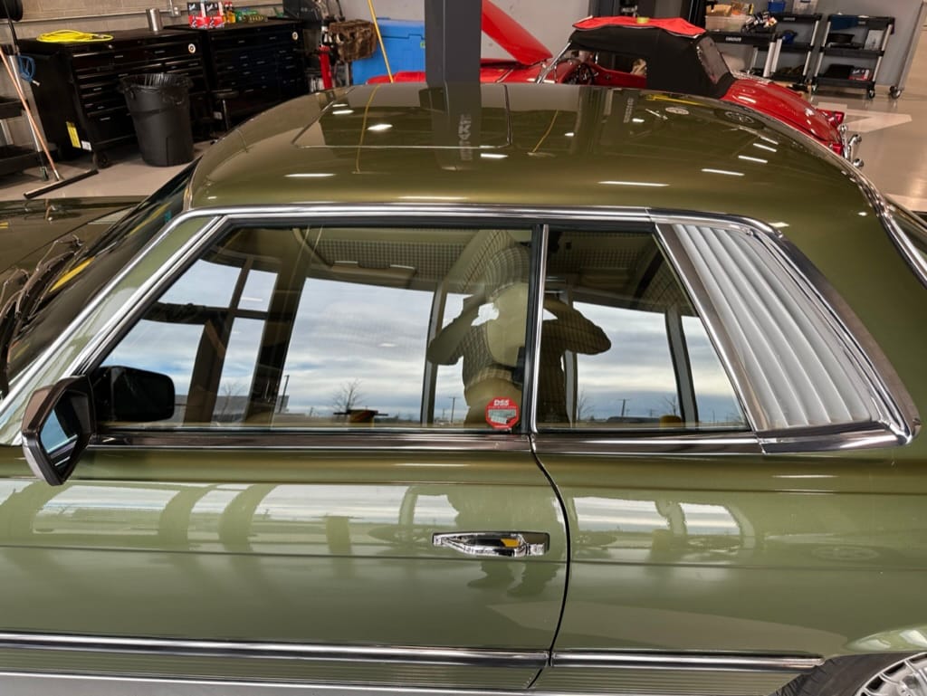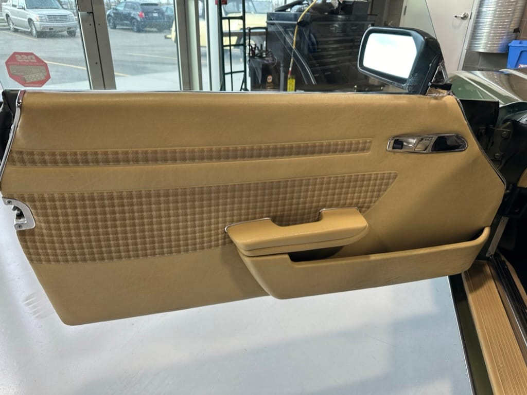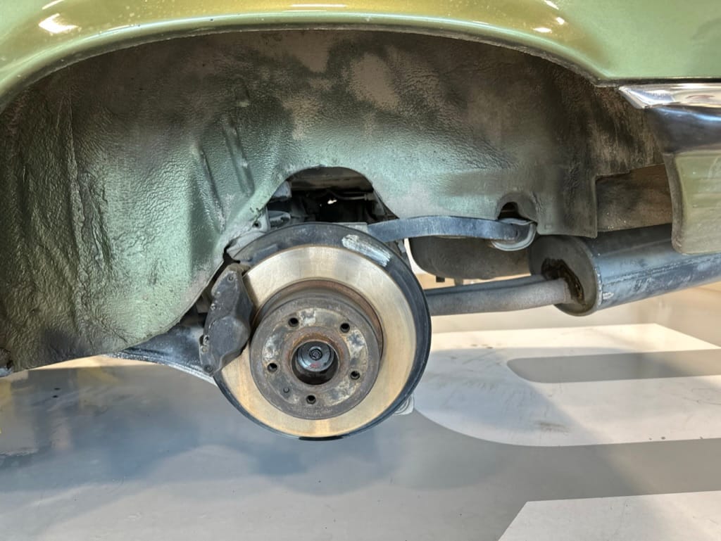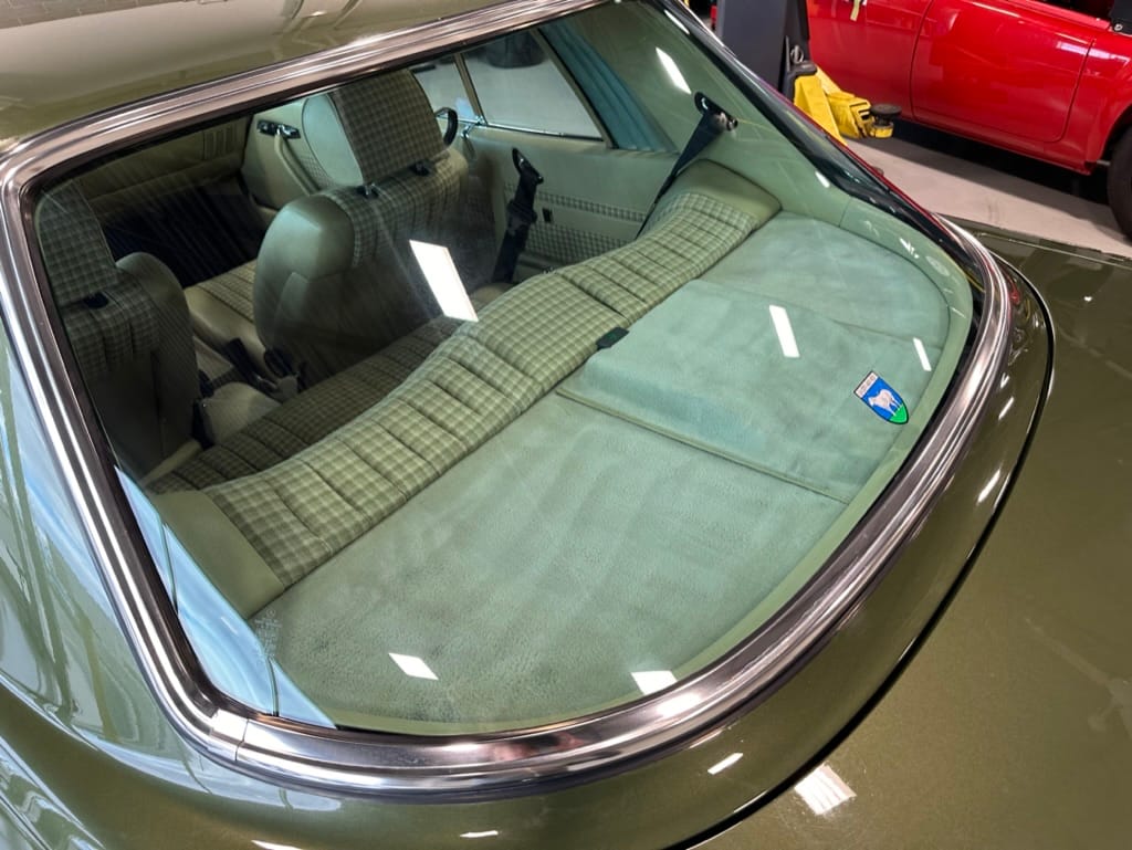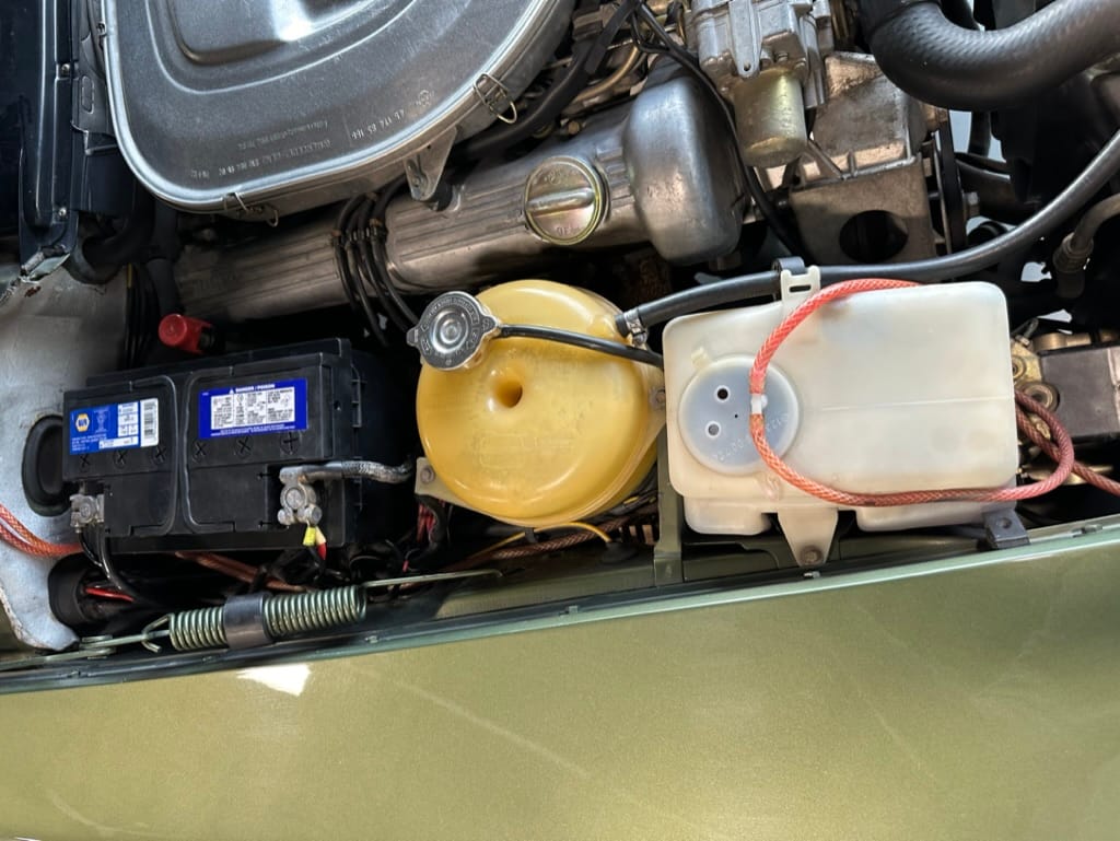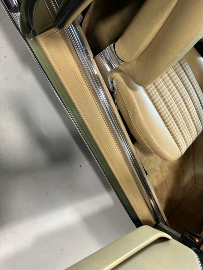 The car retains most of its original Cypress Green Metallic paint, though the drivers side front and rear fenders have been refinished; the front fender in Europe and the rear fender in Alberta during the current ownership (a scratch was fixed from a garage incident). A paint meter report is shown in the YouTube video. The car is not rusted and has a very clean undercarriage.