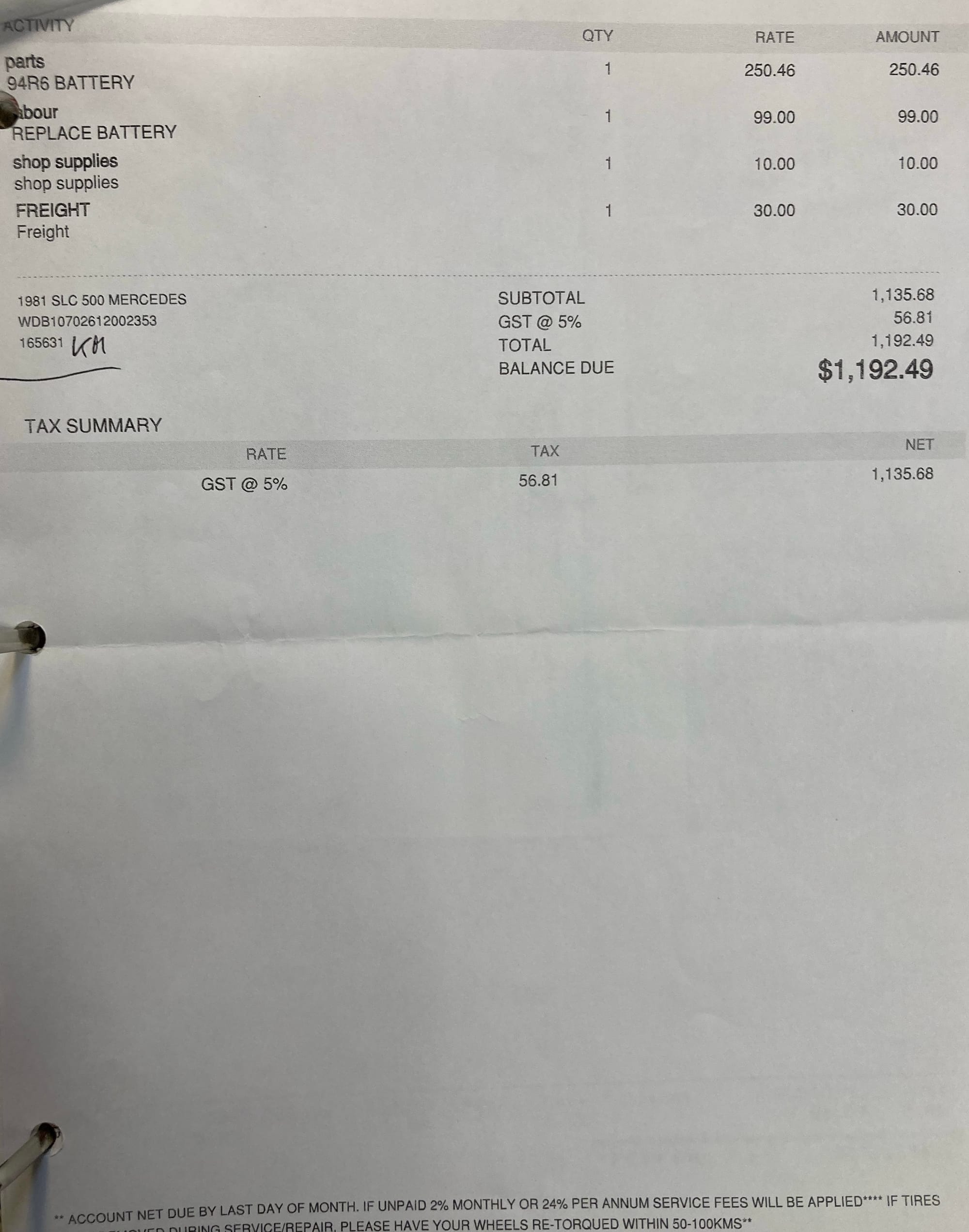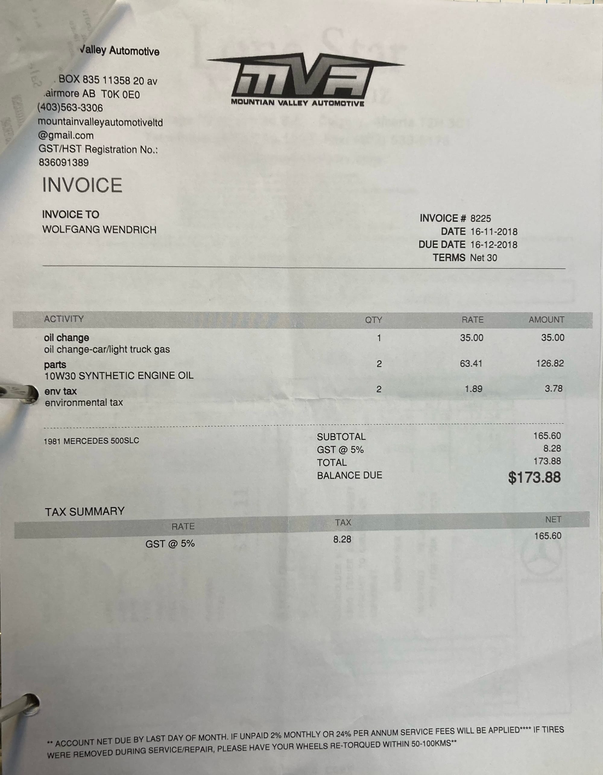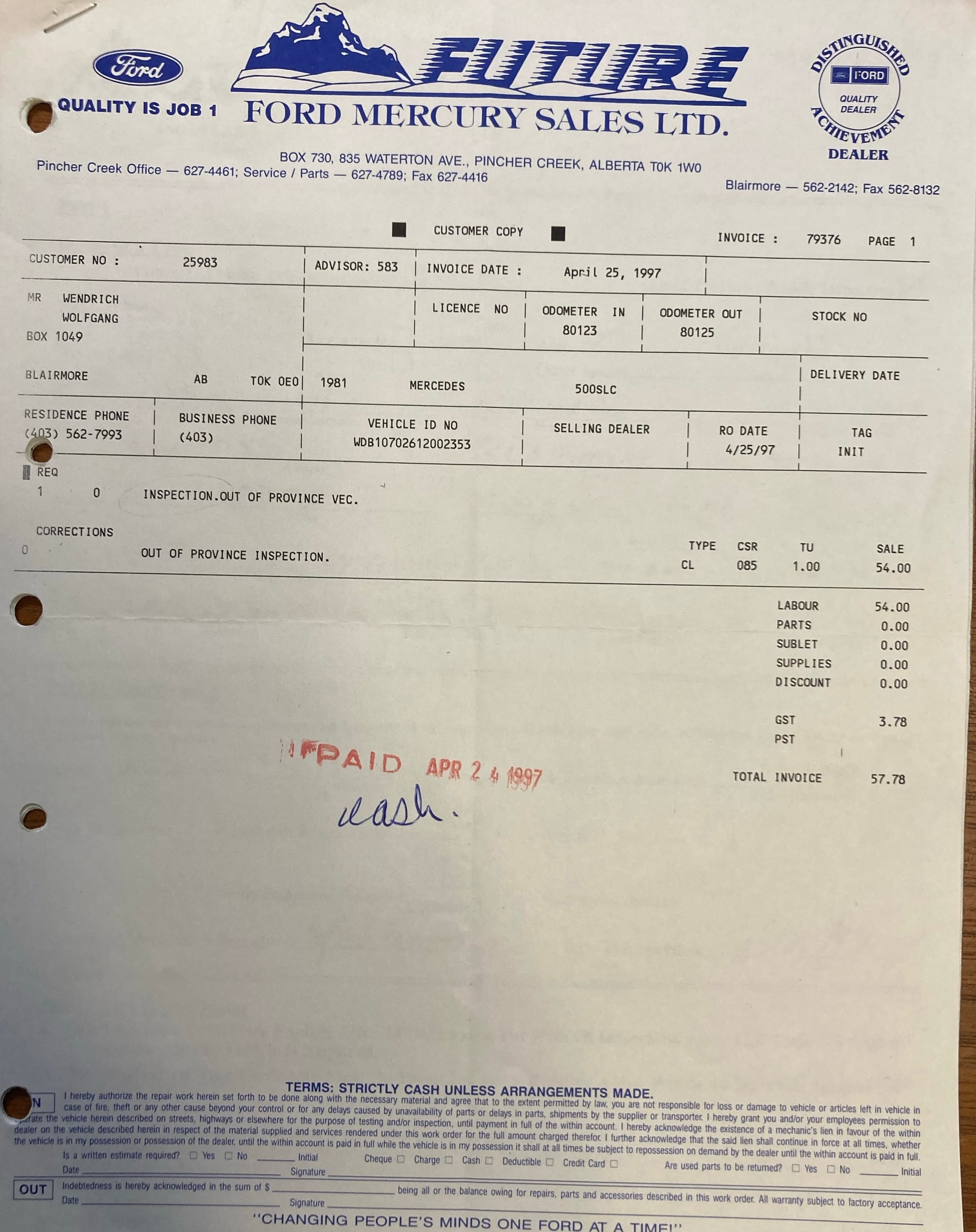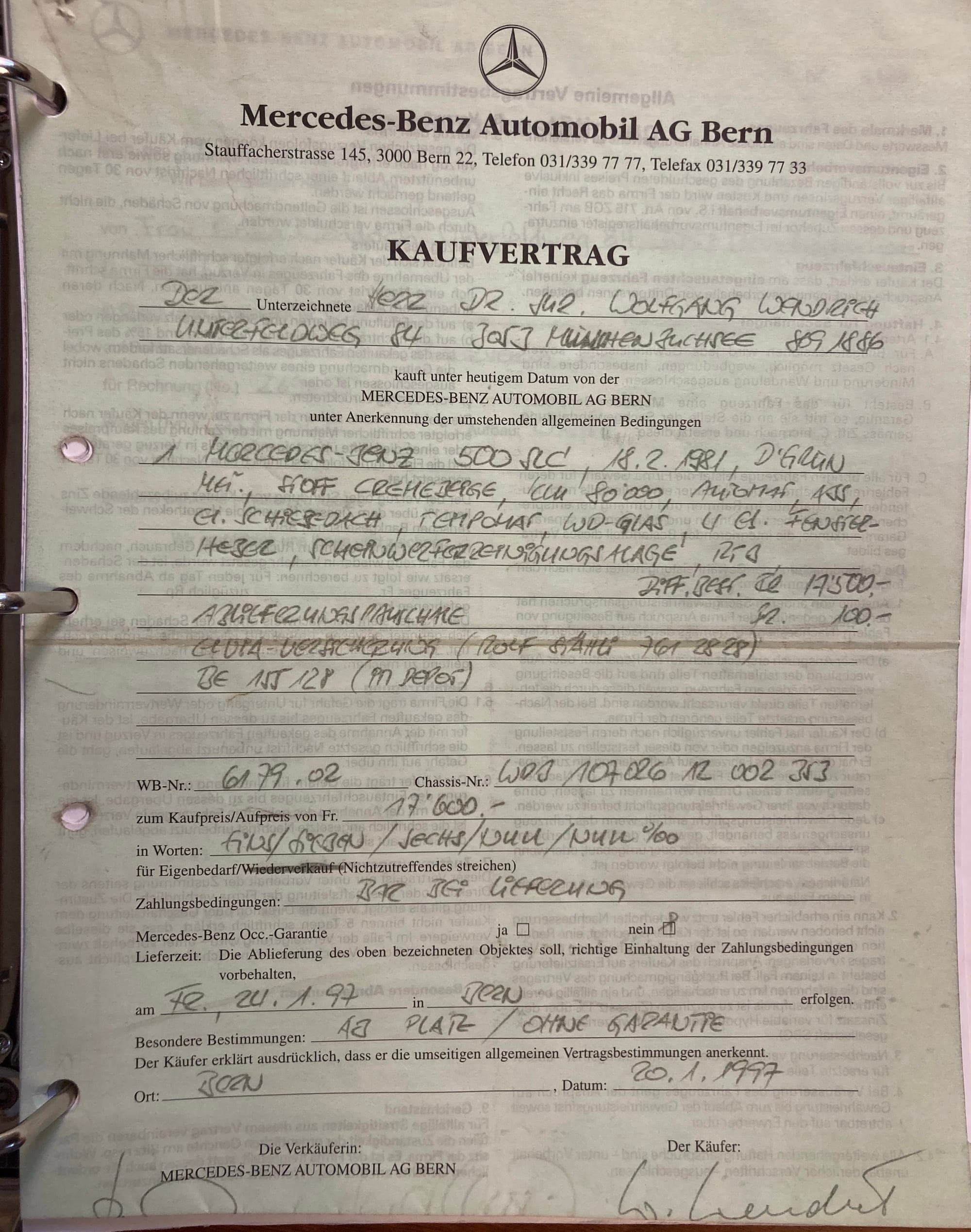 This 1981 500 SLC was sold new in Switzerland and traded back to the selling dealer where, in 1997, it was purchased and imported to Canada by the current owner. It has lived in the Crowsnest Pass area of southwestern Alberta since, and accumulated about 85,000 highway km since coming to Canada. It was regularly serviced by the selling dealer in Switzerland from 1981 to 1997, and then from independent specialists while in Canada. The car received replacement fuel and water pumps in 2002, and received a major service in 2016. It has been used sparingly since.