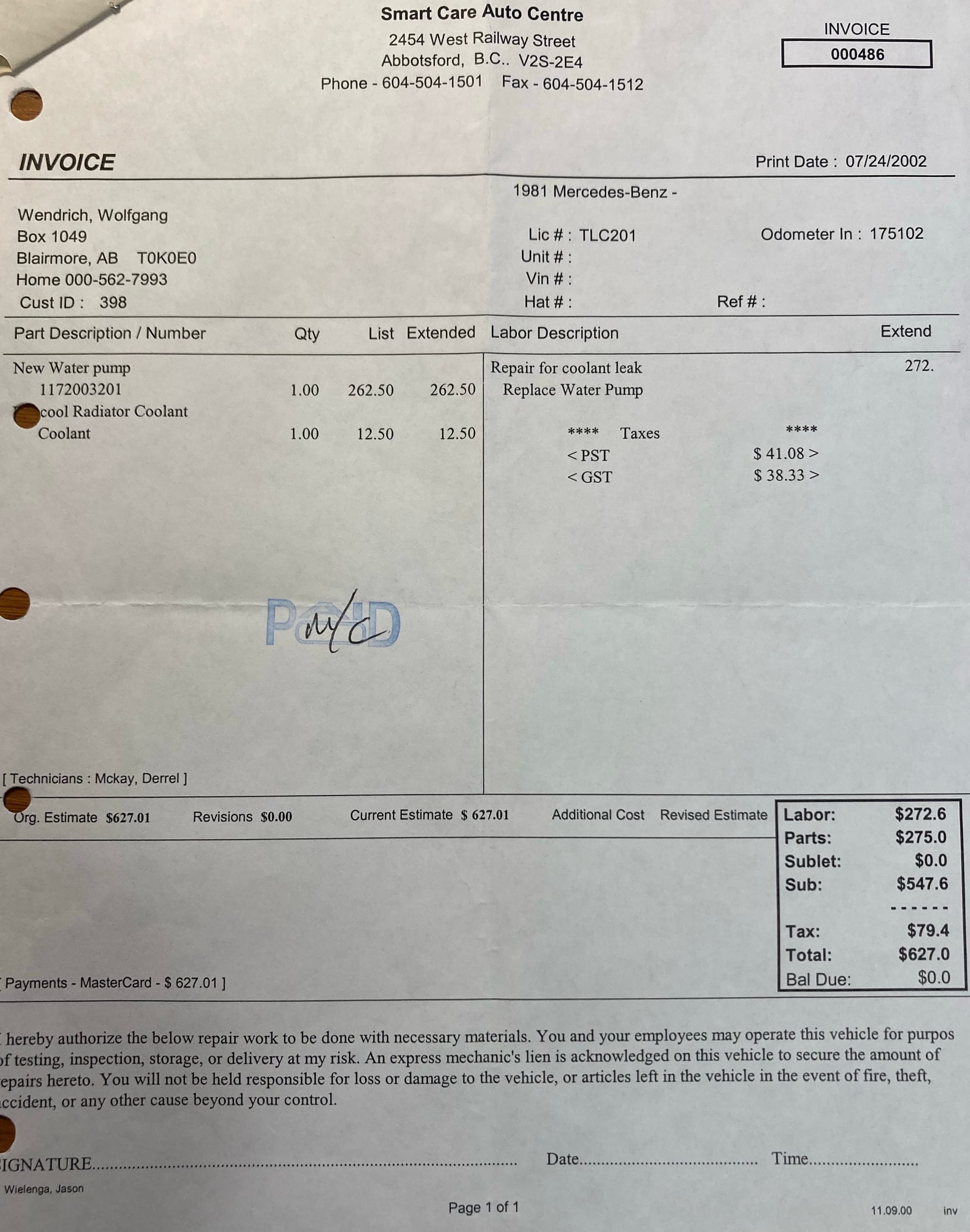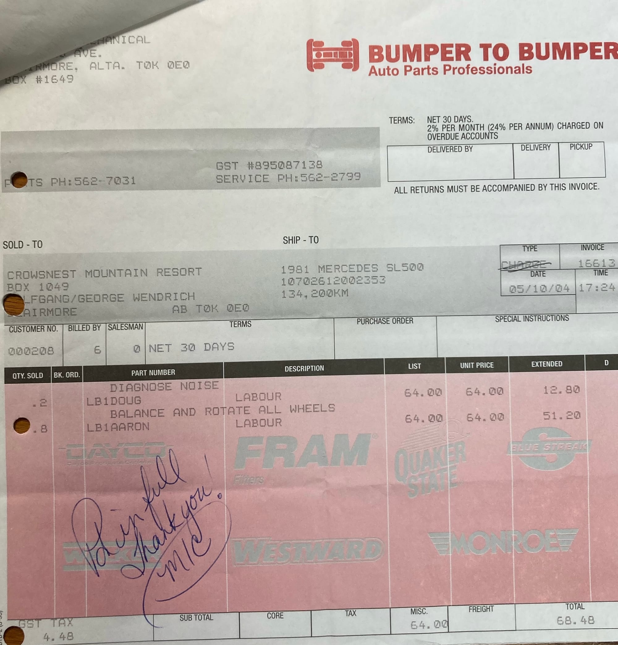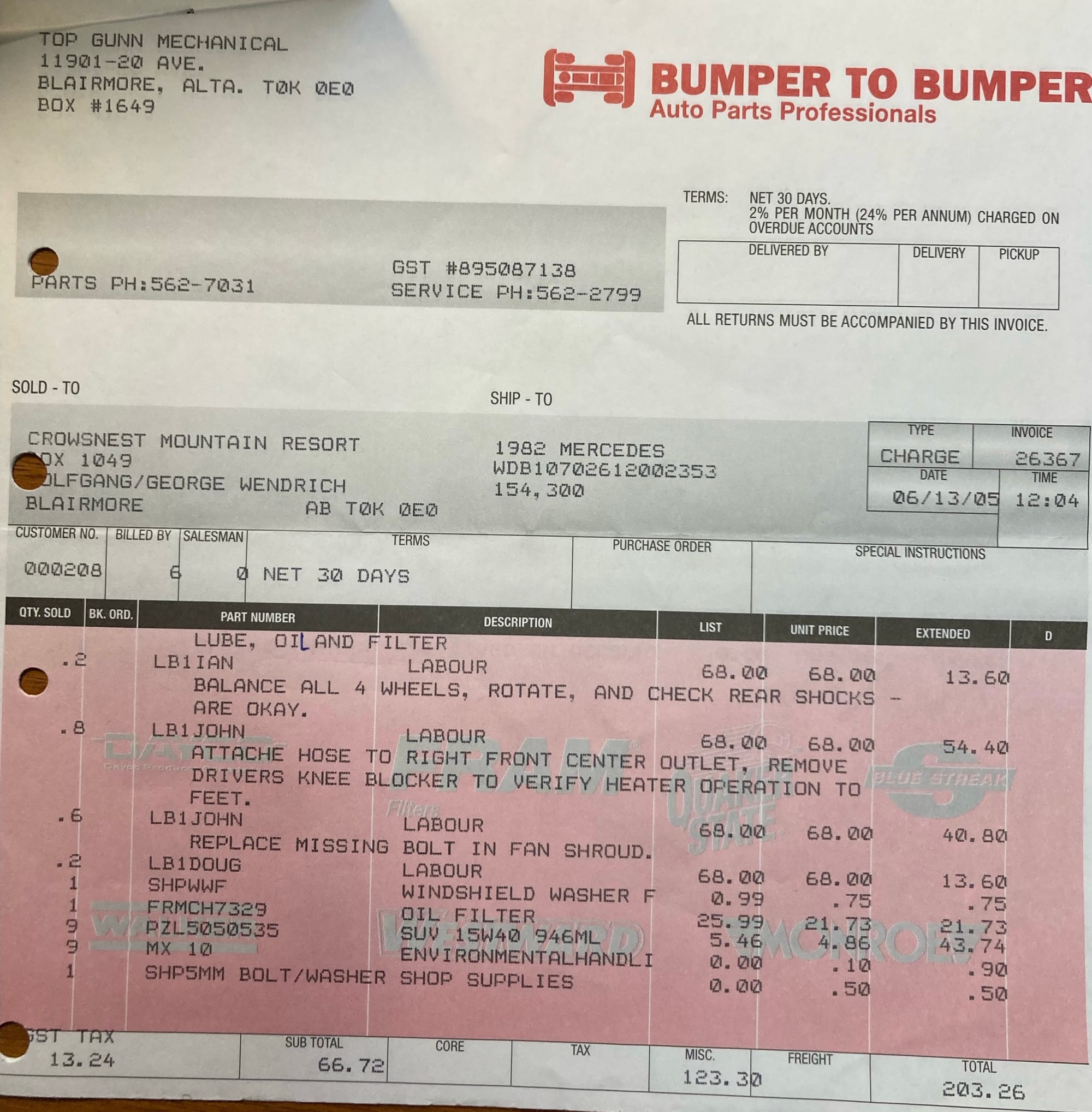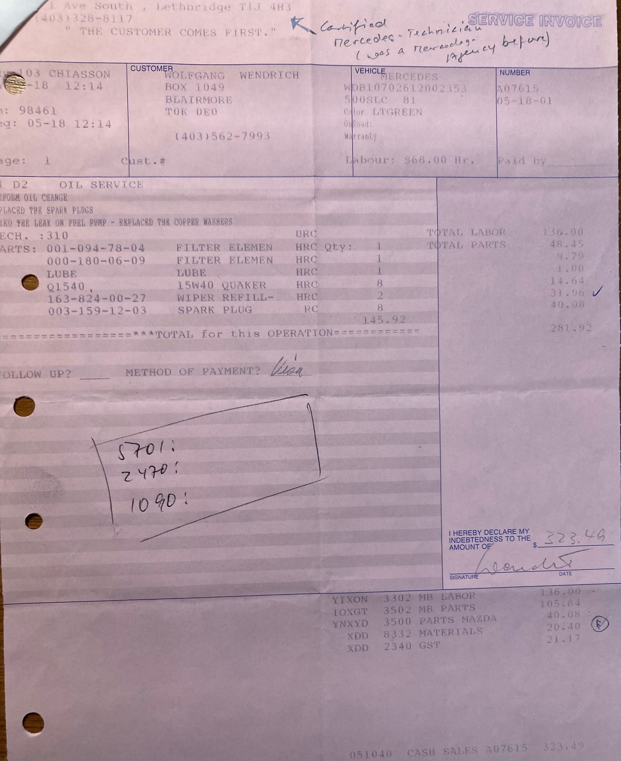 This 1981 500 SLC was sold new in Switzerland and traded back to the selling dealer where, in 1997, it was purchased and imported to Canada by the current owner. It has lived in the Crowsnest Pass area of southwestern Alberta since, and accumulated about 85,000 highway km since coming to Canada. It was regularly serviced by the selling dealer in Switzerland from 1981 to 1997, and then from independent specialists while in Canada. The car received replacement fuel and water pumps in 2002, and received a major service in 2016. It has been used sparingly since.