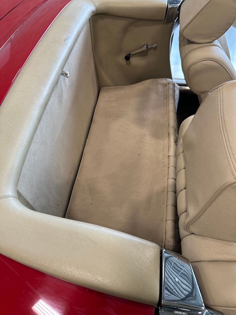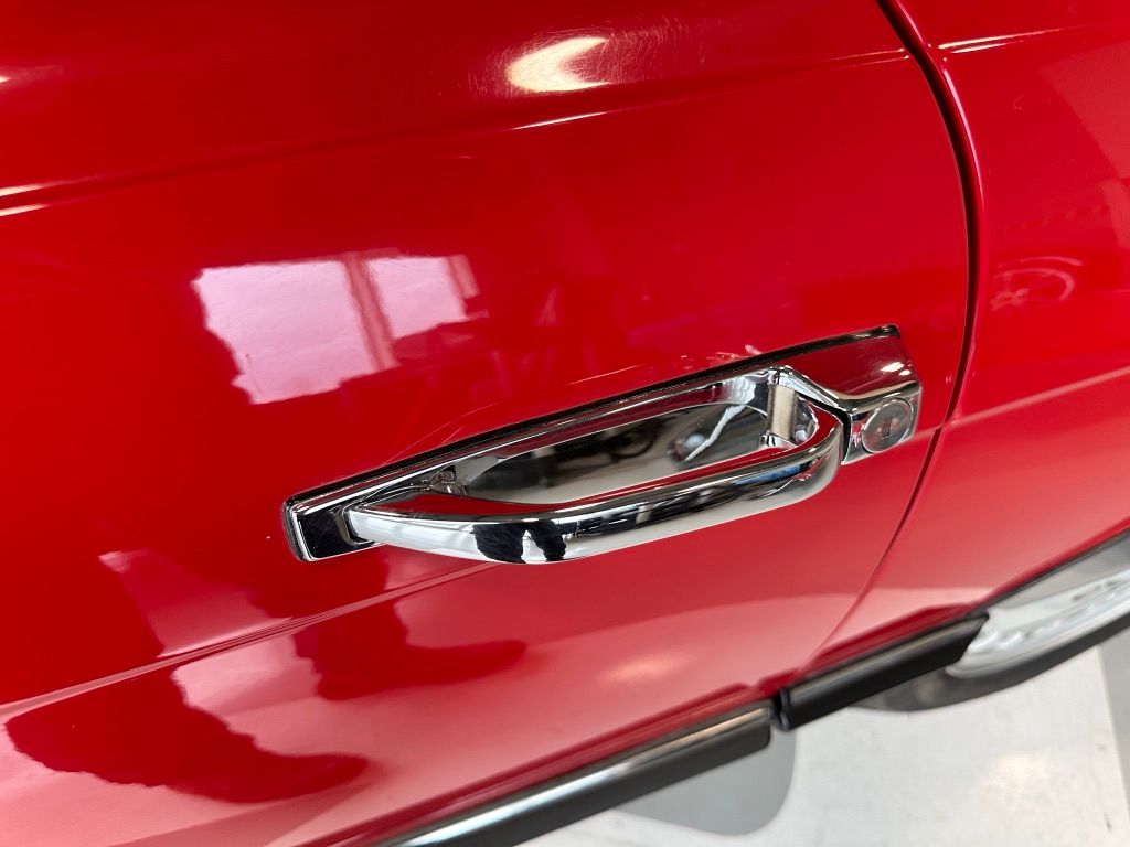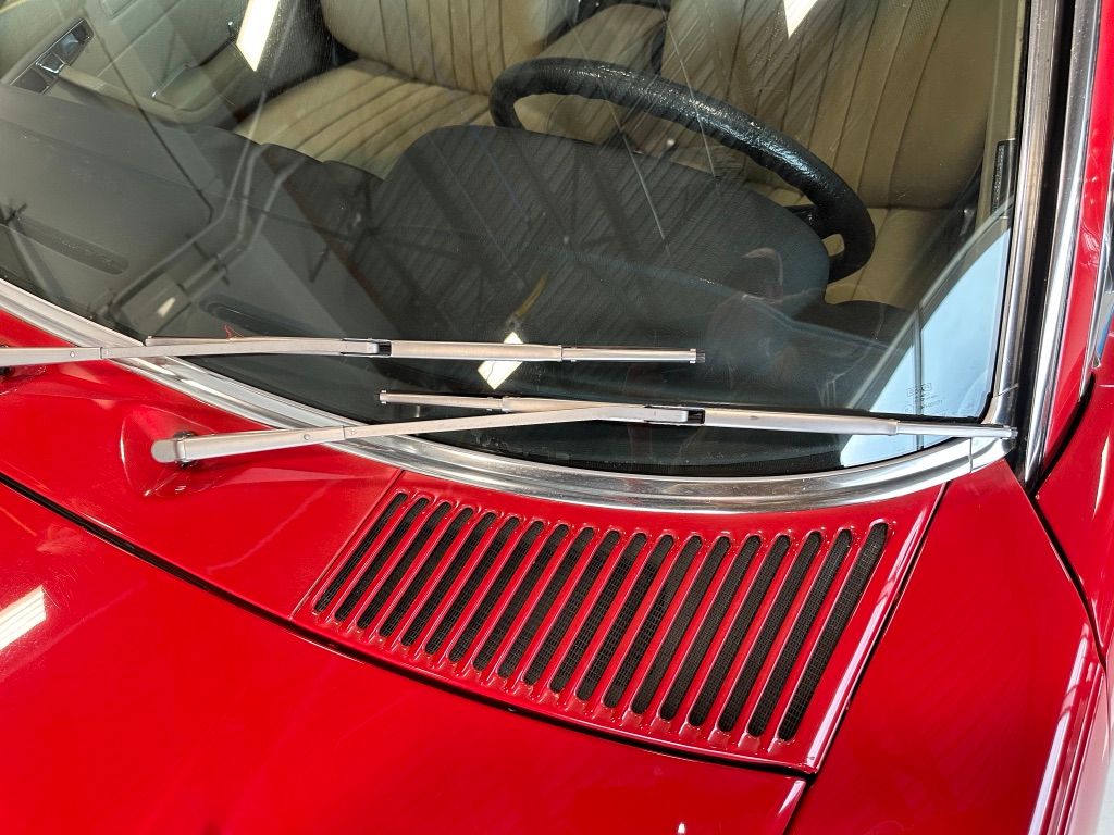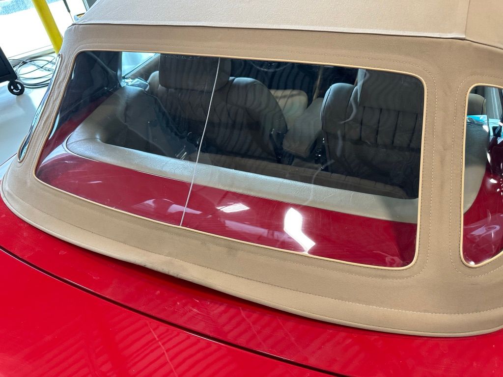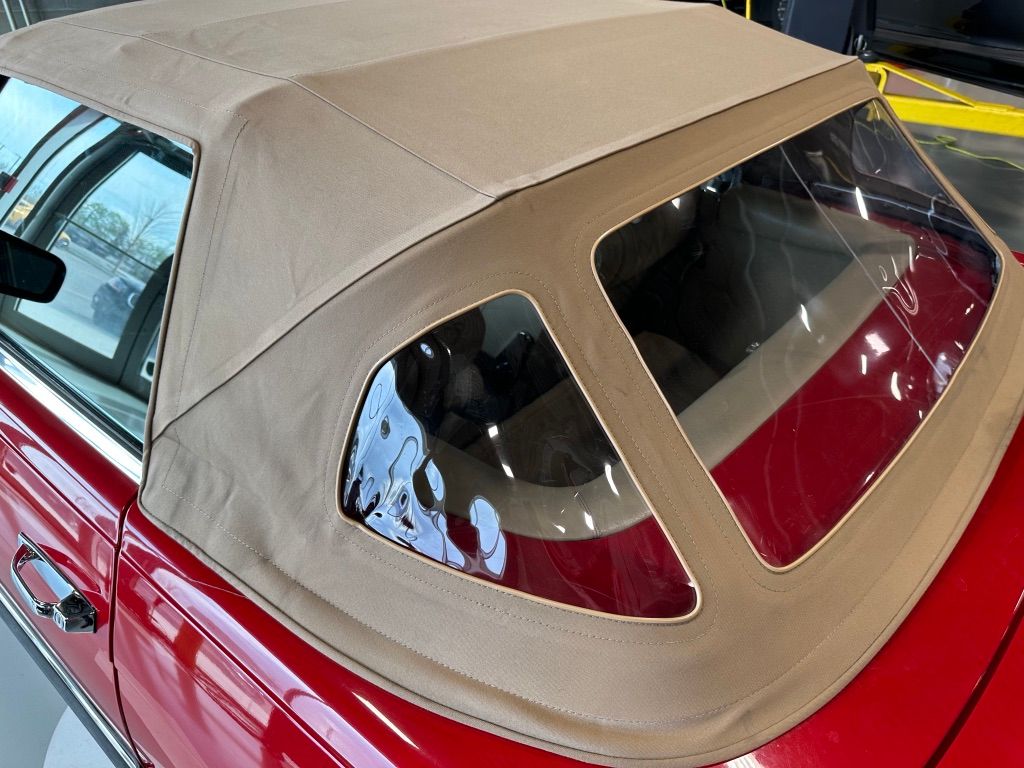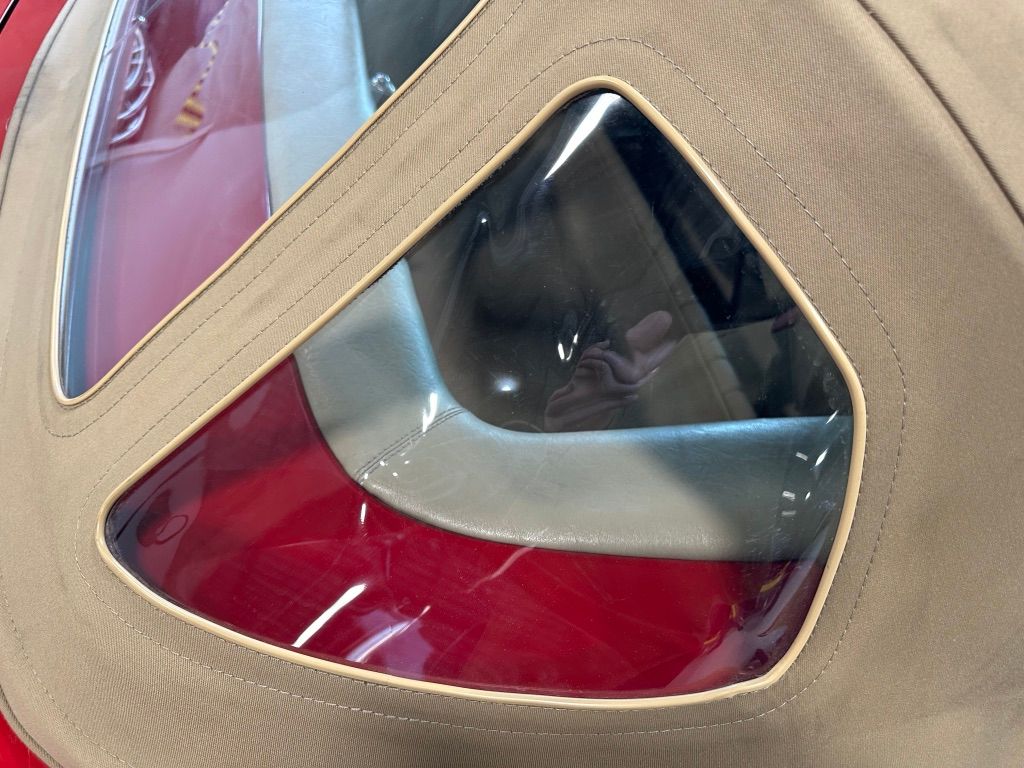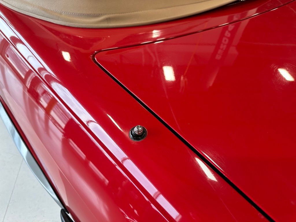 The car has benefited from a quality repaint in its original Signal Red, and has consistent paint depth which indicates no excess filler in any of the body panels. There is no noticeable orange peel or masking lines. The CARFAX report does not indicate any collision history, and the undercarriage is clean and corrosion free. The soft top looks barely used, and the rear window is clear and un-cracked. A hard top winch is included with the sale.