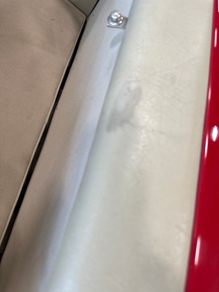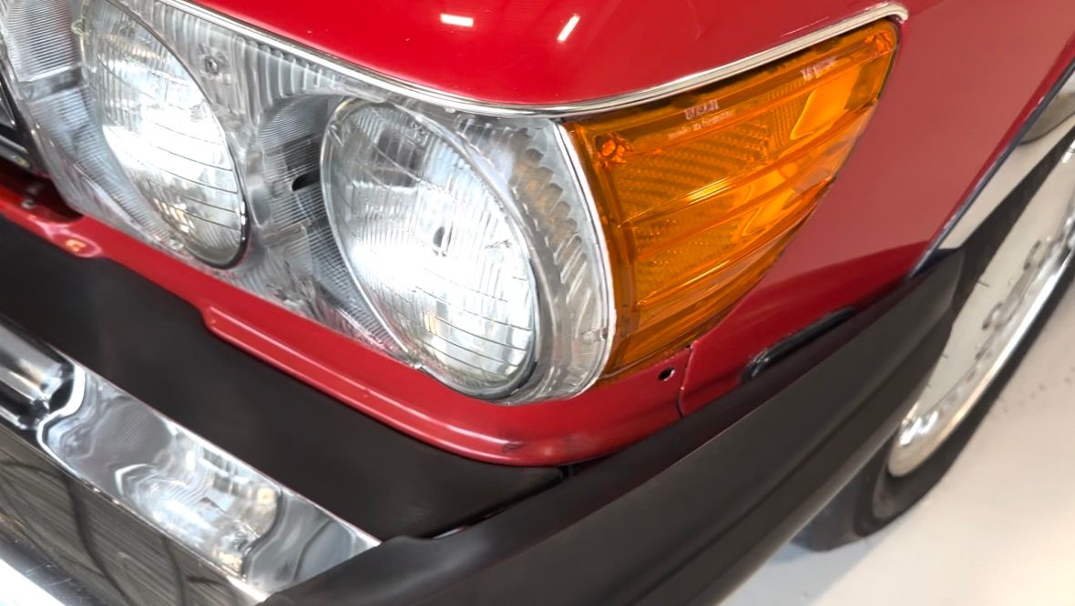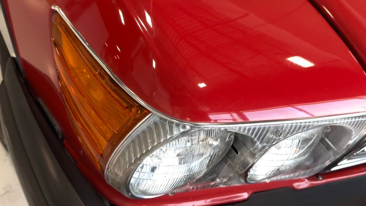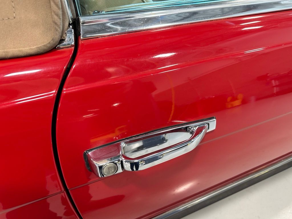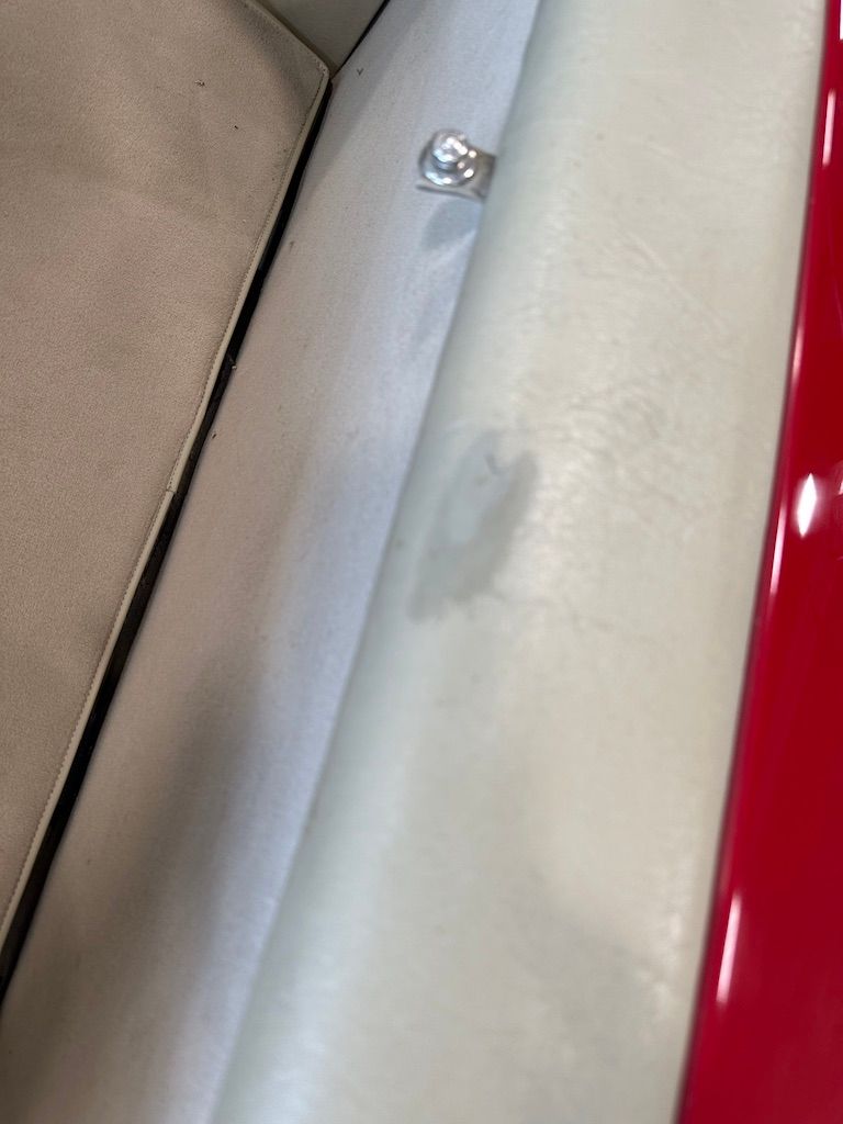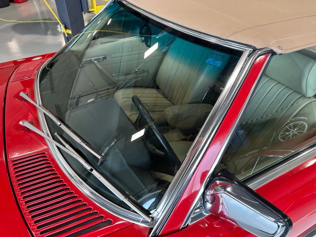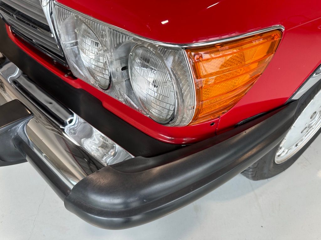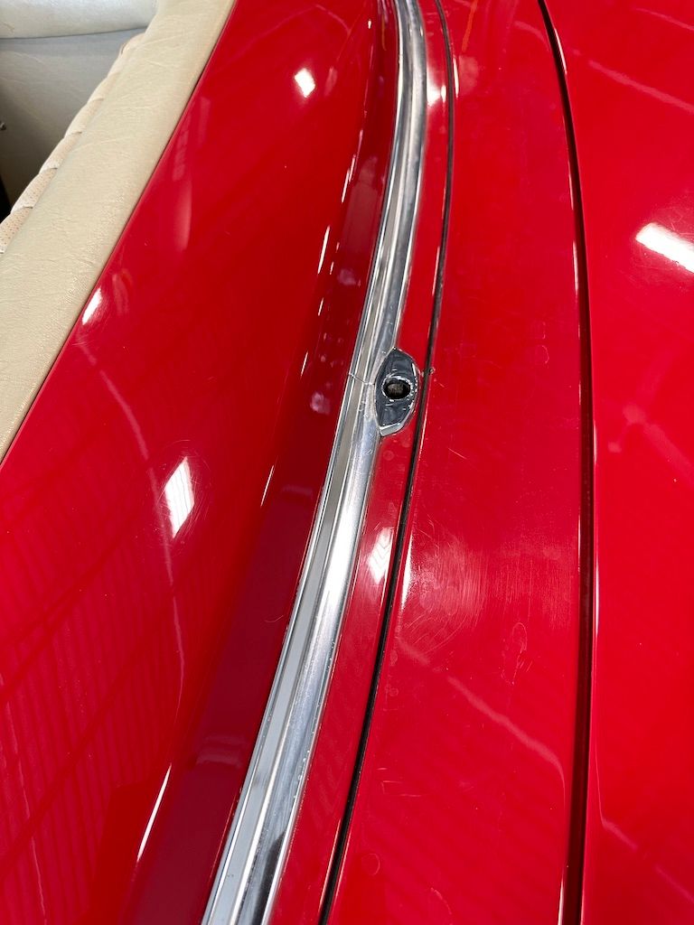 The car has benefited from a quality repaint in its original Signal Red, and has consistent paint depth which indicates no excess filler in any of the body panels. There is no noticeable orange peel or masking lines. The CARFAX report does not indicate any collision history, and the undercarriage is clean and corrosion free. The soft top looks barely used, and the rear window is clear and un-cracked. A hard top winch is included with the sale.