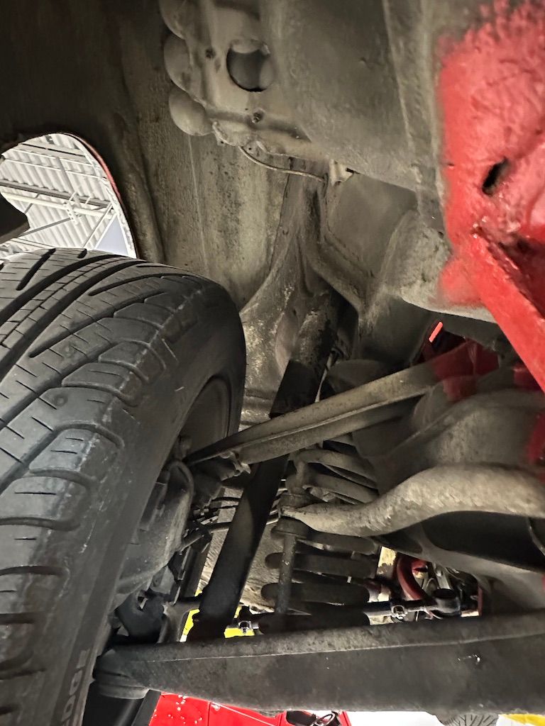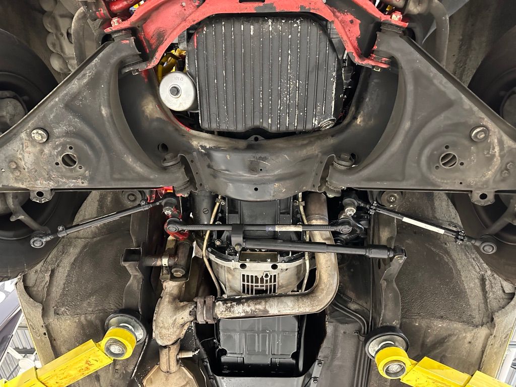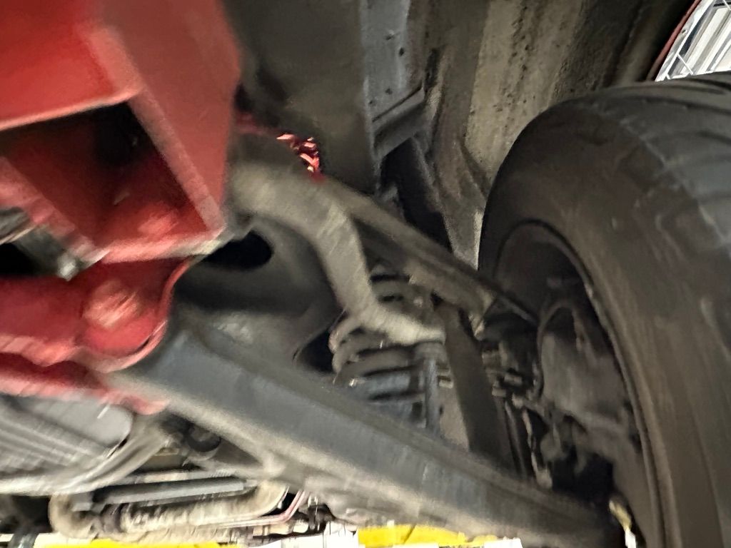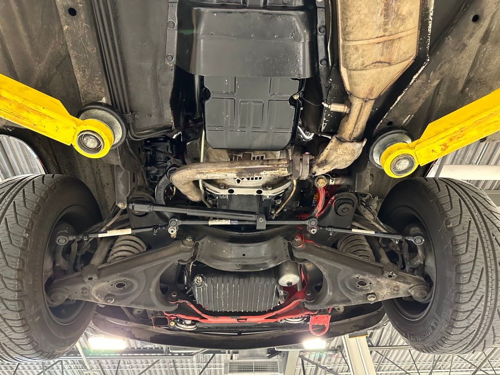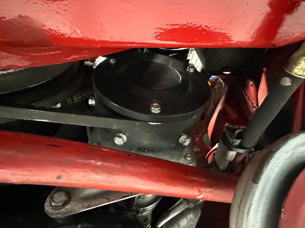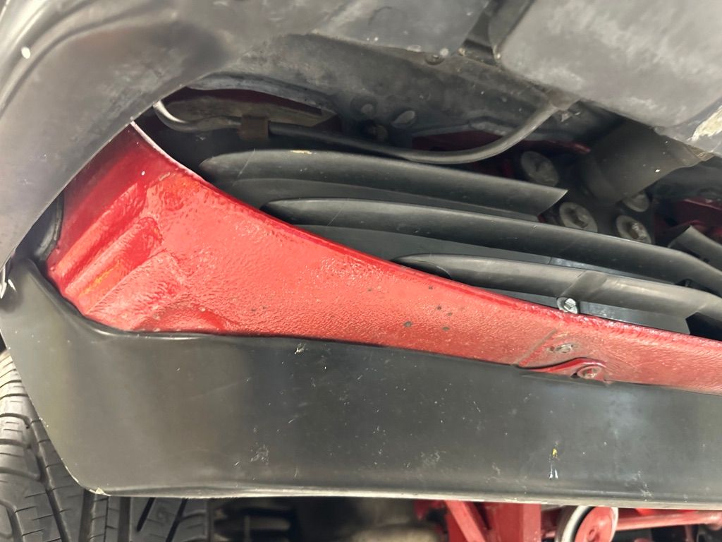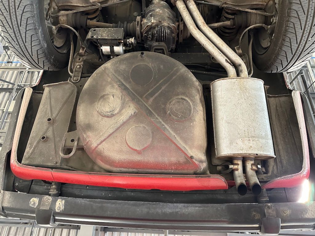 The car has benefited from a quality repaint in its original Signal Red, and has consistent paint depth which indicates no excess filler in any of the body panels. There is no noticeable orange peel or masking lines. The CARFAX report does not indicate any collision history, and the undercarriage is clean and corrosion free. The soft top looks barely used, and the rear window is clear and un-cracked. A hard top winch is included with the sale.