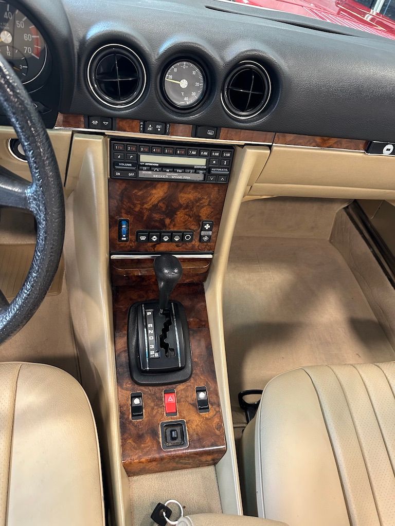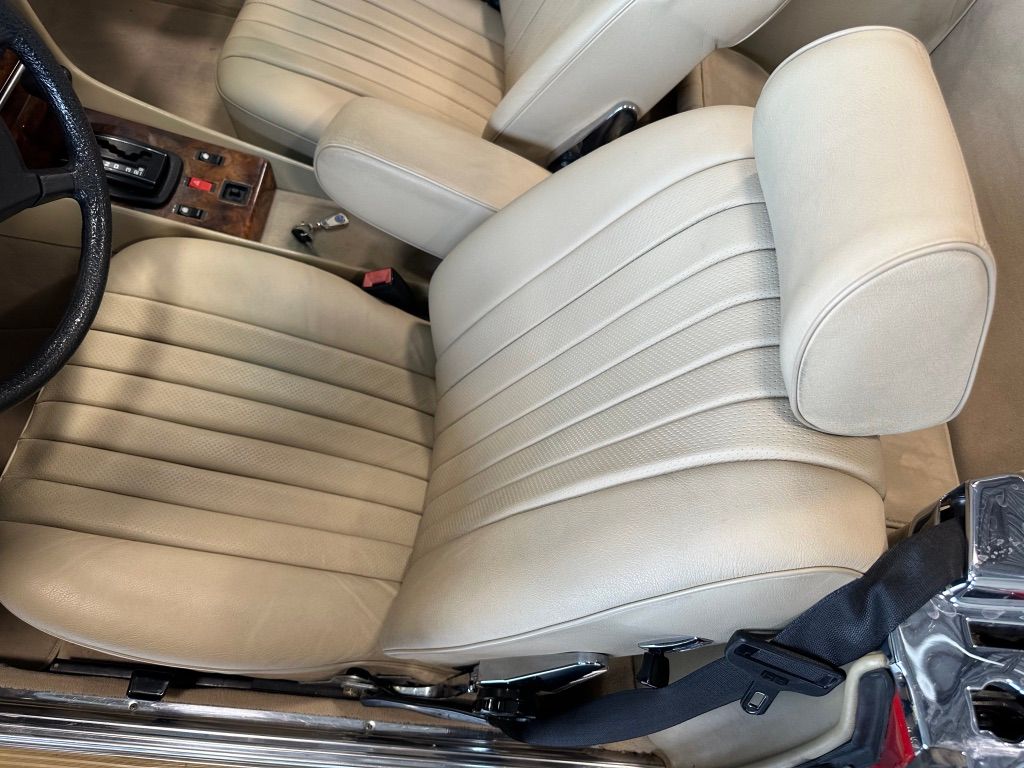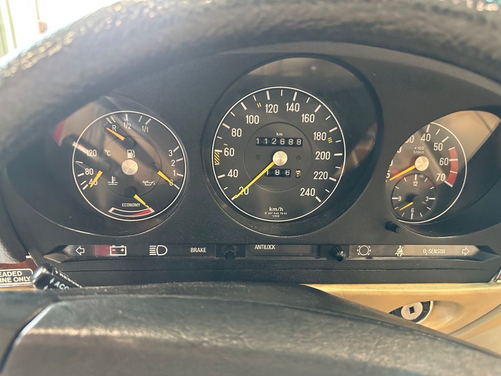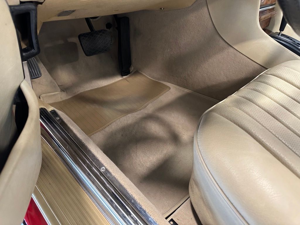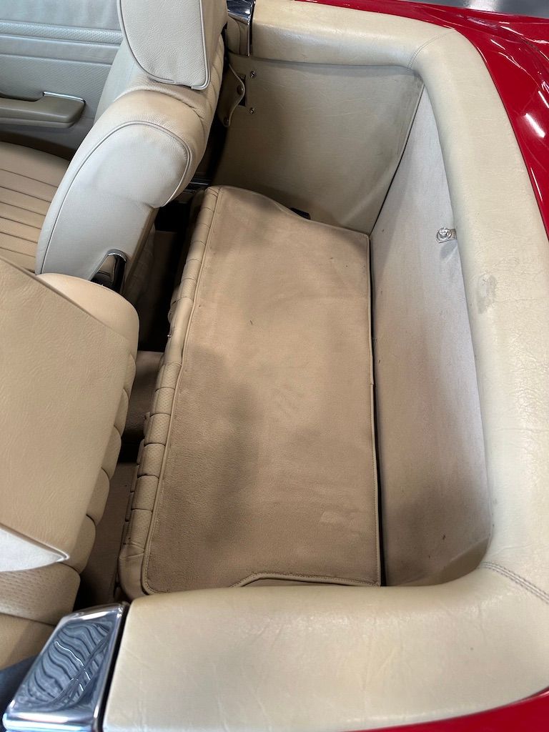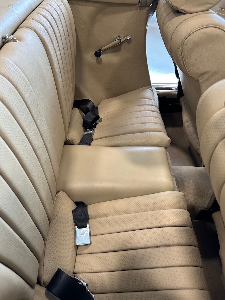 The interior is beige with the incredibly hard-wearing MB-Tex seat coverings. Carpets, including the trunk, are unsoiled, and still have their original factory rubber backing which has not deteriorated. Floor pans are factory fresh indicating that the car has had no water ingress. The Burr Walnut trim is still dark and not sun damaged, with no cracking. It appears that the dash pad has been replaced at some point in the vehicles history and is unmarked. All electrical equipment, gauges and controls work correctly. The AC blows cold, as the compressor and associated AC components were recently replaced with a conversion to R134a refrigerant.