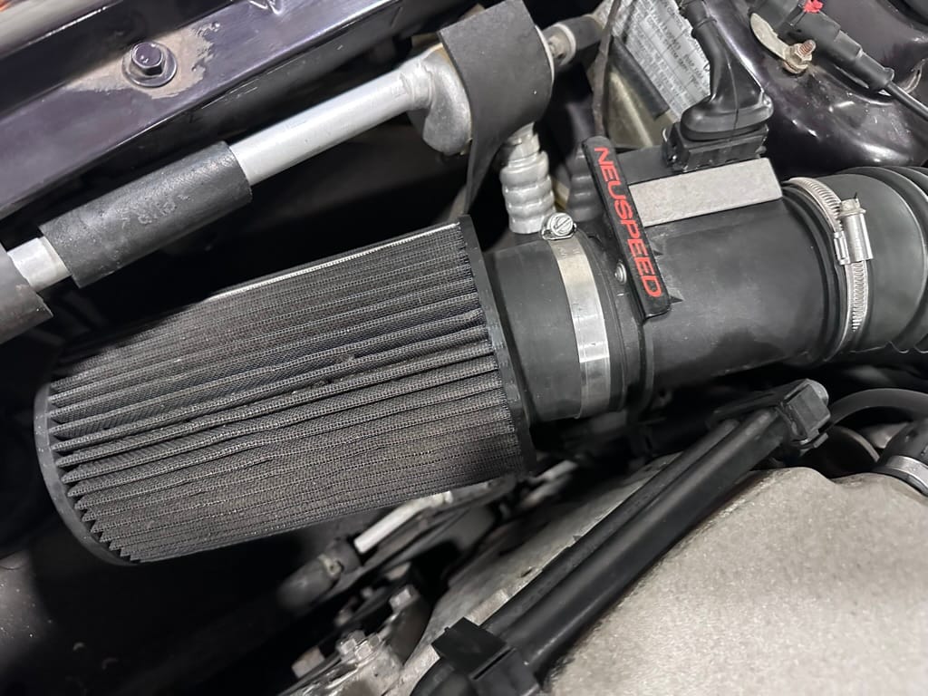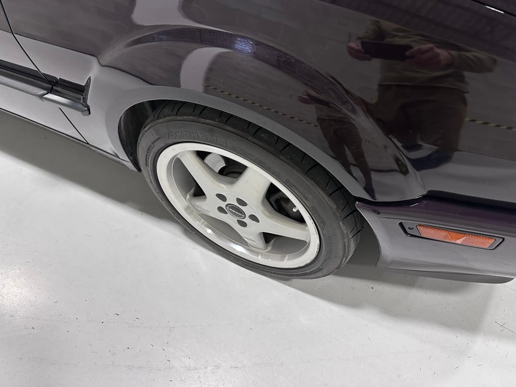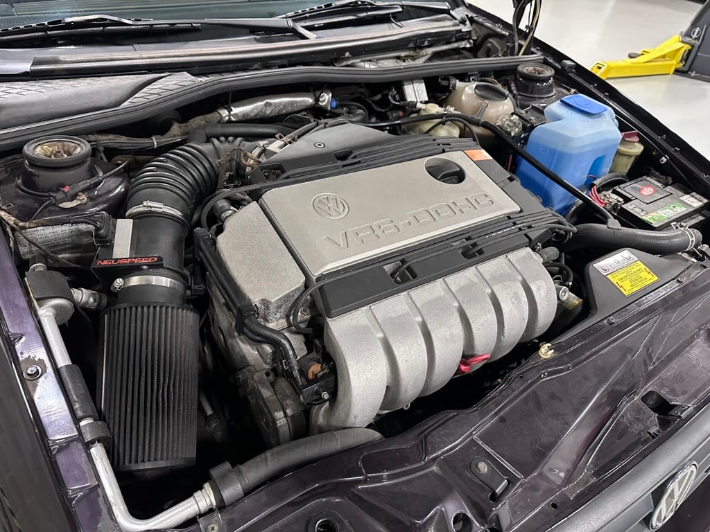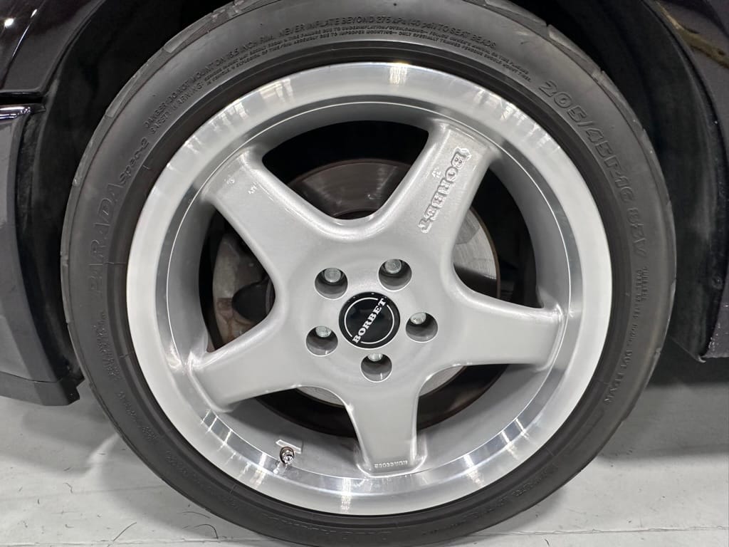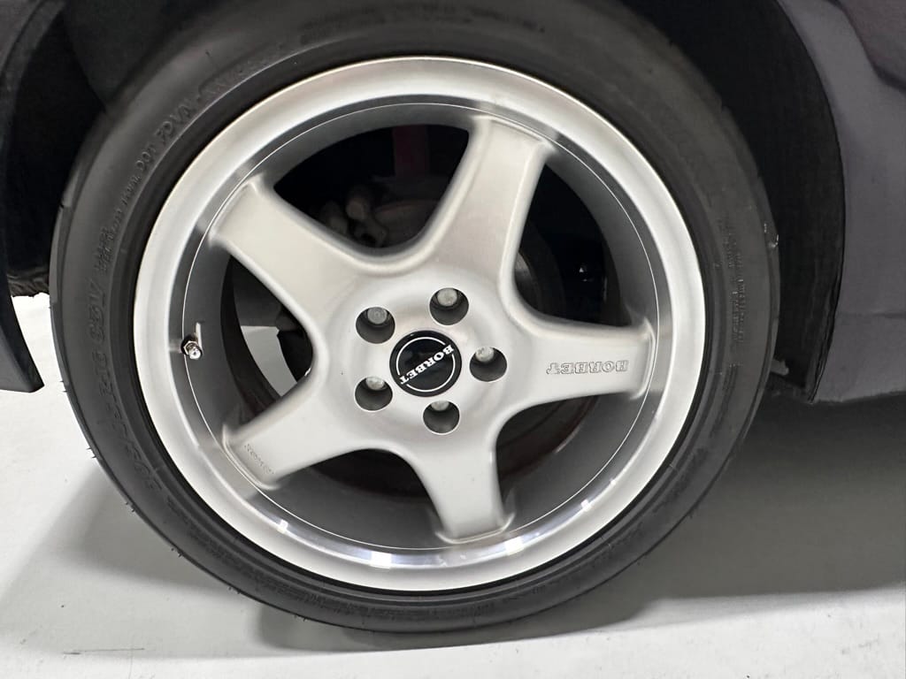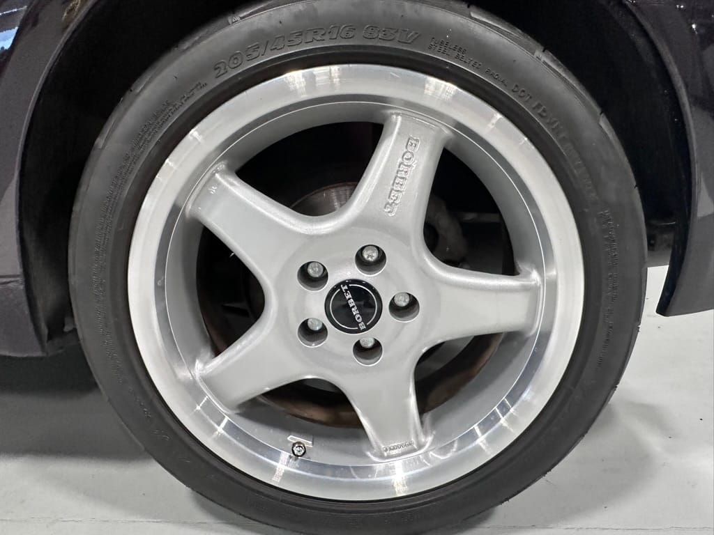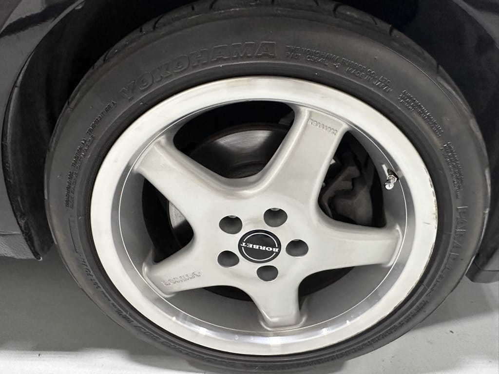 The car wears 6.5 x 16 Borbet wheels with older Yokohama tires (date code 2002). The OEM wheels are included with the car. A Neuspeed cold air intake appears to be a dealer installed item. The original airbox is included. There are several minor leaks from the engine.