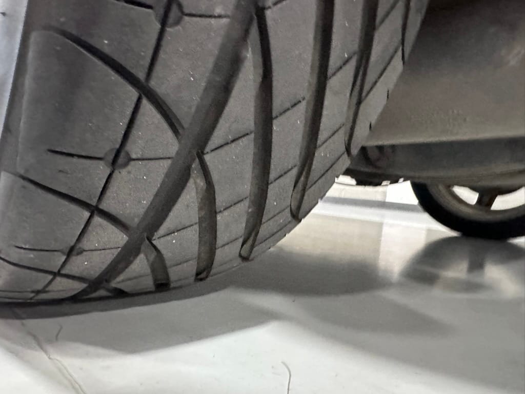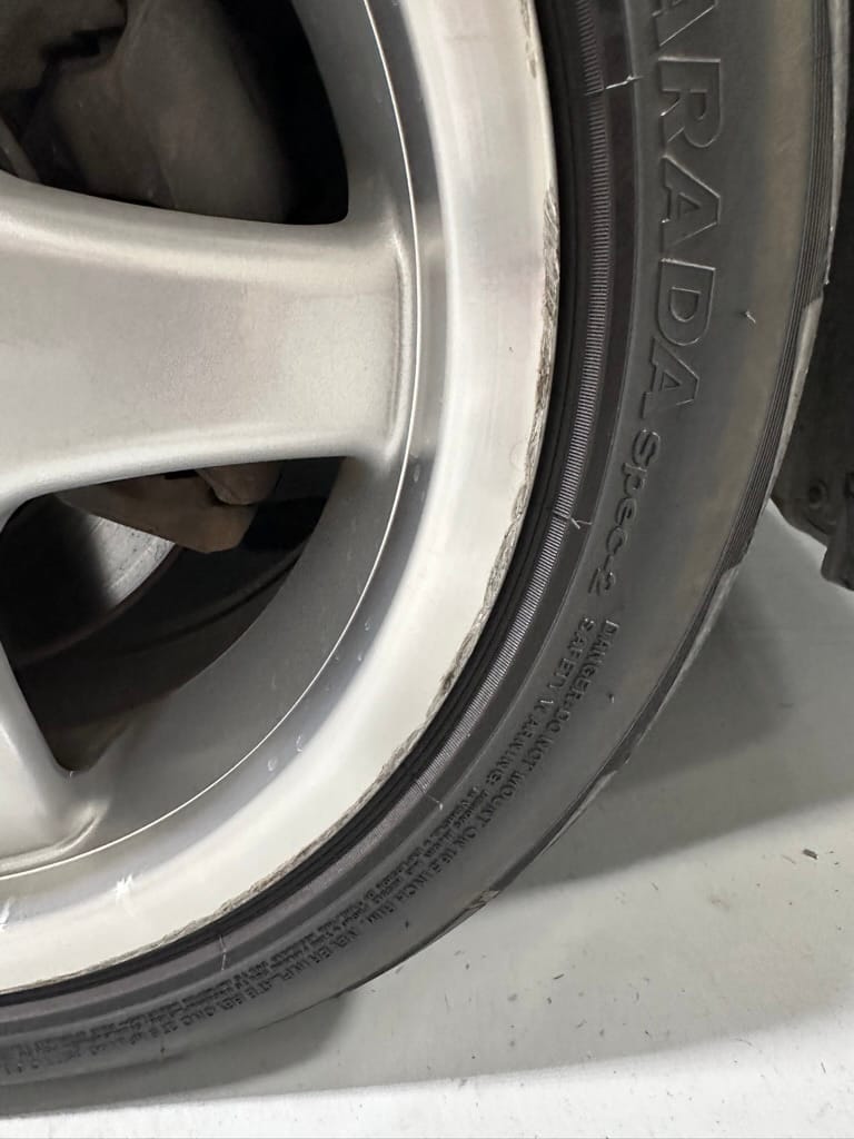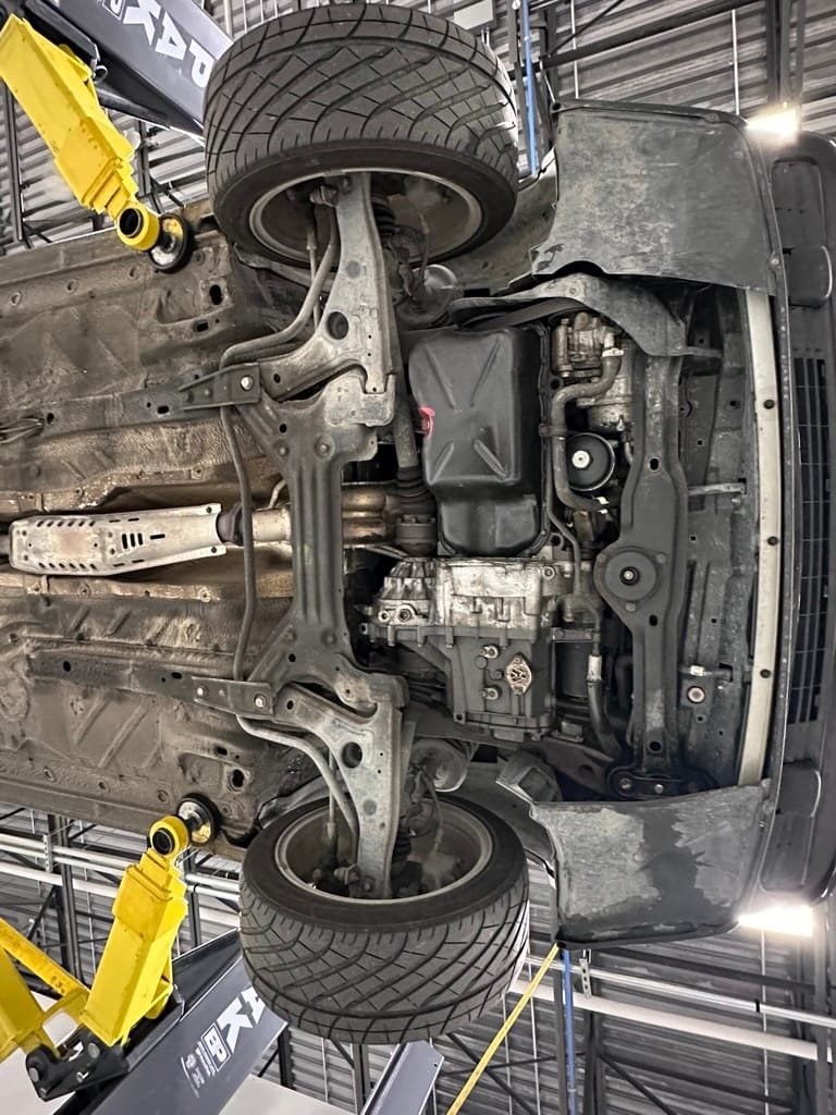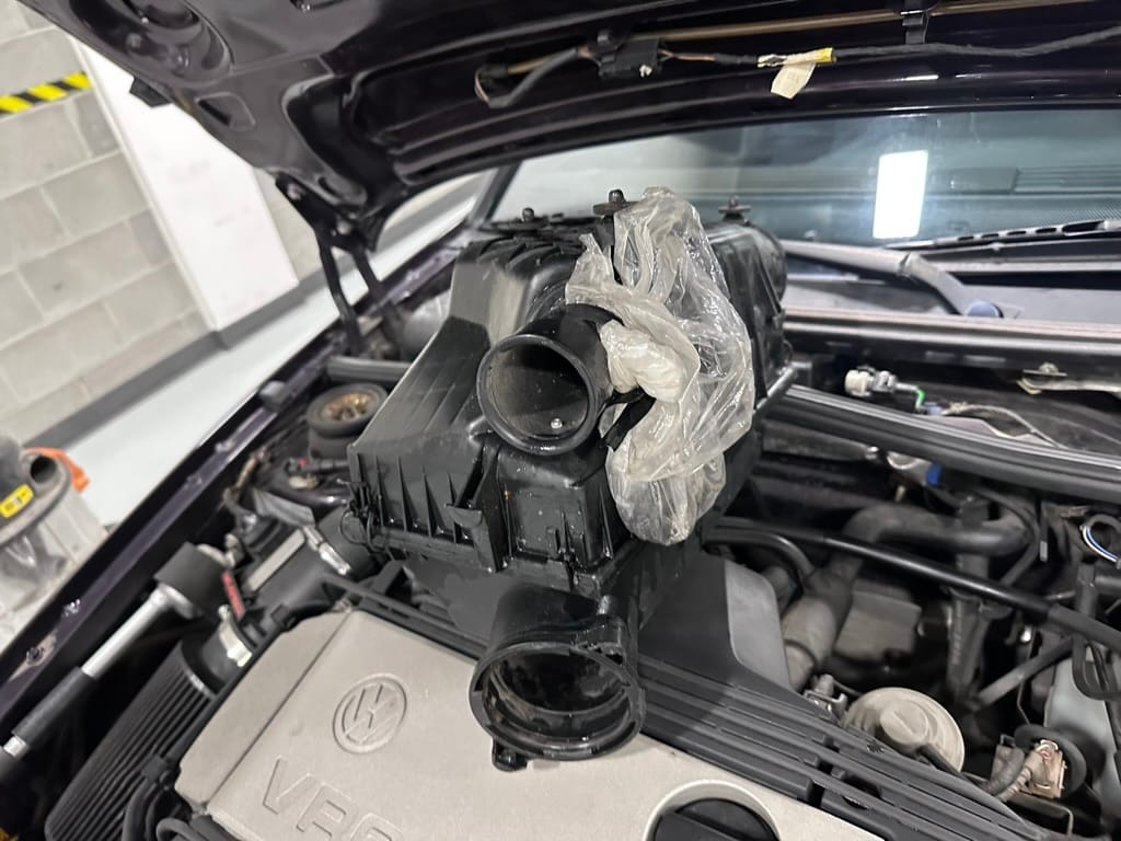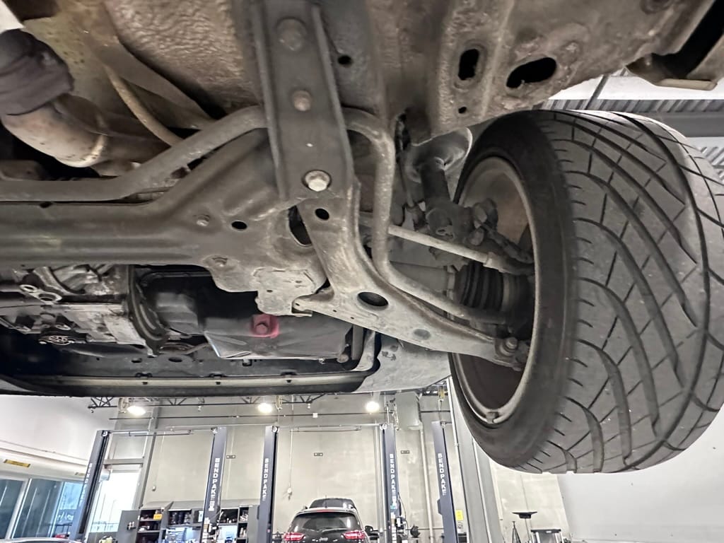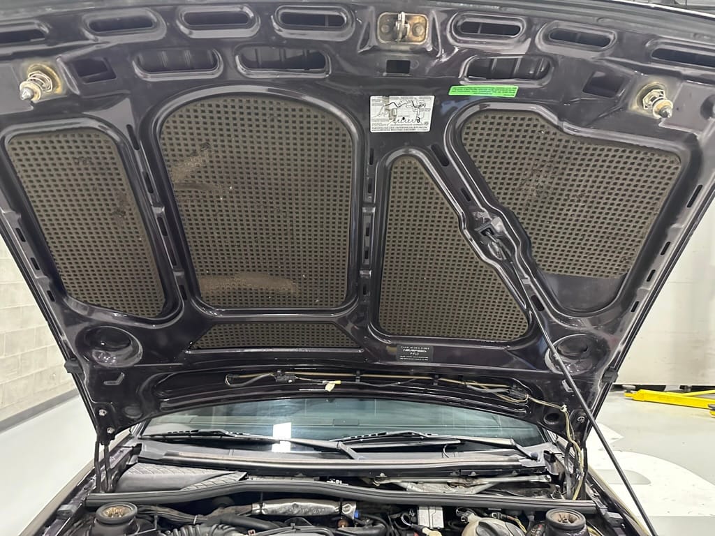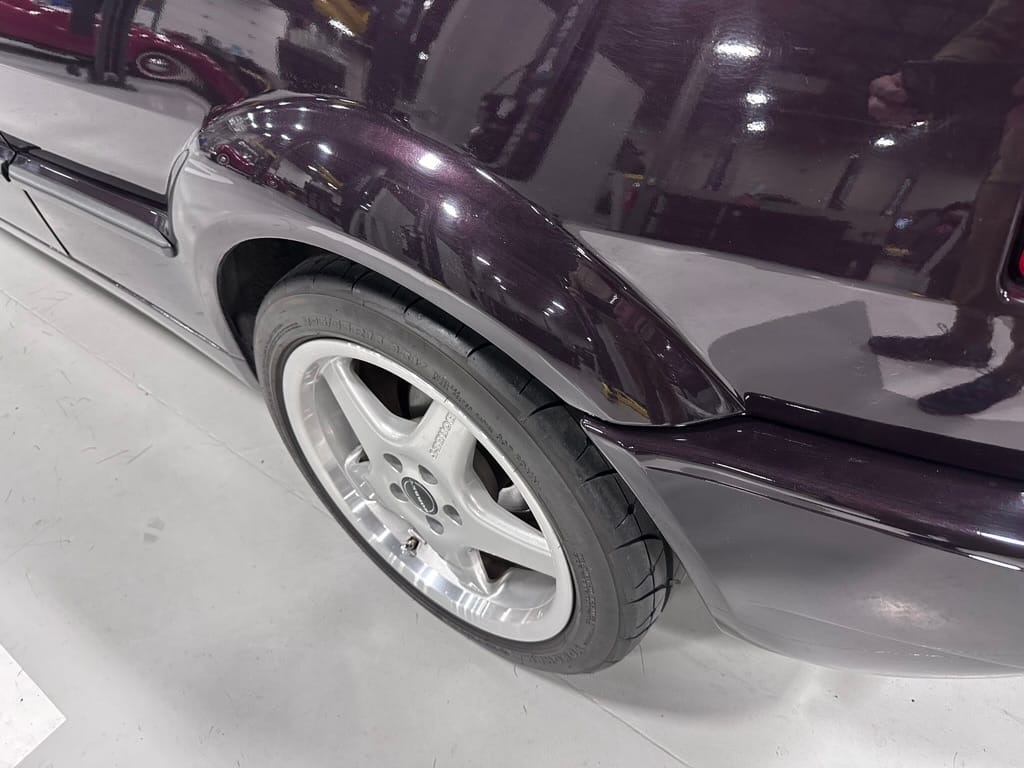 The car wears 6.5 x 16 Borbet wheels with older Yokohama tires (date code 2002). The OEM wheels are included with the car. A Neuspeed cold air intake appears to be a dealer installed item. The original airbox is included. There are several minor leaks from the engine.