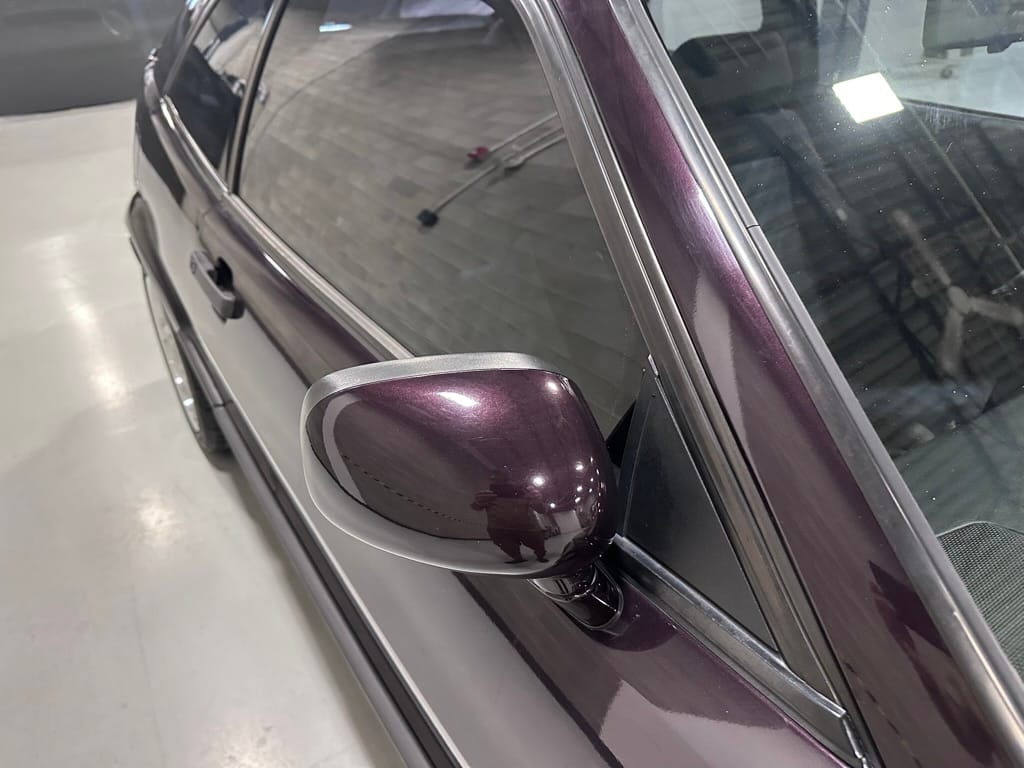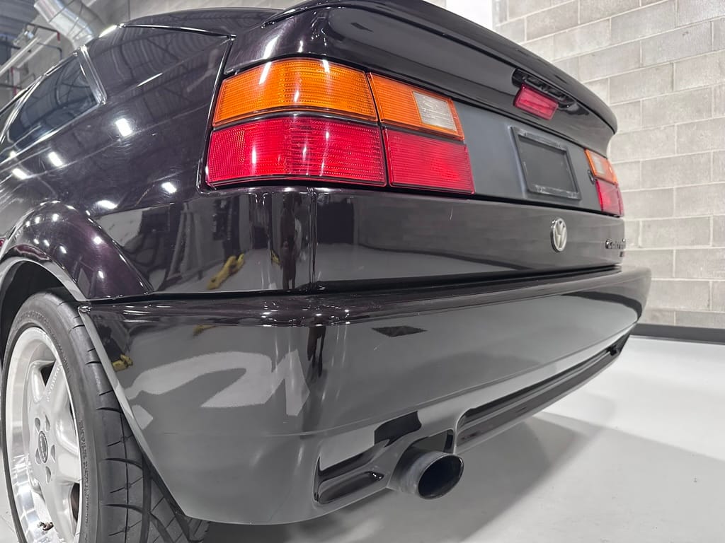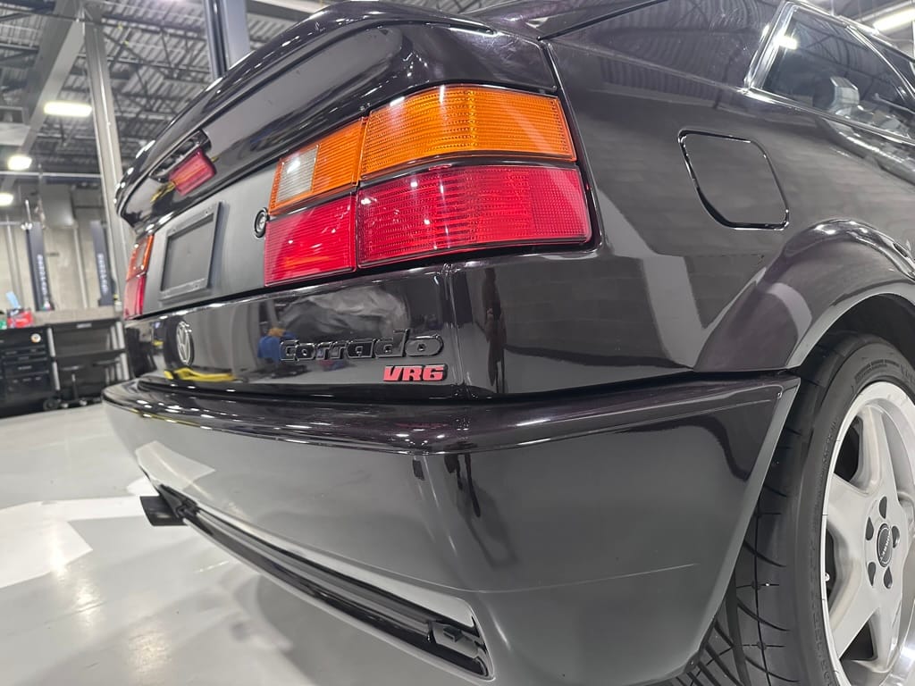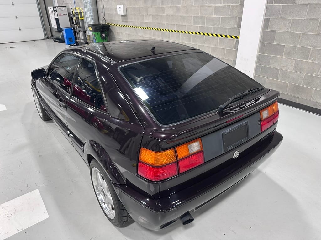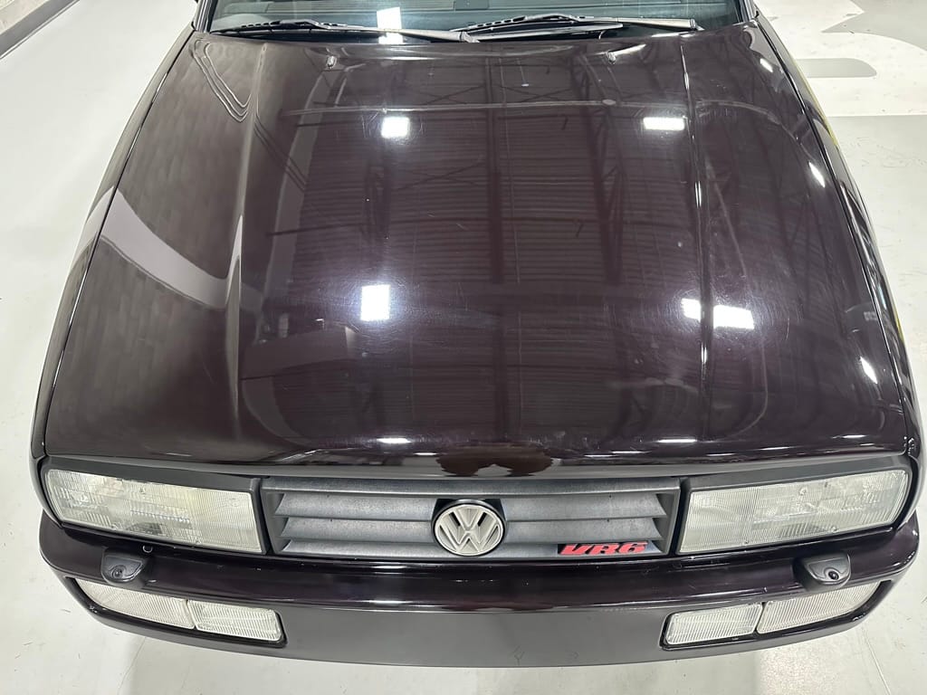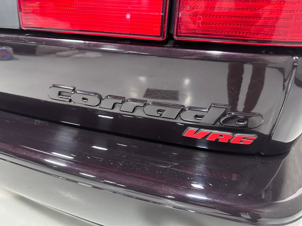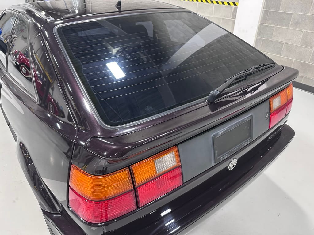 This Corrado has its original Burgundy Pearl Effect paint showing paint depth between 90 and 180 micrometers throughout. The paint is extremely nice, and could only benefit from a polish to look almost new. There is a ding on the top of the drivers door. There is a minor amount of corrosion starting beneath the seal on the hatchback glass.