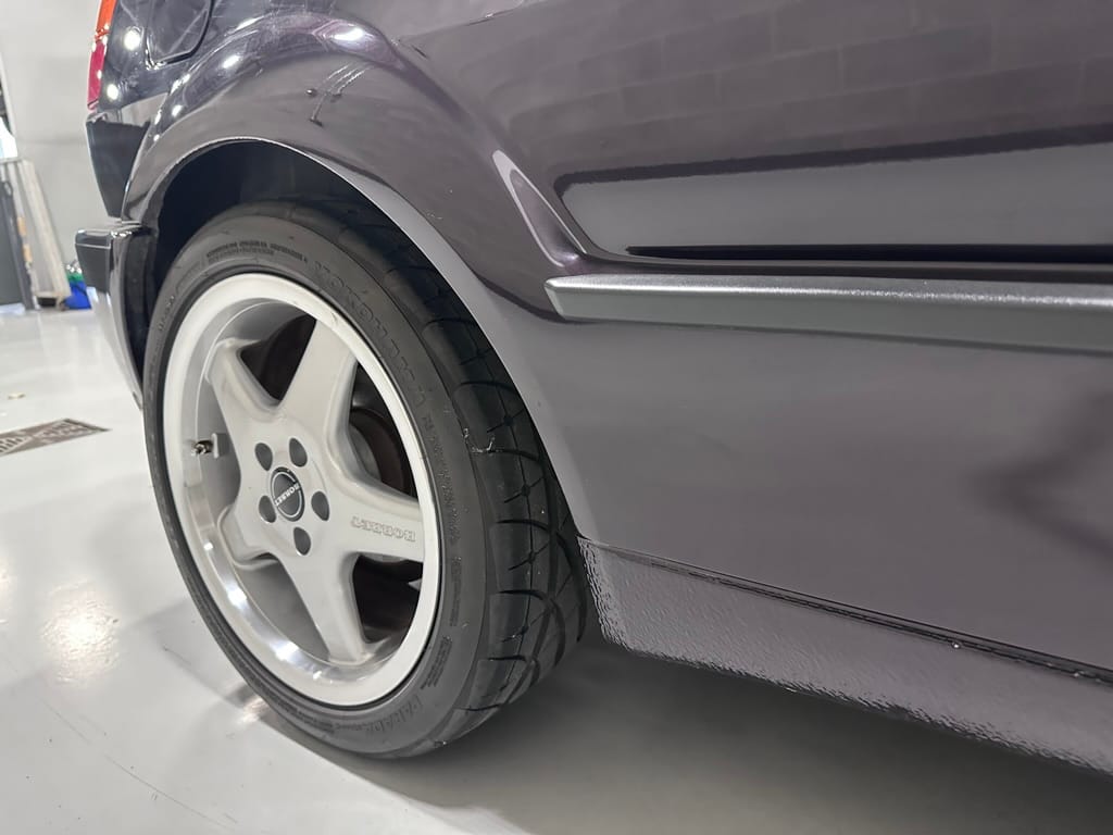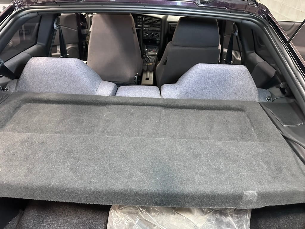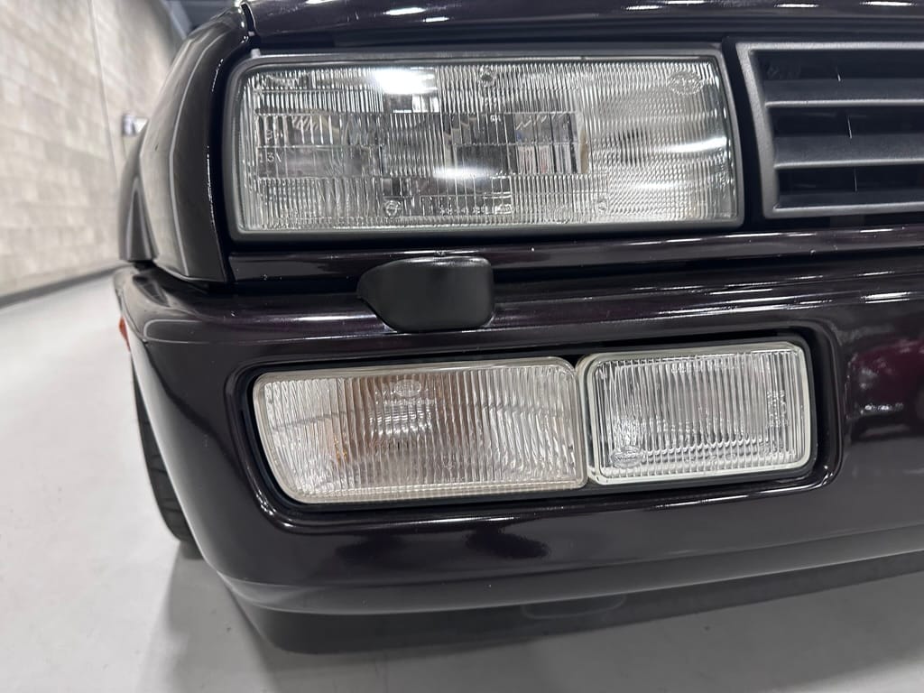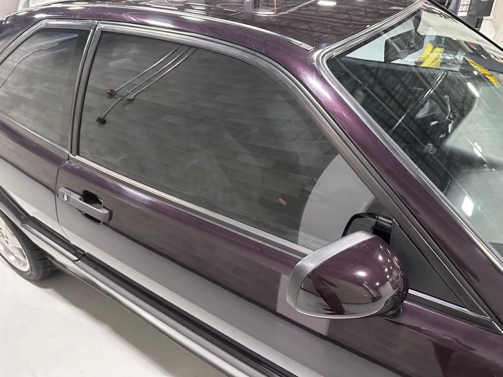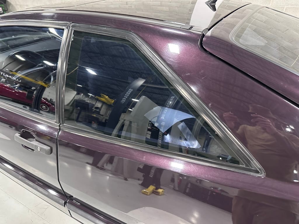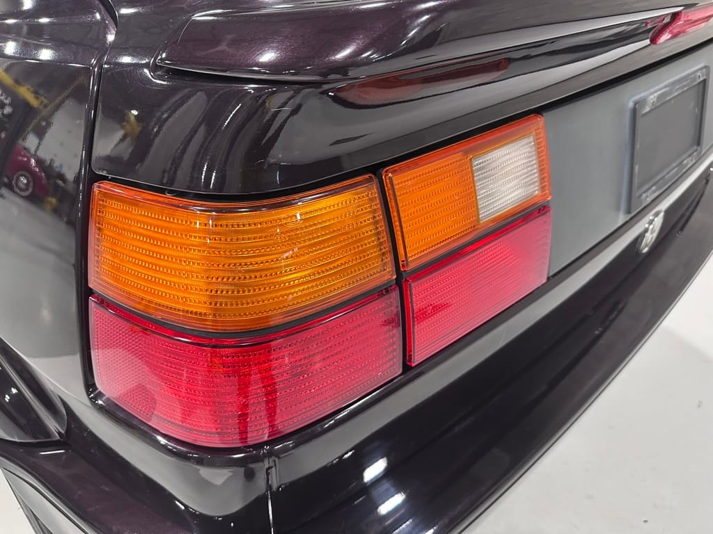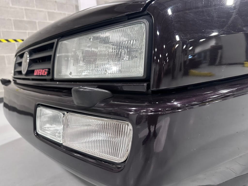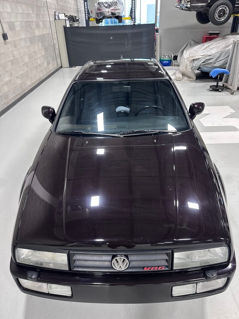 This Corrado has its original Burgundy Pearl Effect paint showing paint depth between 90 and 180 micrometers throughout. The paint is extremely nice, and could only benefit from a polish to look almost new. There is a ding on the top of the drivers door. There is a minor amount of corrosion starting beneath the seal on the hatchback glass.