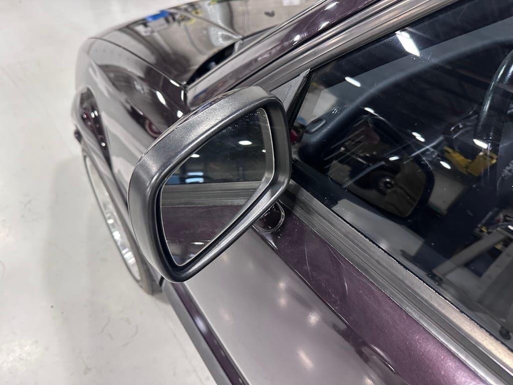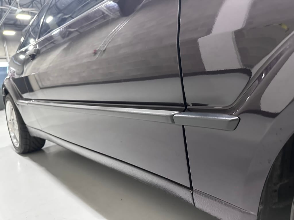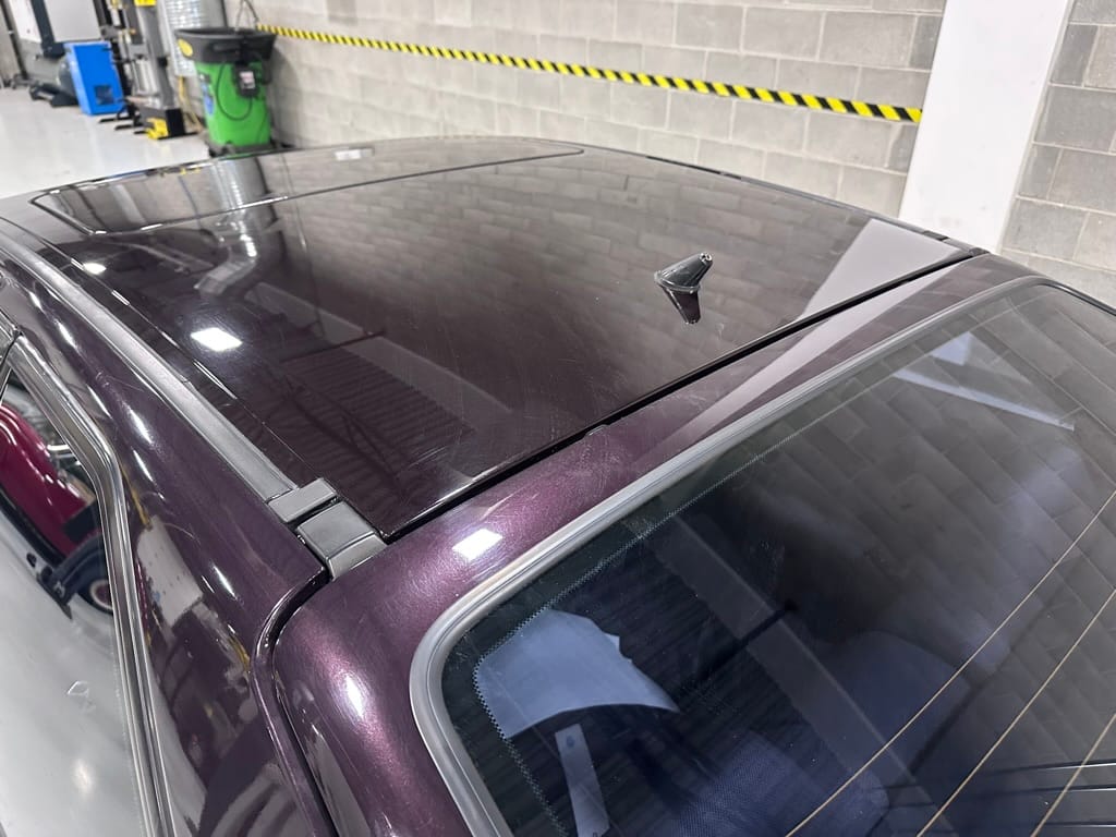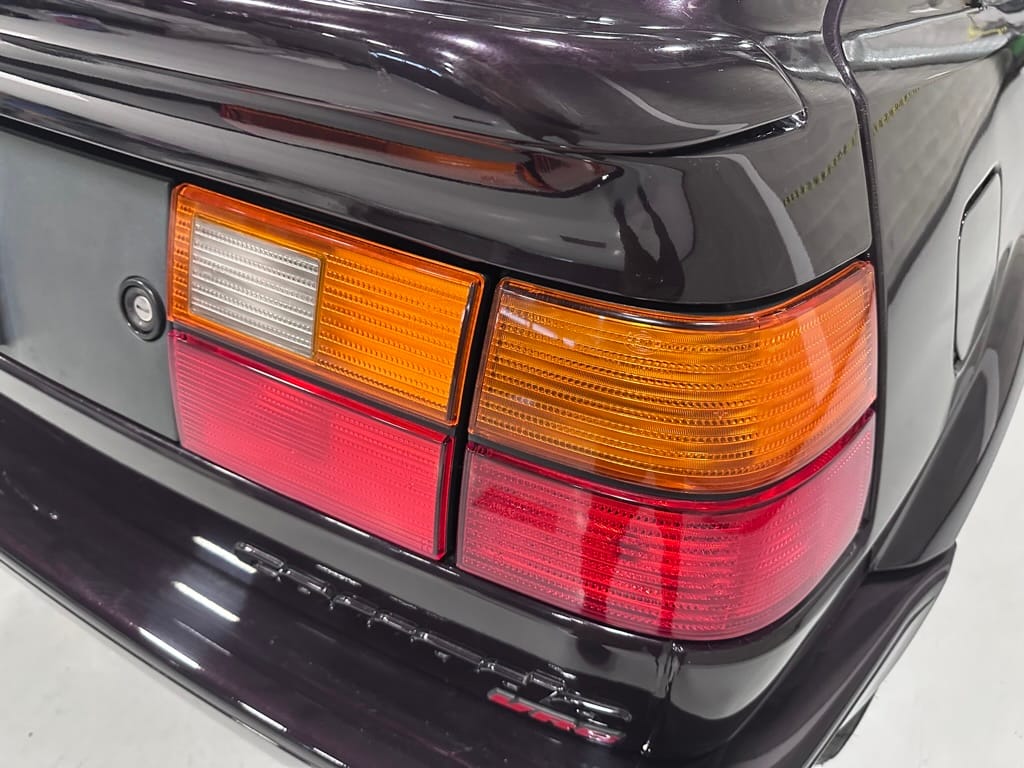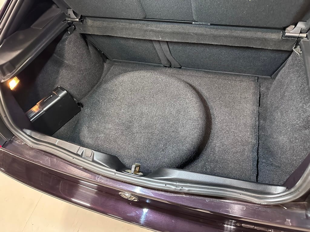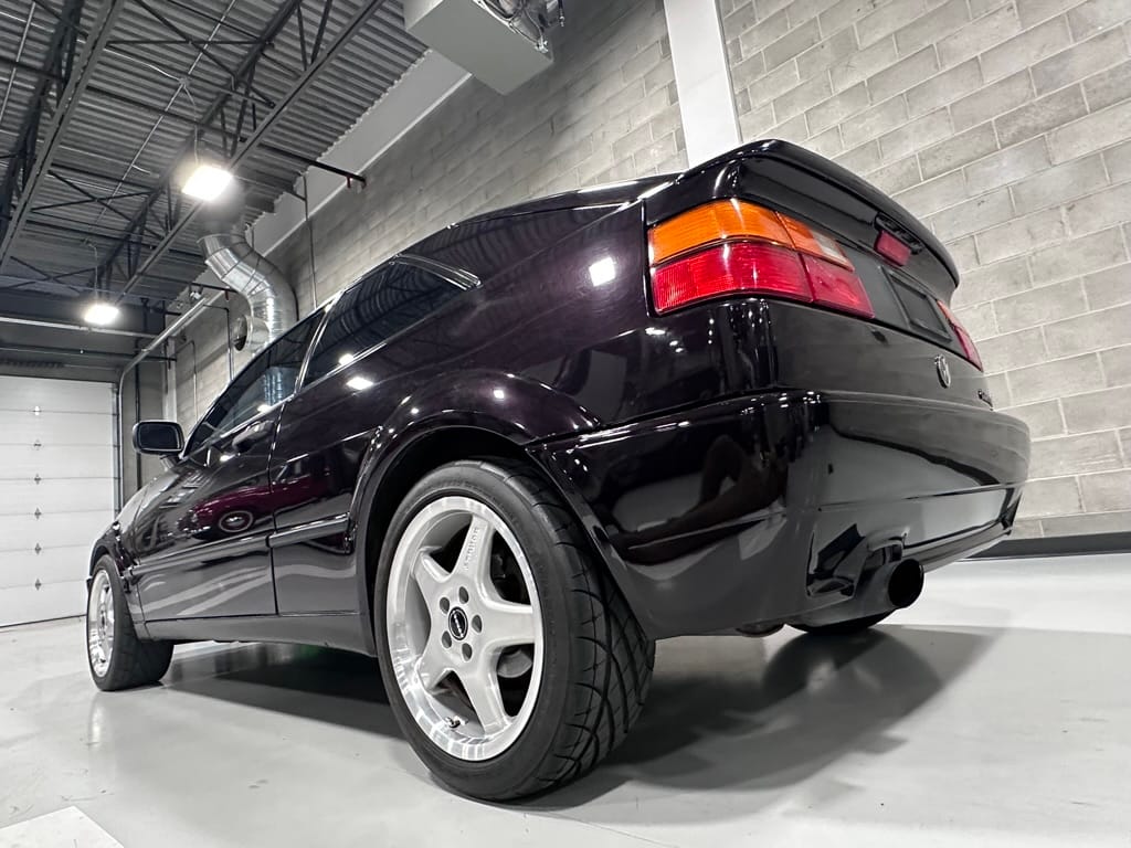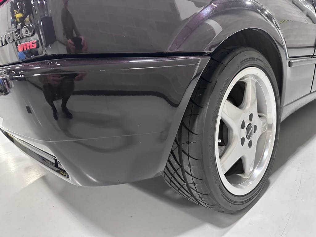 This Corrado has its original Burgundy Pearl Effect paint showing paint depth between 90 and 180 micrometers throughout. The paint is extremely nice, and could only benefit from a polish to look almost new. There is a ding on the top of the drivers door. There is a minor amount of corrosion starting beneath the seal on the hatchback glass.
